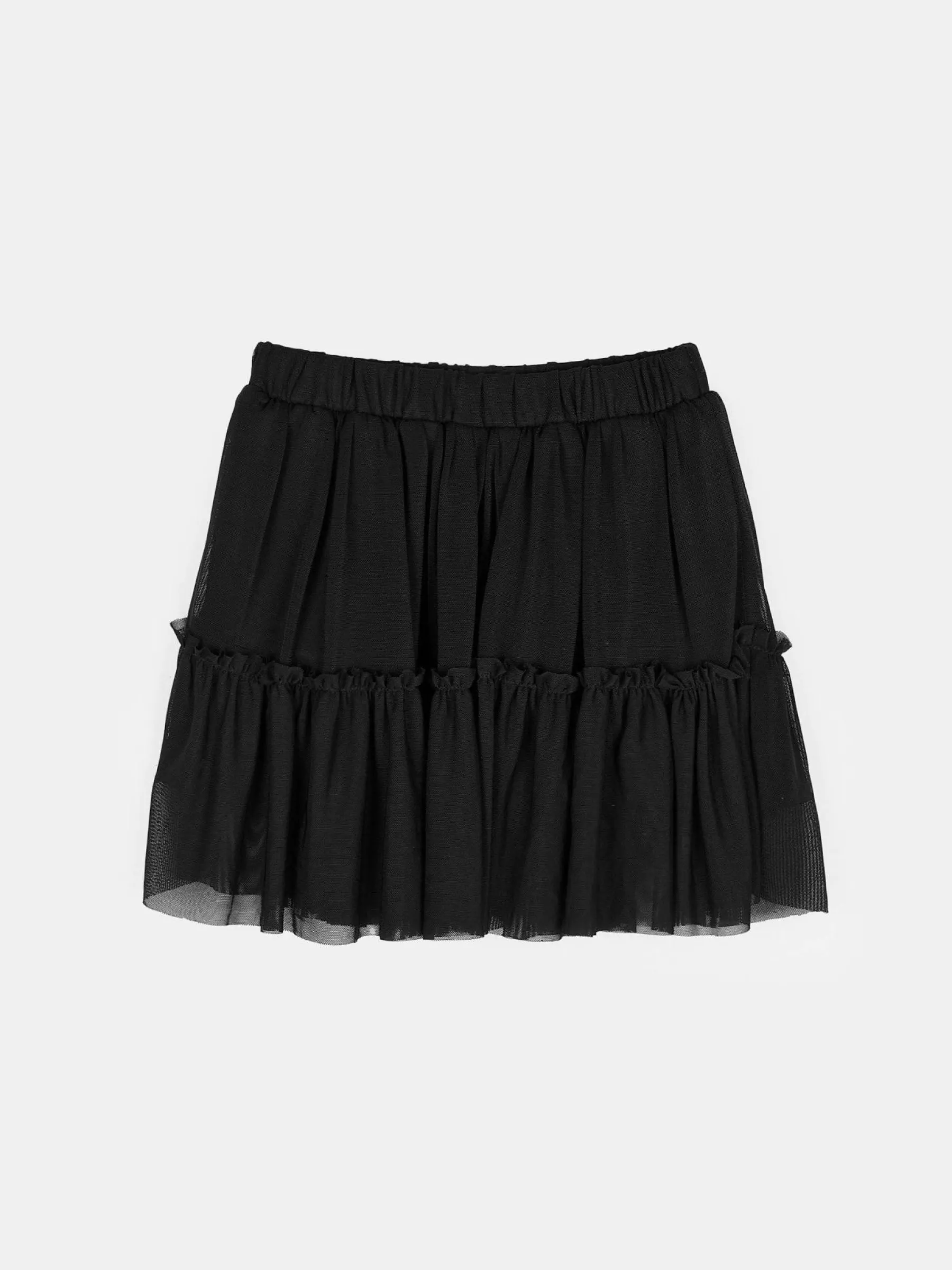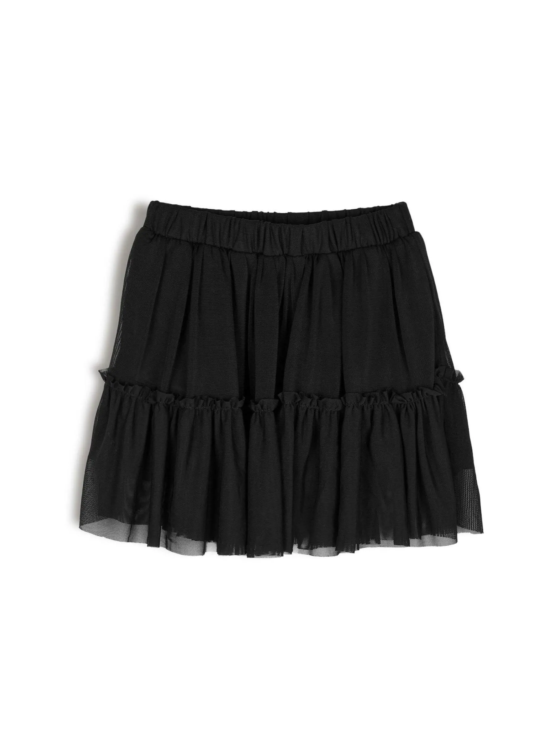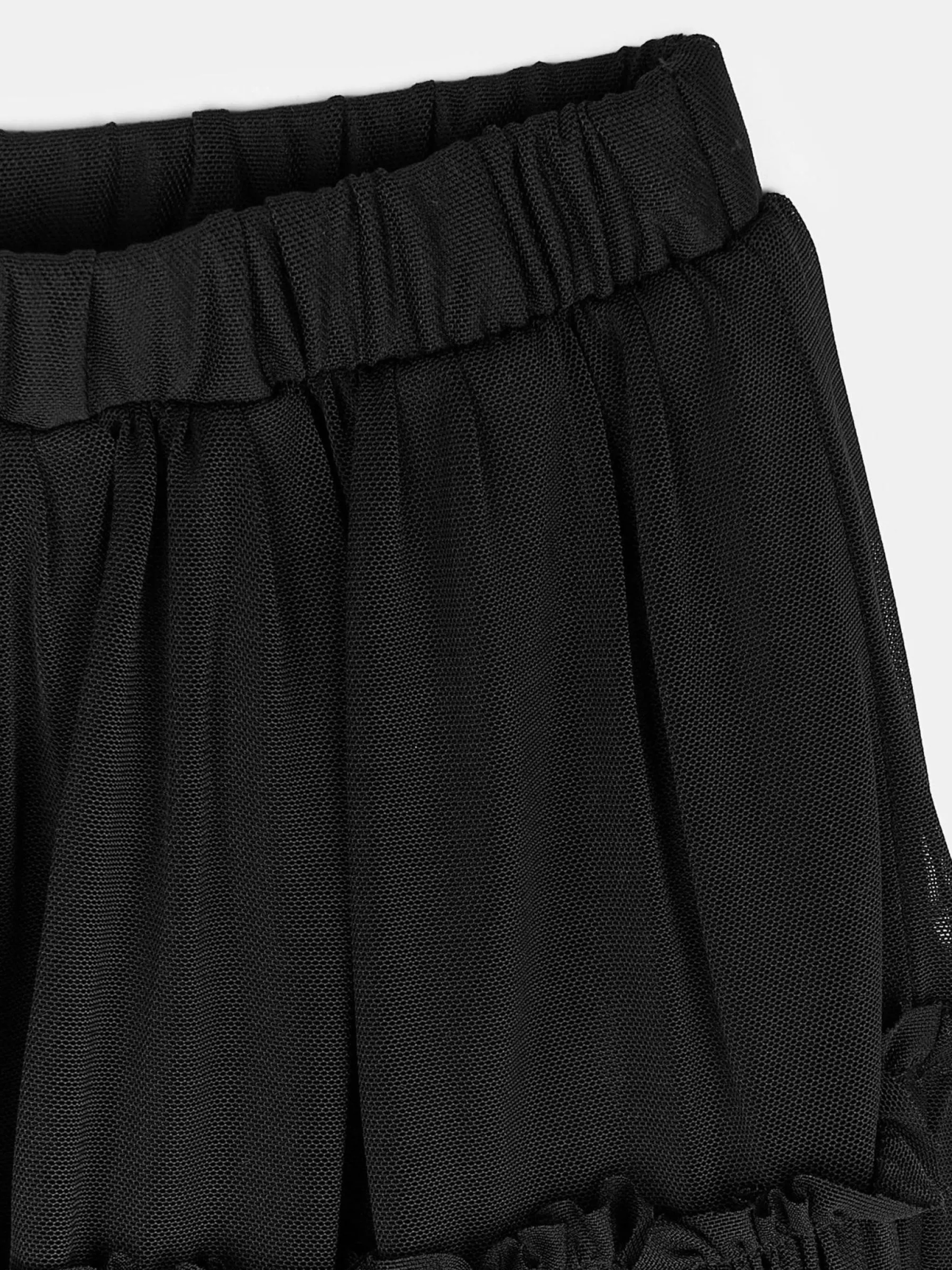 Kolor: czarnyKrój: z falbanąTyp: spódnicaDługość: miniPattern style: pojedynczy kolorDetal: z elastyczną opaską,…