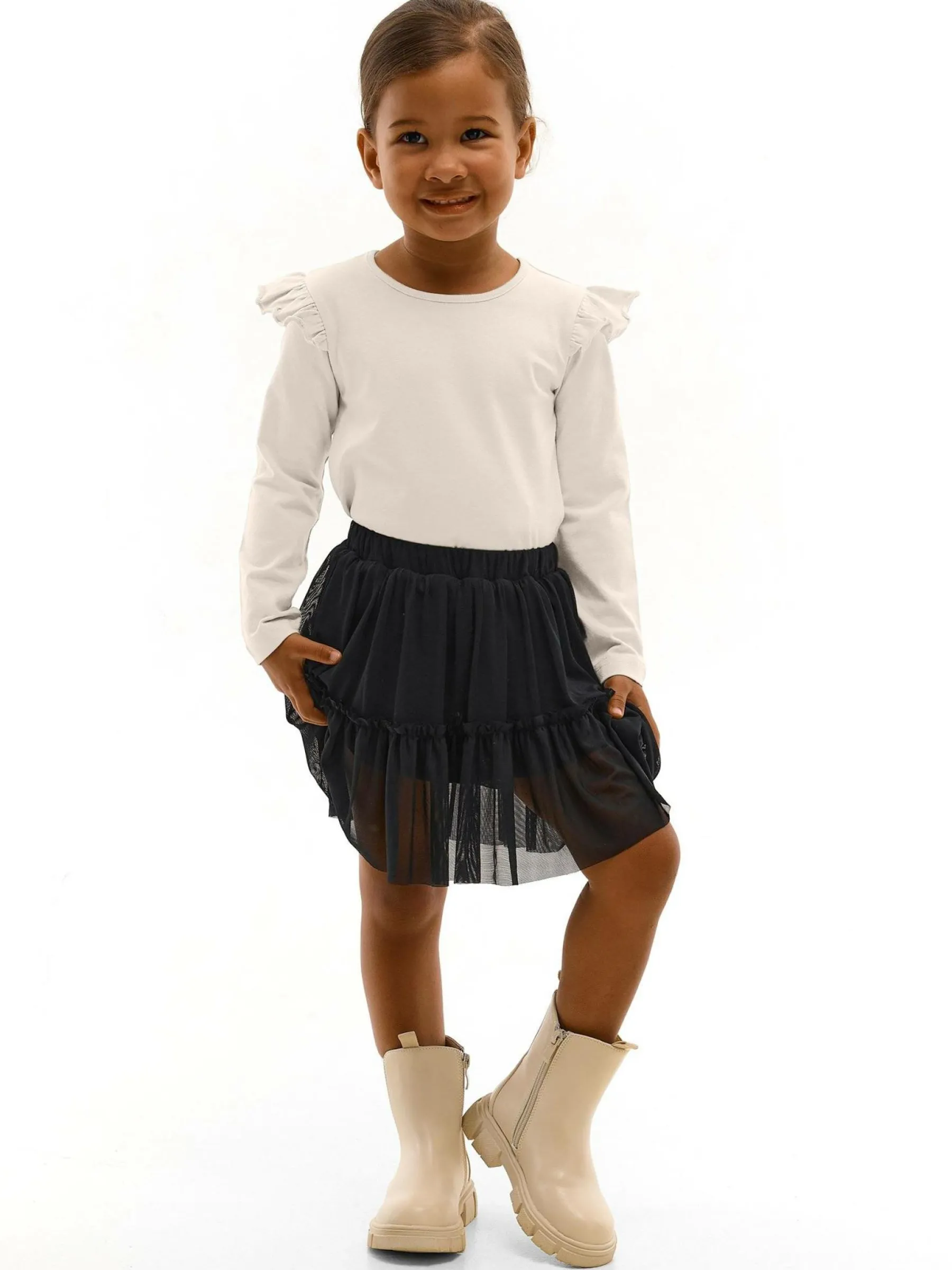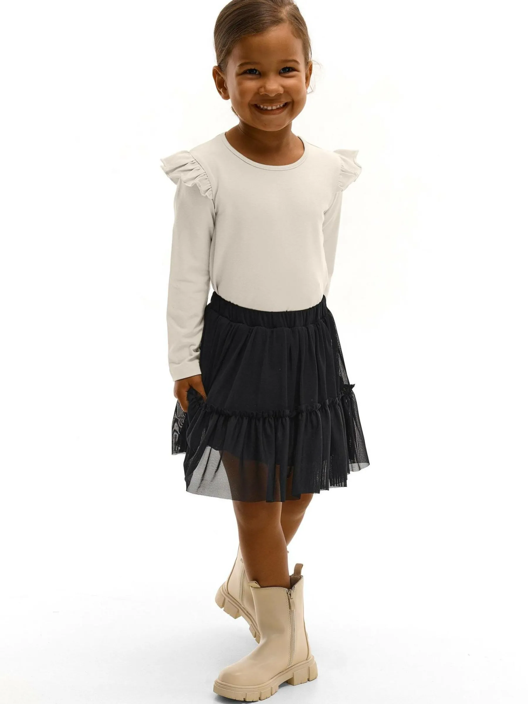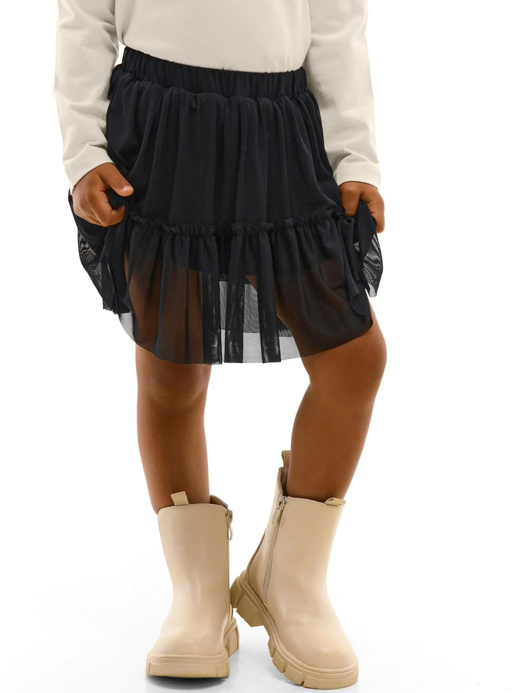 Kolor: czarnyKrój: z falbanąTyp: spódnicaDługość: miniPattern style: pojedynczy kolorDetal: z elastyczną opaską,…