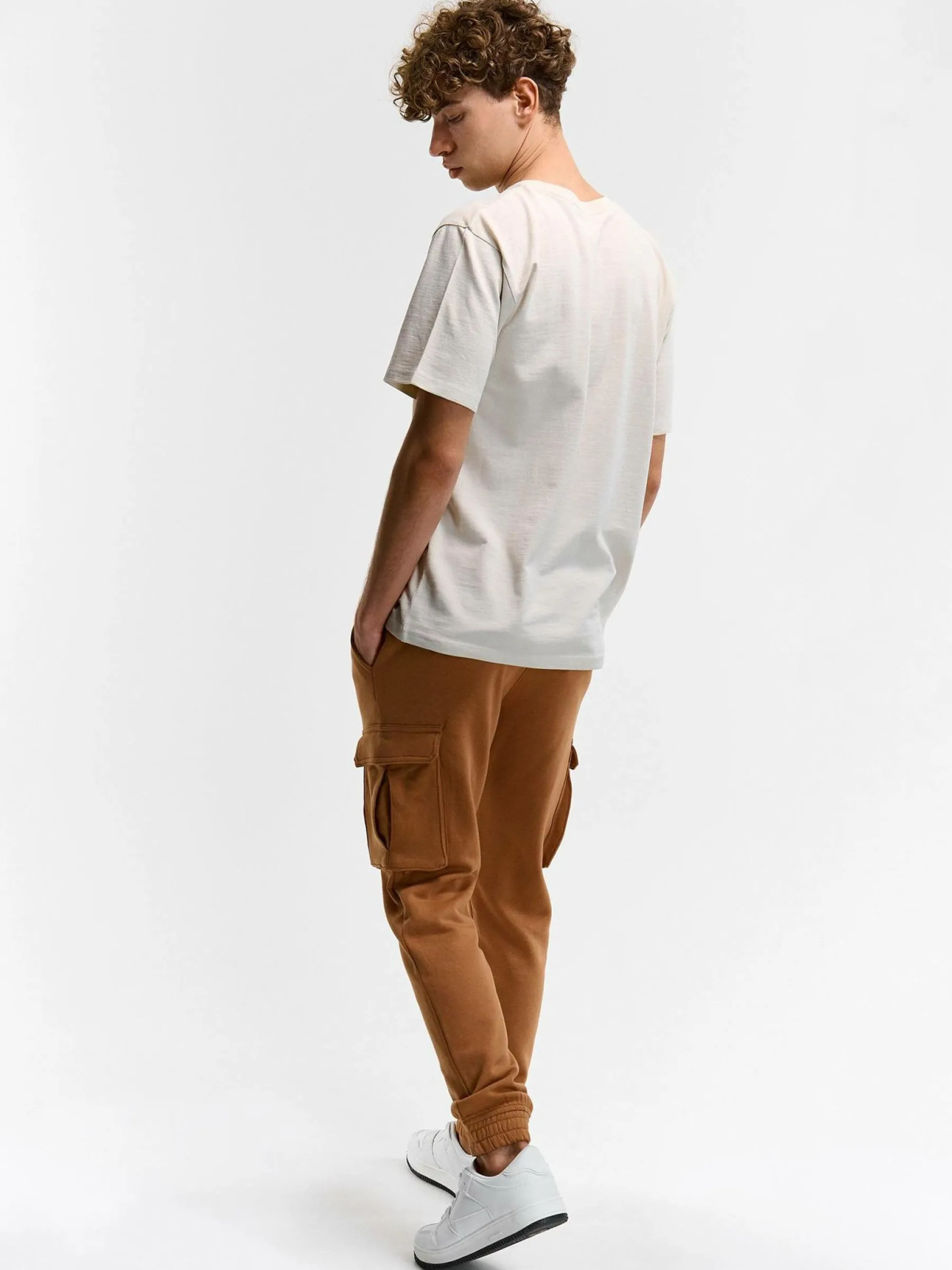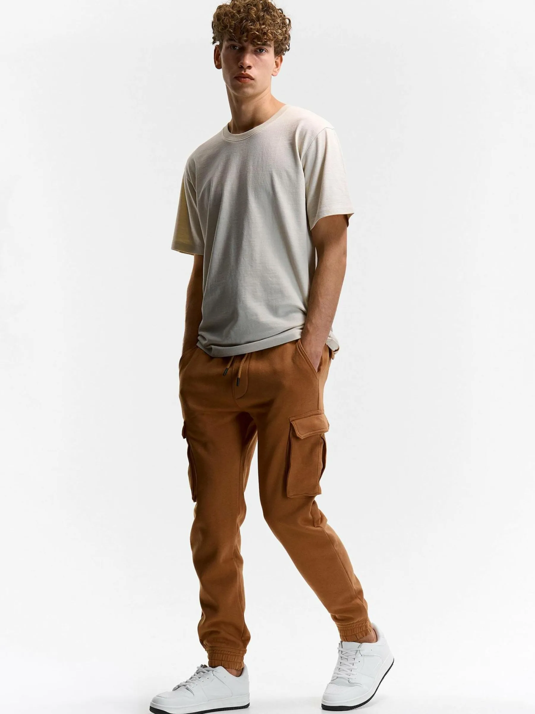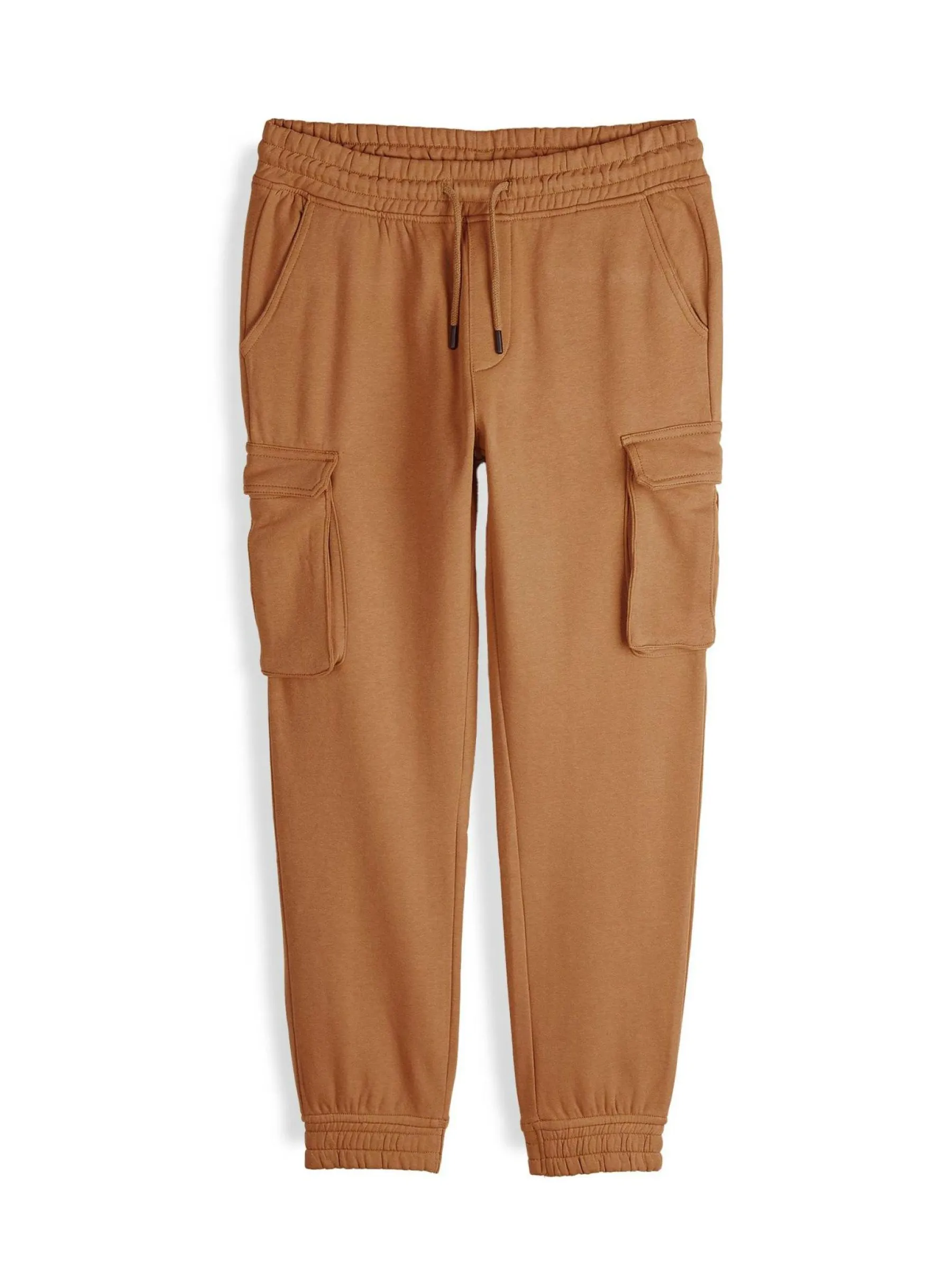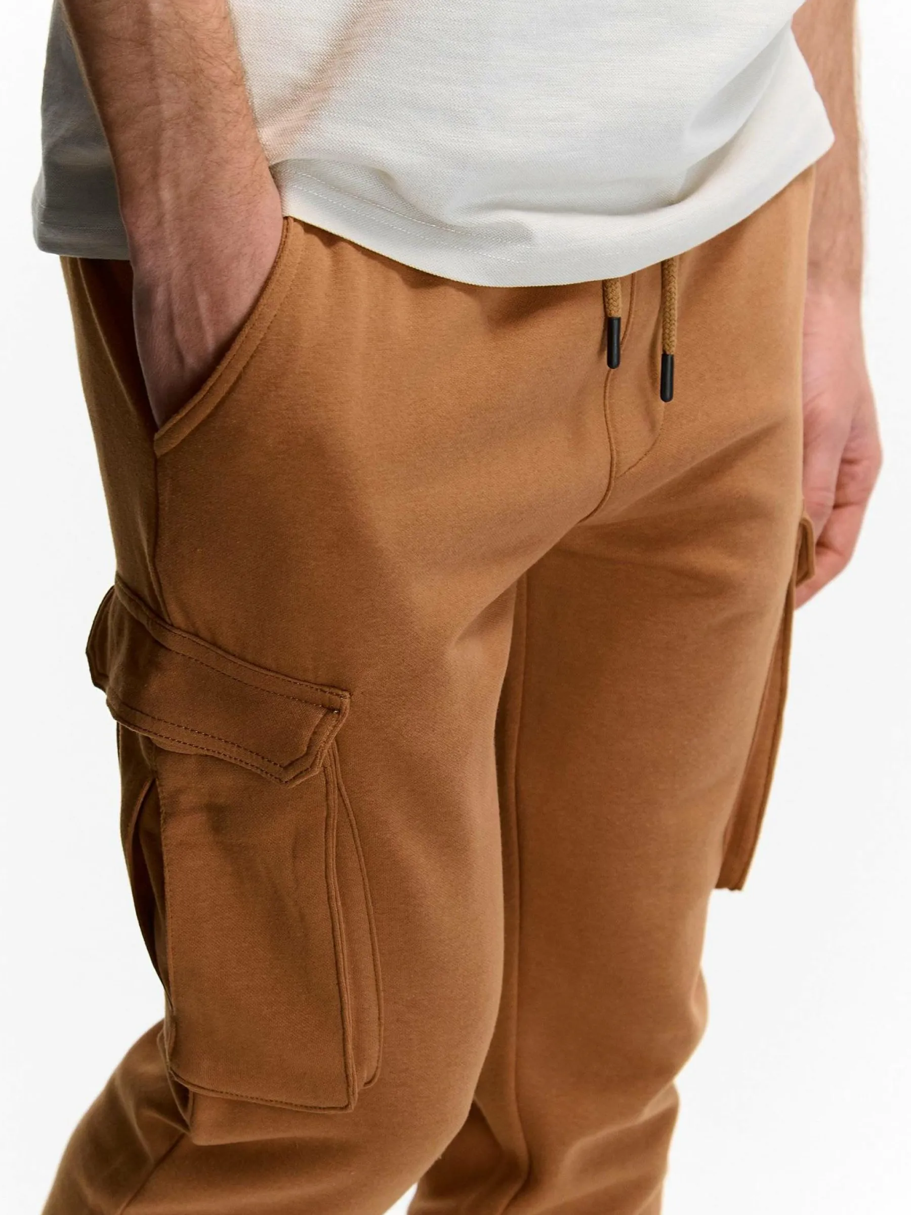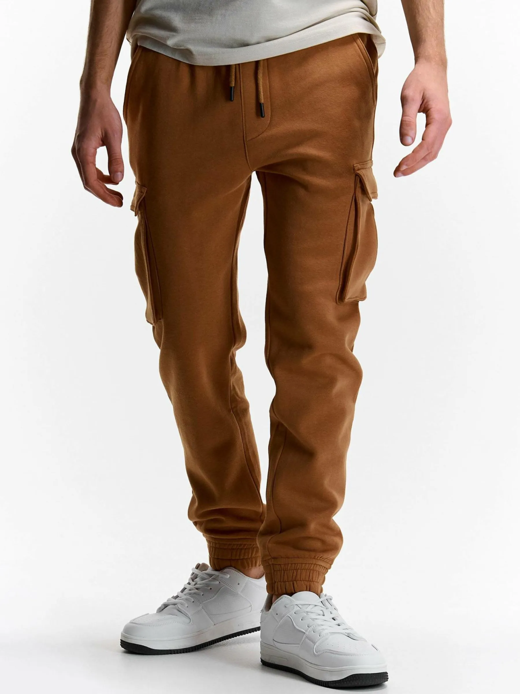 Kolor: brązowyKrój: cargo, joggerTyp: spodnie dresoweDługość: dlugiePattern style: pojedynczy kolorDetal: ze sznuro…