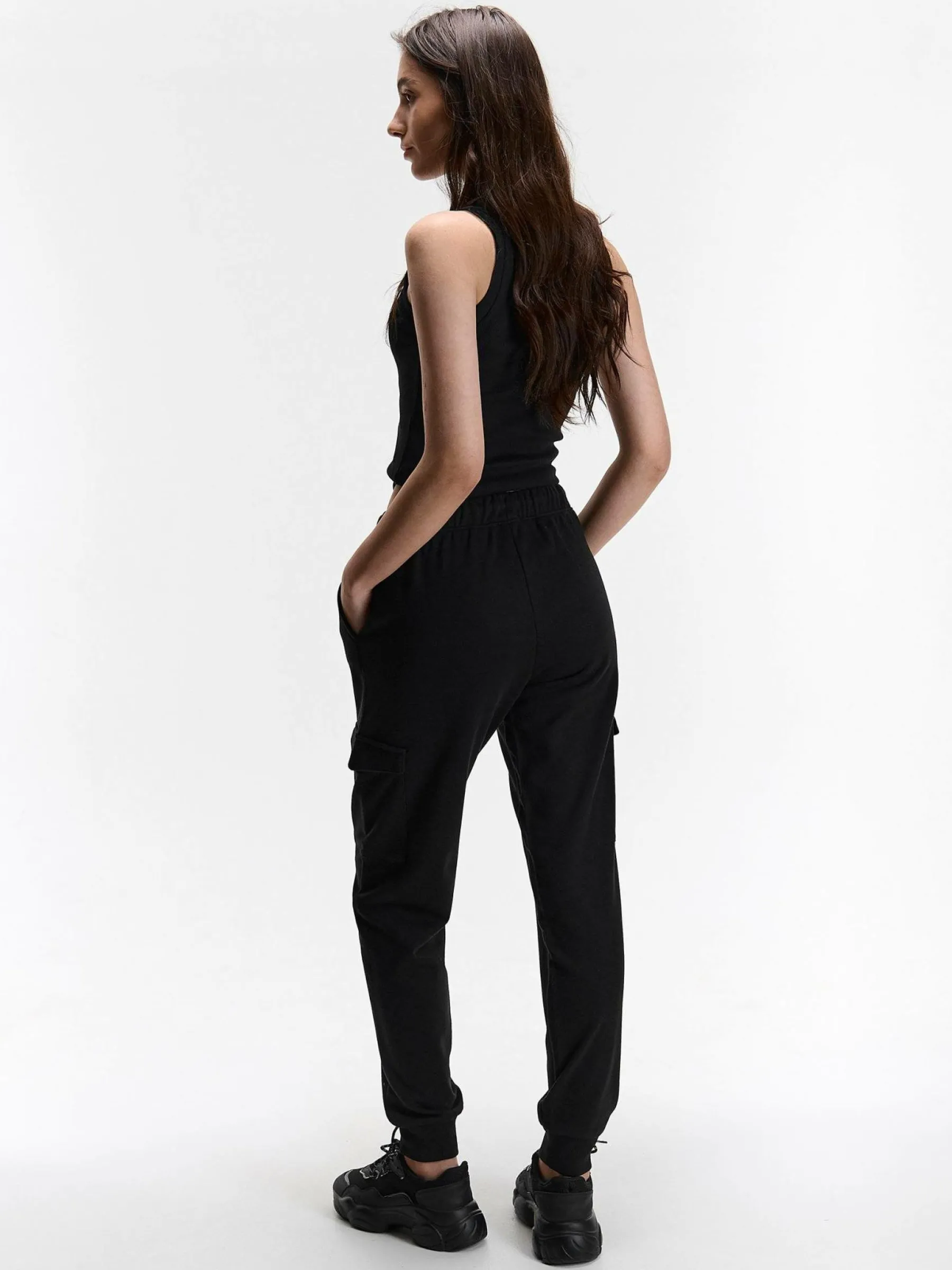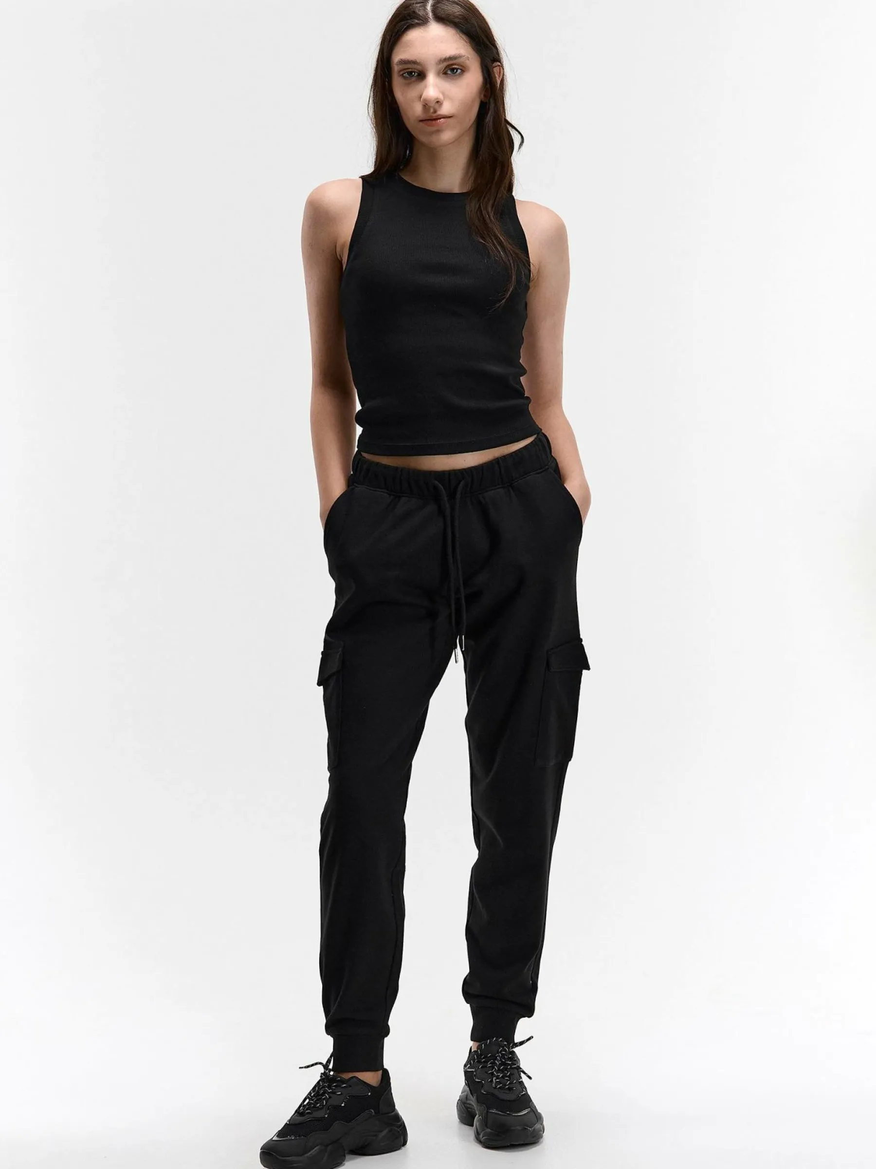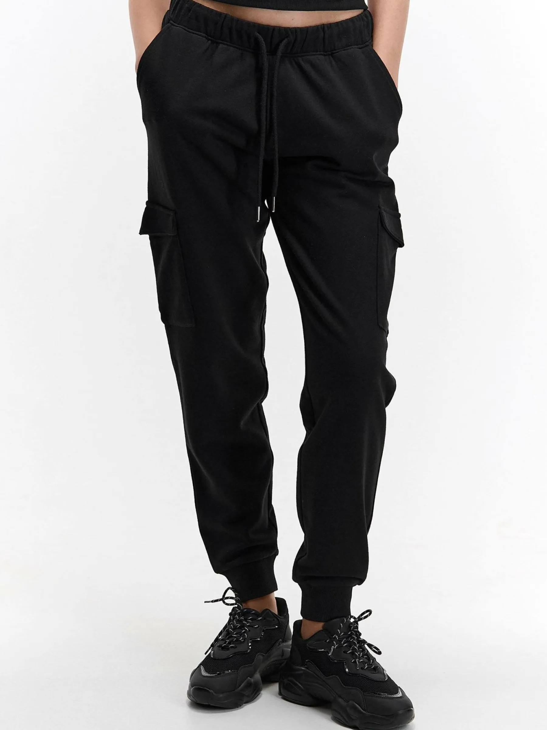 Kolor: czarnyKrój: cargoTyp: spodnie dresoweDługość: dlugiePattern style: pojedynczy kolorDetal: ze sznurowaniem, z …