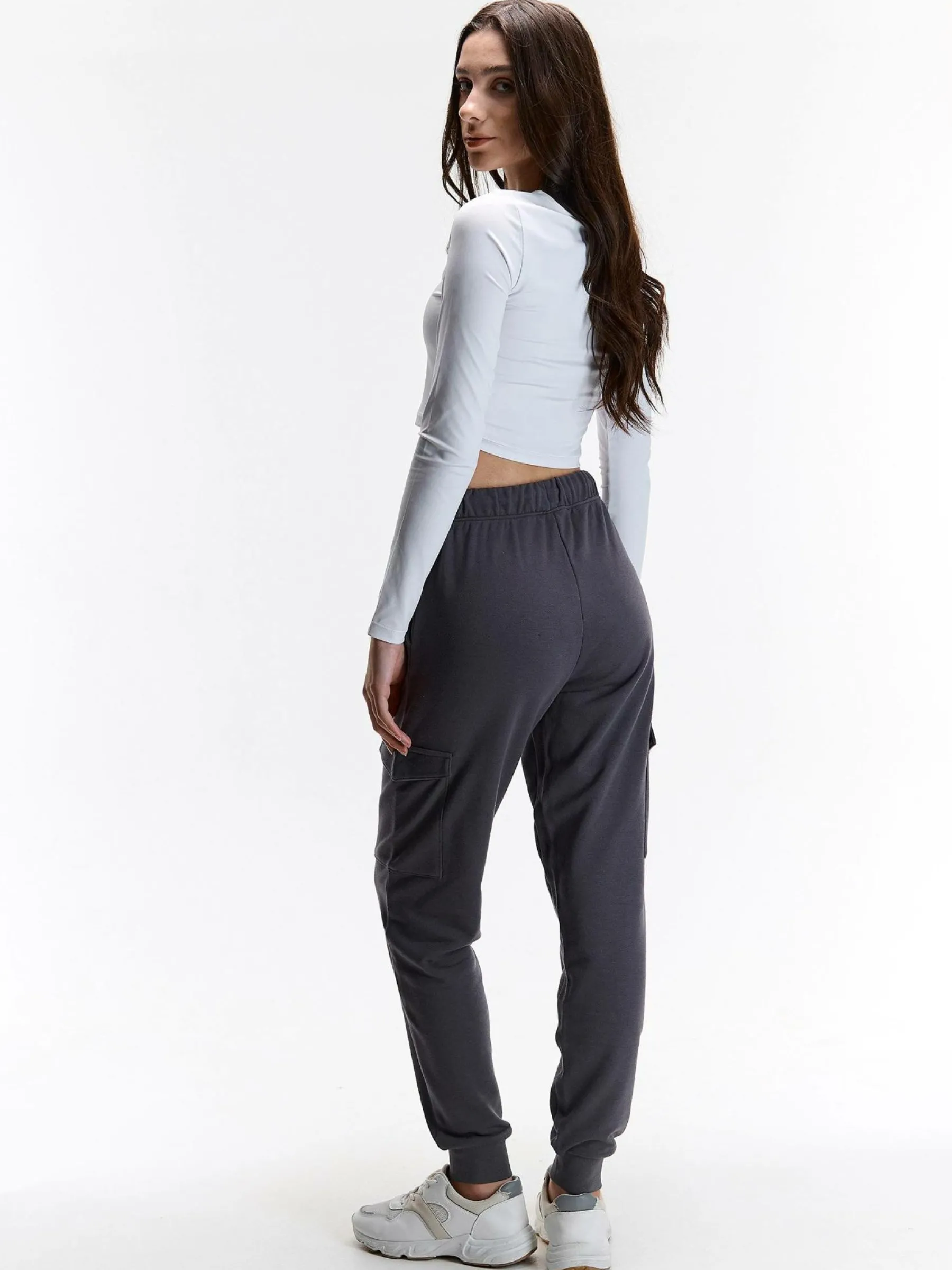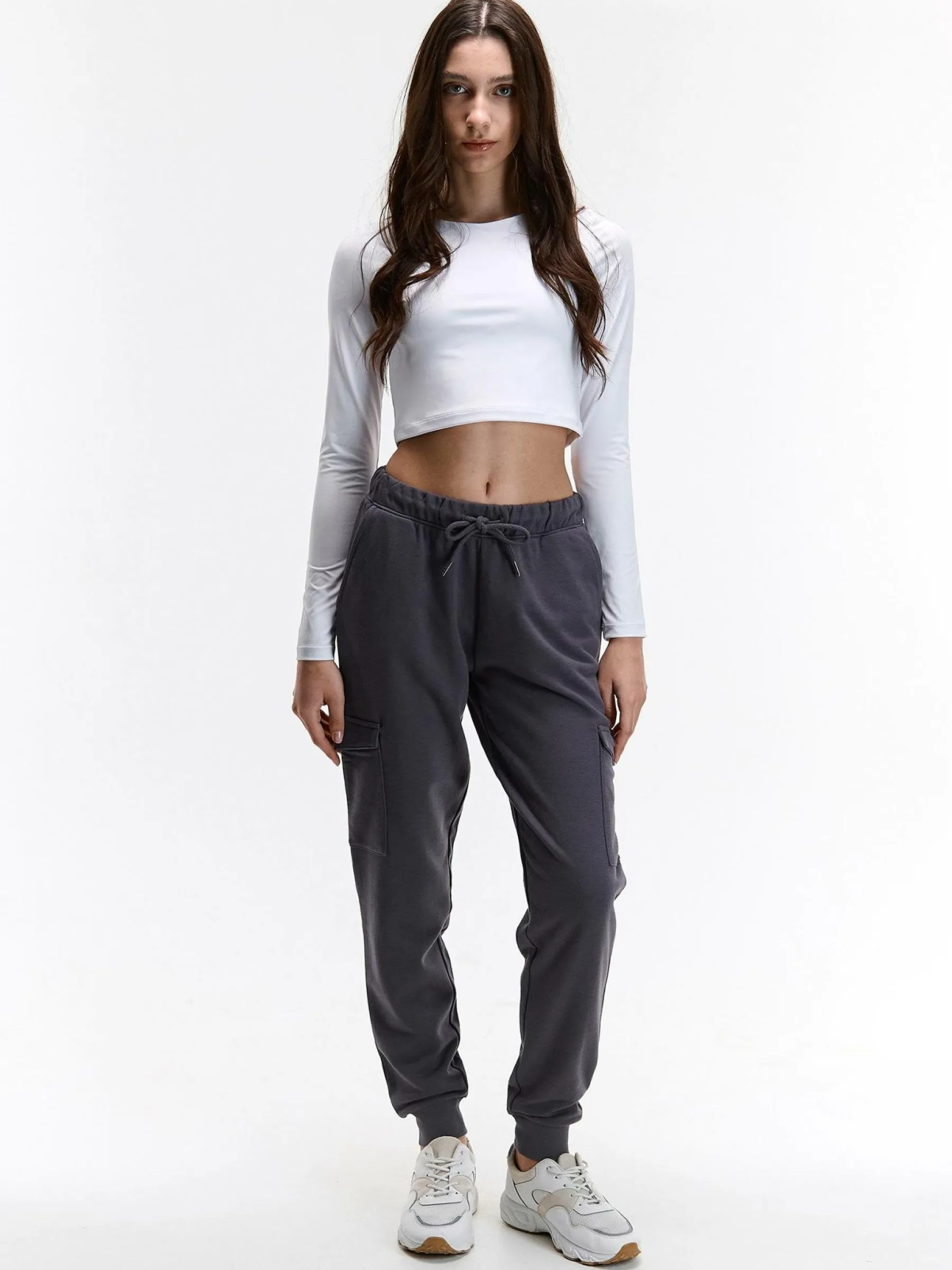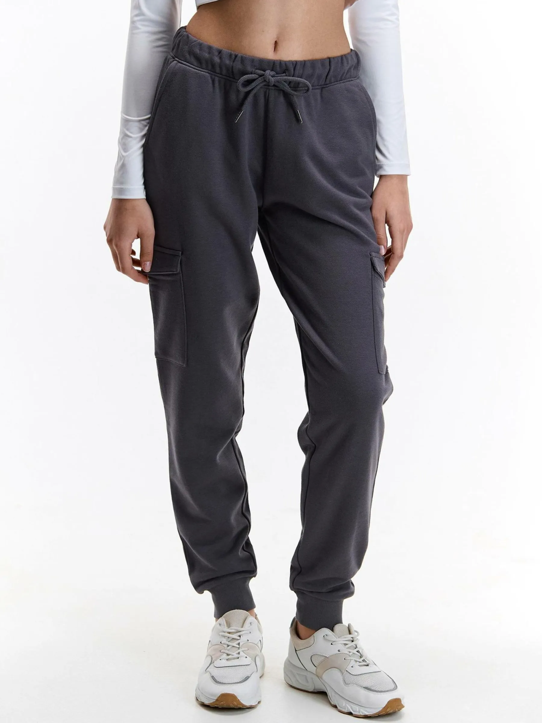 Kolor: szaryKrój: cargoTyp: spodnie dresoweDługość: dlugiePattern style: pojedynczy kolorDetal: ze sznurowaniem, z k…
