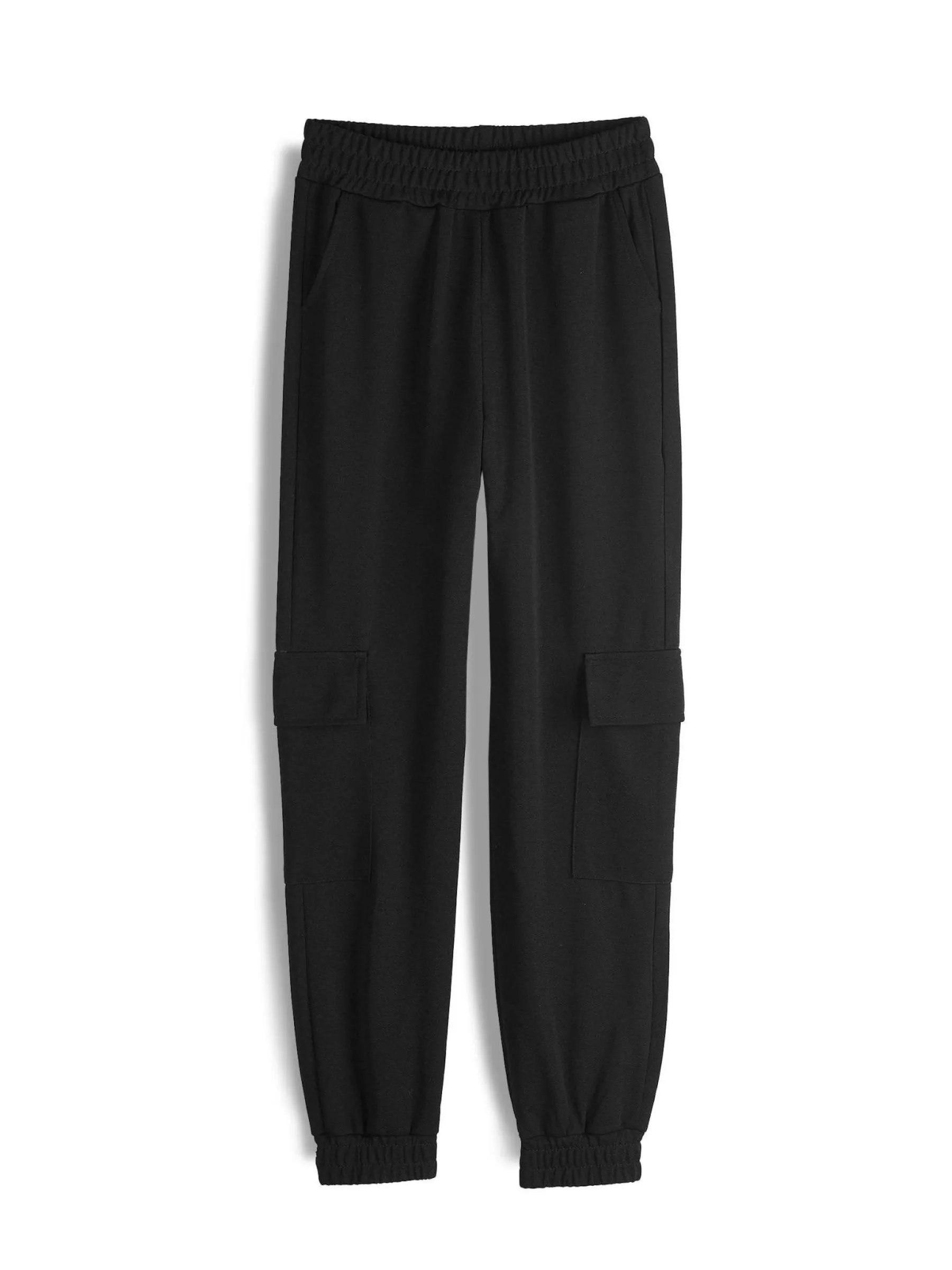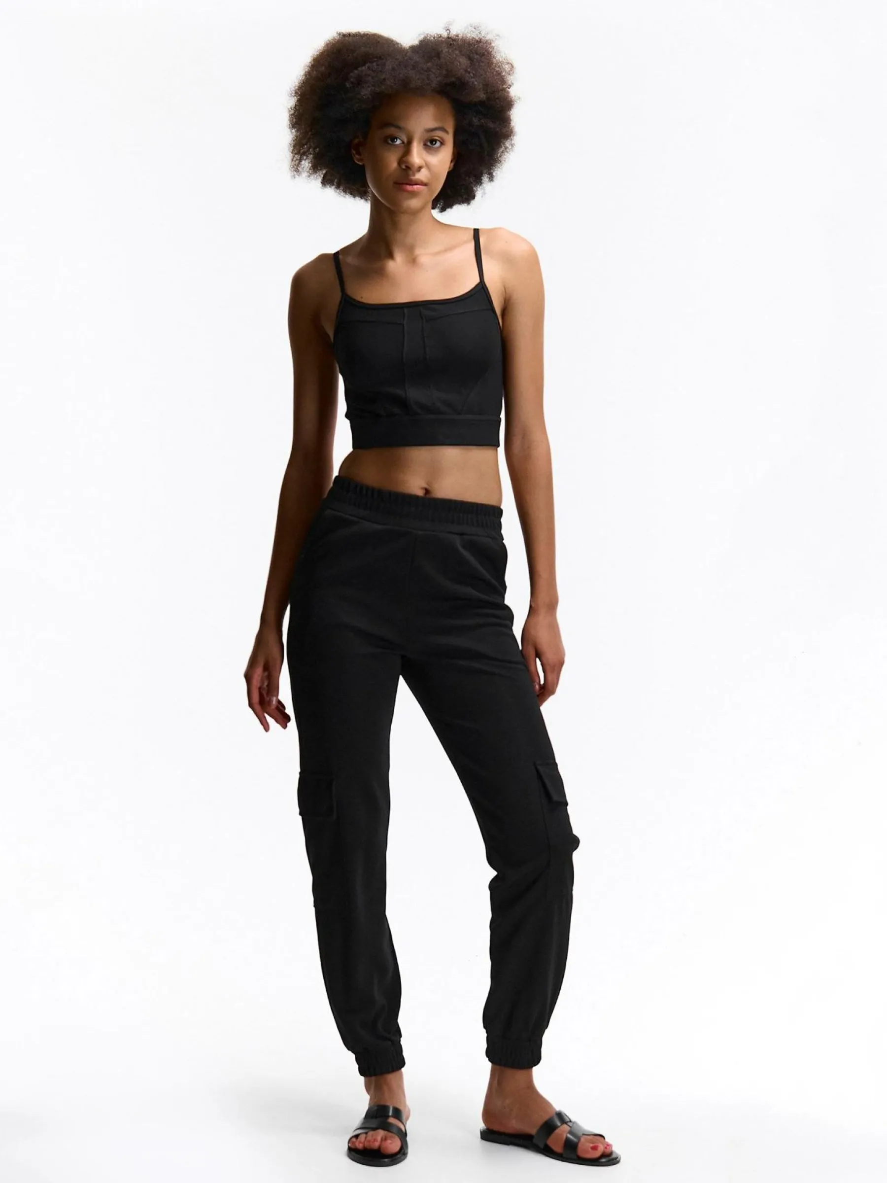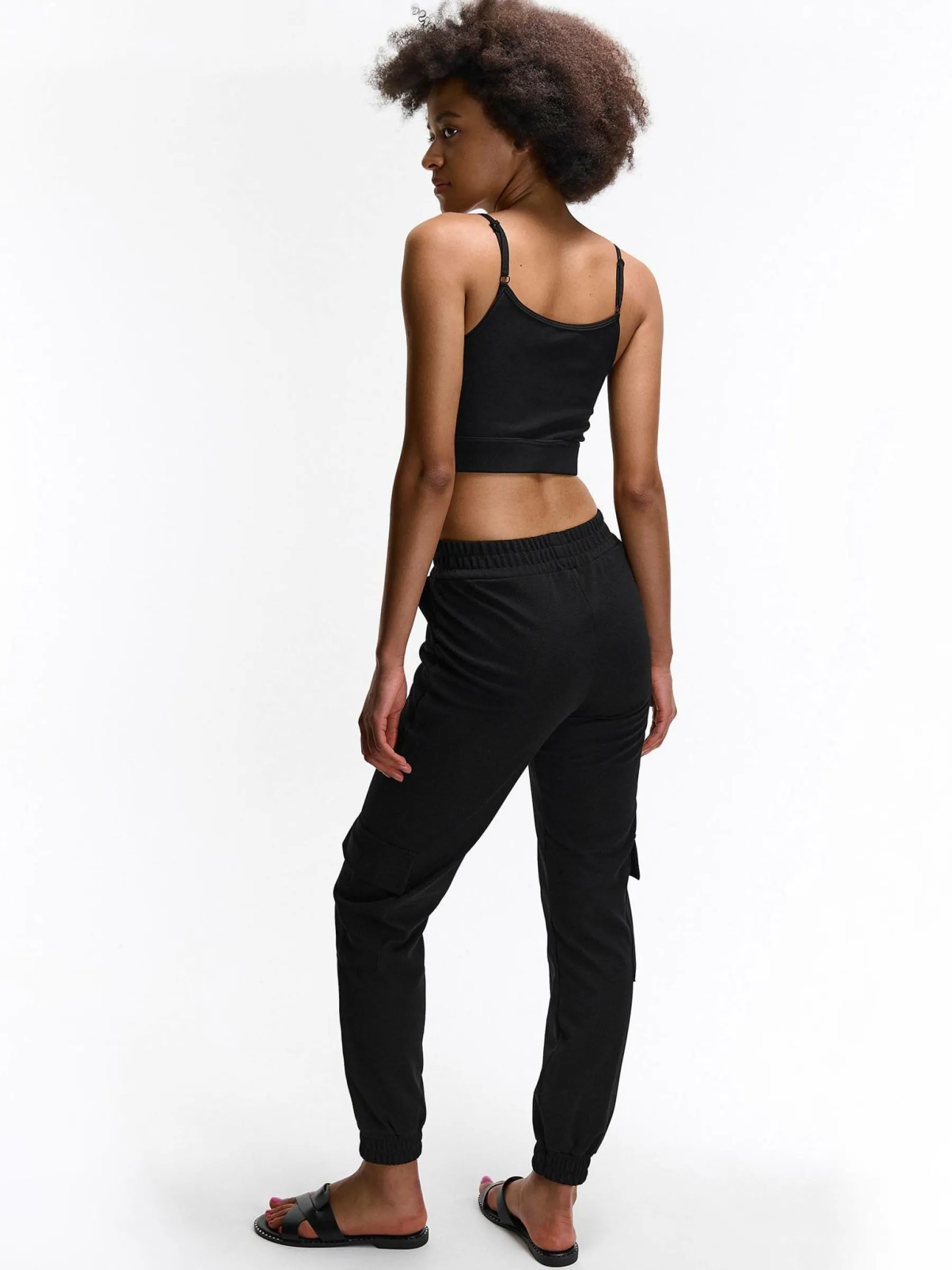 Kolor: czarnyKrój: cargoTyp: spodnie dresoweDługość: dlugiePattern style: pojedynczy kolorDetal: z kieszeniami, z el…