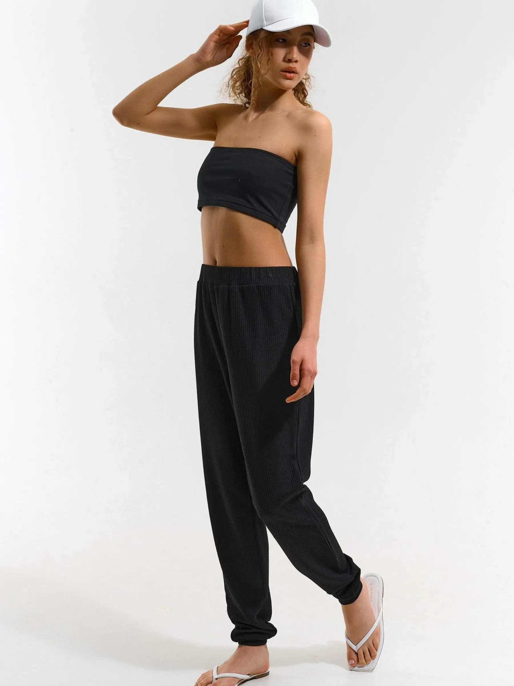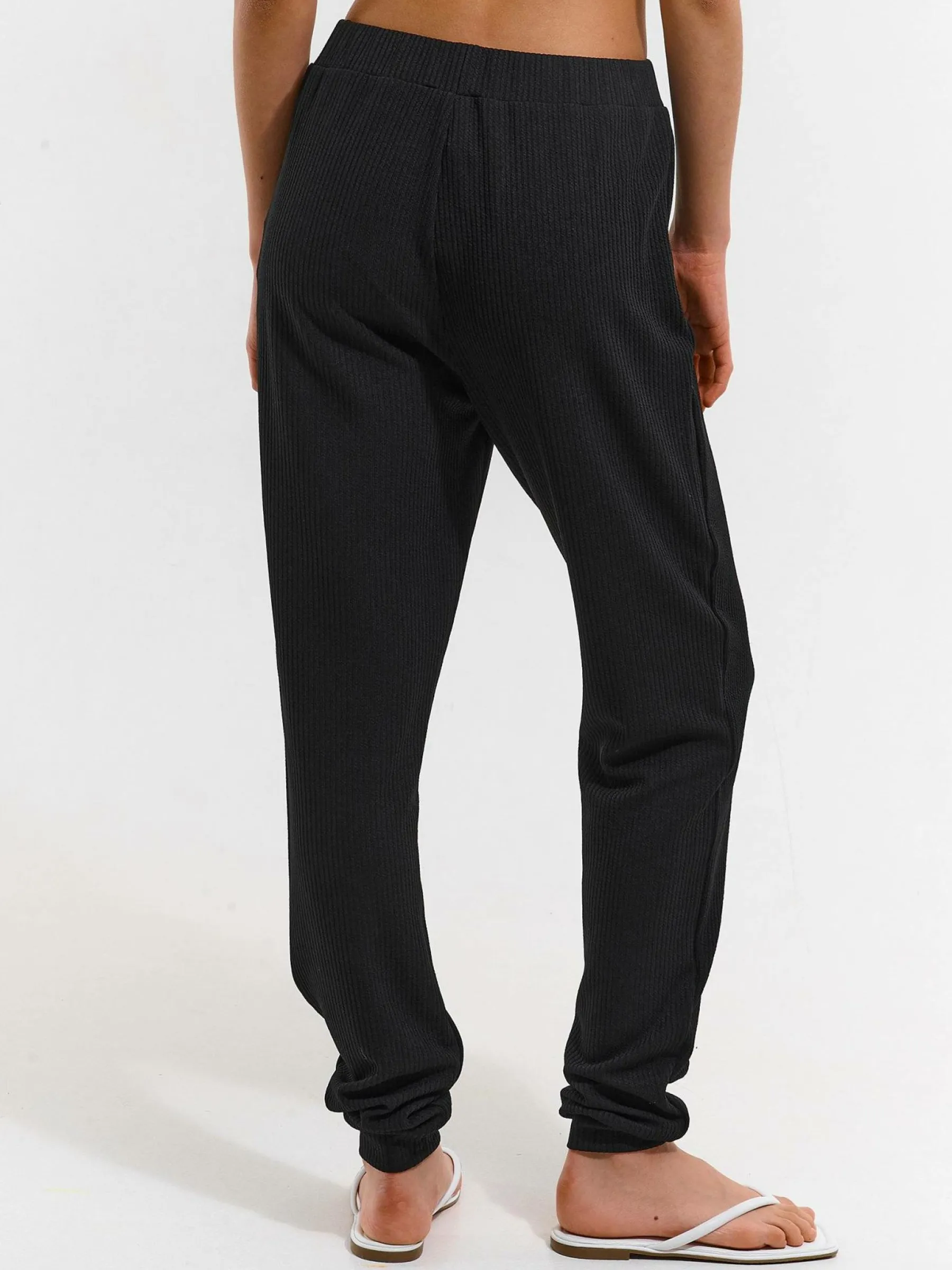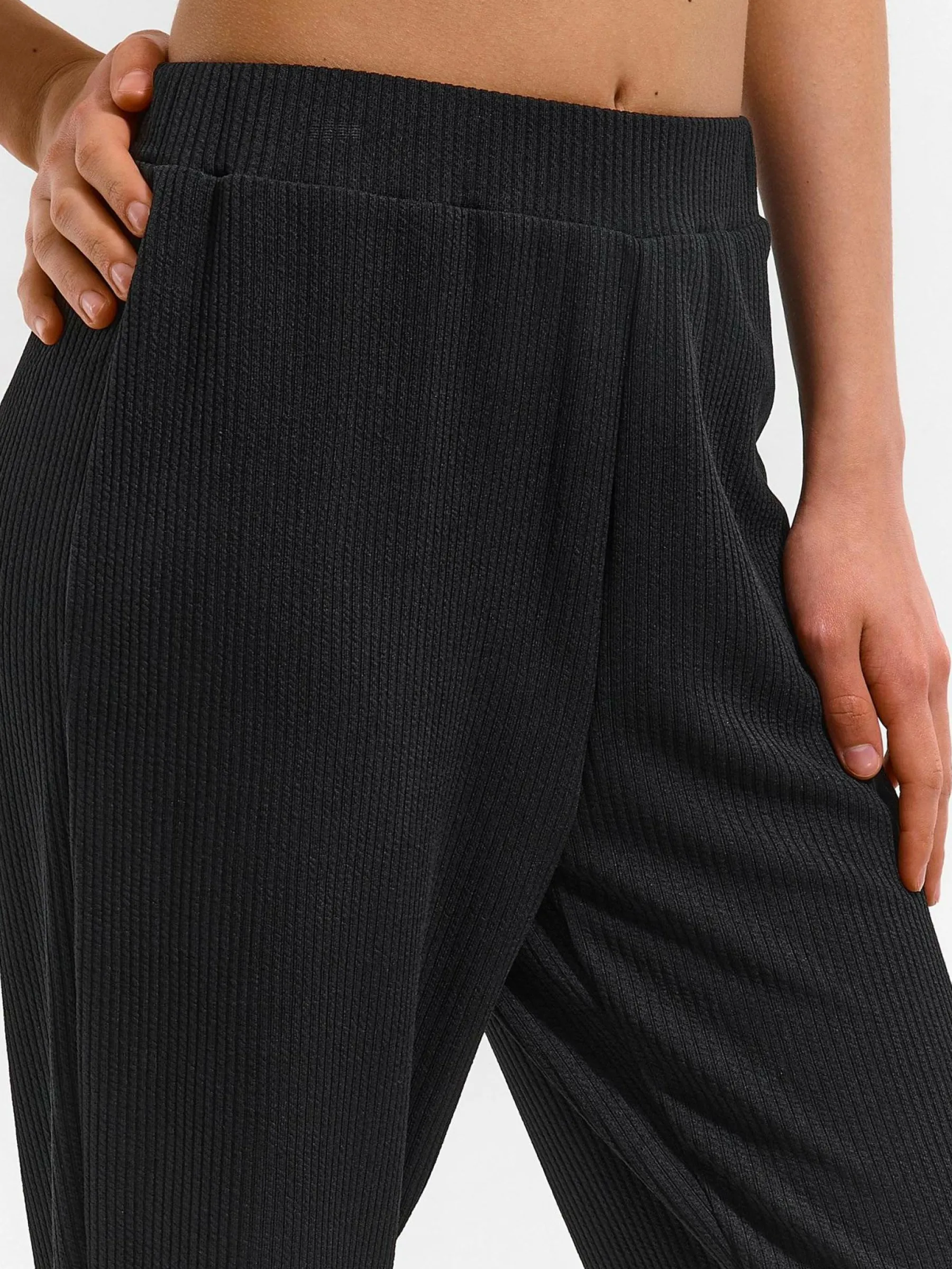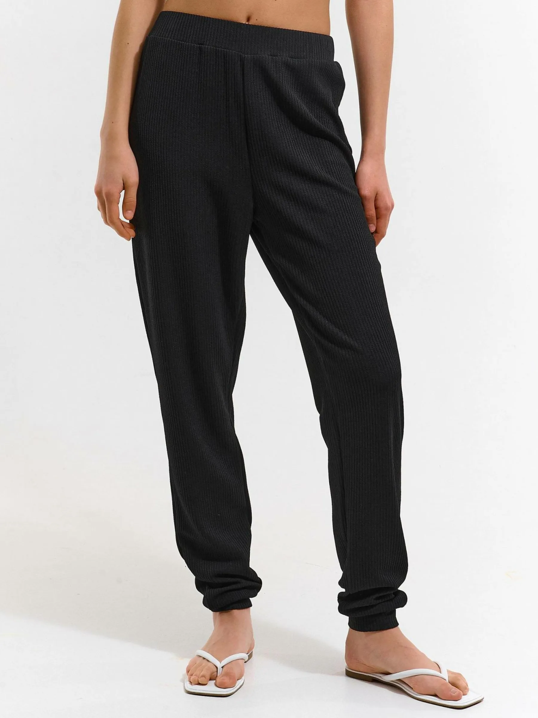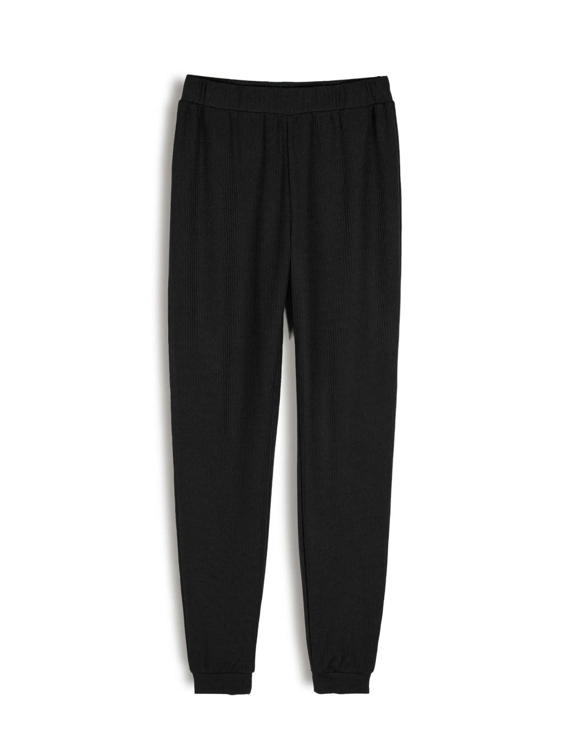 Kolor: czarnyKrój: joggerTyp: spodnie dresoweDługość: dlugiePattern style: pojedynczy kolor, żebrowanyMateriał: sy…