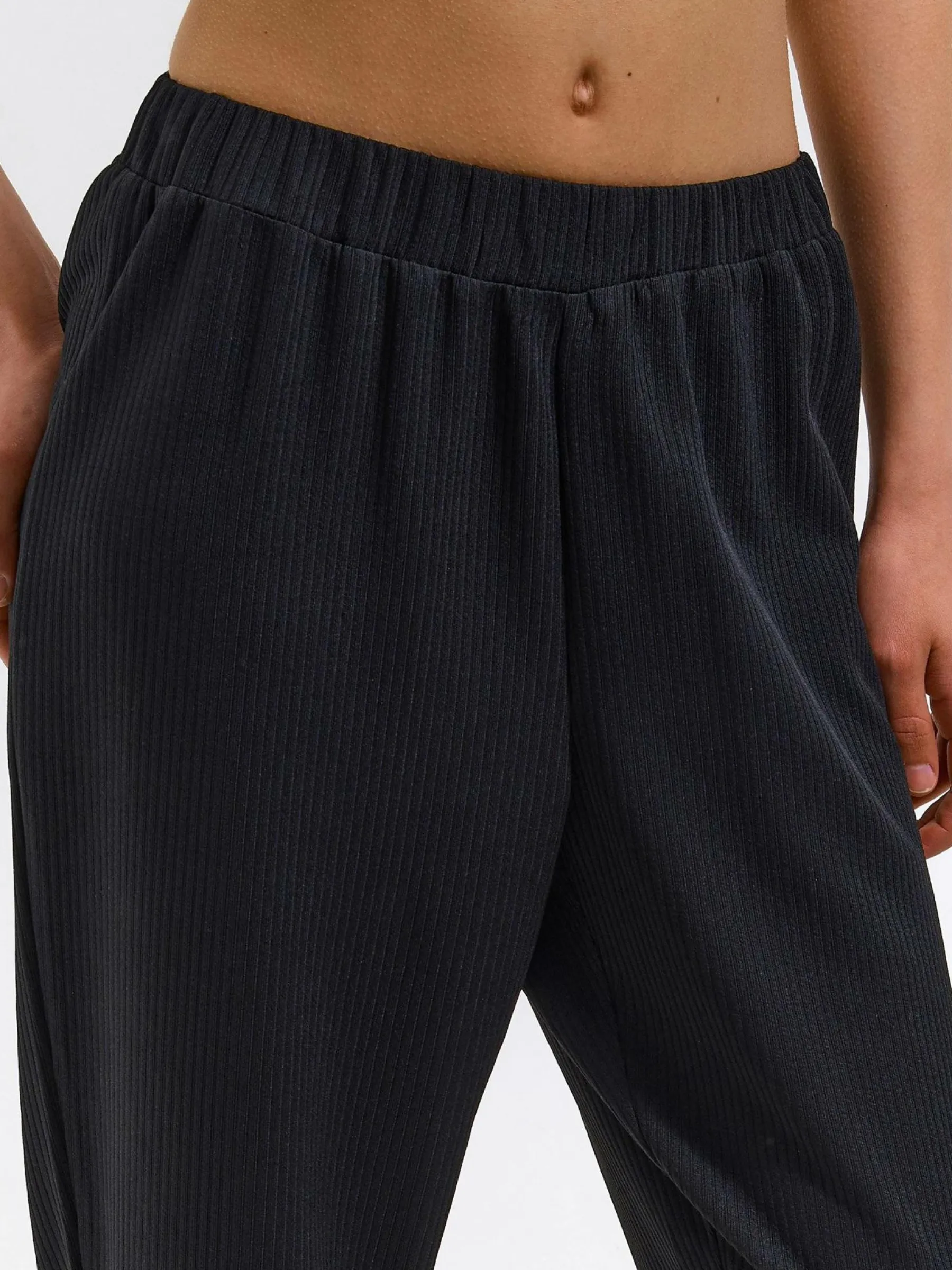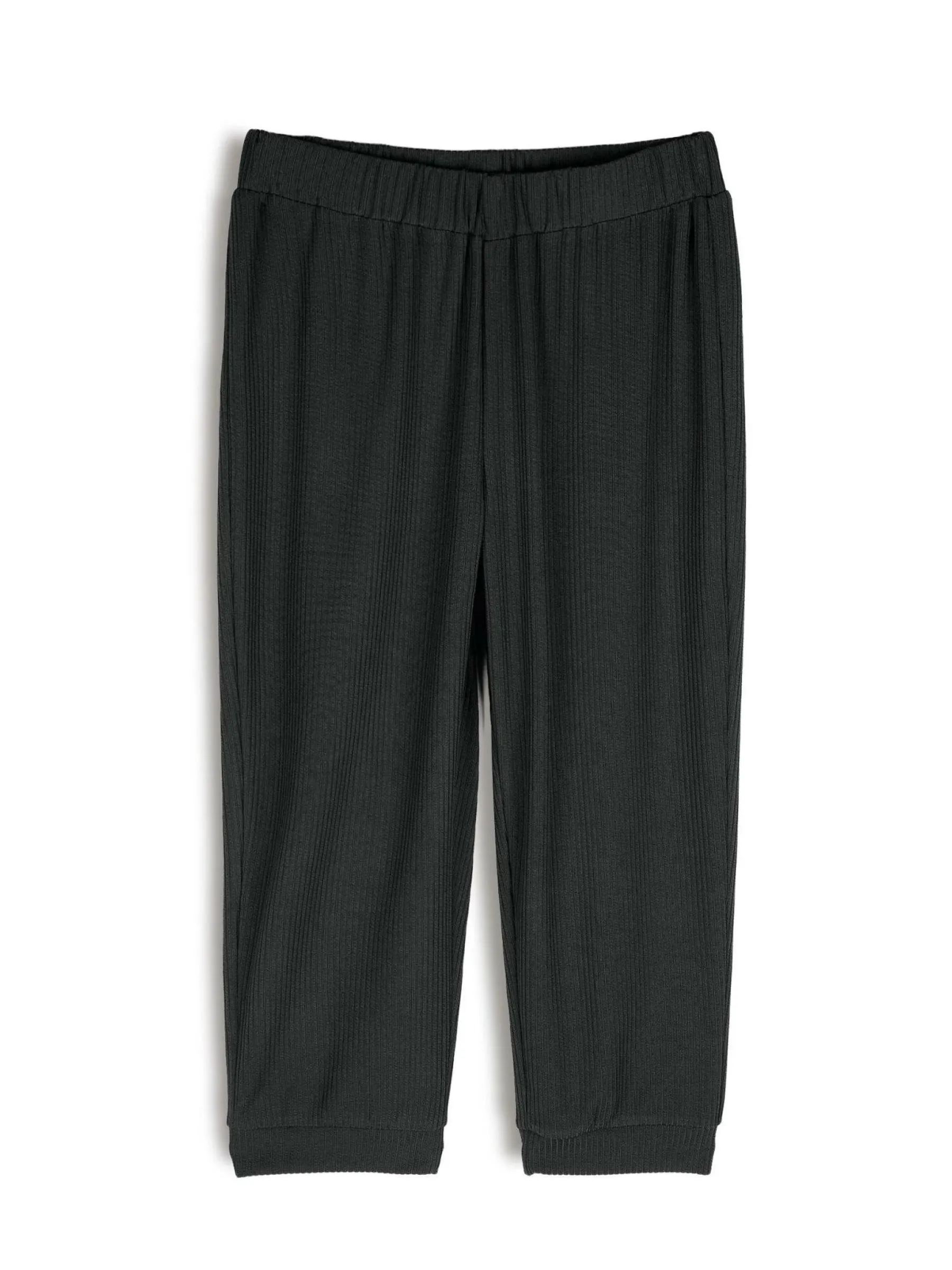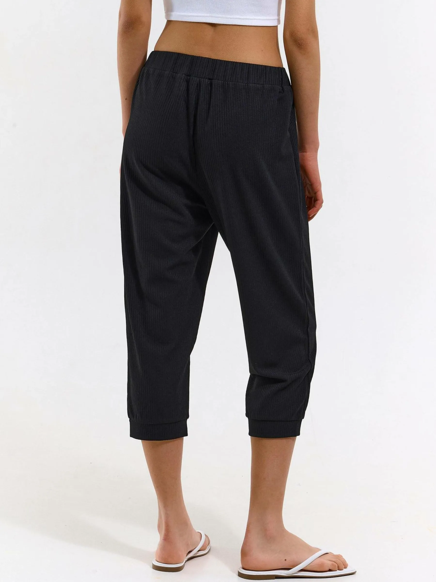 Kolor: czarnyKrój: joggerTyp: spodnie dresoweDługość: trzy czwartePattern style: pojedynczy kolor, żebrowanyDetal: …