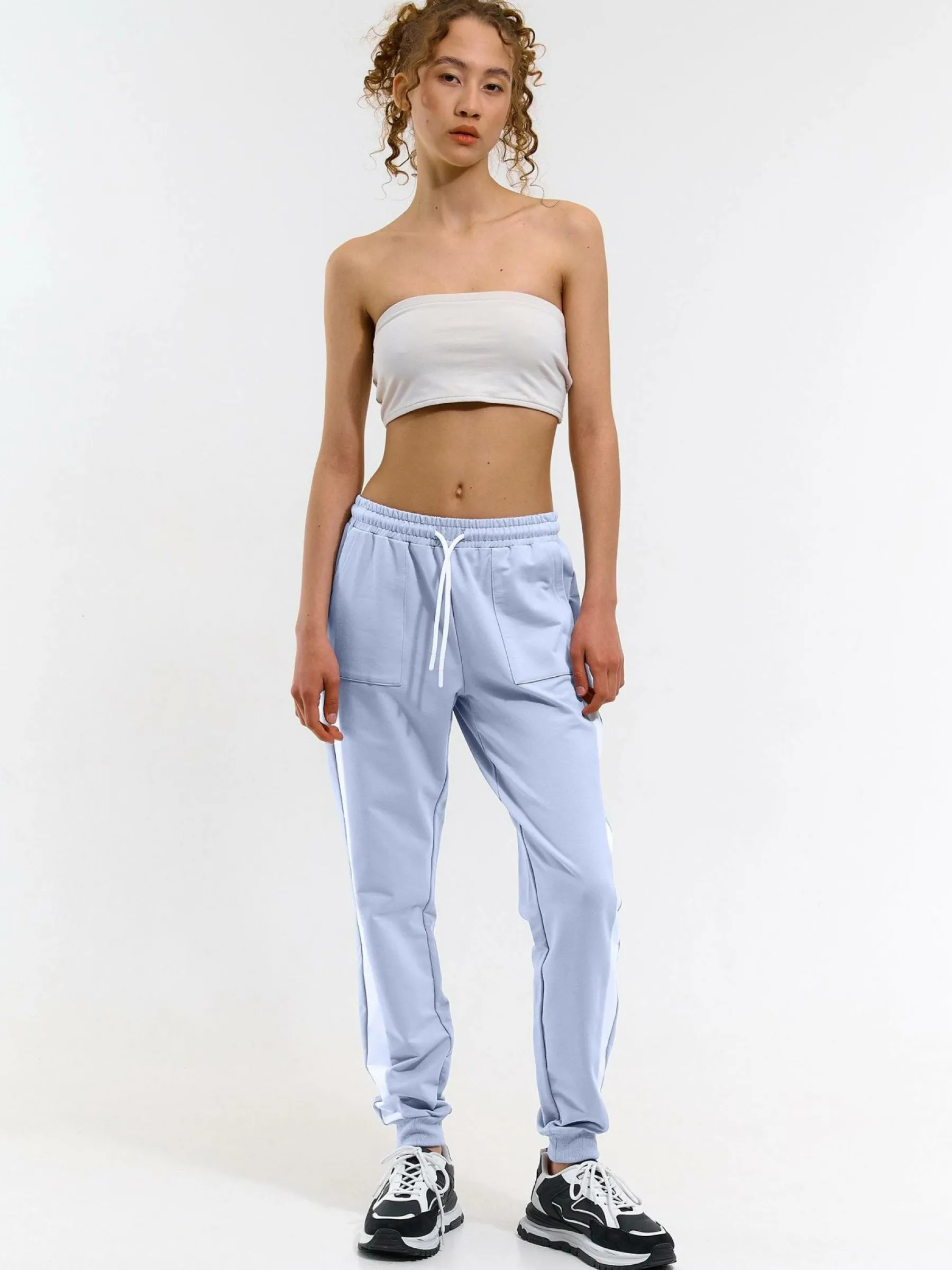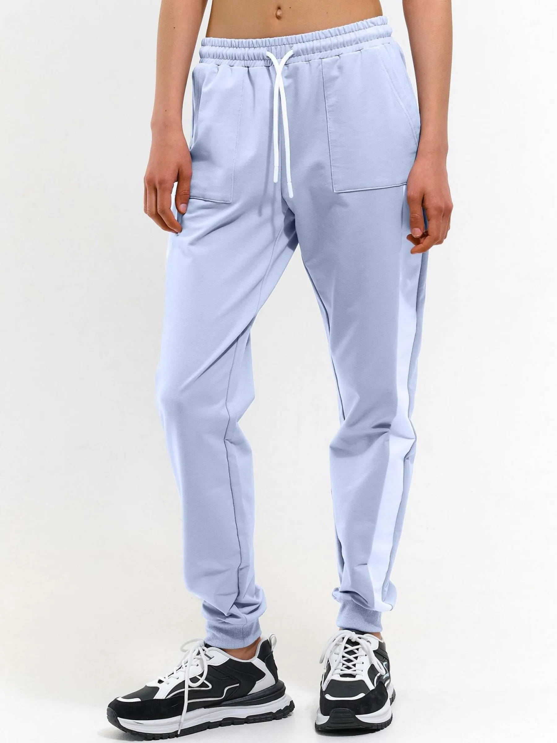 Kolor: niebieskiKrój: joggerTyp: spodnie dresoweDługość: dlugiePattern style: colour blockDetal: ze sznurowaniemMate…