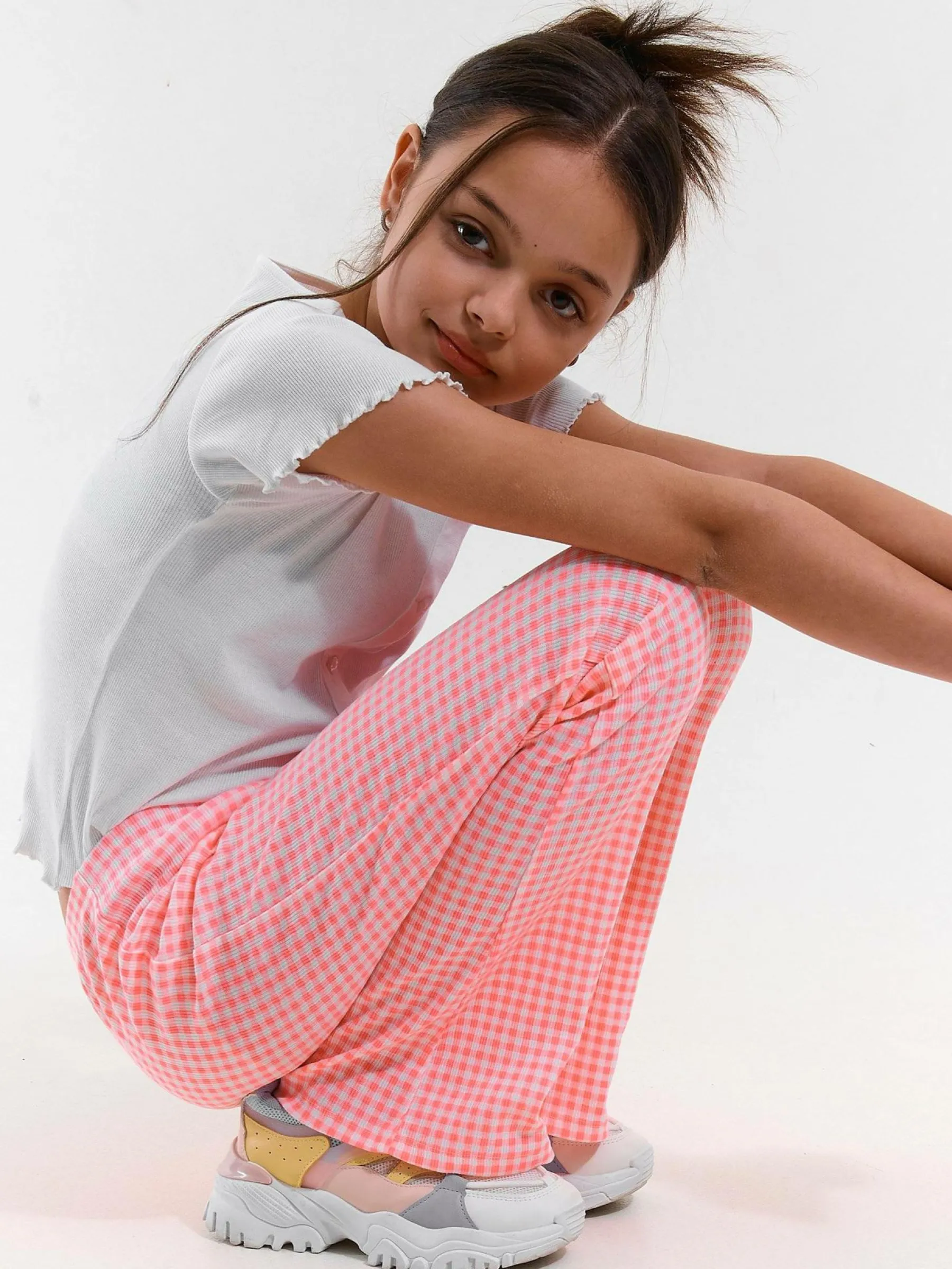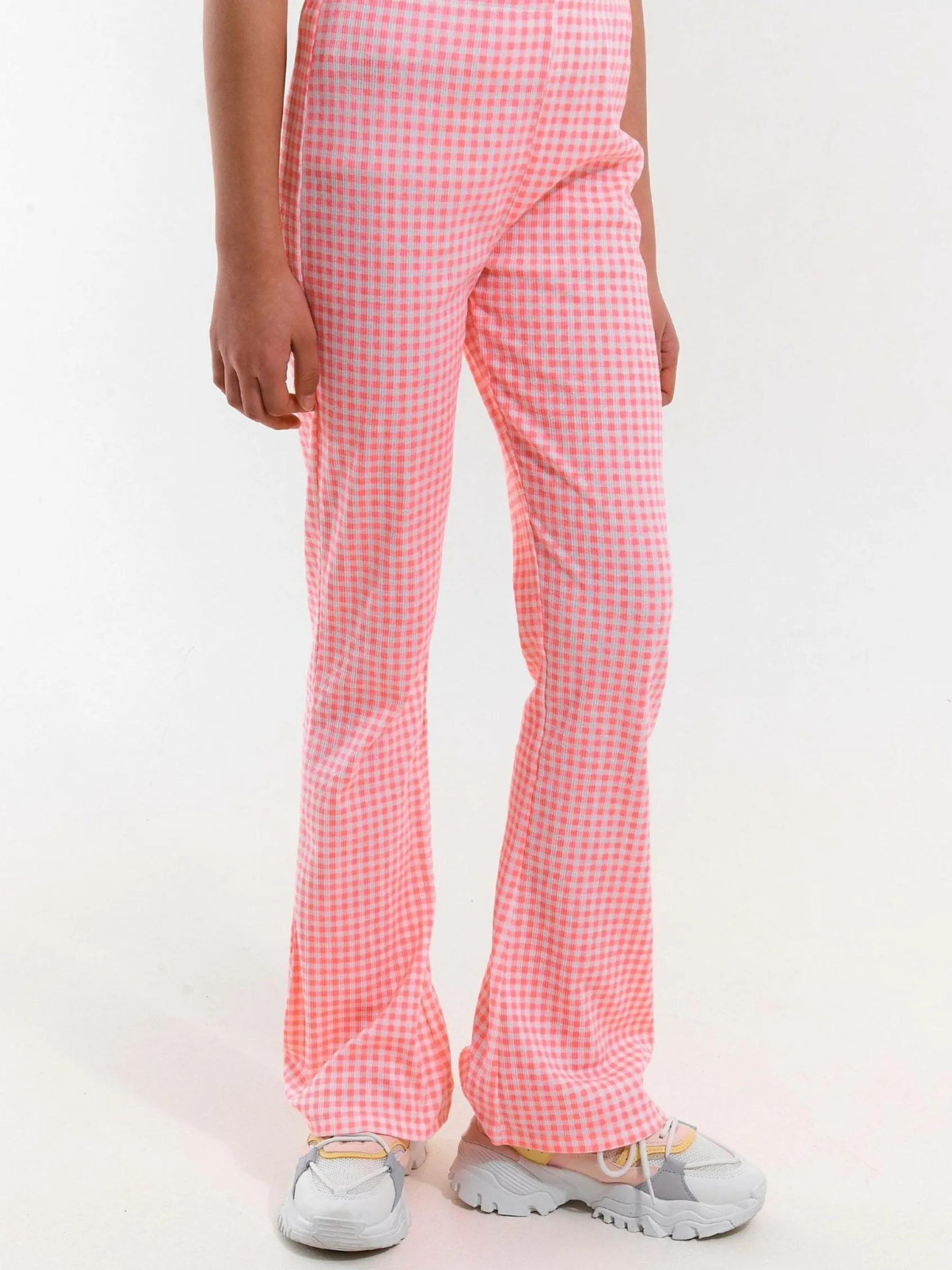 Kolor: różowyKrój: dzwonTyp: spodnieDługość: dlugiePattern style: w kratkęMateriał: mieszanyPłeć: dziewczynyOk…