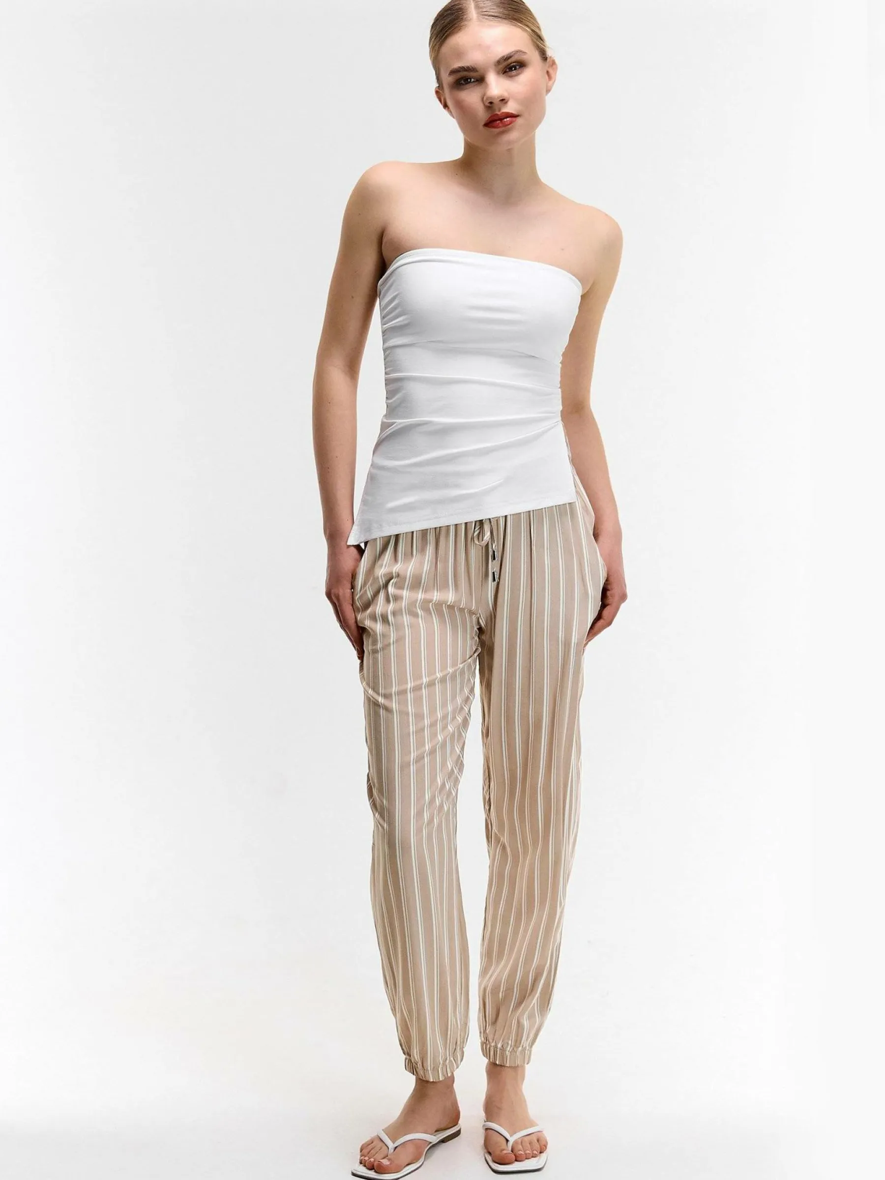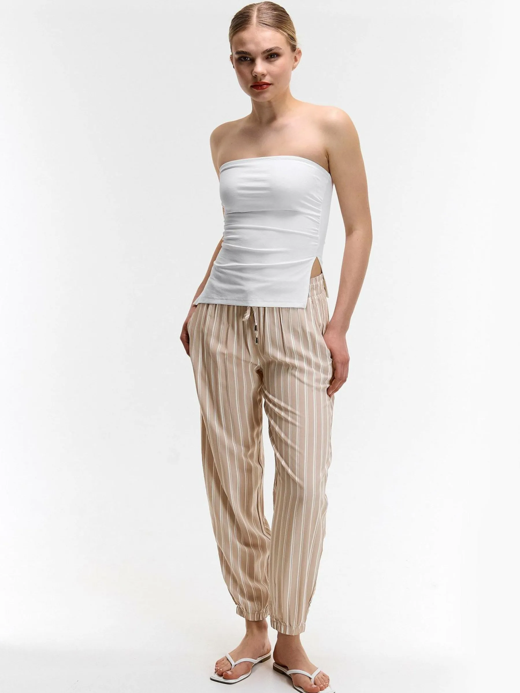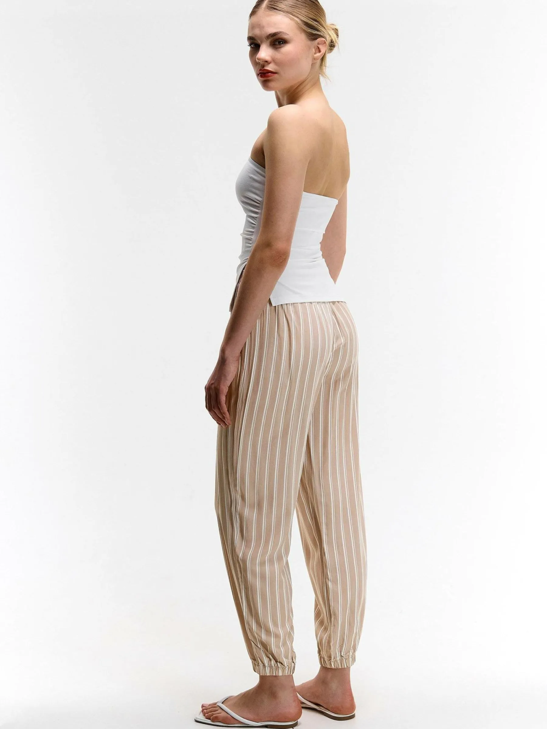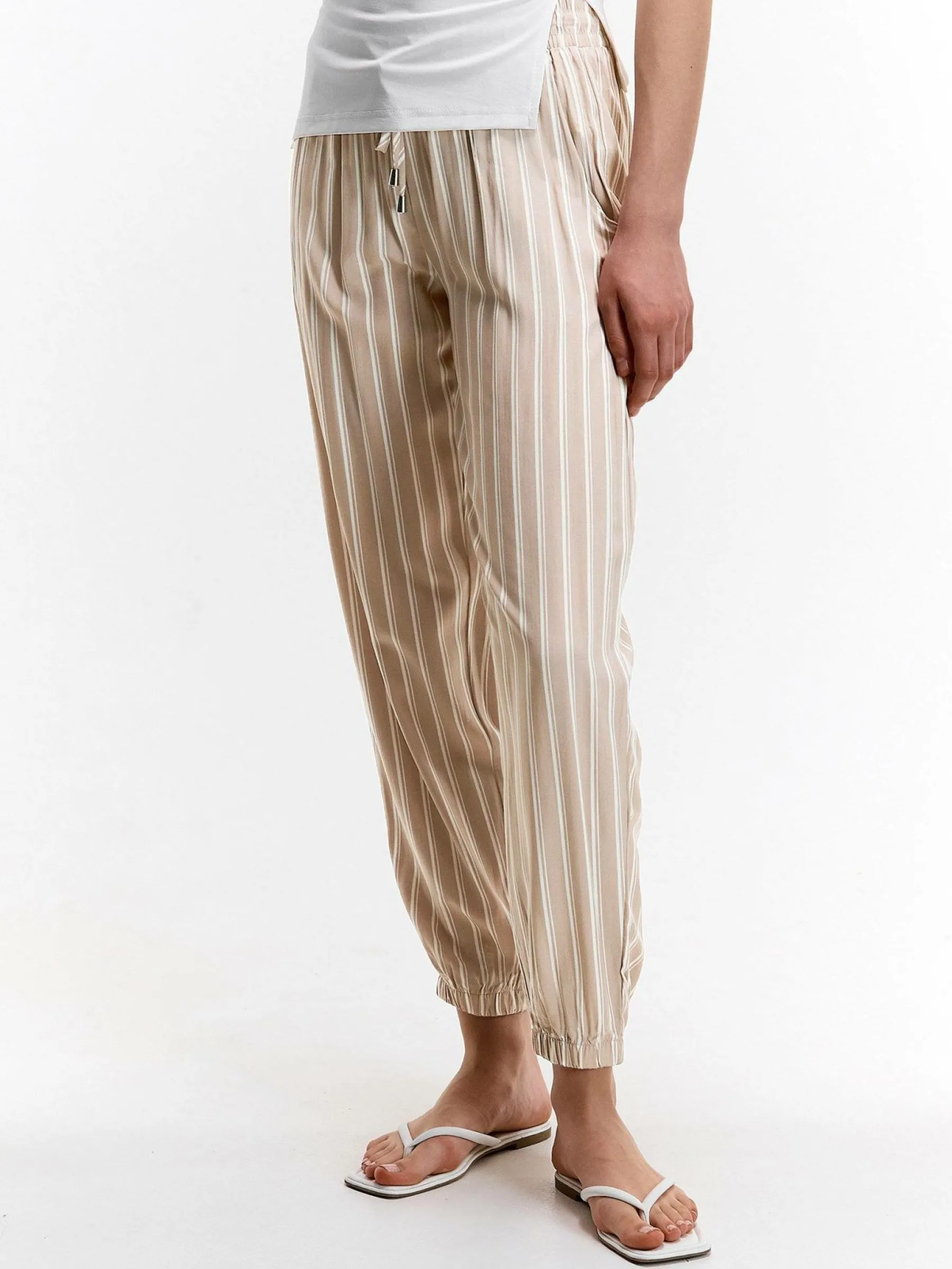 Kolor: beżowyKrój: haremTyp: spodnieDługość: dlugiePattern style: w prążkiDetal: ze sznurowaniemMateriał: wiskoz…