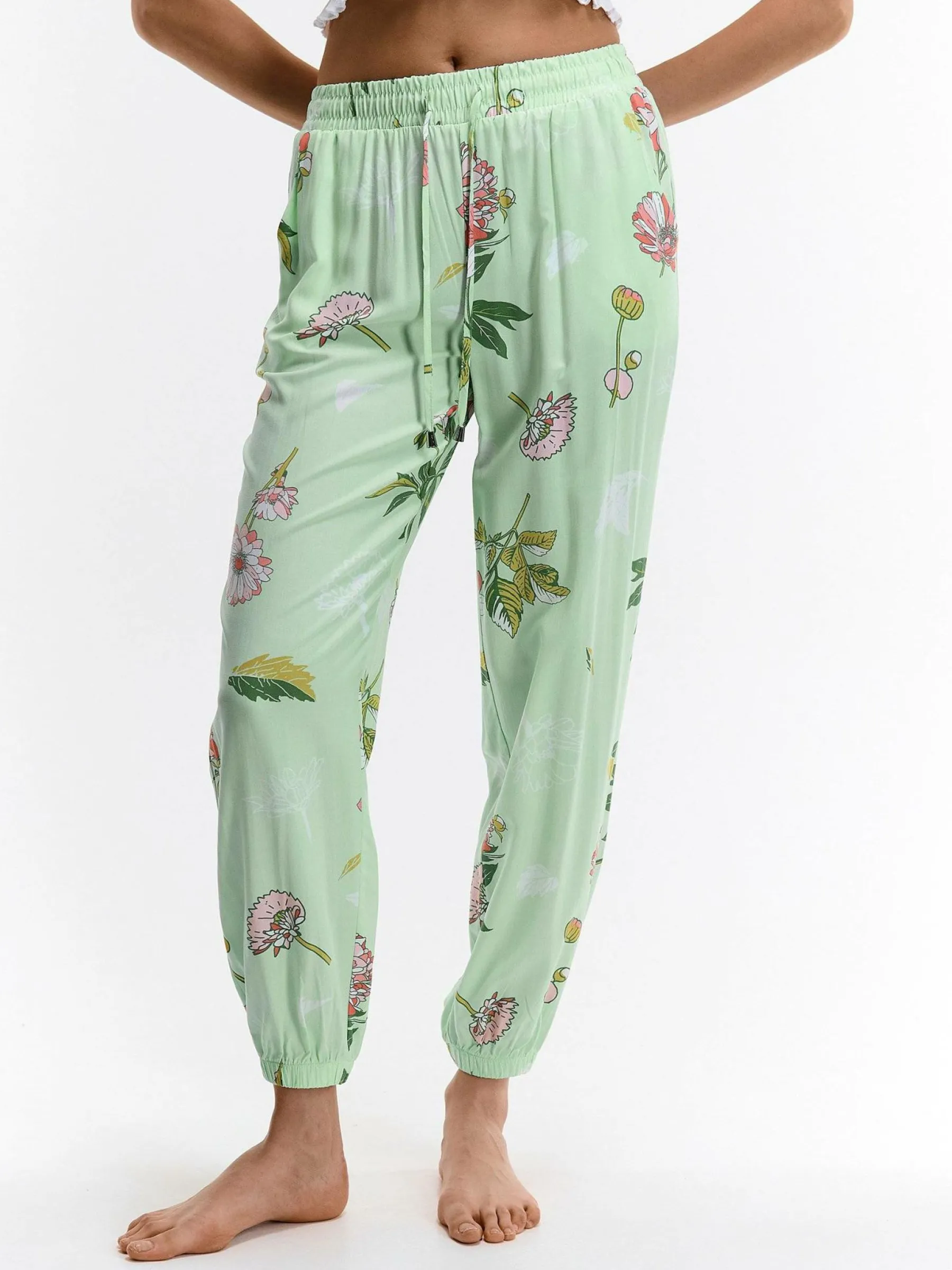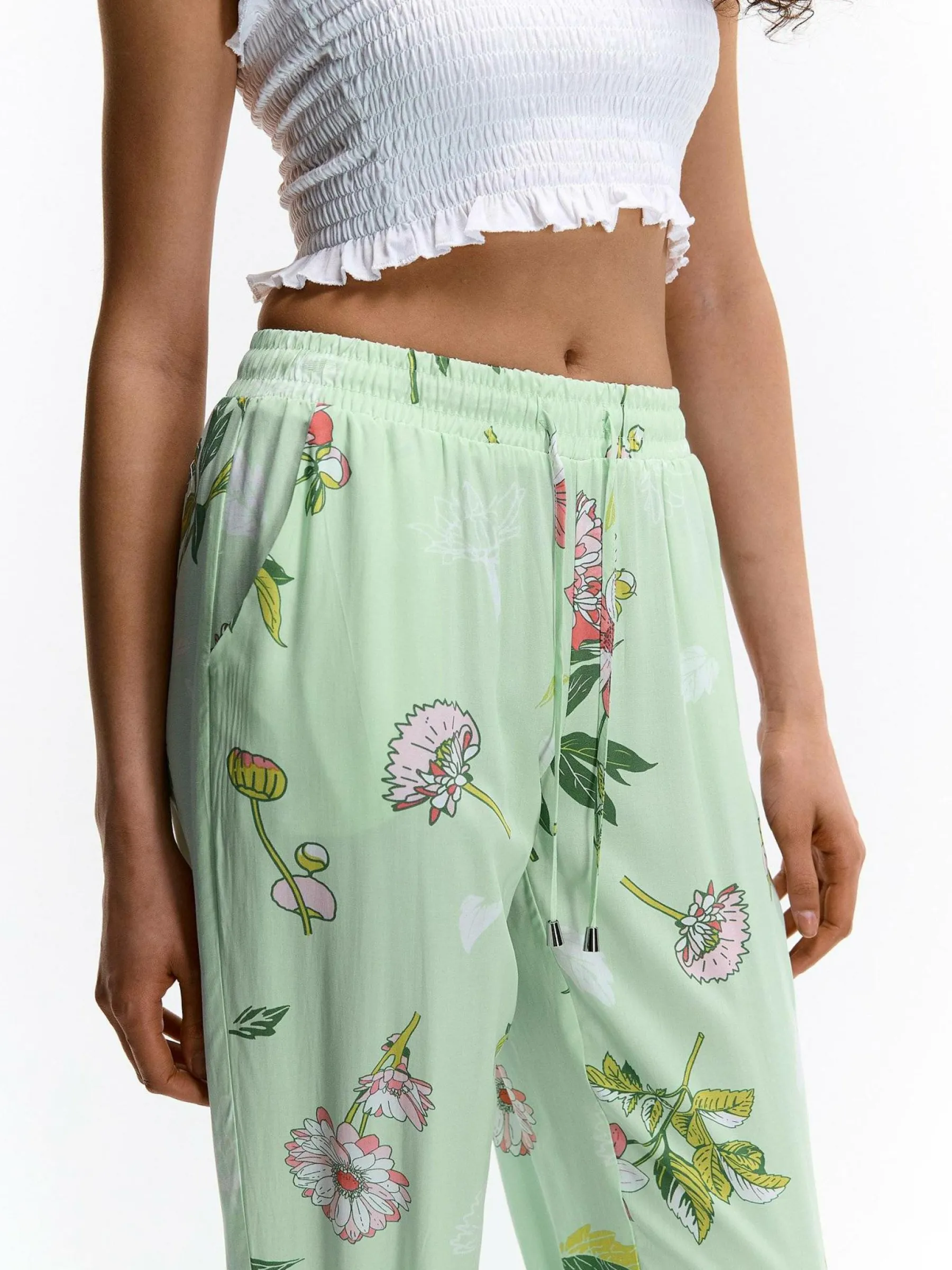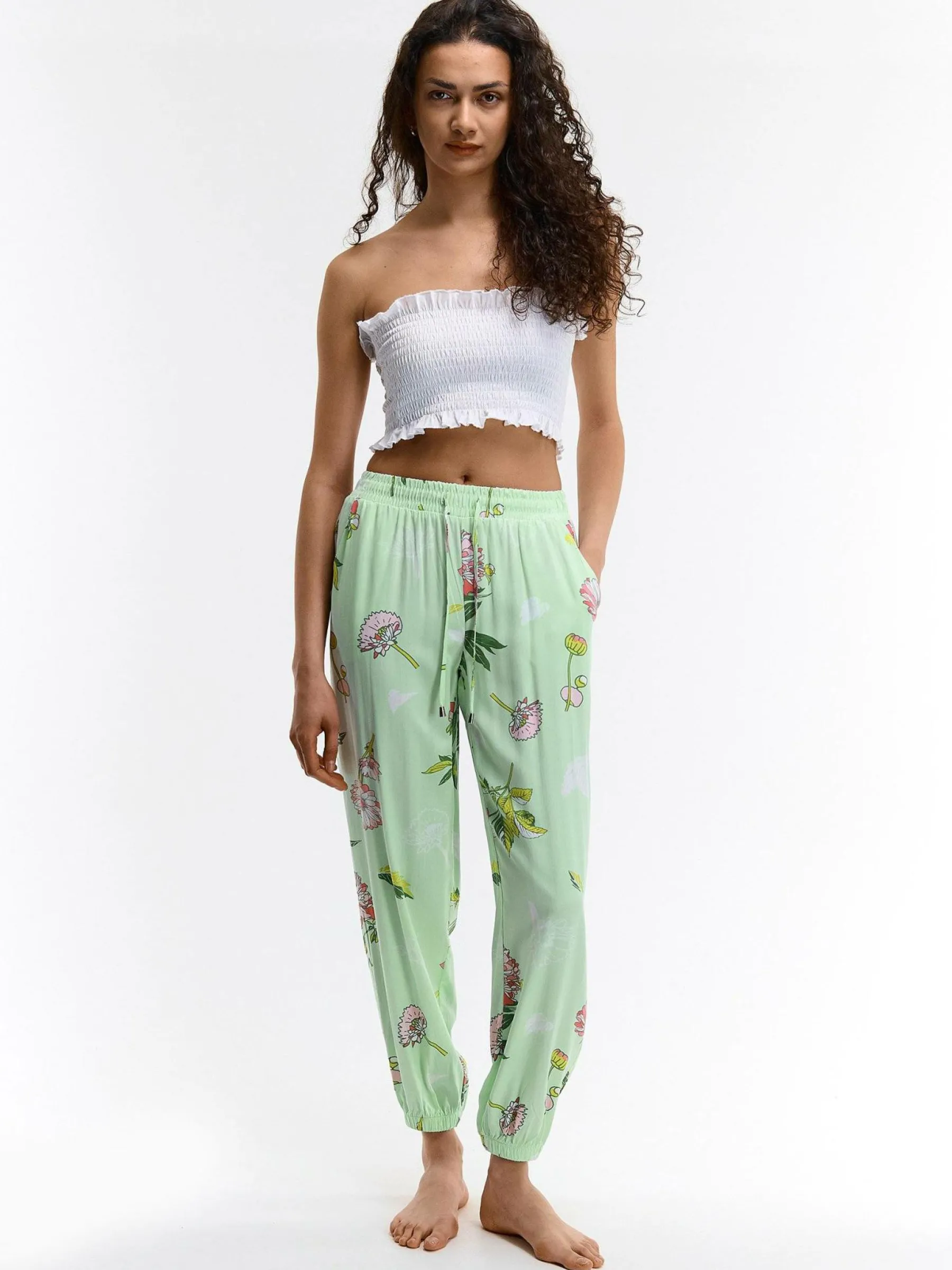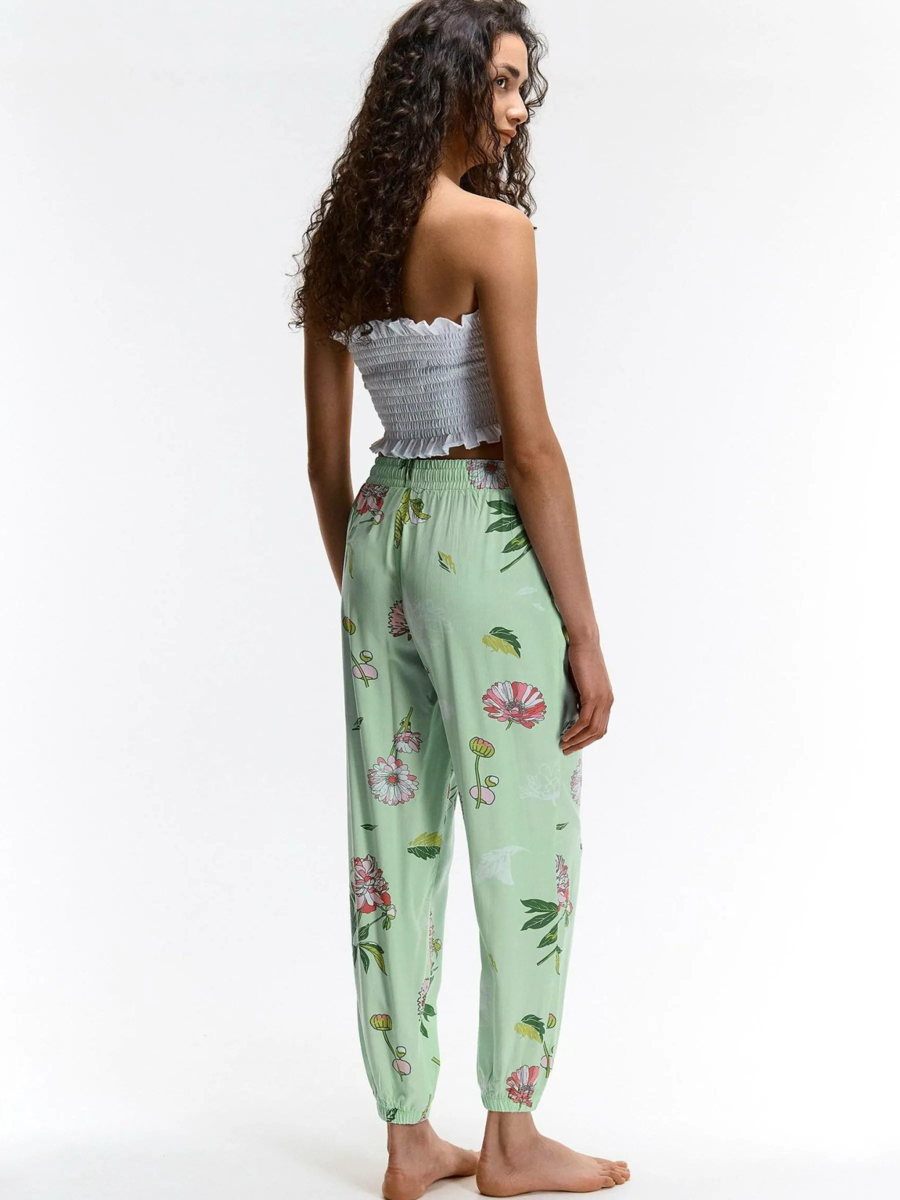 Kolor: zielonyKrój: haremTyp: spodnieDługość: dlugiePattern style: kwiatoweDetal: ze sznurowaniemMateriał: wiskozaP…