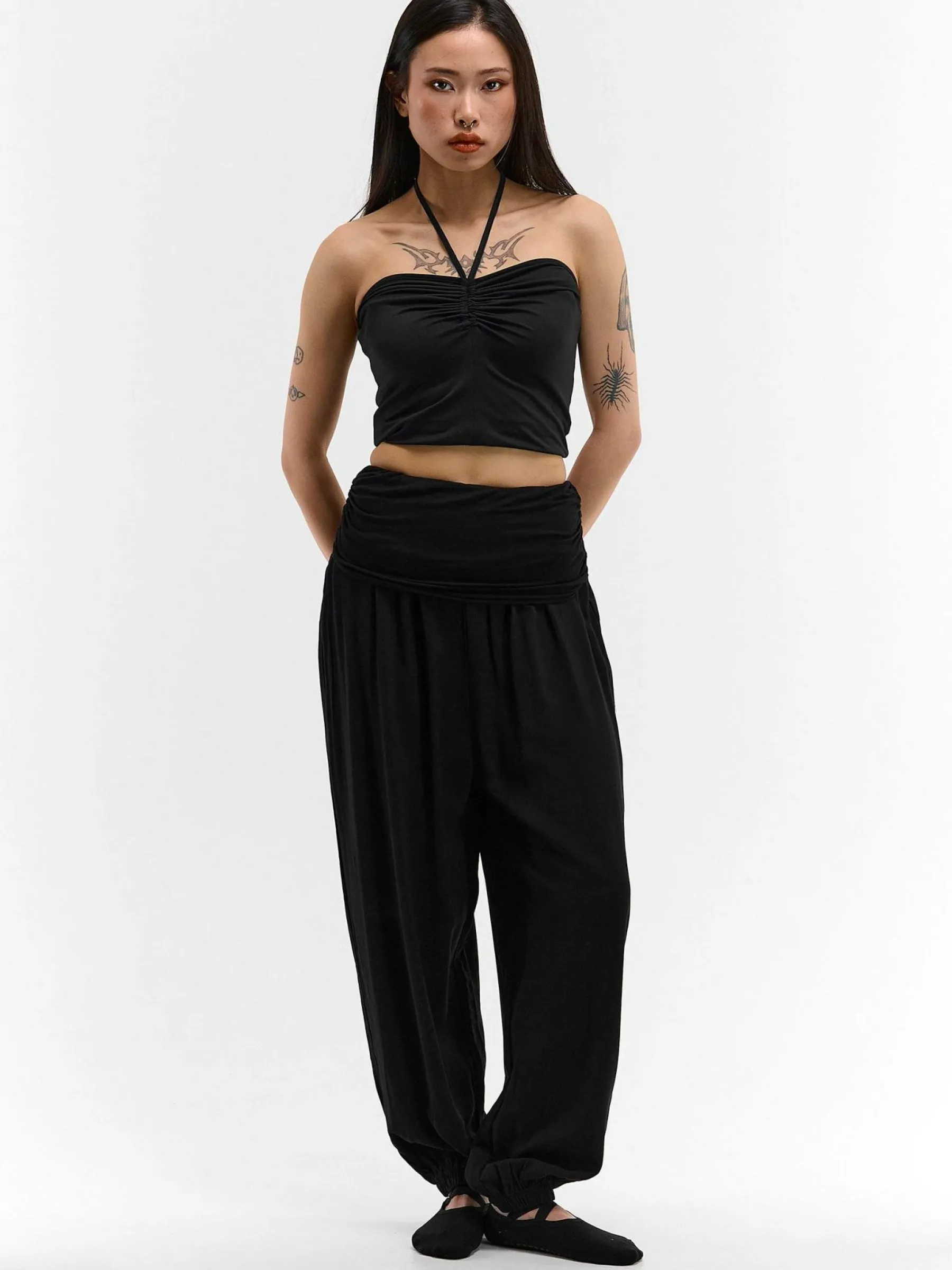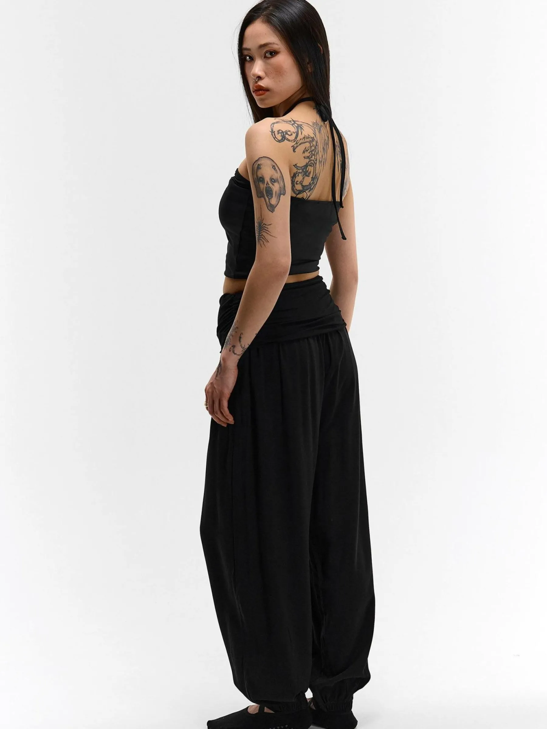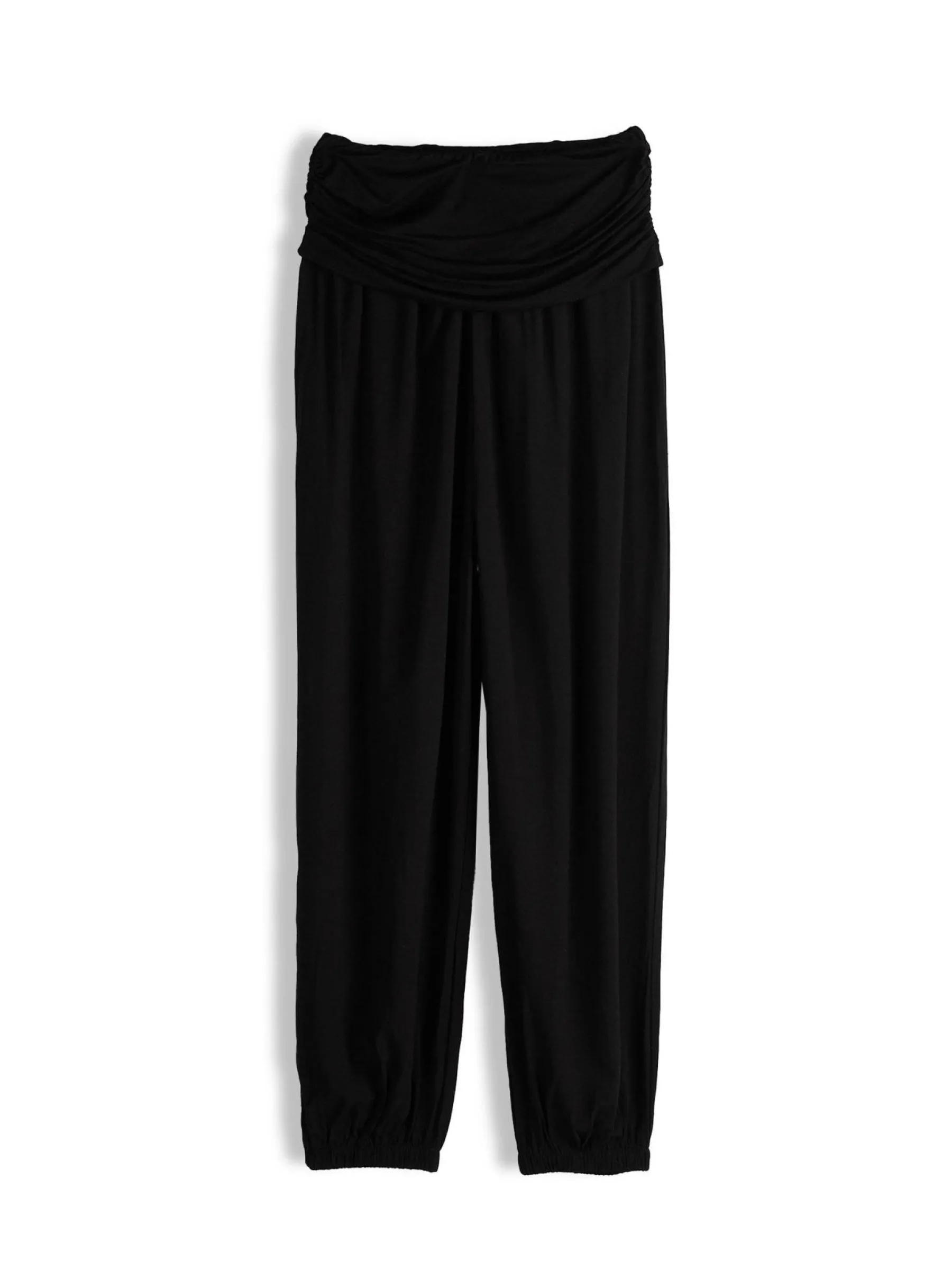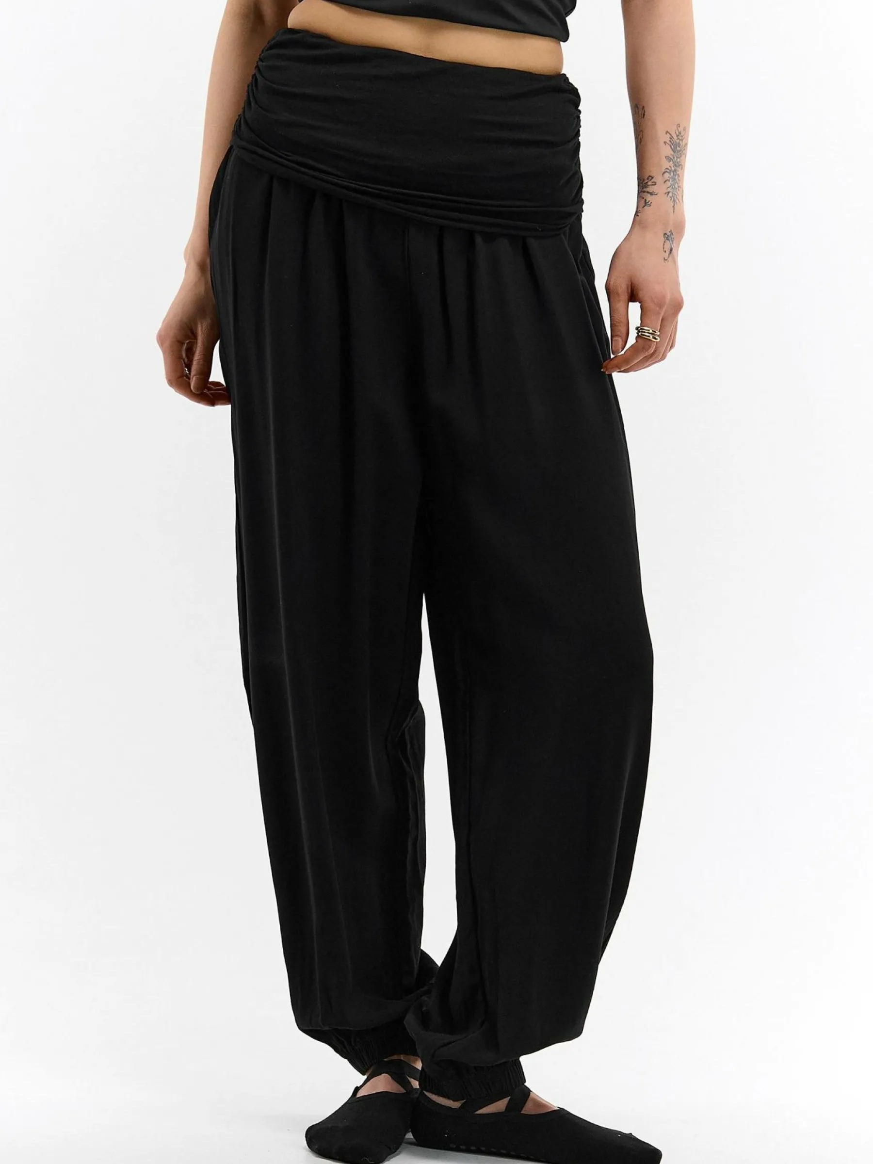 Kolor: czarnyKrój: haremTyp: spodnieDługość: dlugiePattern style: pojedynczy kolorDetal: z falbankami, z elastyczną…