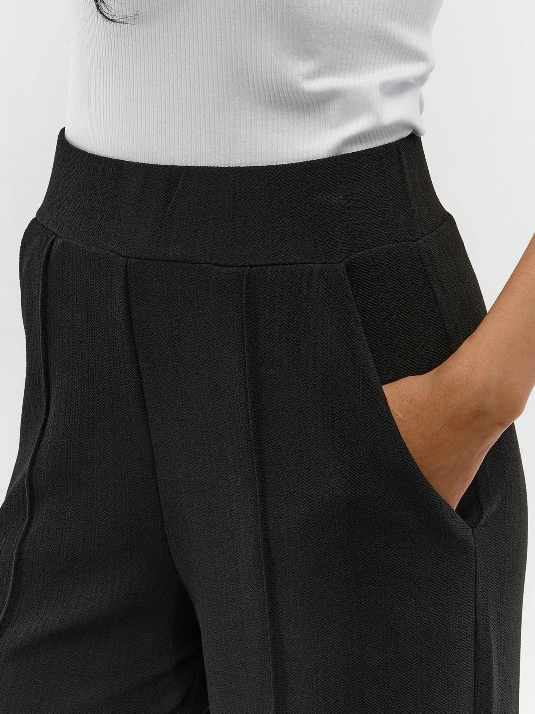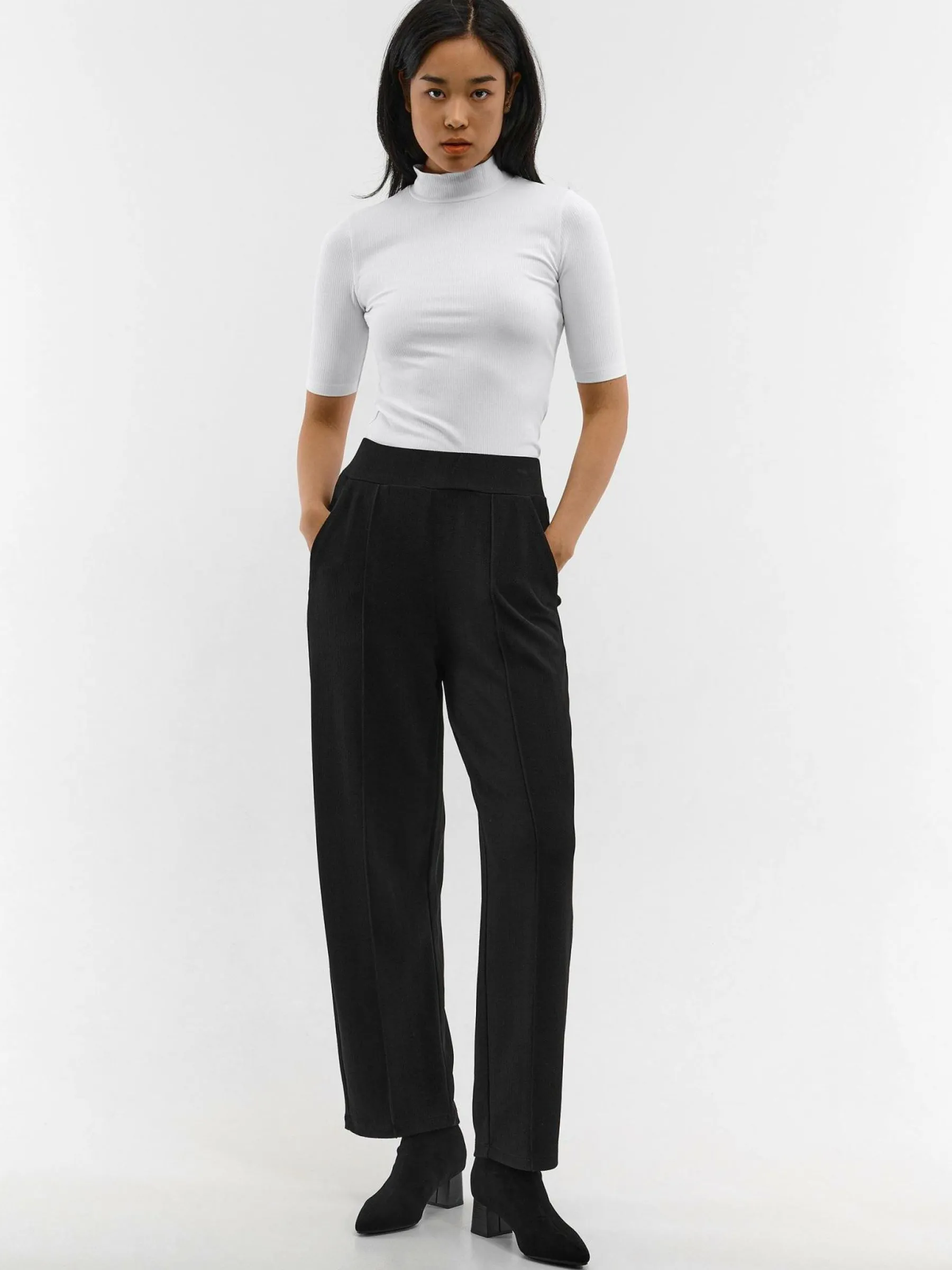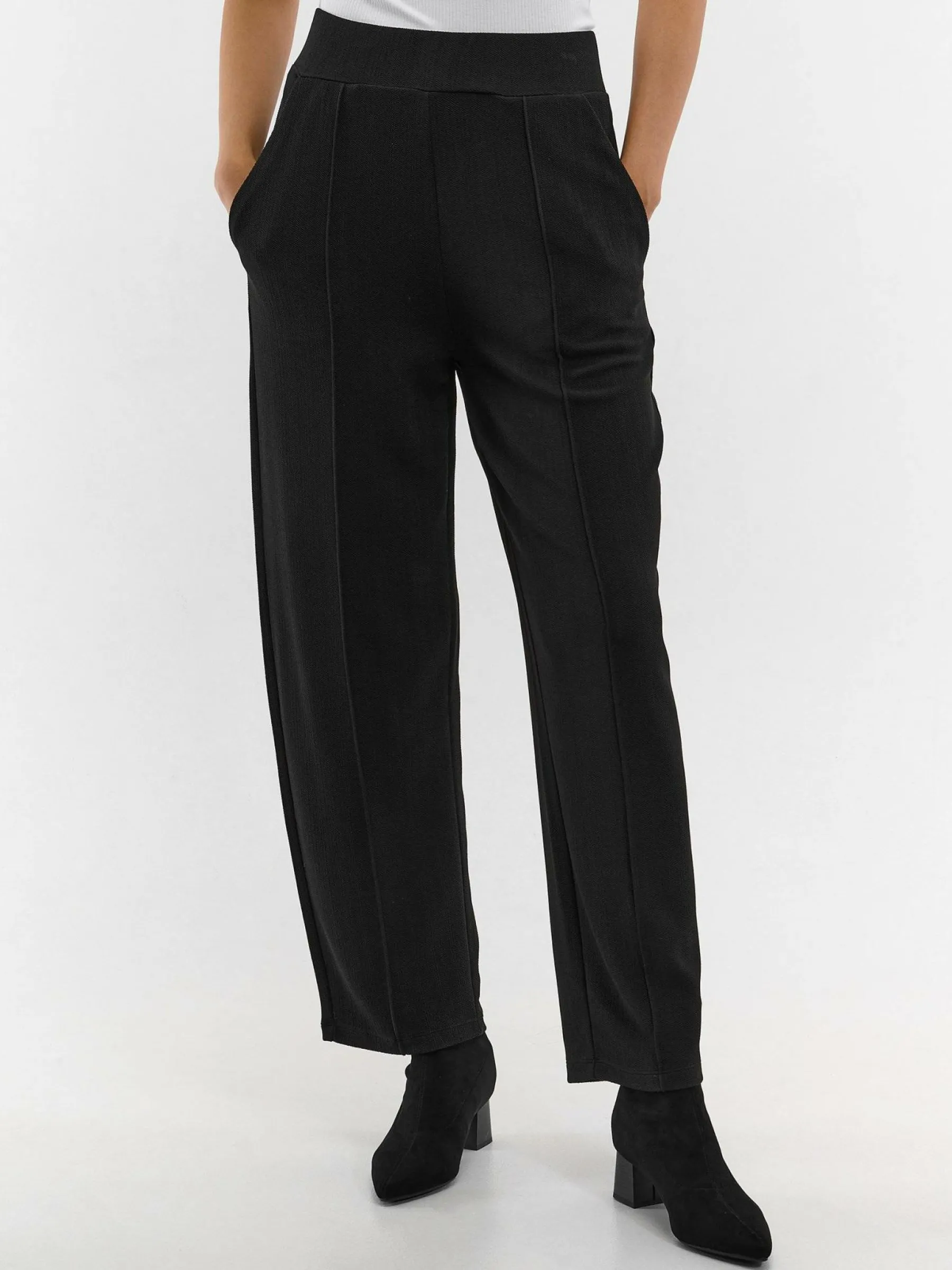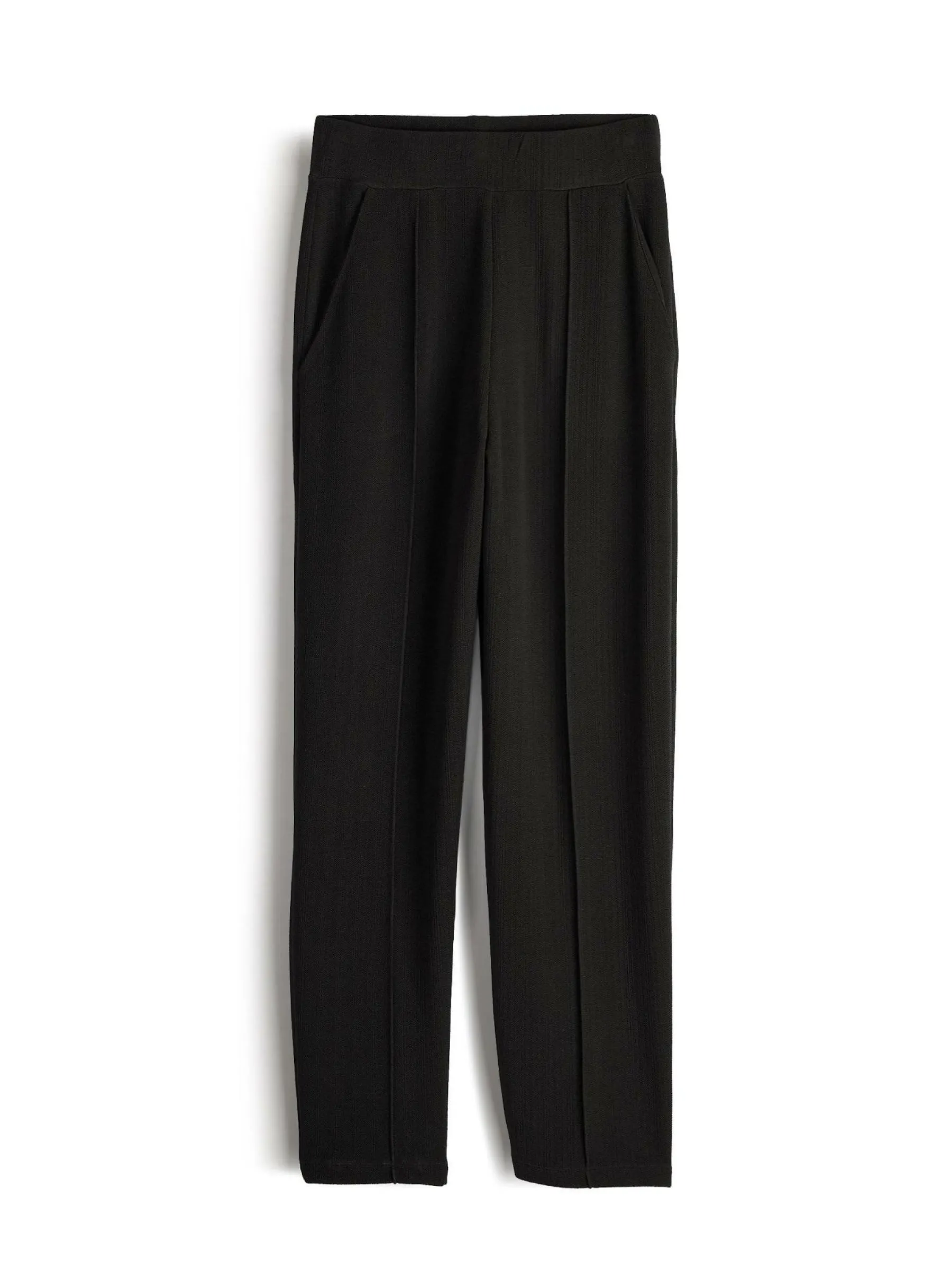 Kolor: czarnyKrój: straightTyp: spodnieDługość: dlugiePattern style: pojedynczy kolorDetal: z kieszeniami, z elastyc…
