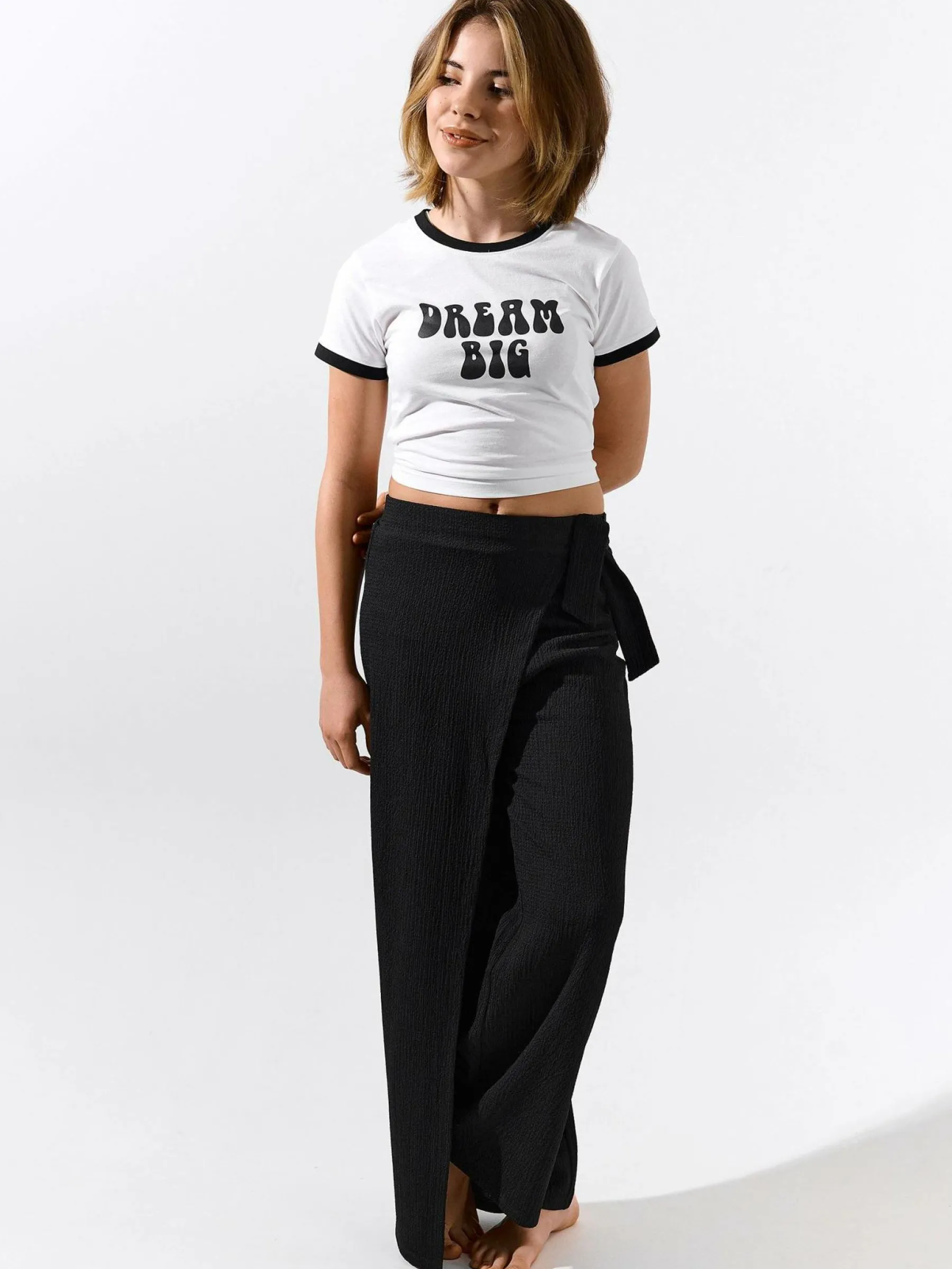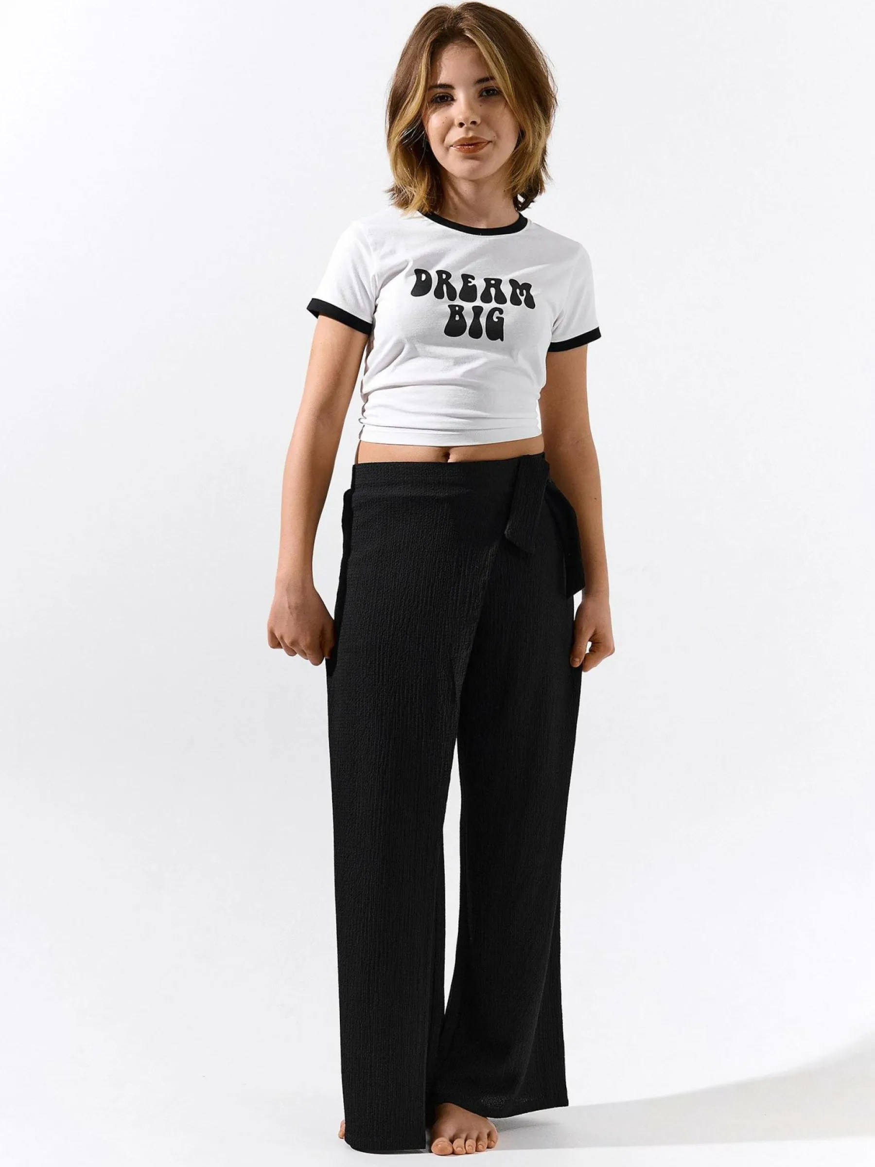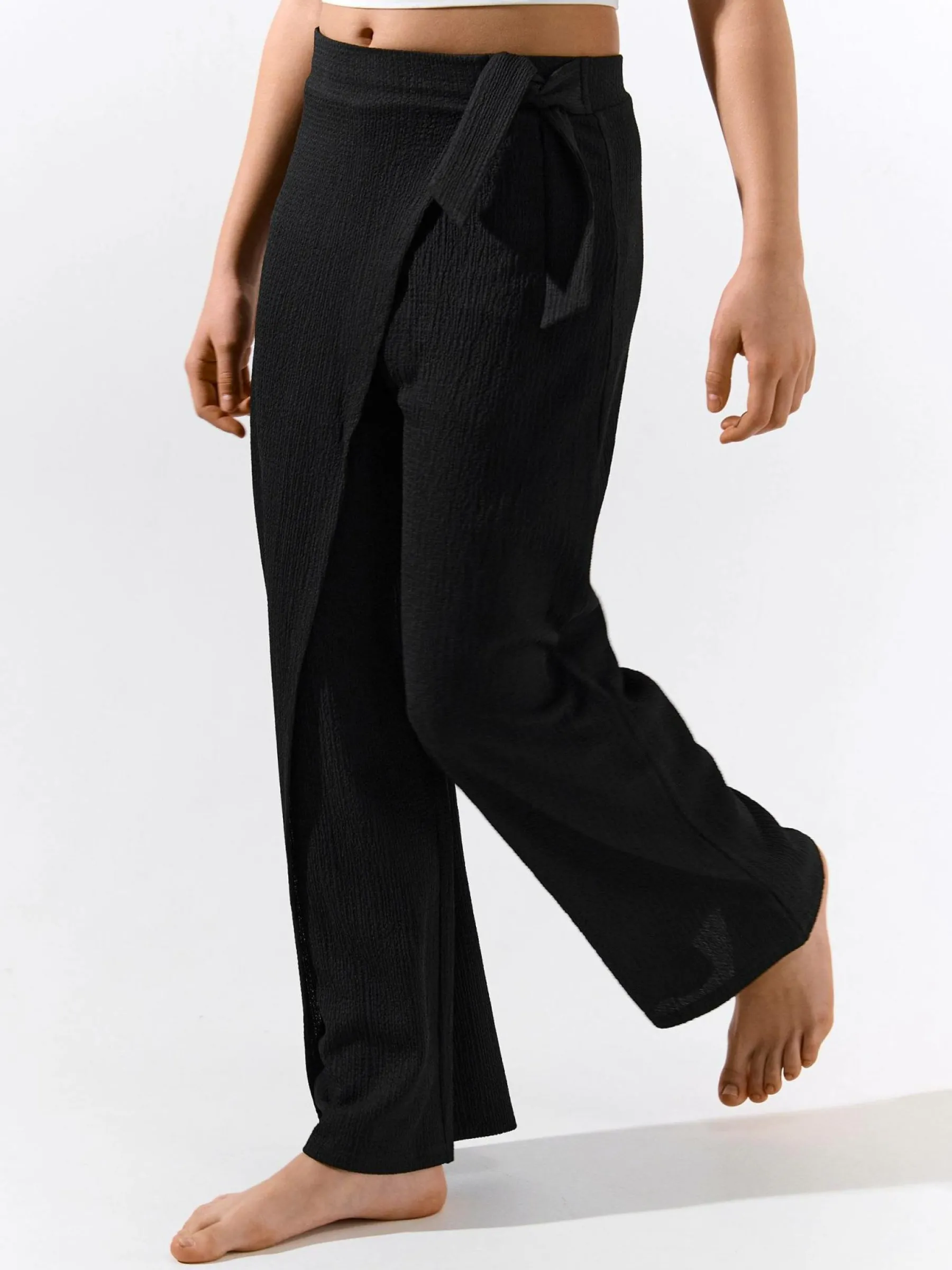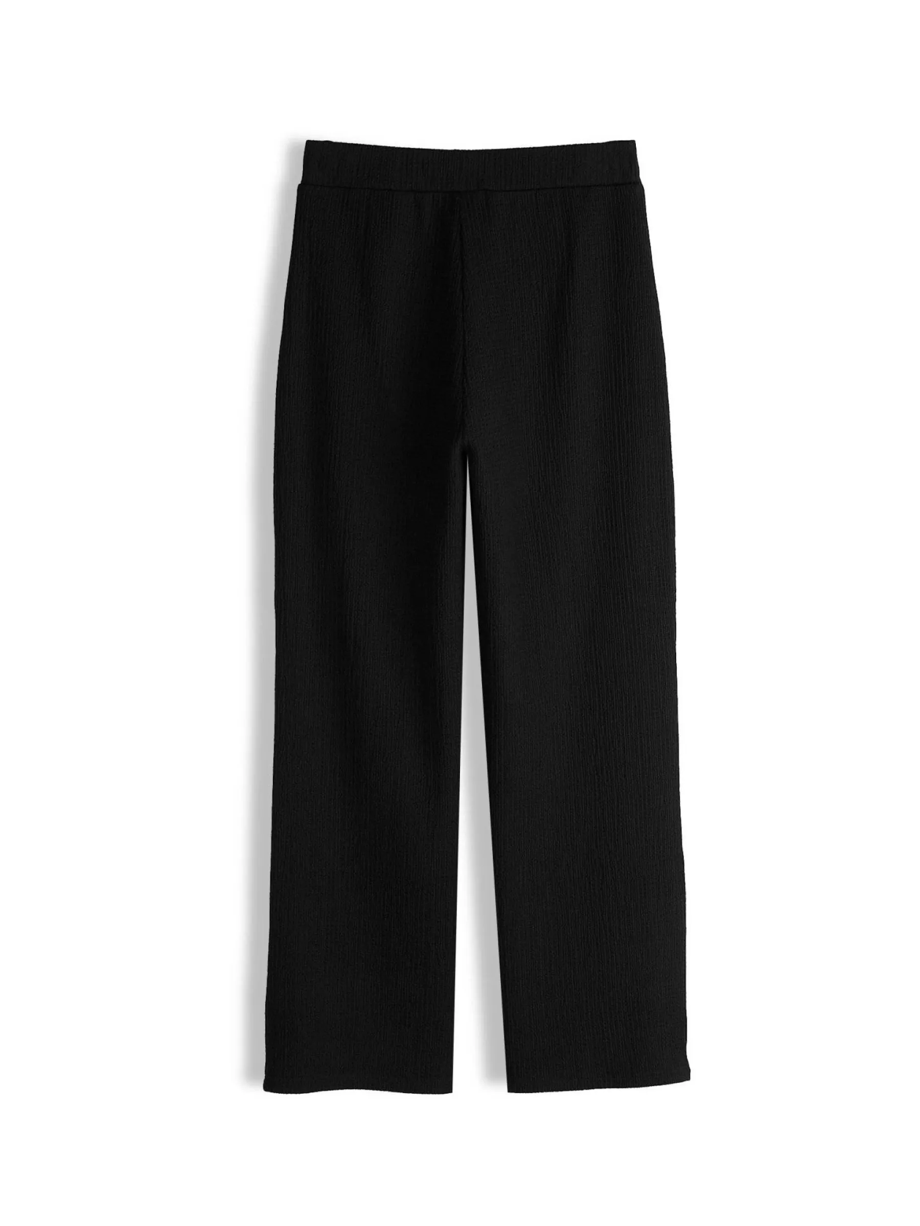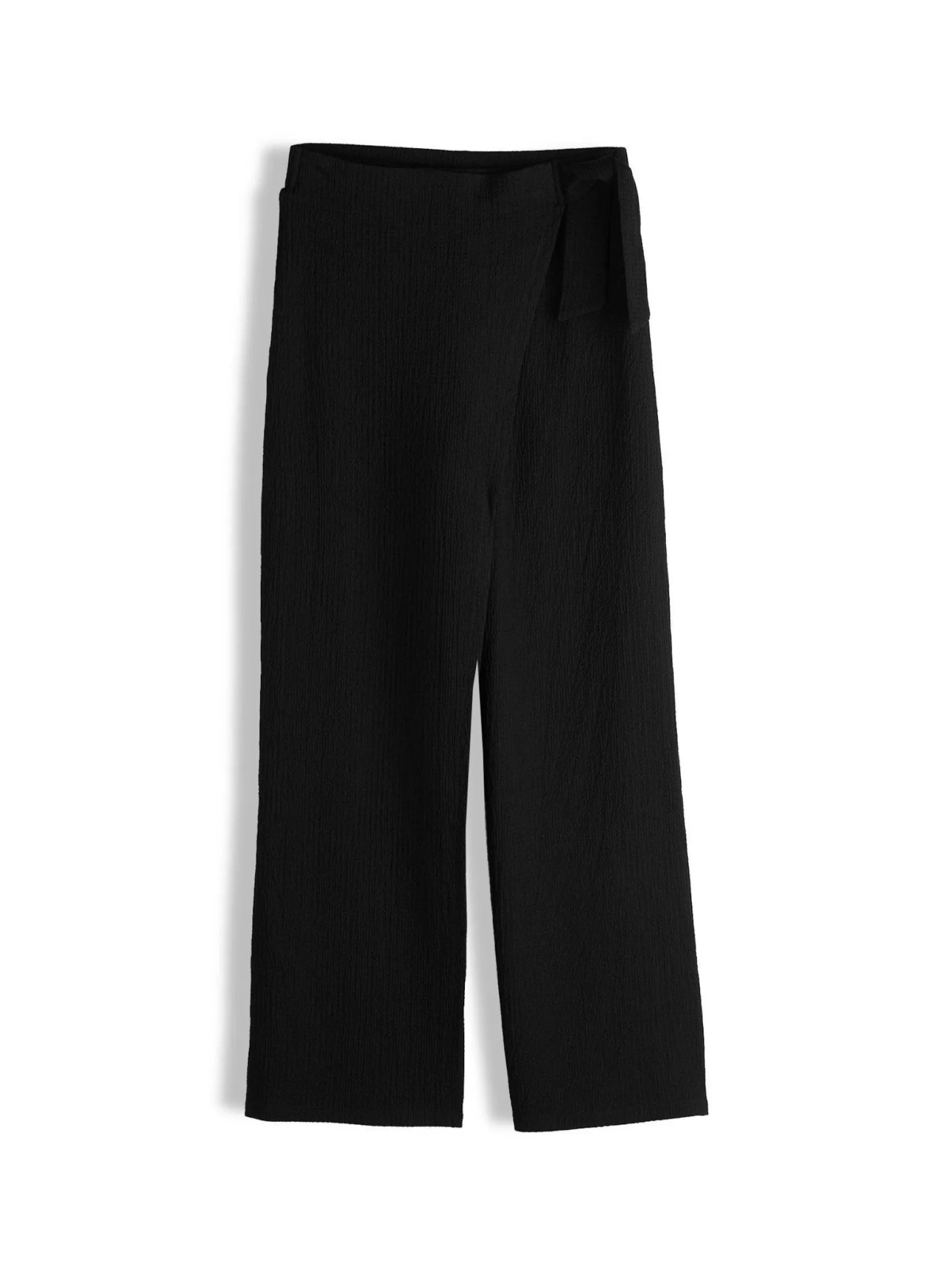 Kolor: czarnyKrój: szerokieTyp: spodnieDługość: dlugiePattern style: pojedynczy kolorDetal: z wiązaniemMateriał: s…