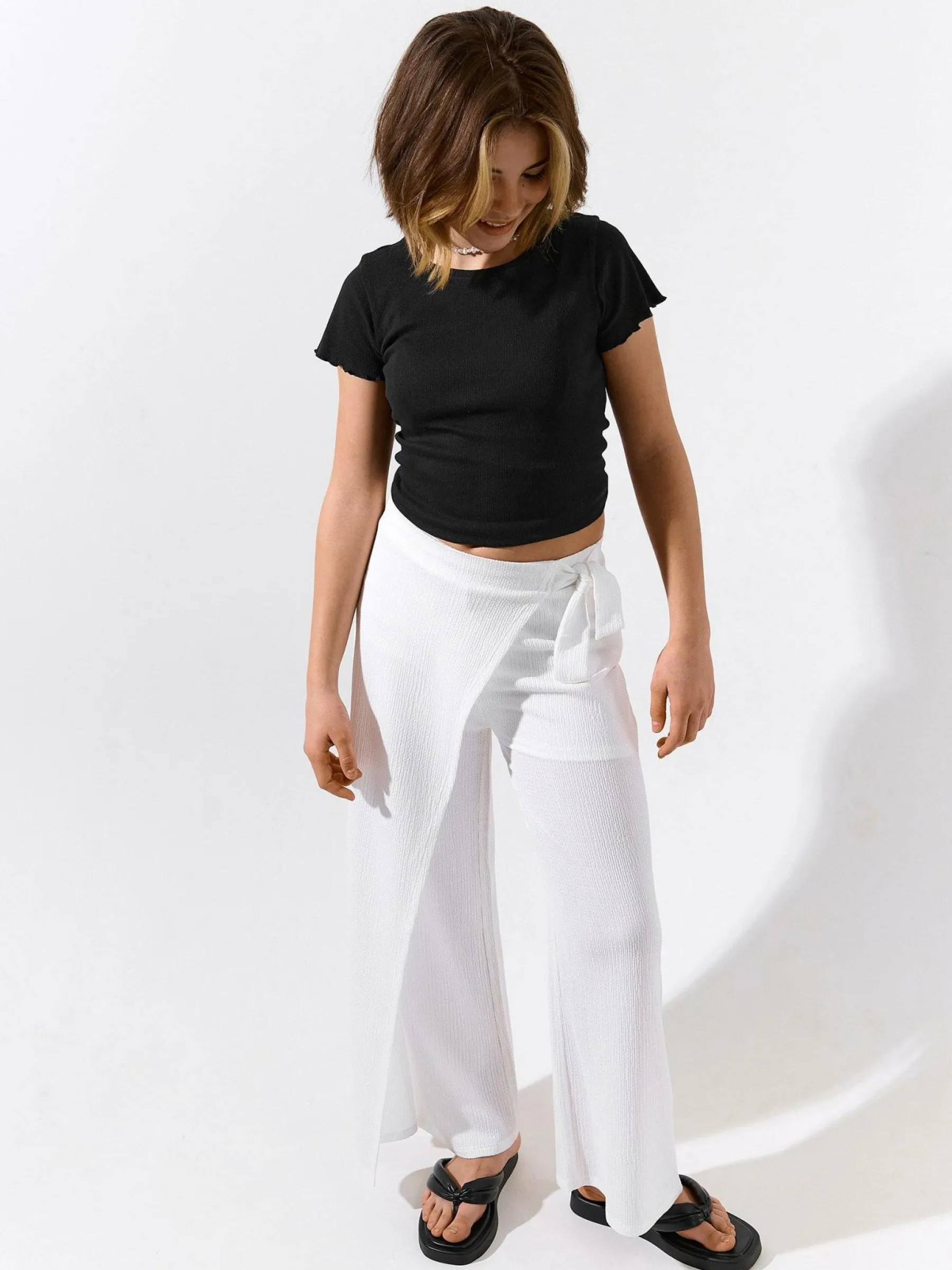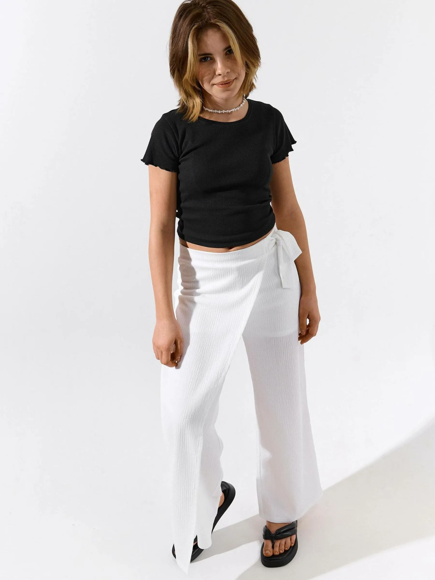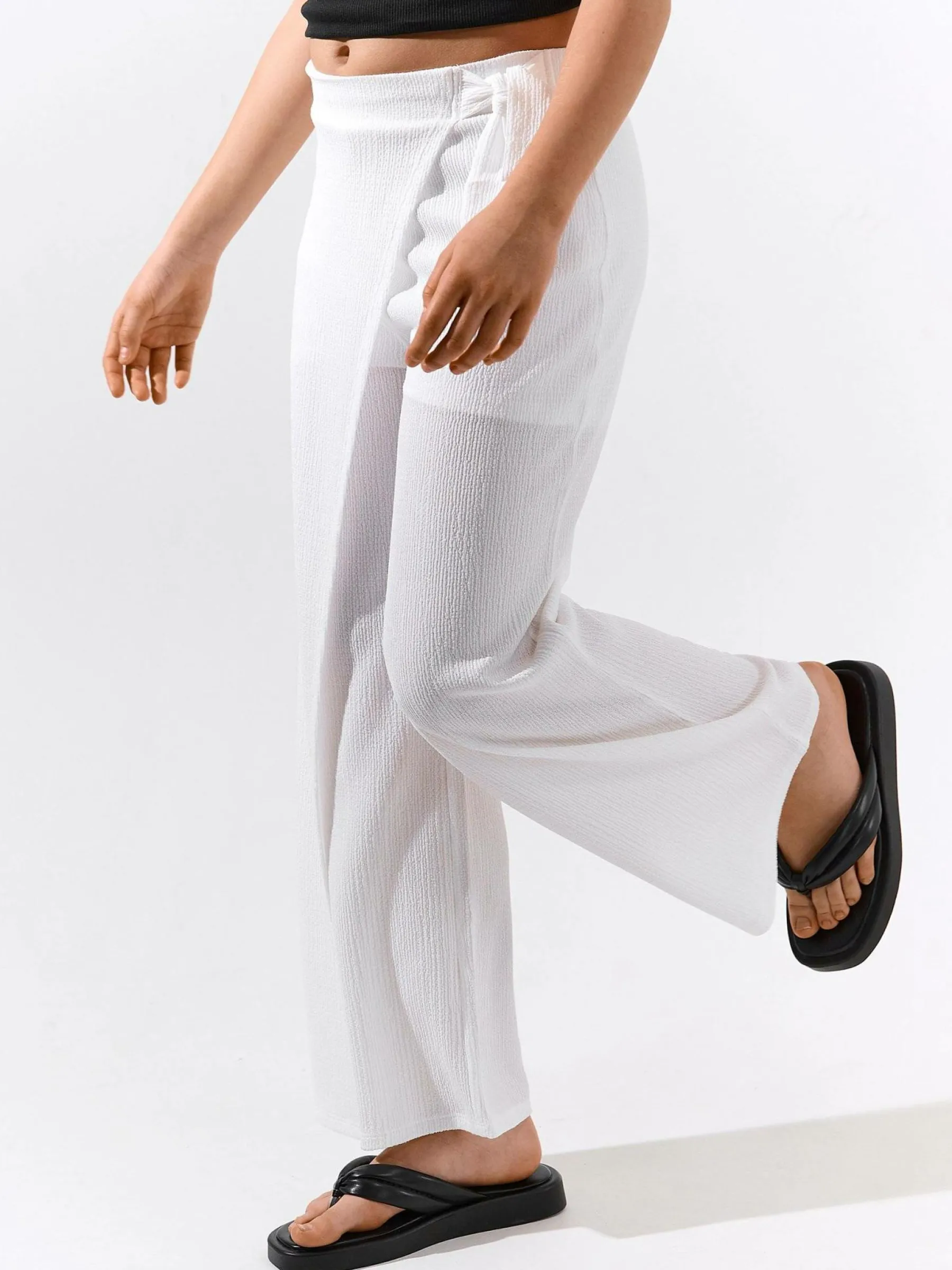 Kolor: białyKrój: szerokieTyp: spodnieDługość: dlugiePattern style: pojedynczy kolorDetal: z wiązaniemMateriał: s…