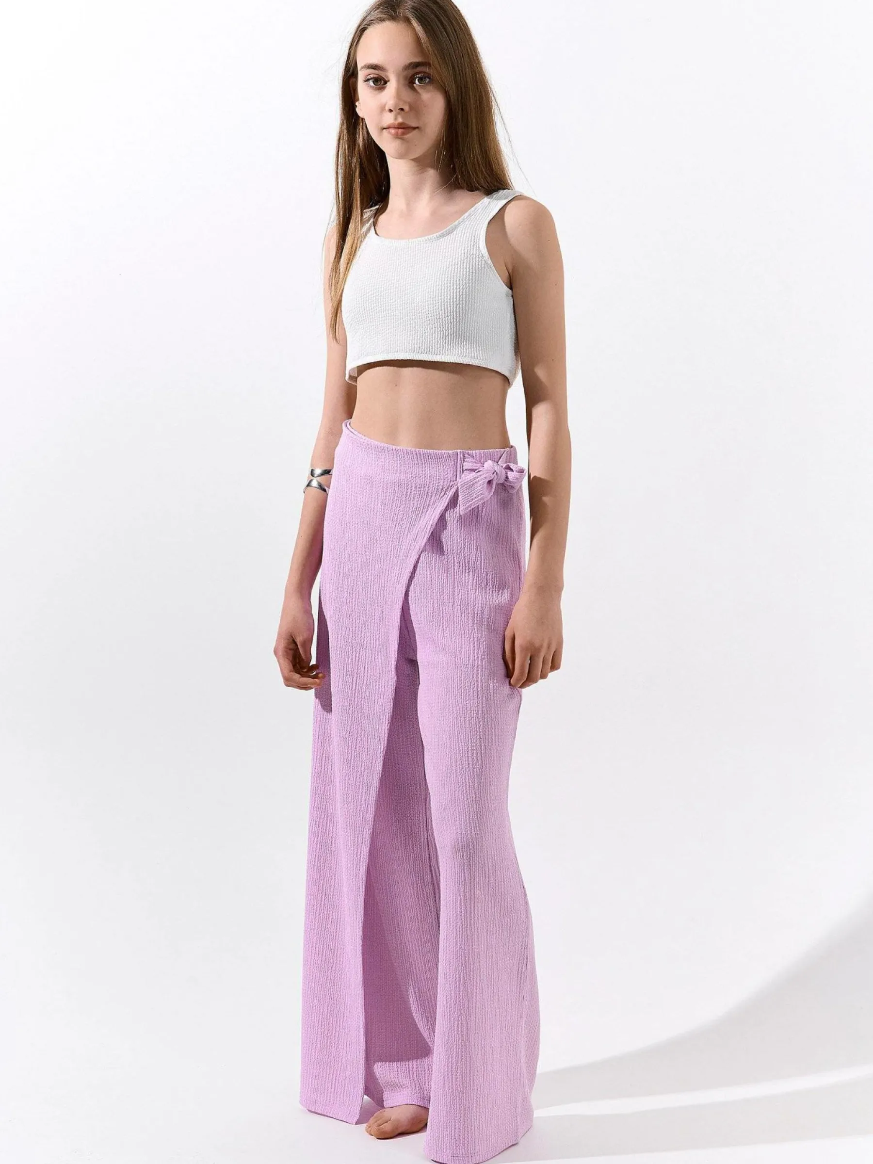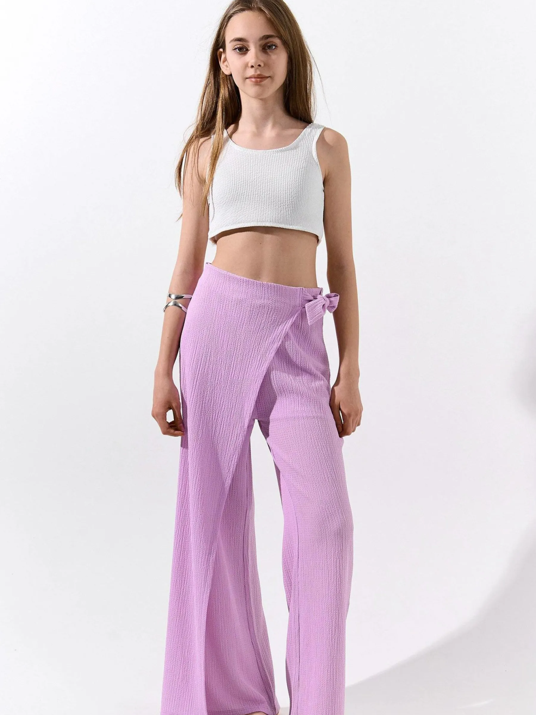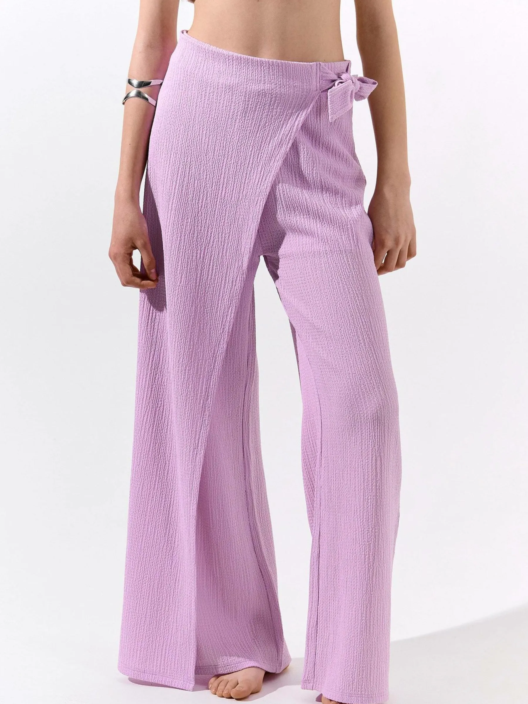 Kolor: różowy, purpurowyKrój: szerokieTyp: spodnieDługość: dlugiePattern style: pojedynczy kolorDetal: z wiązanie…
