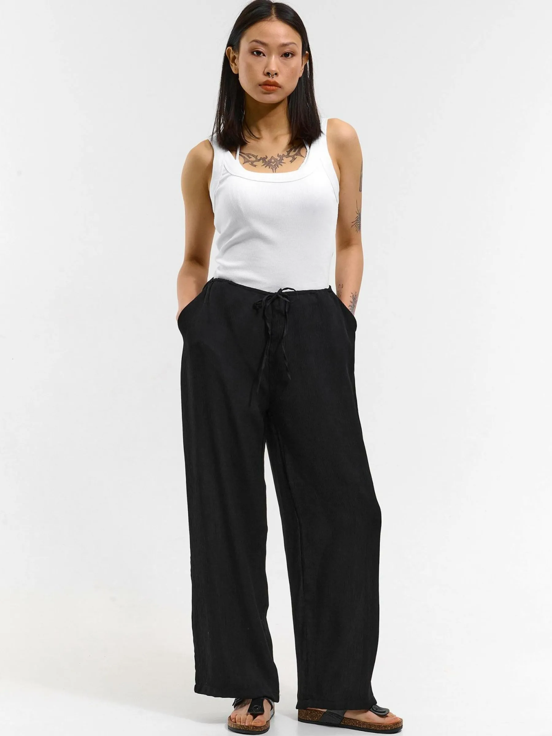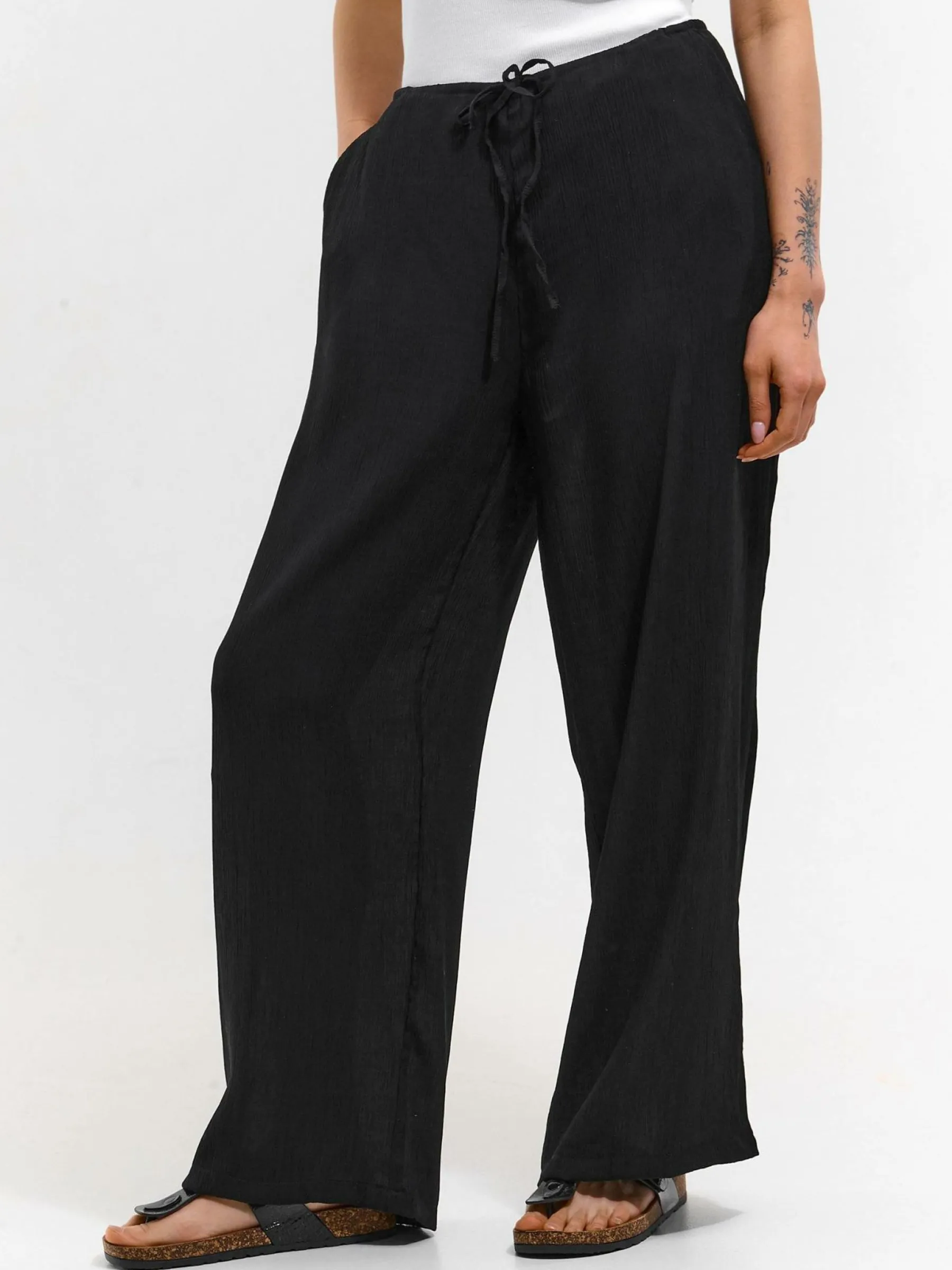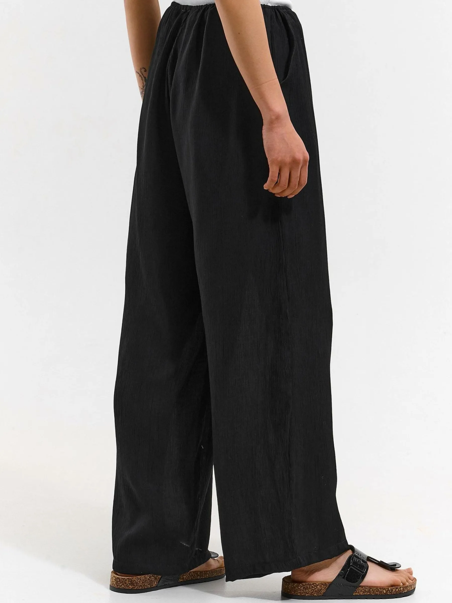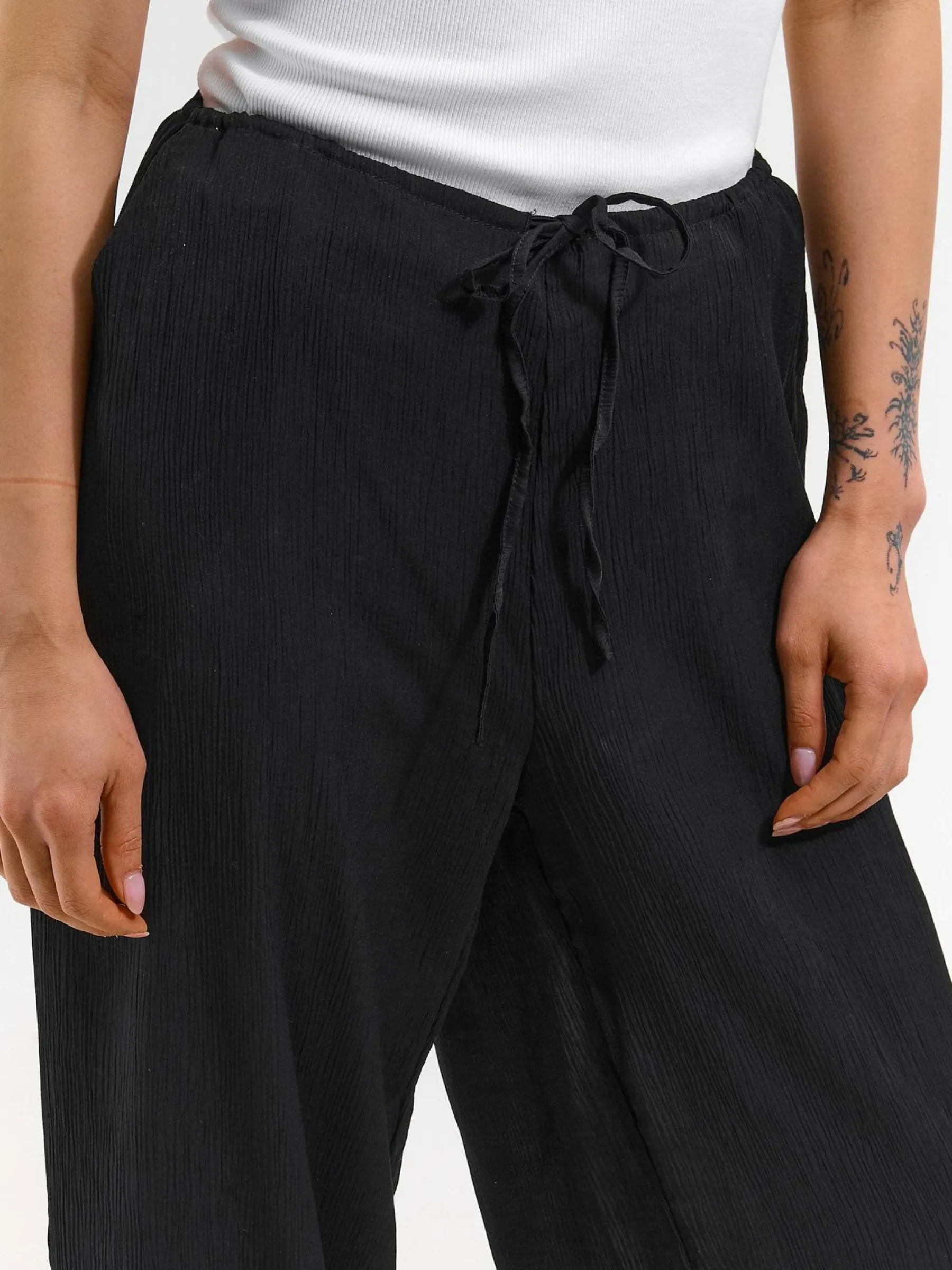 Kolor: czarnyKrój: szerokieTyp: spodnieDługość: dlugiePattern style: pojedynczy kolor, żebrowanyDetal: z kieszeniam…