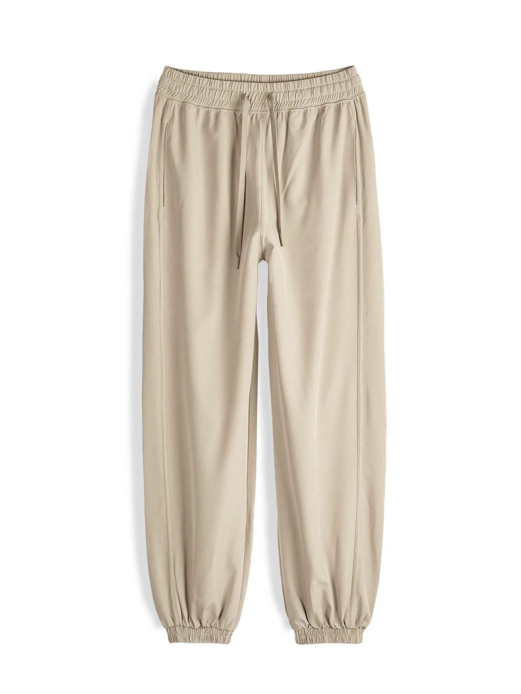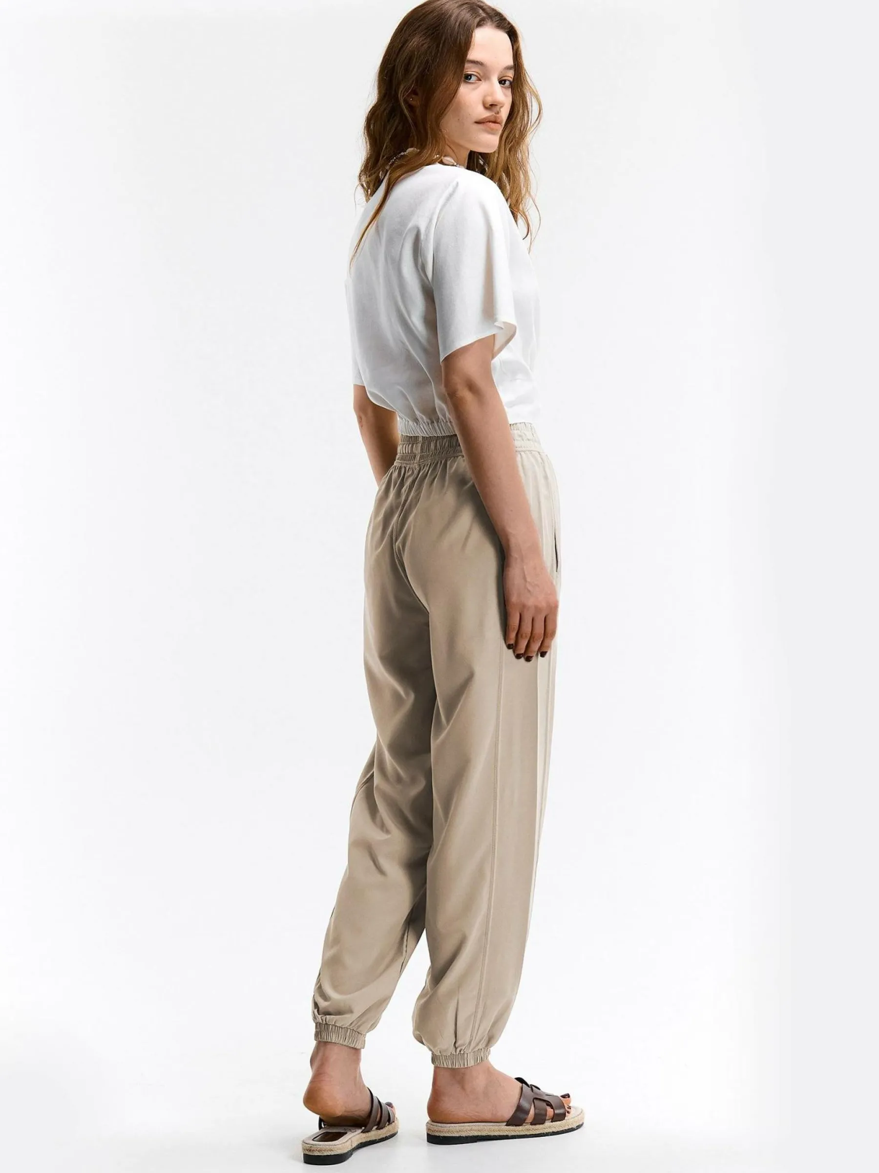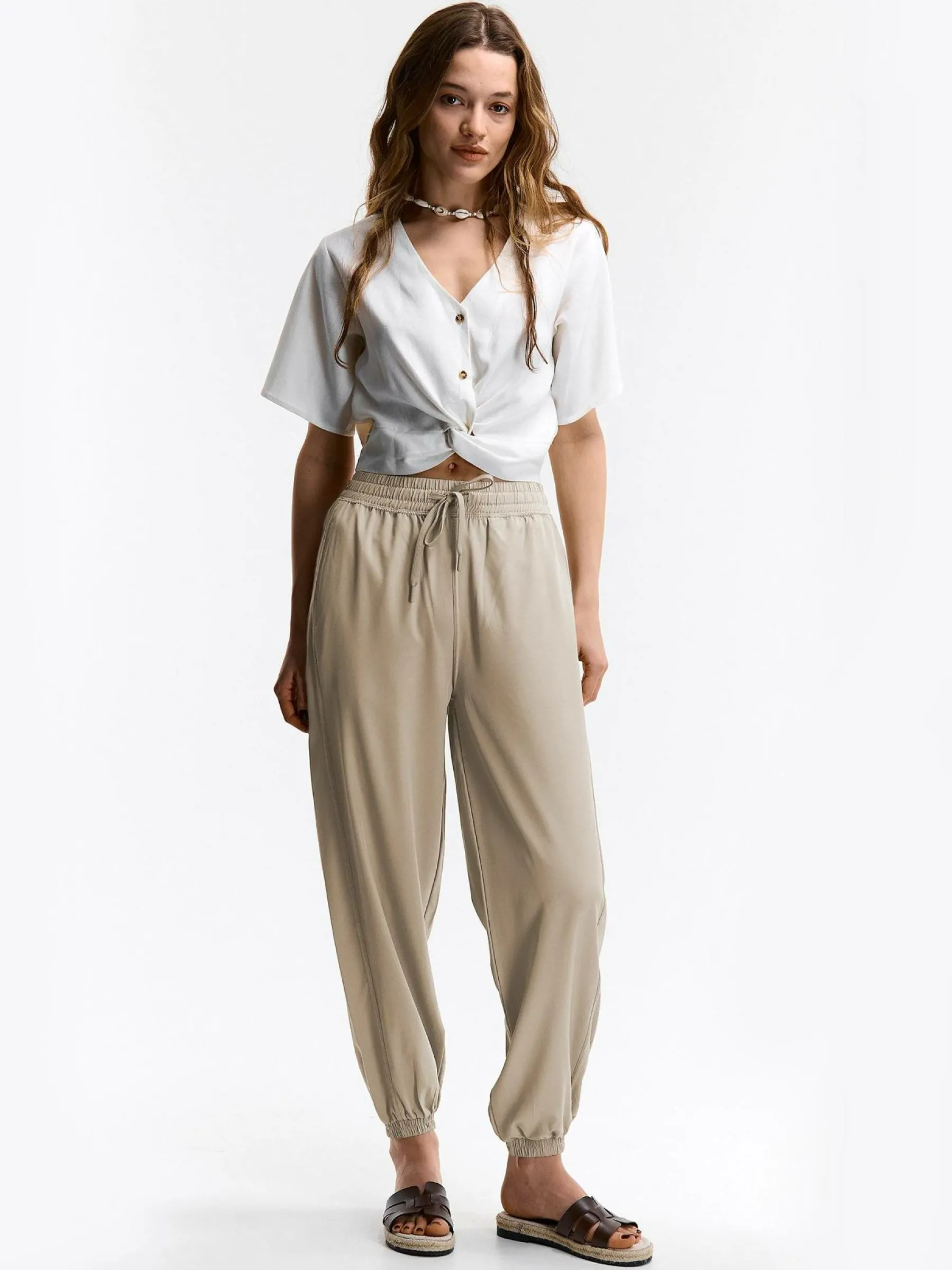 Kolor: beżowyKrój: joggerTyp: spodnieDługość: dlugiePattern style: pojedynczy kolorDetal: ze sznurowaniem, z elasty…