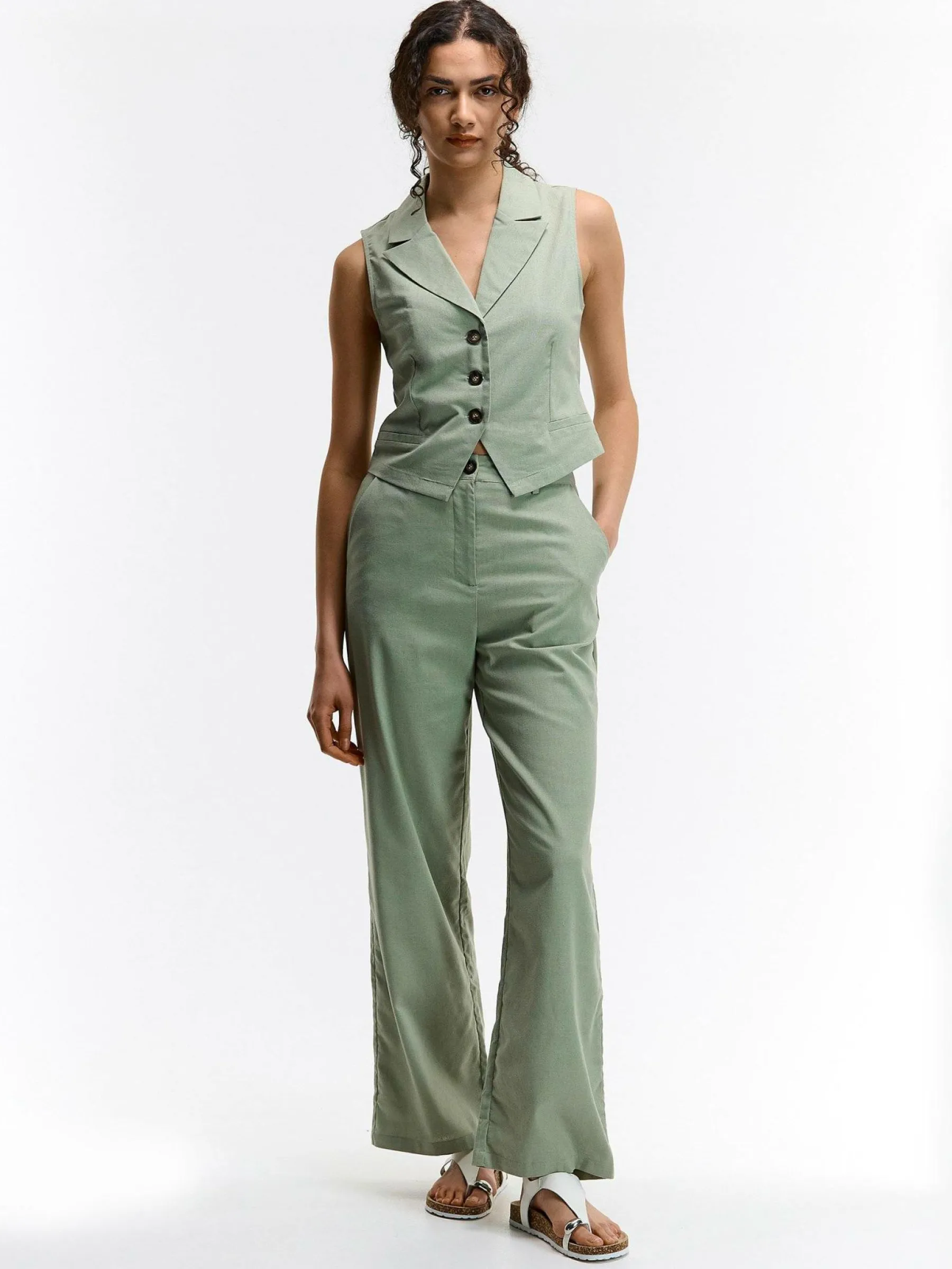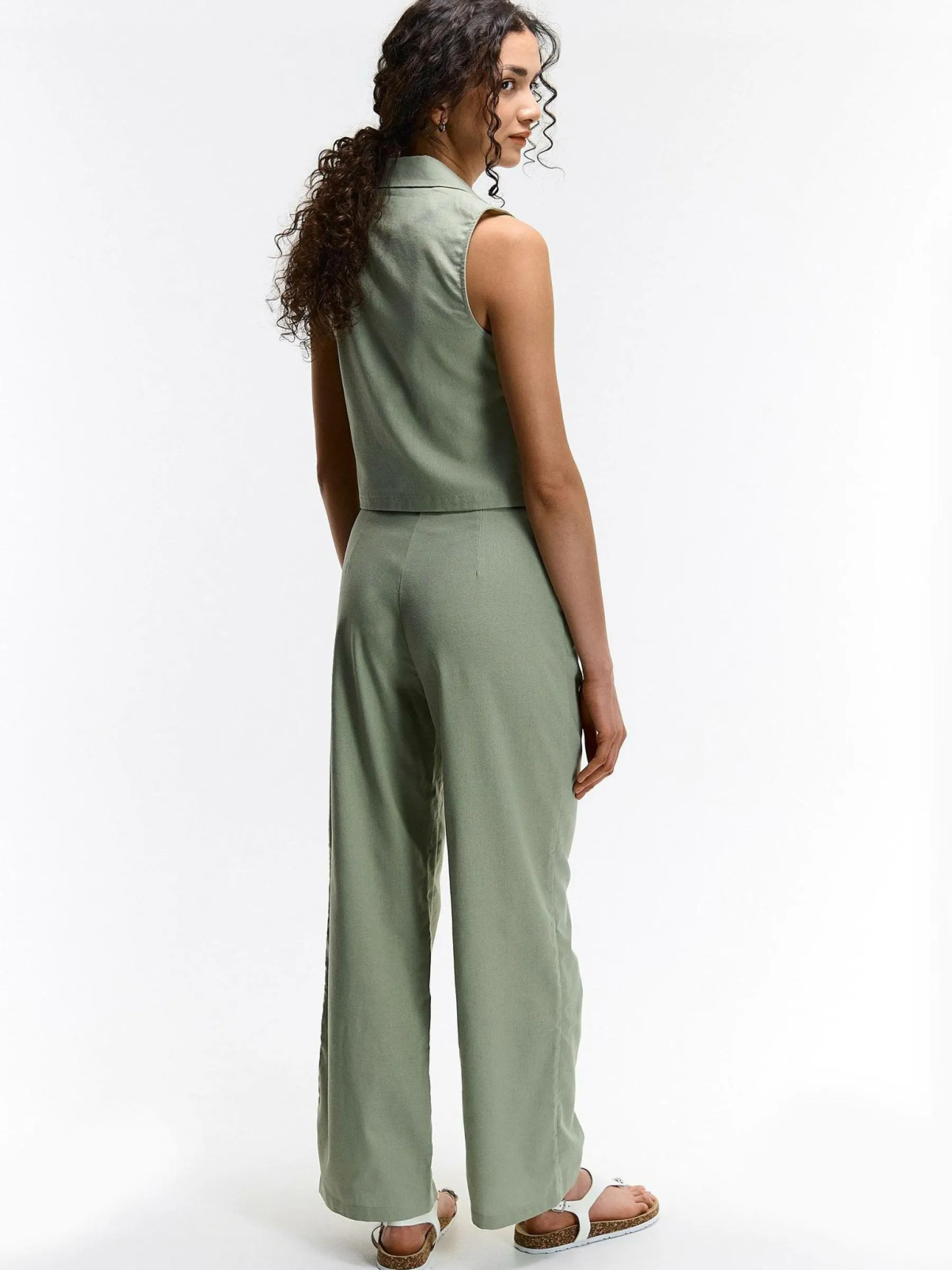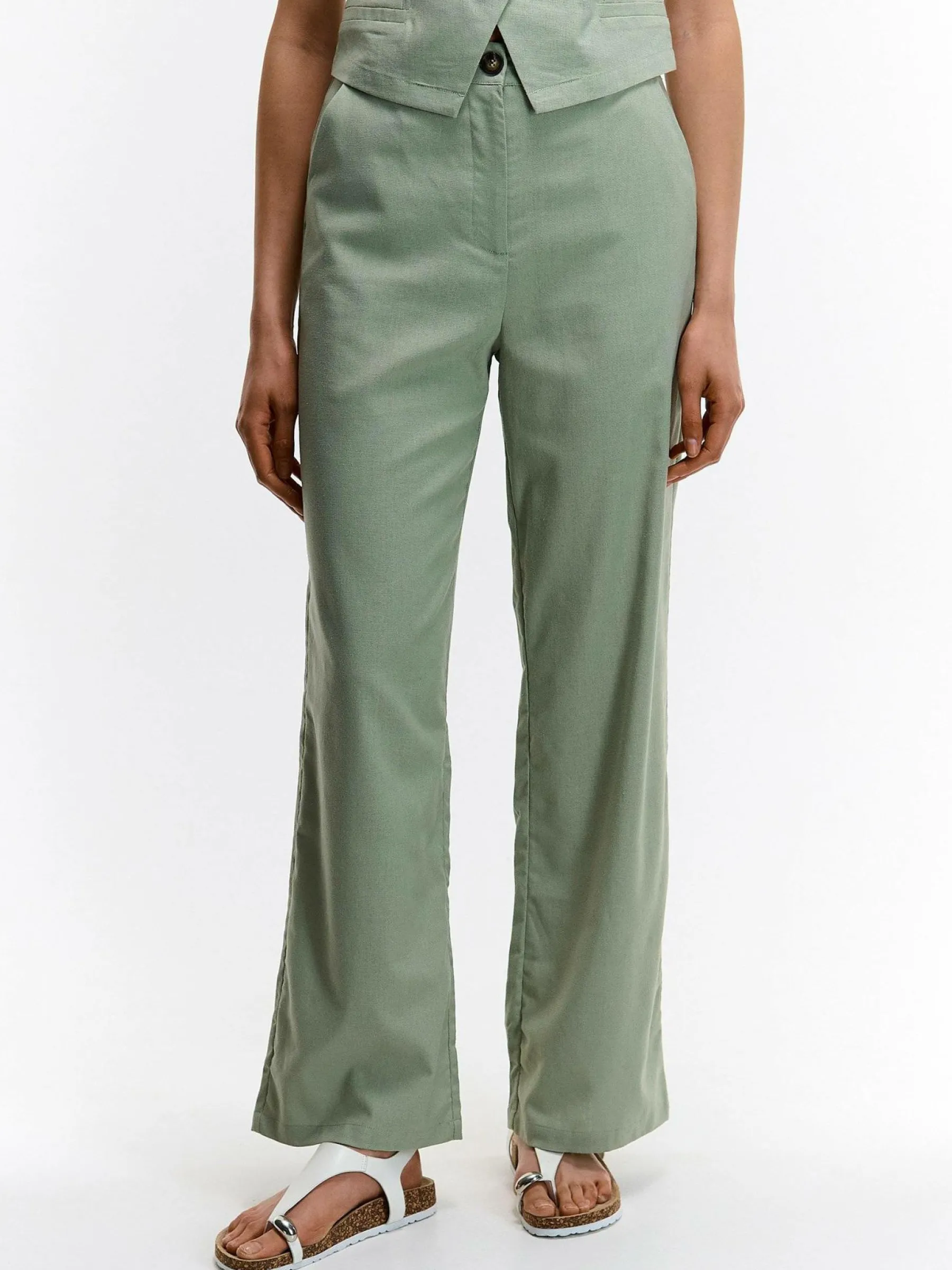 Kolor: khakiKrój: straightTyp: spodnieDługość: dlugiePattern style: pojedynczy kolorDetal: na zamekMateriał: lenPł…
