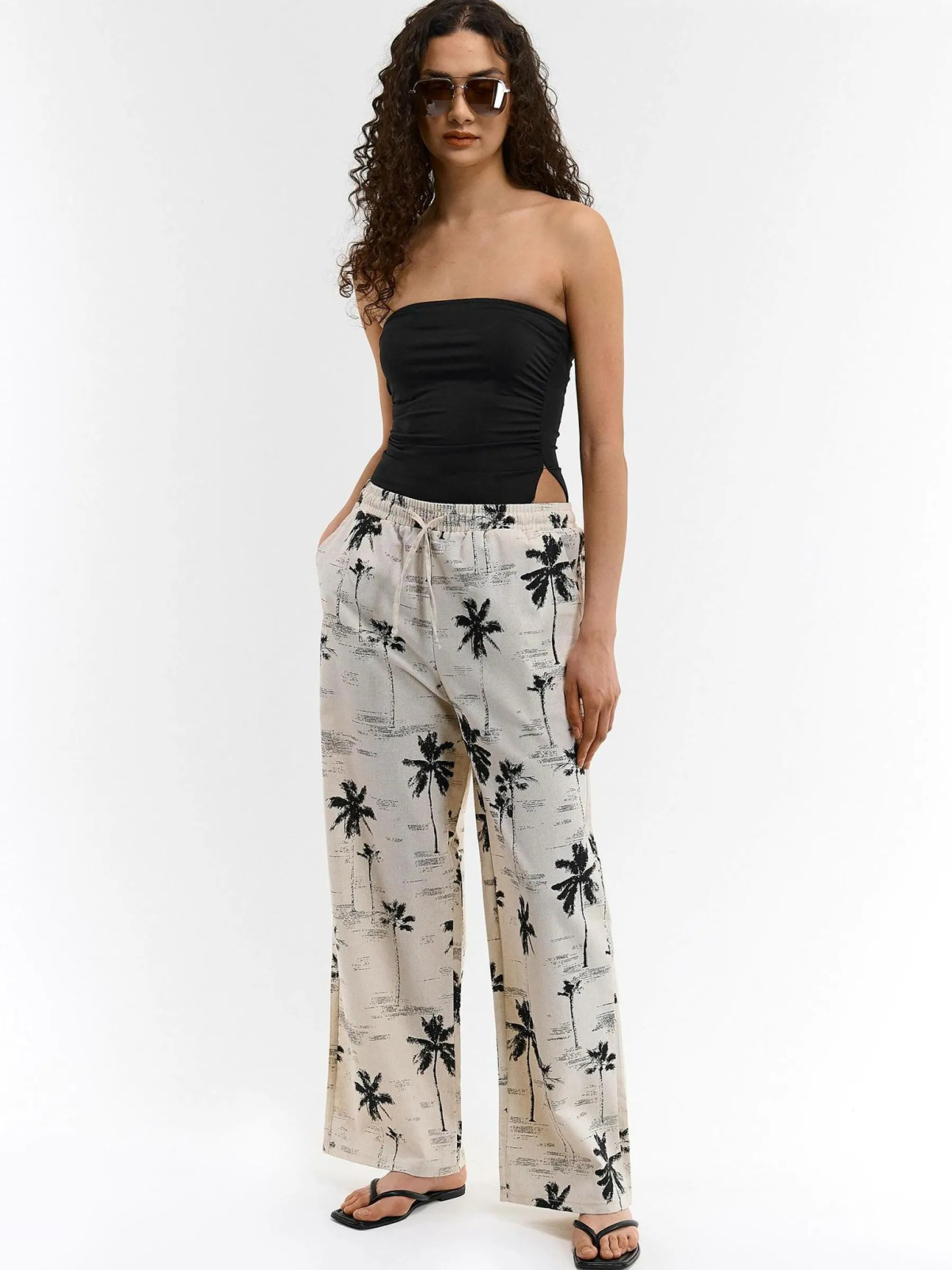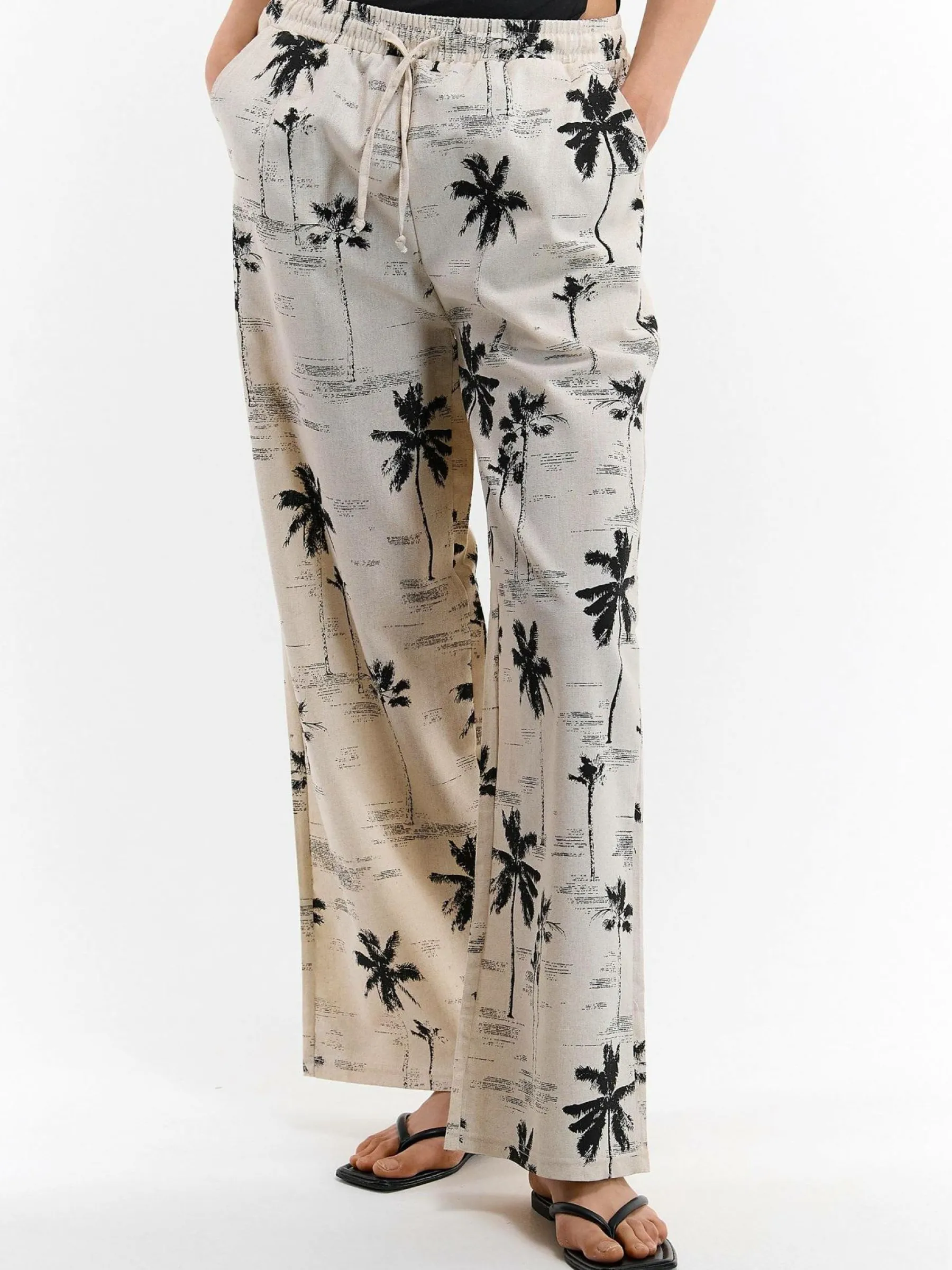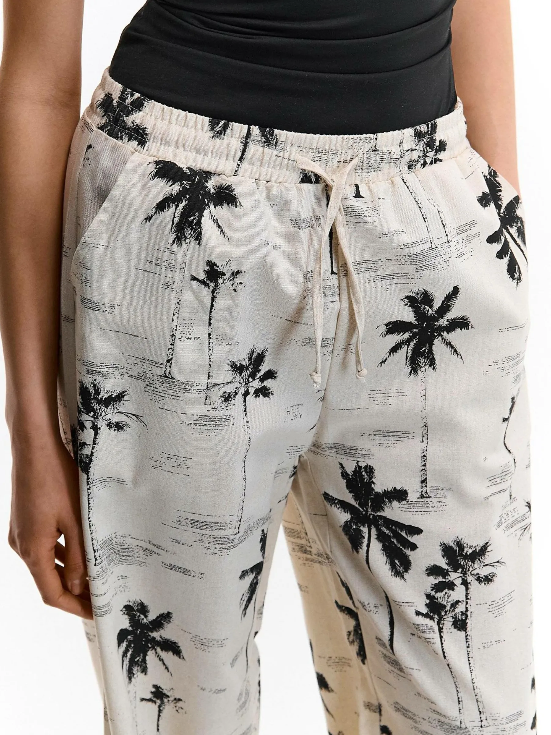 Kolor: beżowyKrój: szerokieTyp: spodnieDługość: dlugiePattern style: wzorzysteDetal: ze sznurowaniem, z elastyczną…