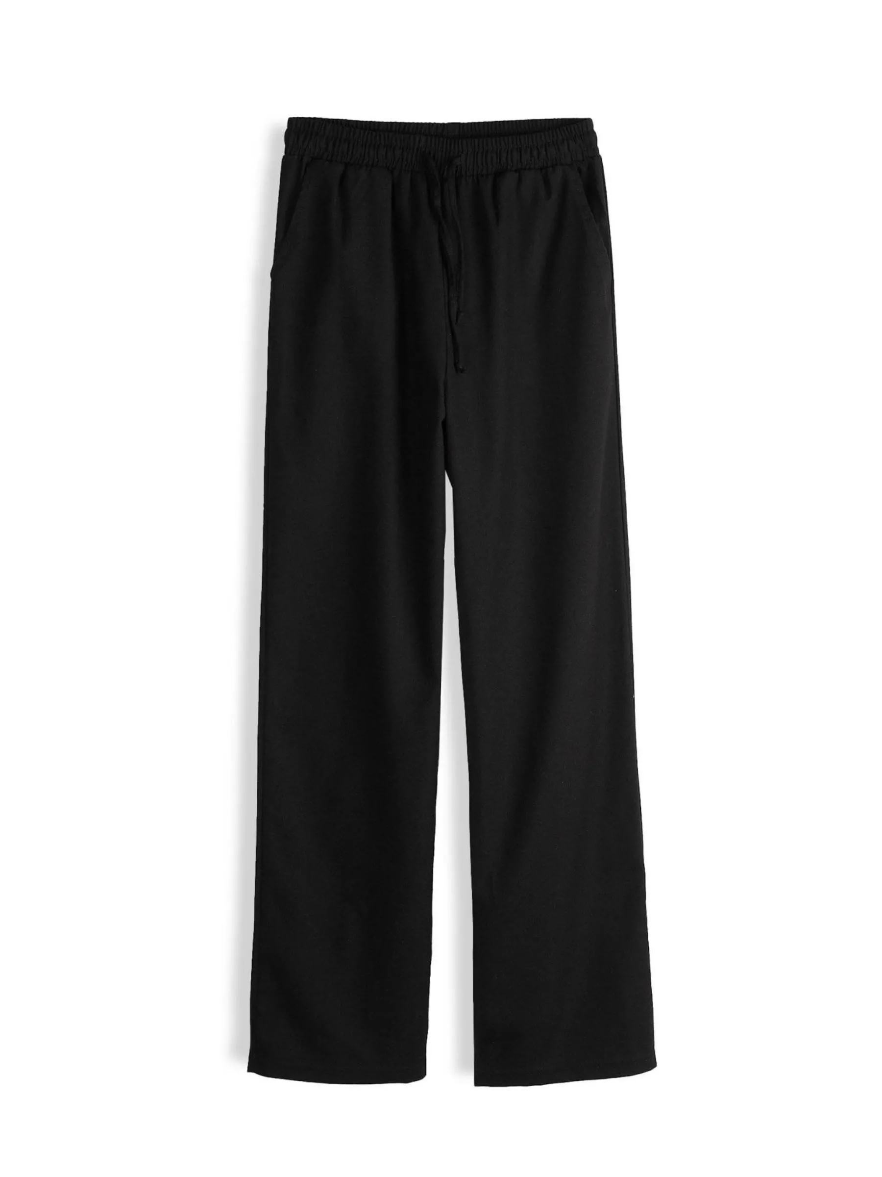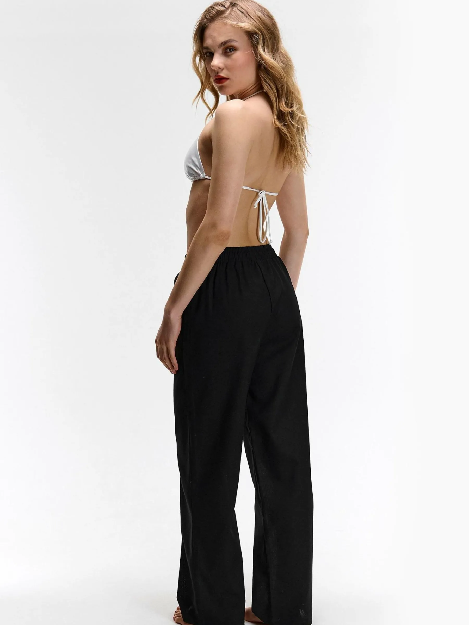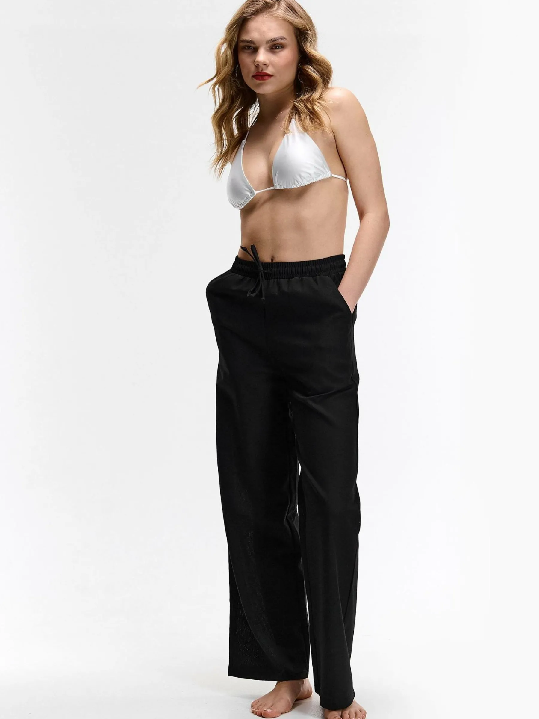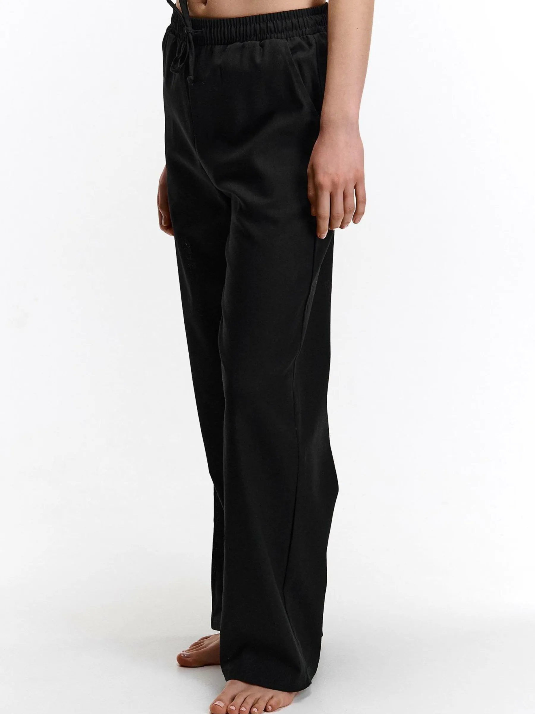 Kolor: czarnyKrój: szerokieTyp: spodnieDługość: dlugiePattern style: pojedynczy kolorDetal: ze sznurowaniem, z elast…