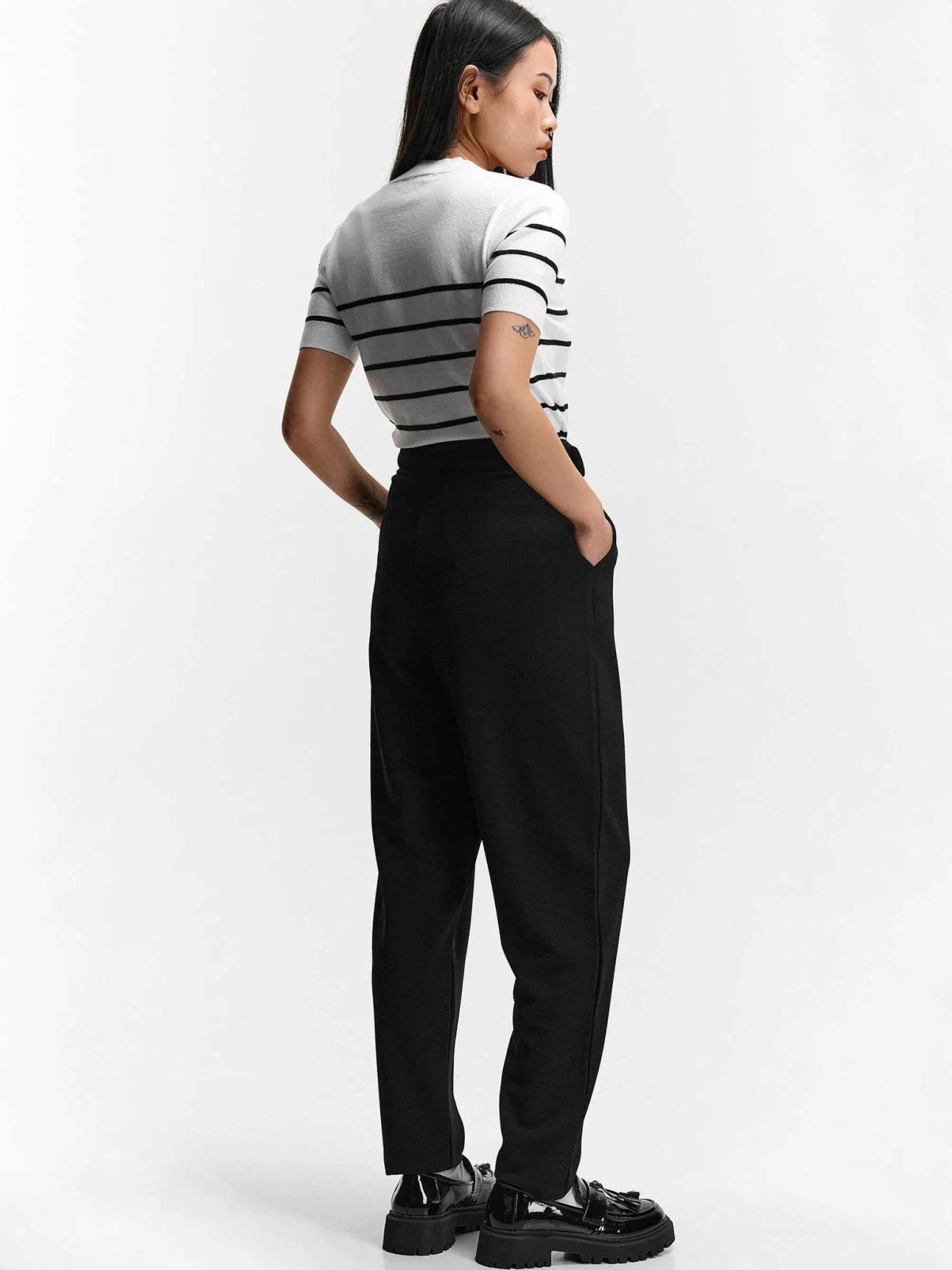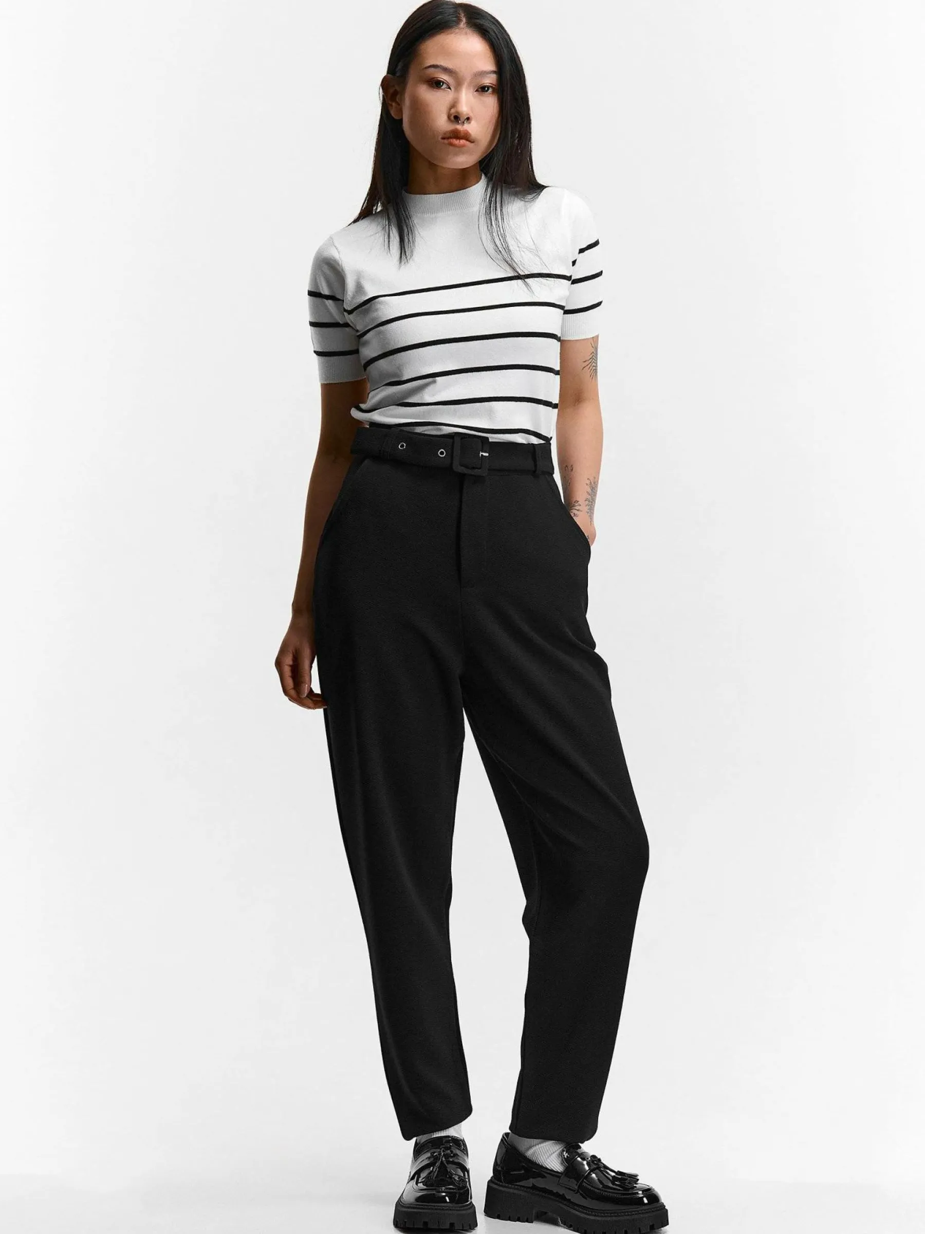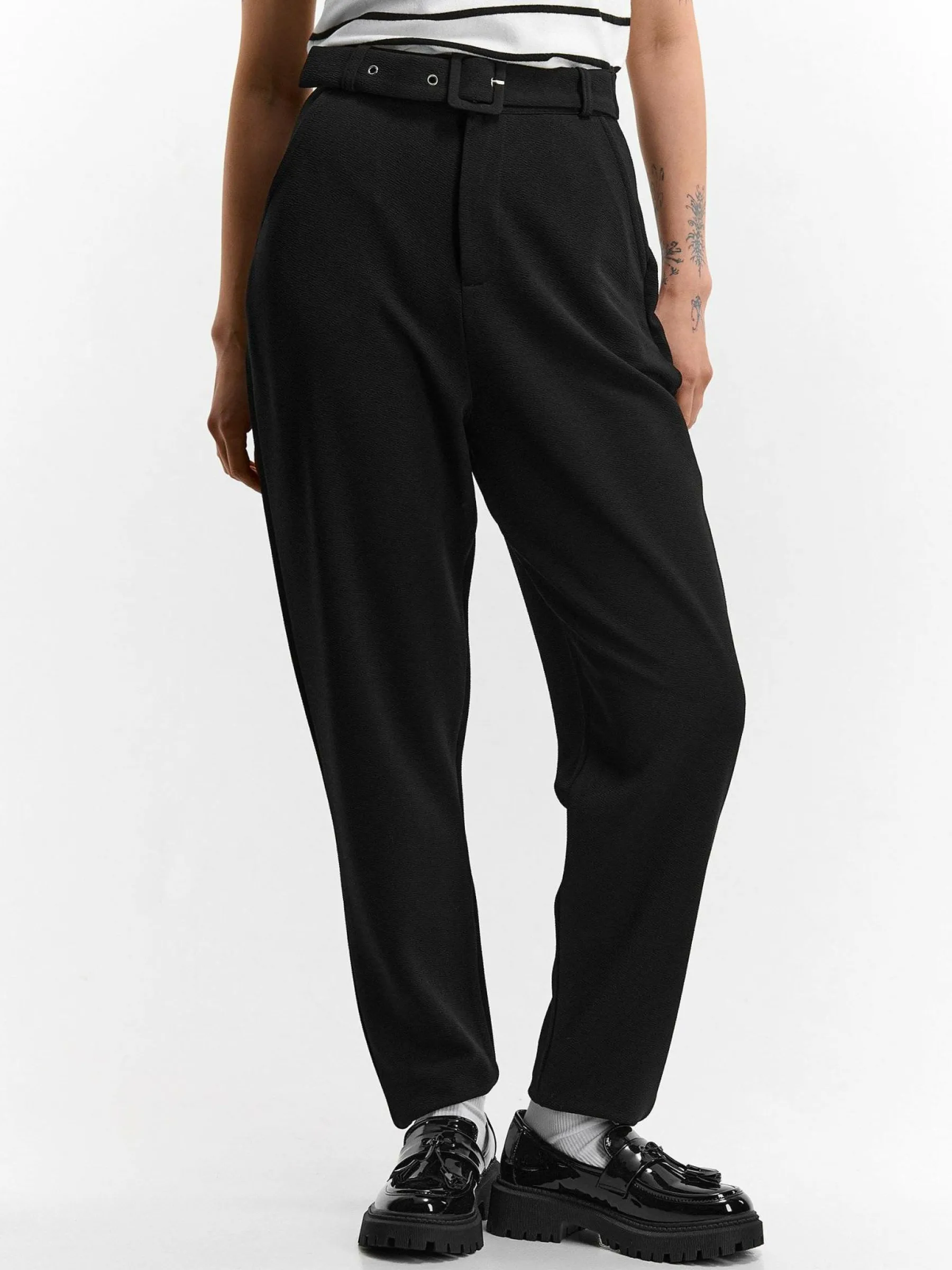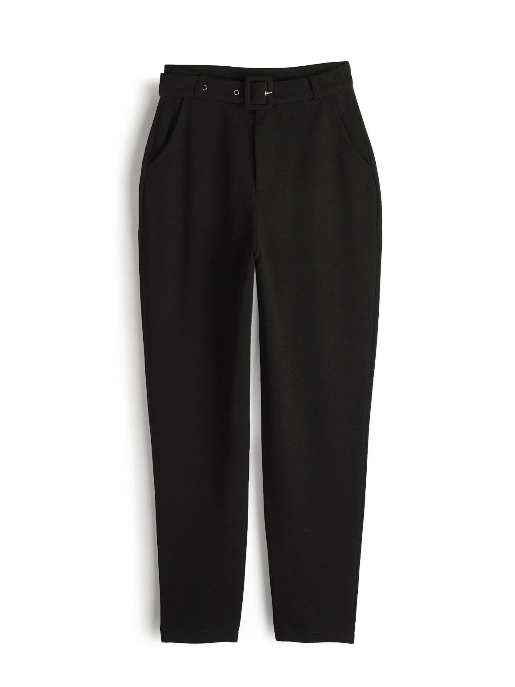 Kolor: czarnyKrój: straight, z wysokim stanemTyp: spodnieDługość: dlugiePattern style: pojedynczy kolorDetal: z pask…