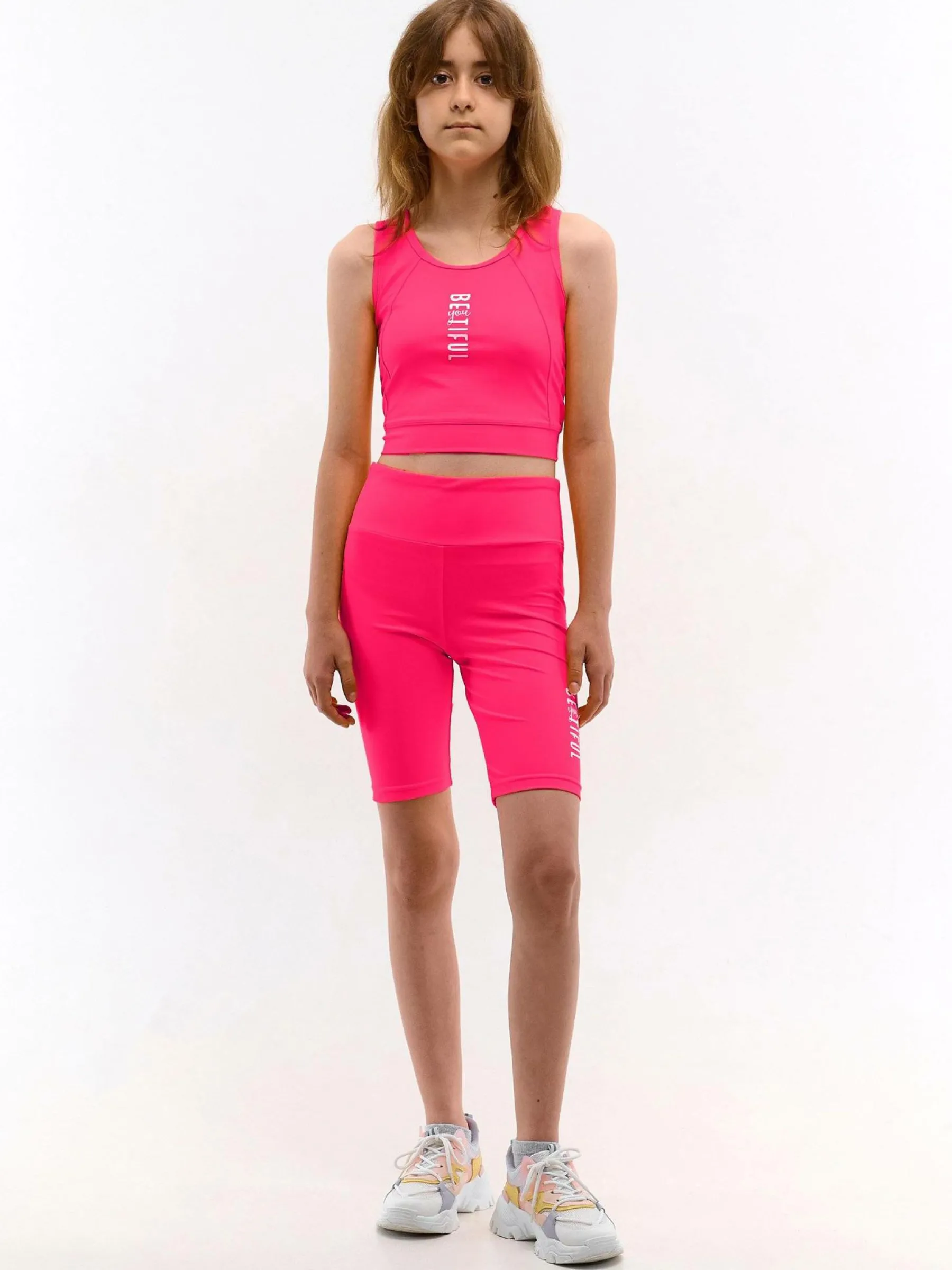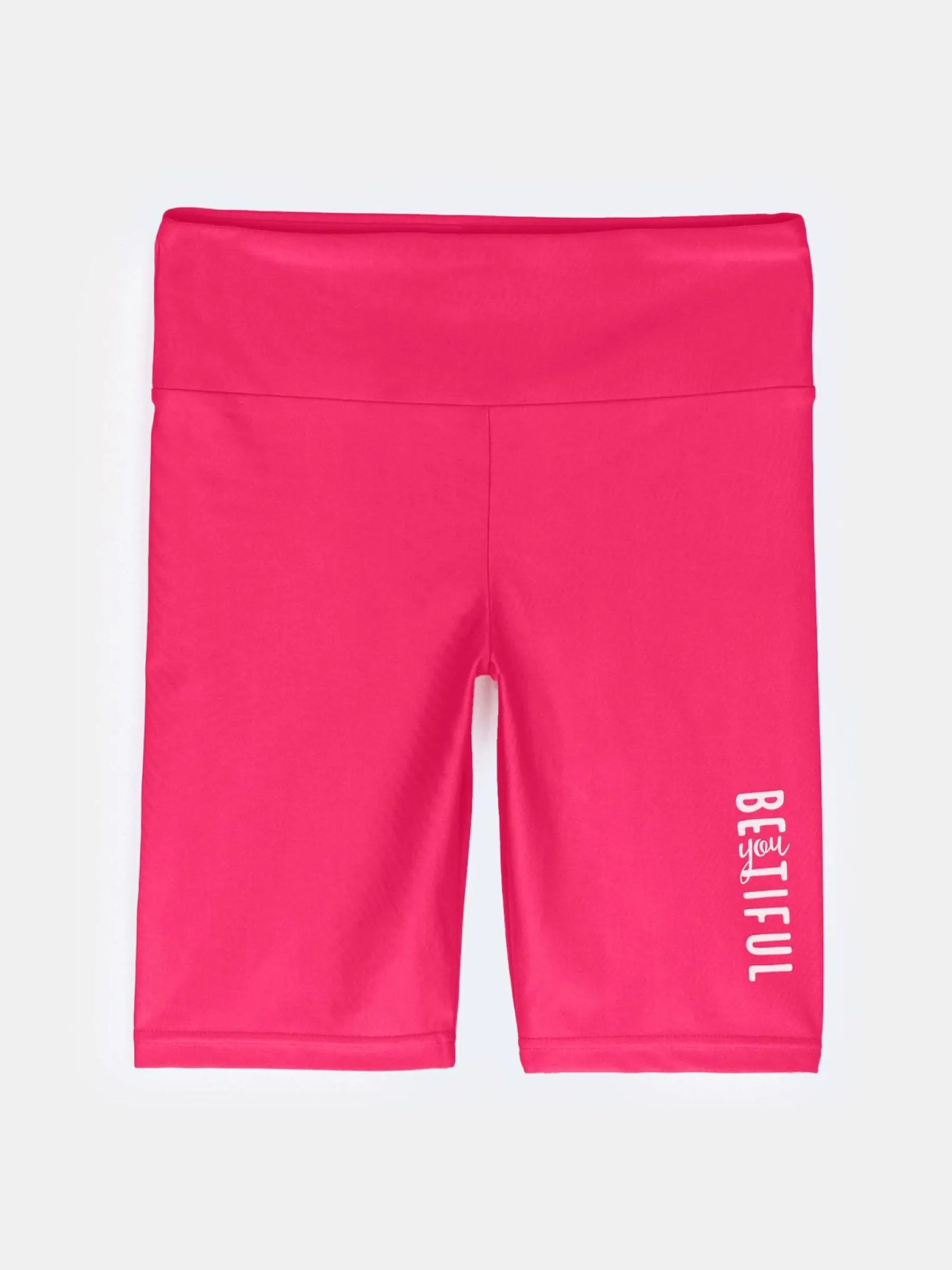 Kolor: różowyKrój: bikerTyp: spodenkiDługość: krótkiPattern style: pojedynczy kolorDetal: ze znakiemMateriał: sy…