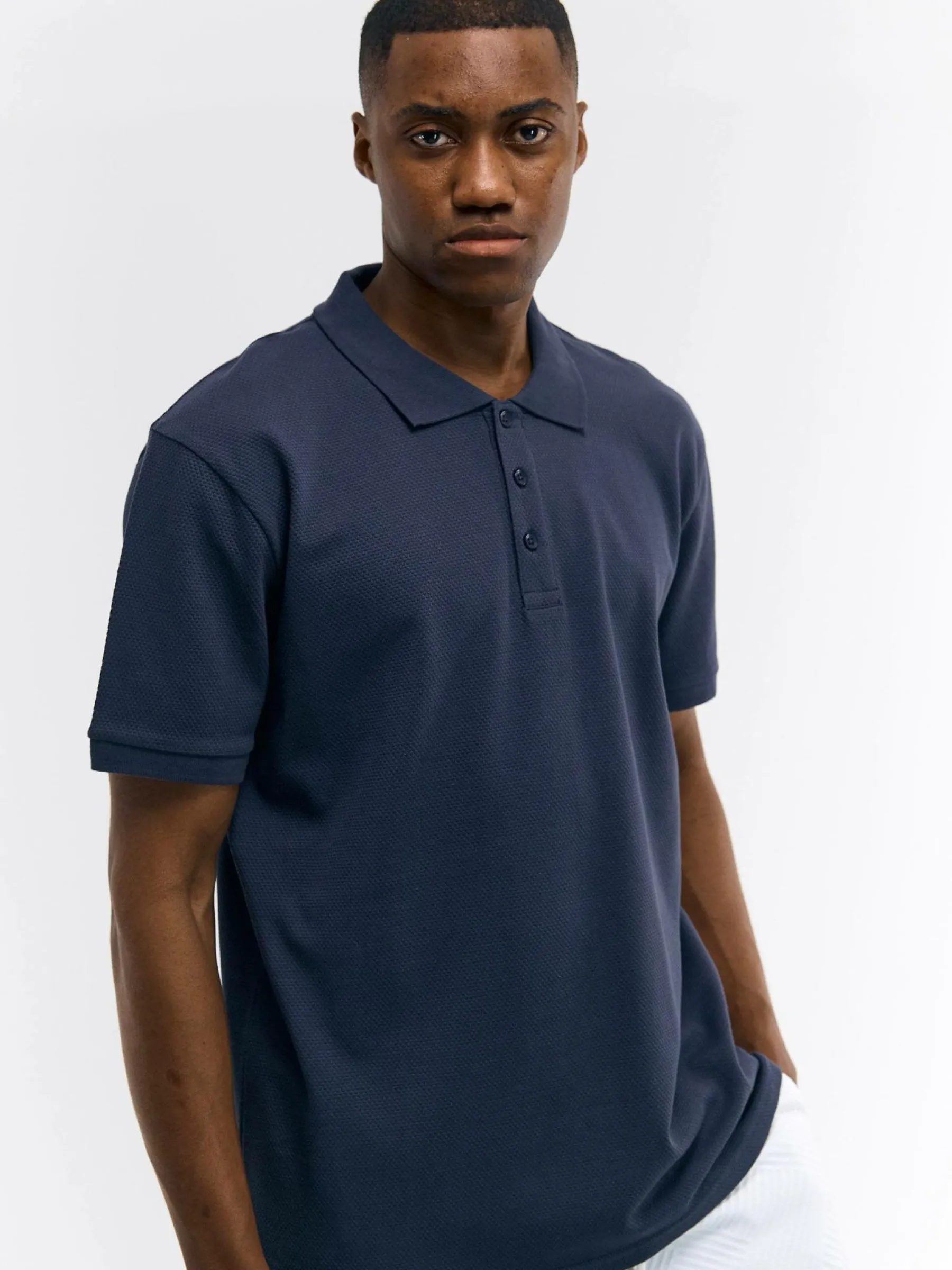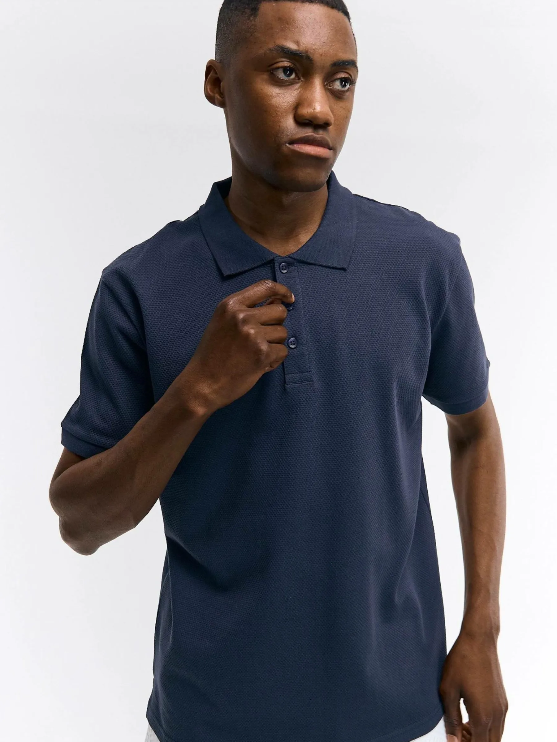 Kolor: granatowy, niebieskiKrój: poloTyp: koszulkaRekaw: krótki rękawPattern style: pojedynczy kolor, strukturowaneDe…