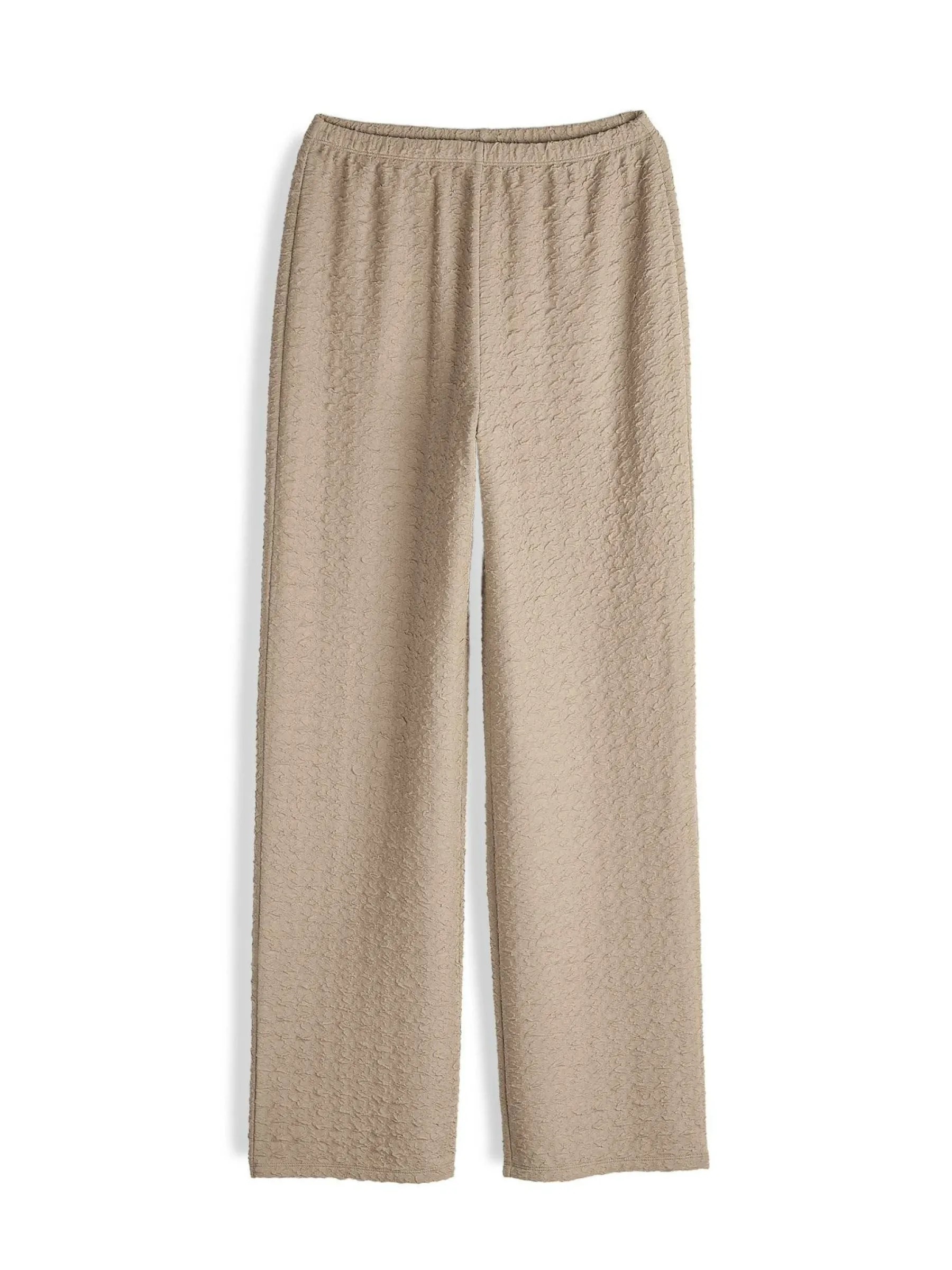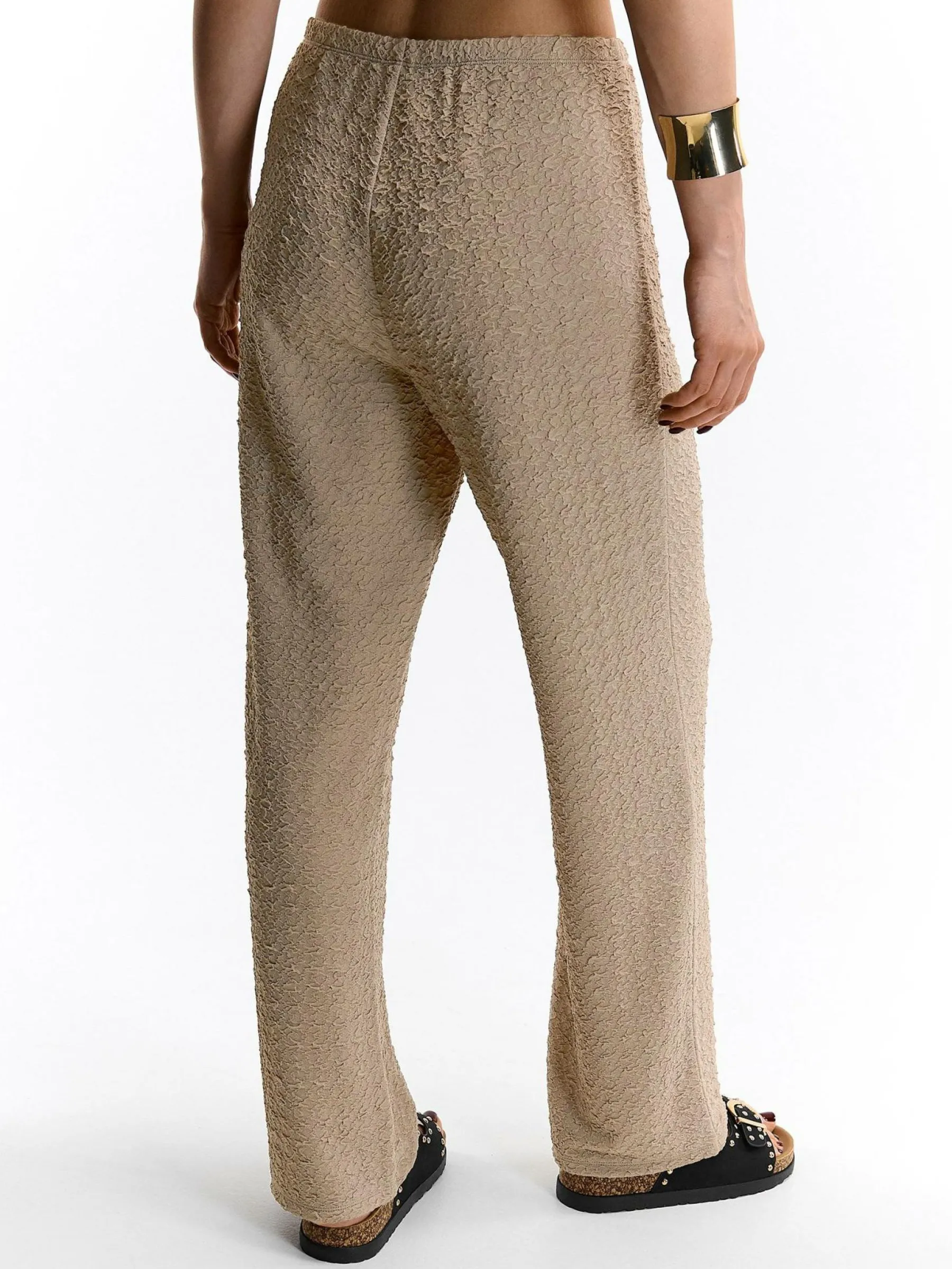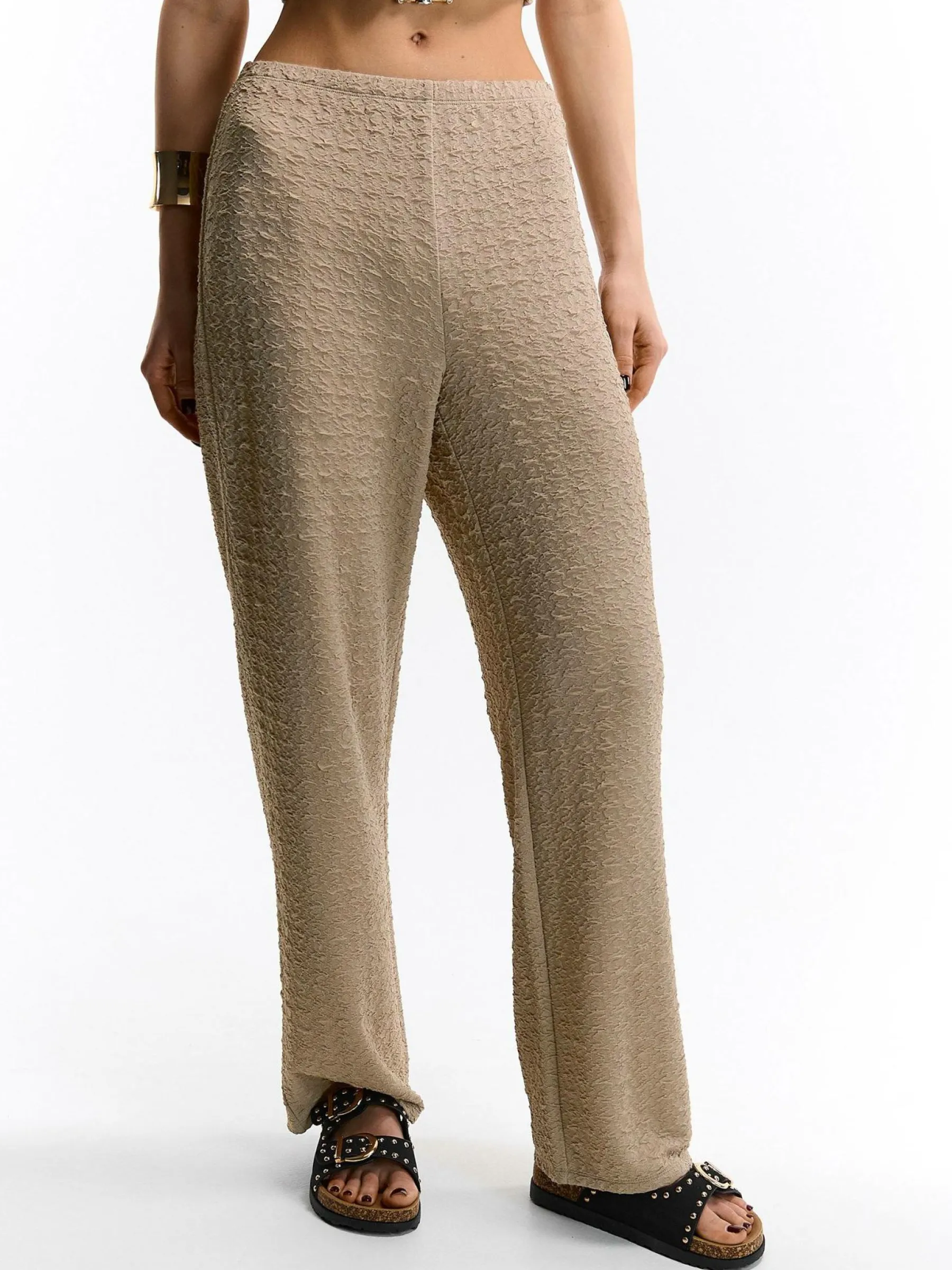 Kolor: beżowyKrój: szerokieTyp: spodnieDługość: dlugiePattern style: pojedynczy kolor, strukturowaneDetal: z elasty…
