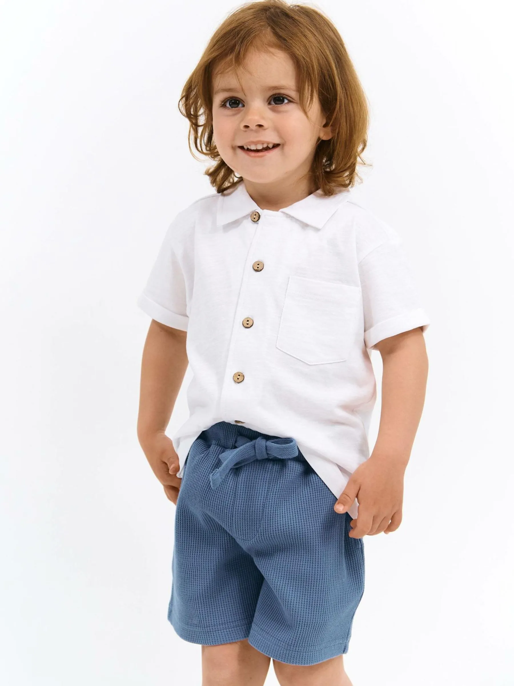 Kolor: niebieskiKrój: straightTyp: spodenkiDługość: krótkiPattern style: strukturowane, pojedynczy kolorDetal: z ki…