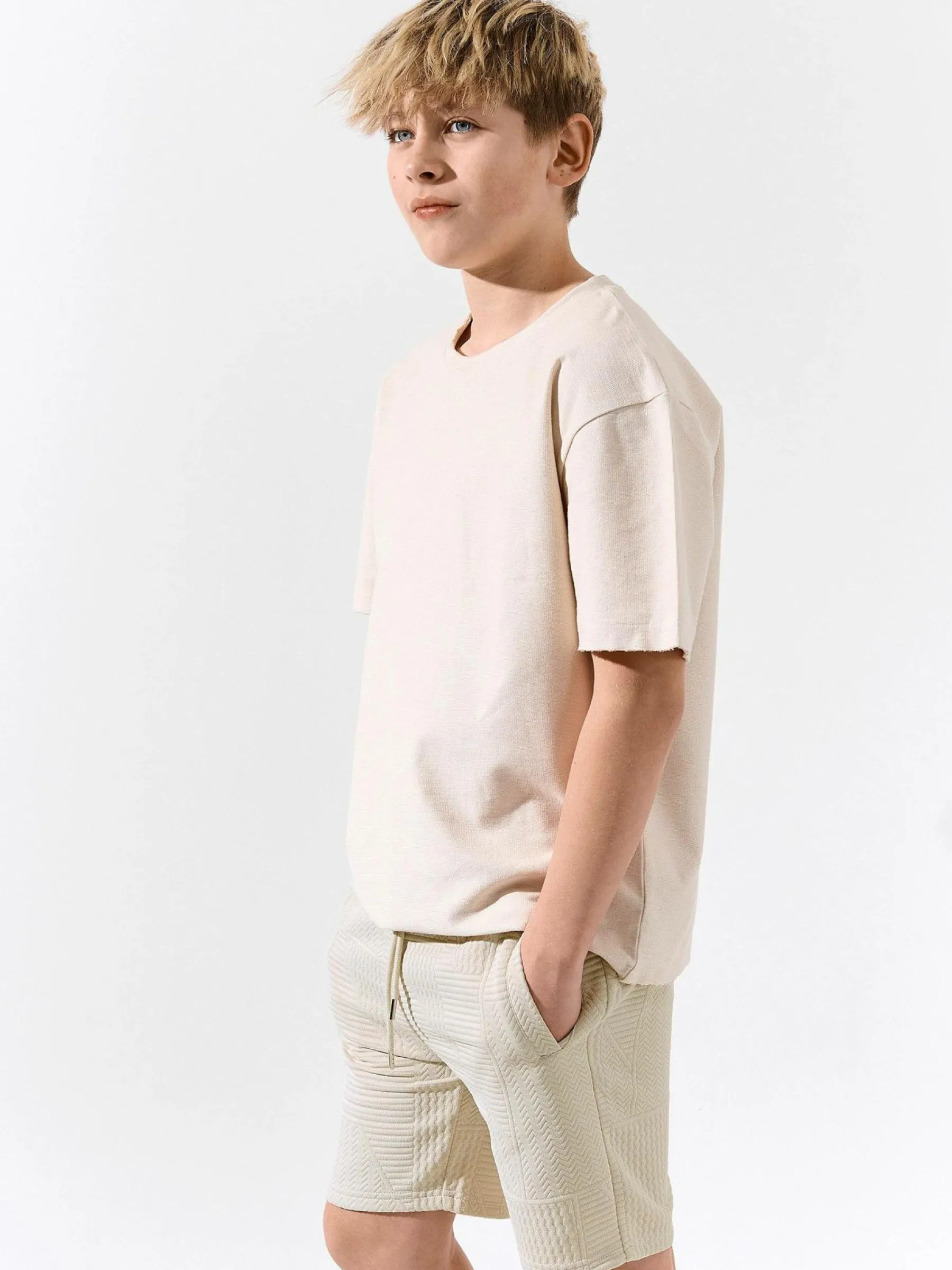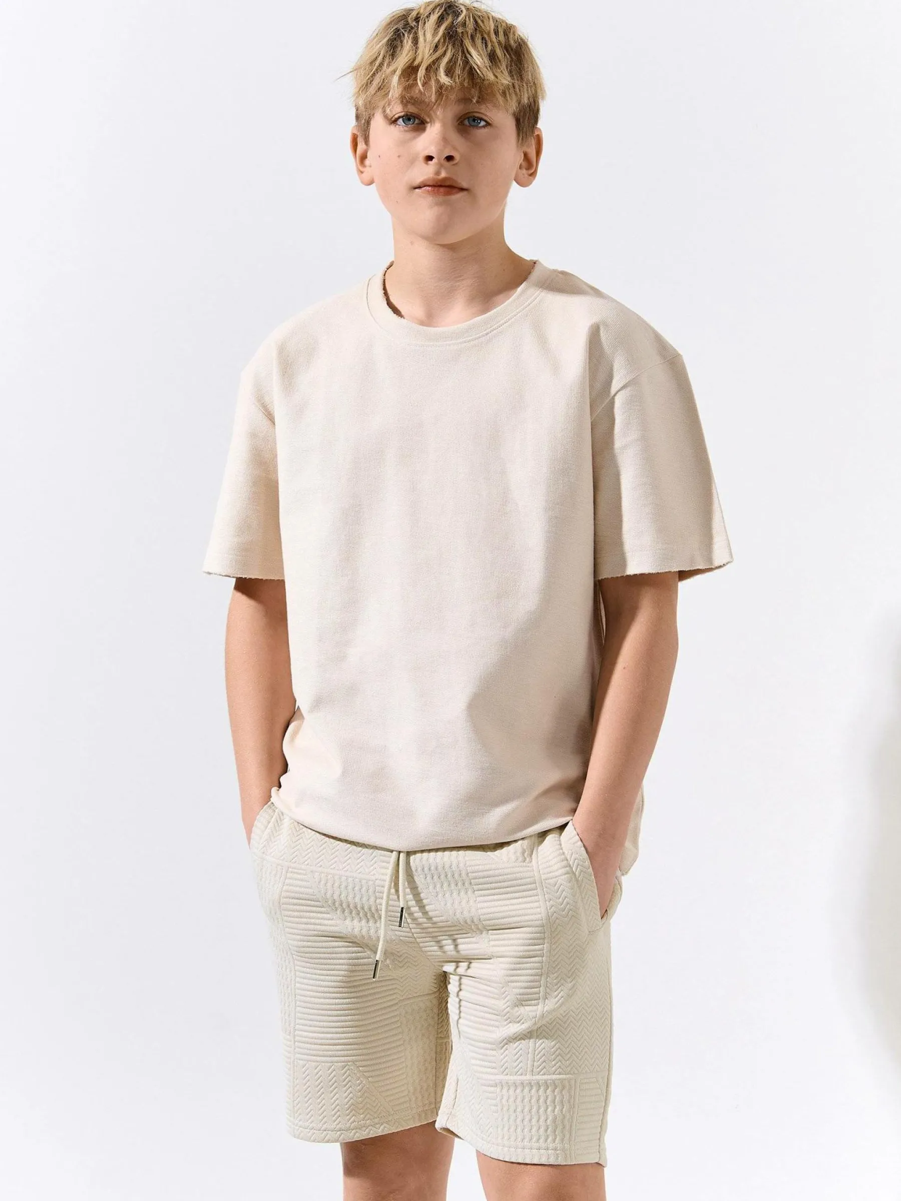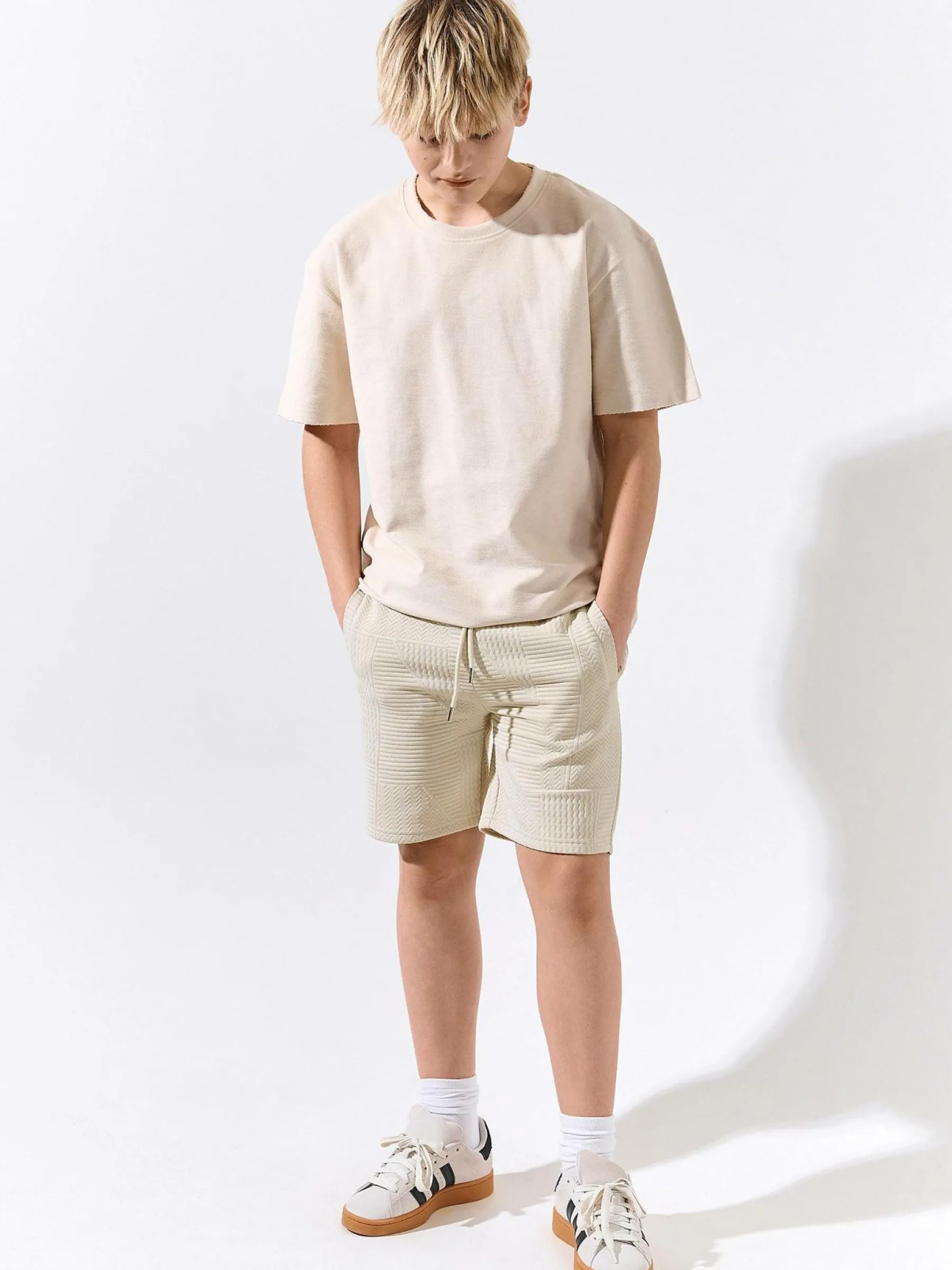 Kolor: beżowyKrój: regularTyp: spodenkiDługość: krótkiPattern style: pojedynczy kolor, strukturowaneDetal: ze sznu…