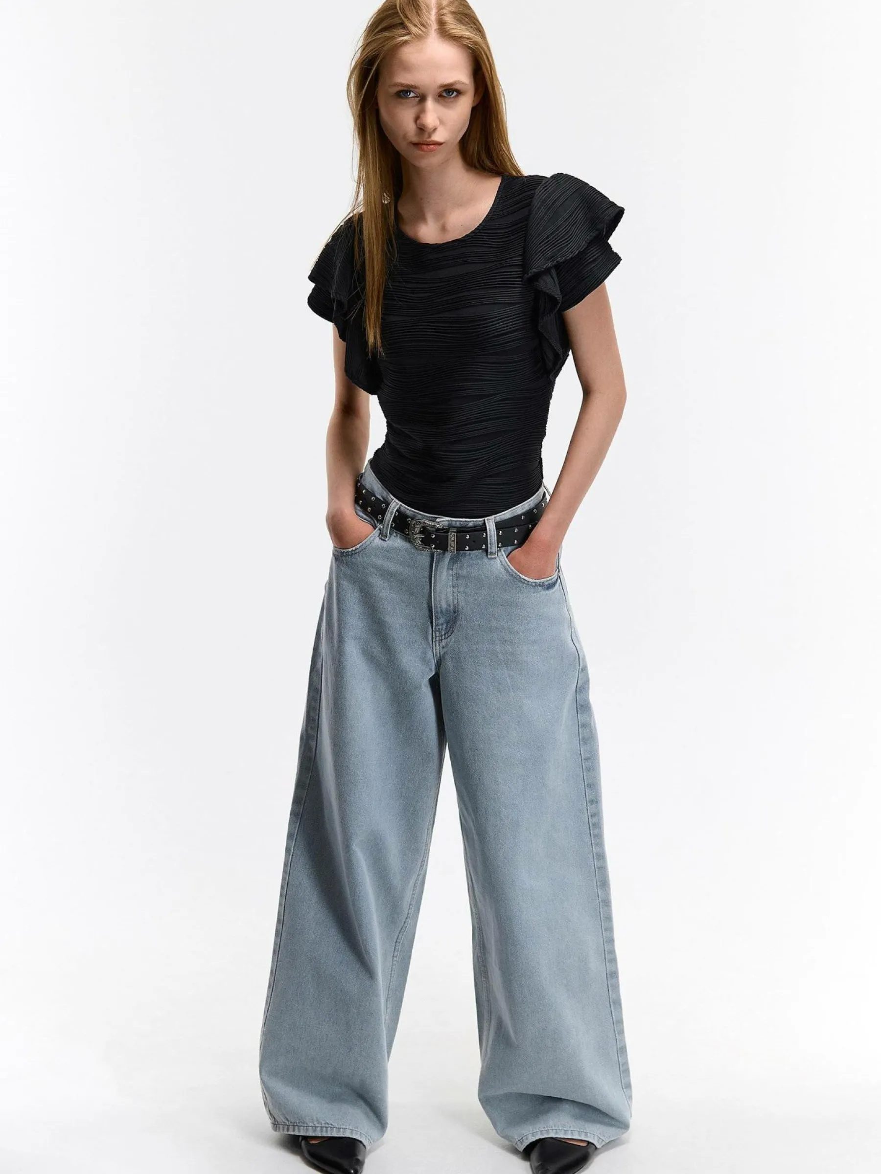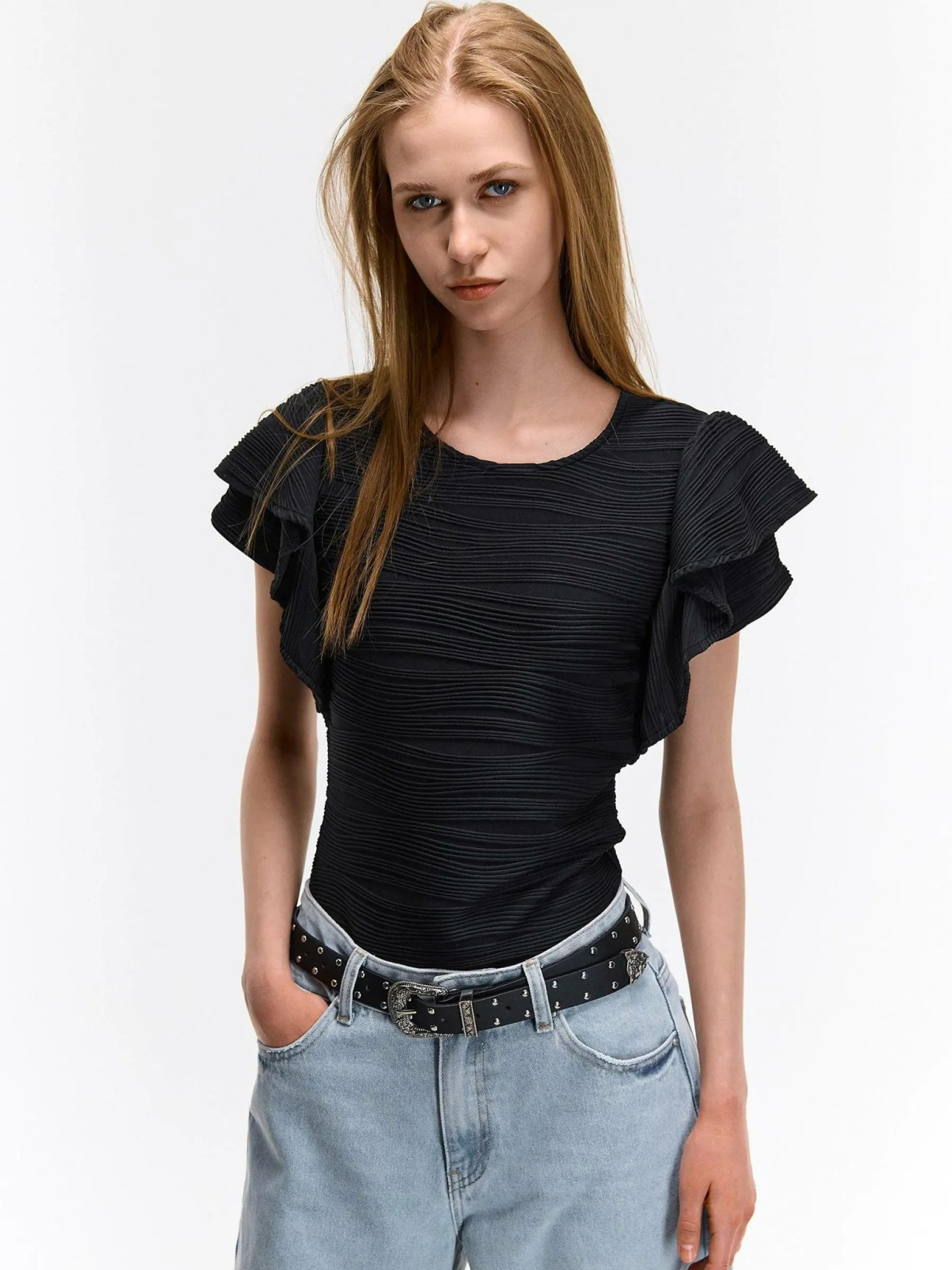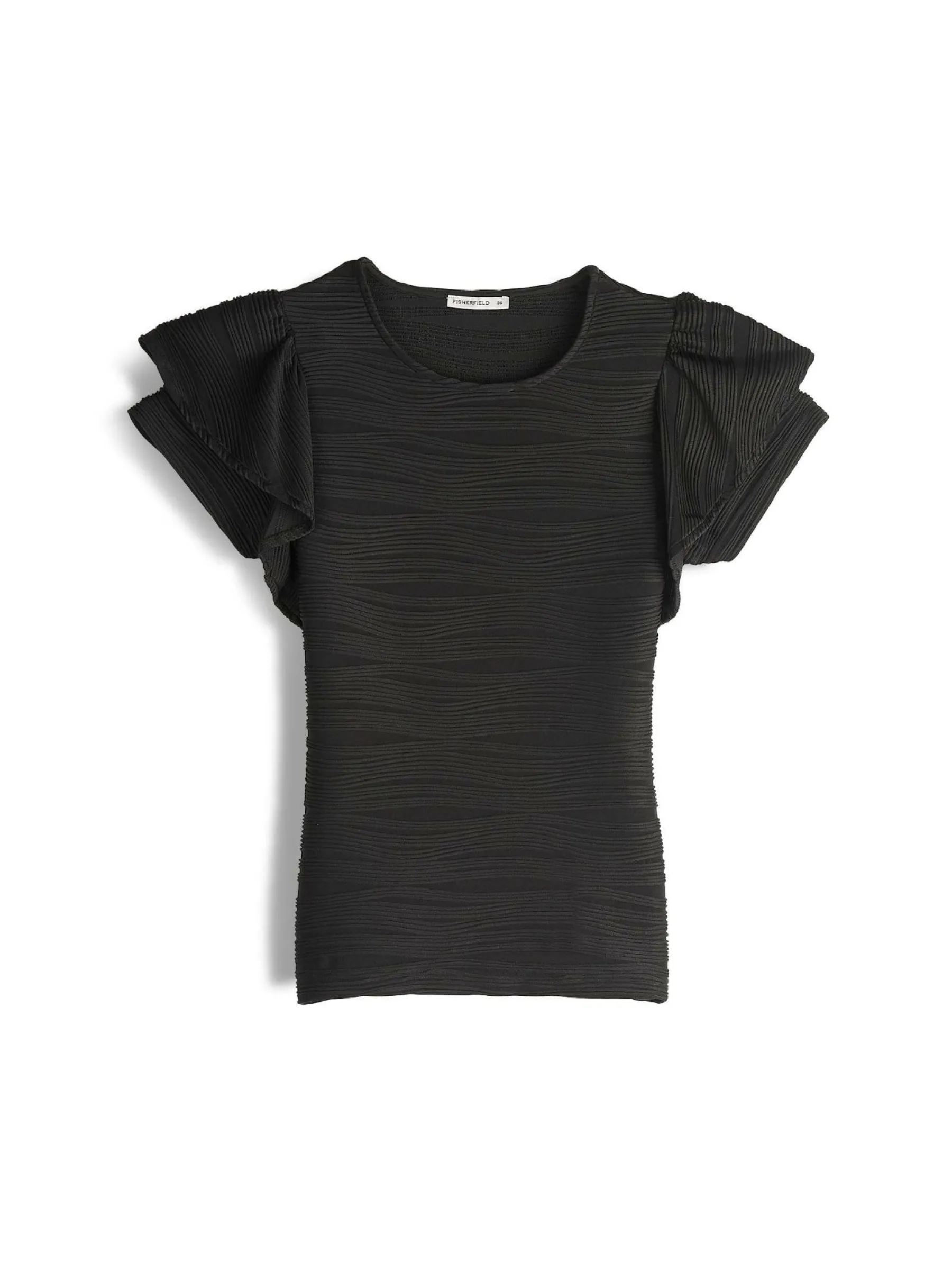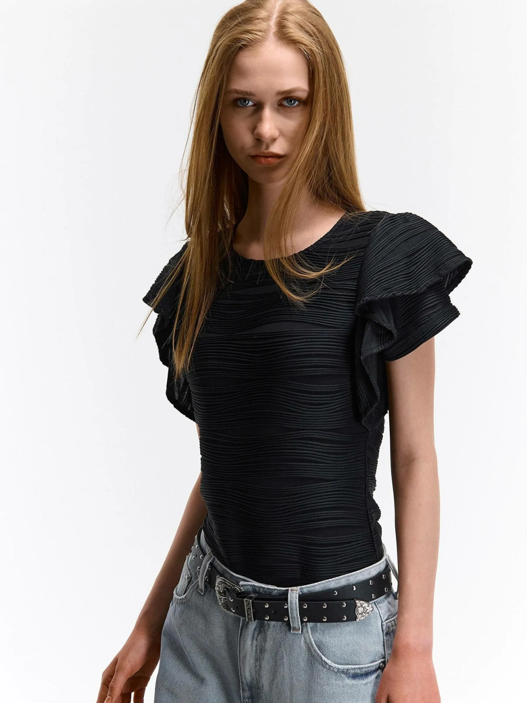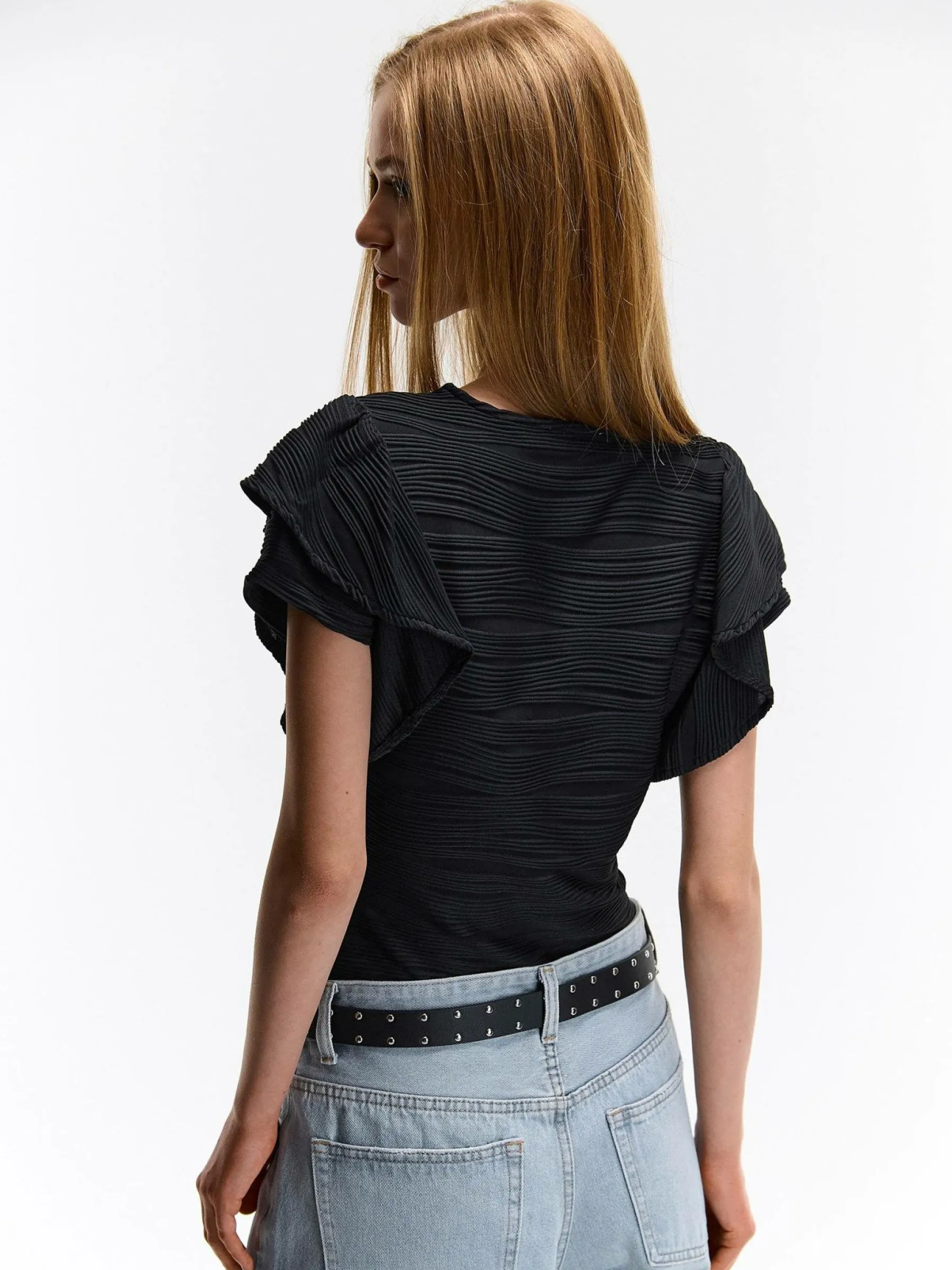 Kolor: czarnyKrój: z falbanąTyp: topRekaw: krótki rękawDługość: krótkiPattern style: pojedynczy kolor, strukturo…