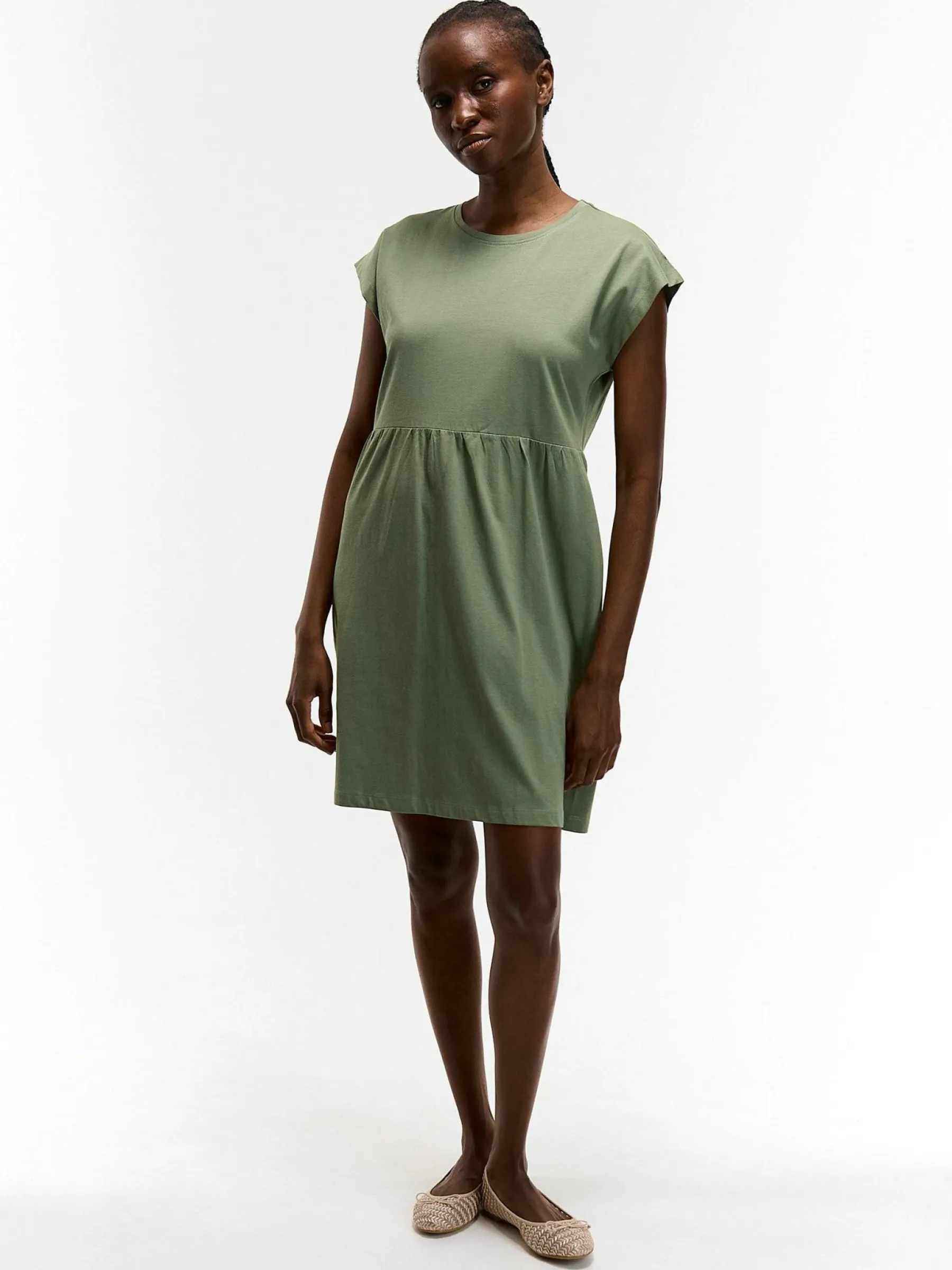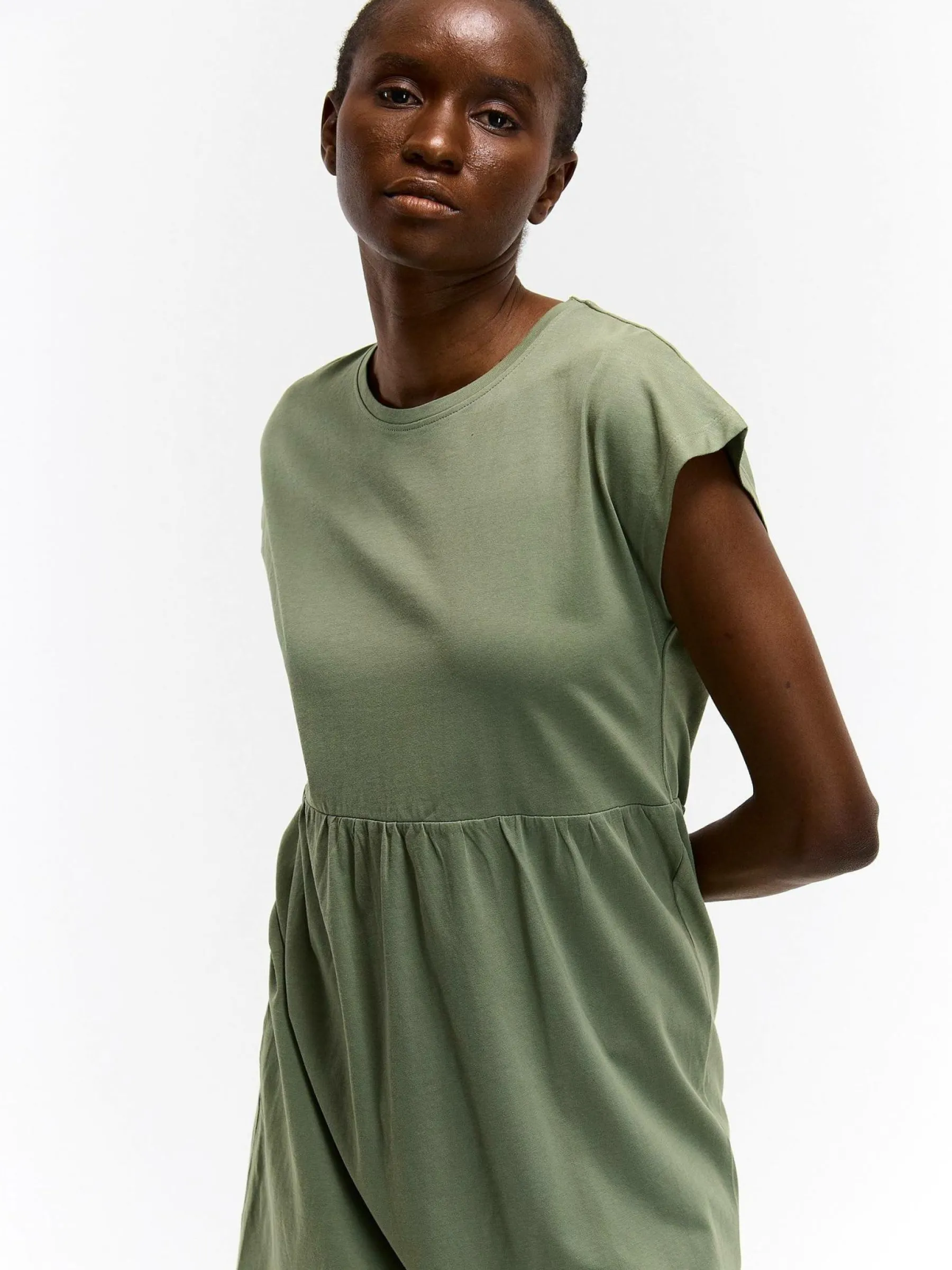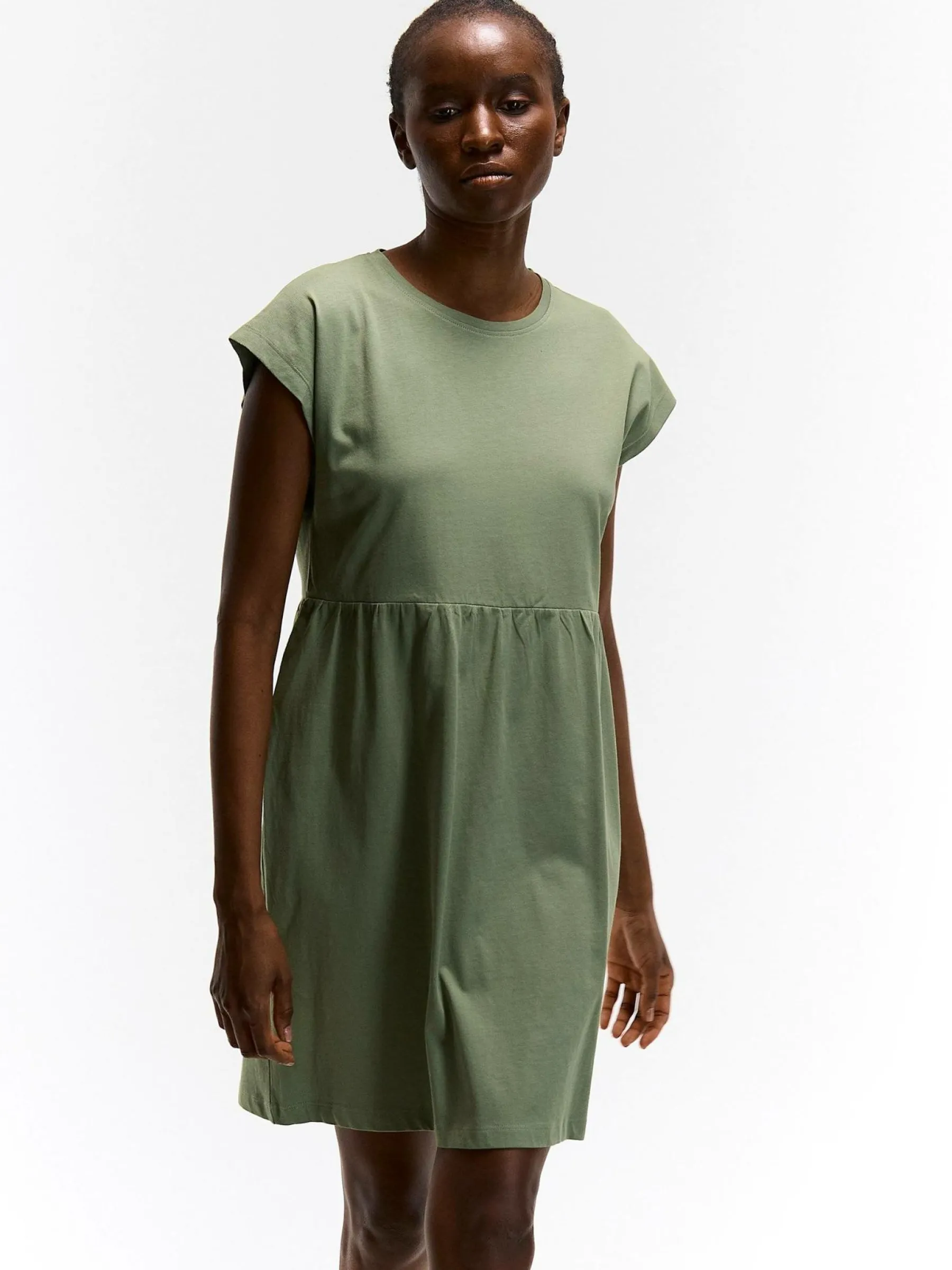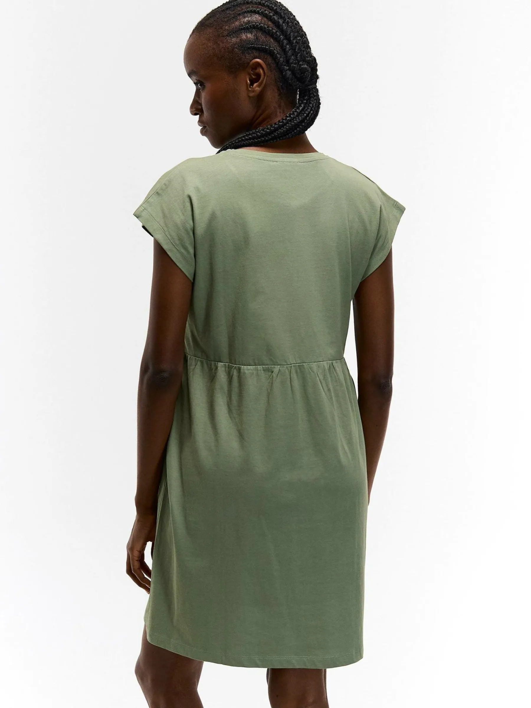 Kolor: zielonyKrój: regularTyp: sukienkaRekaw: krótki rękawDługość: miniPattern style: pojedynczy kolorDetal: z fa…