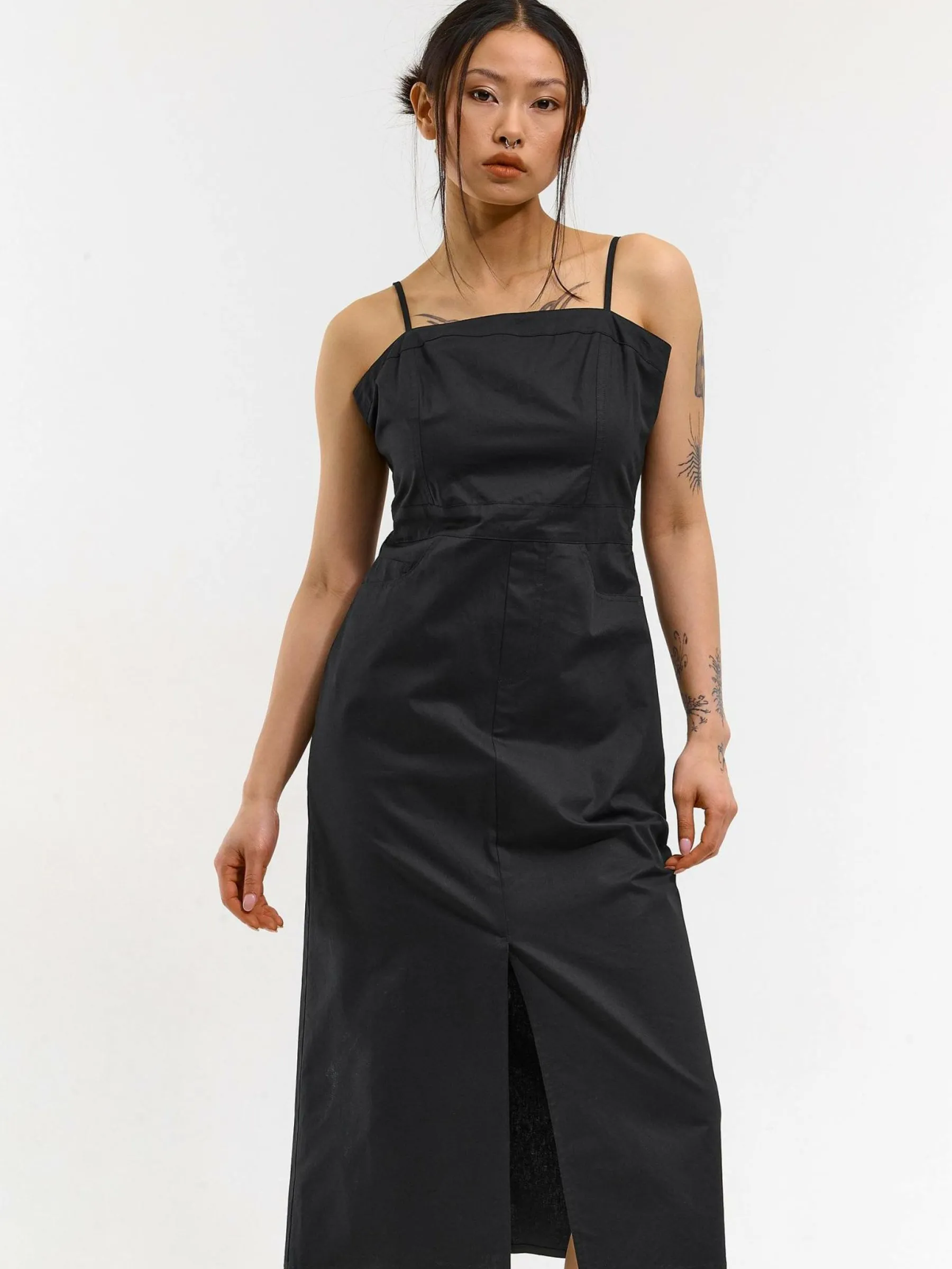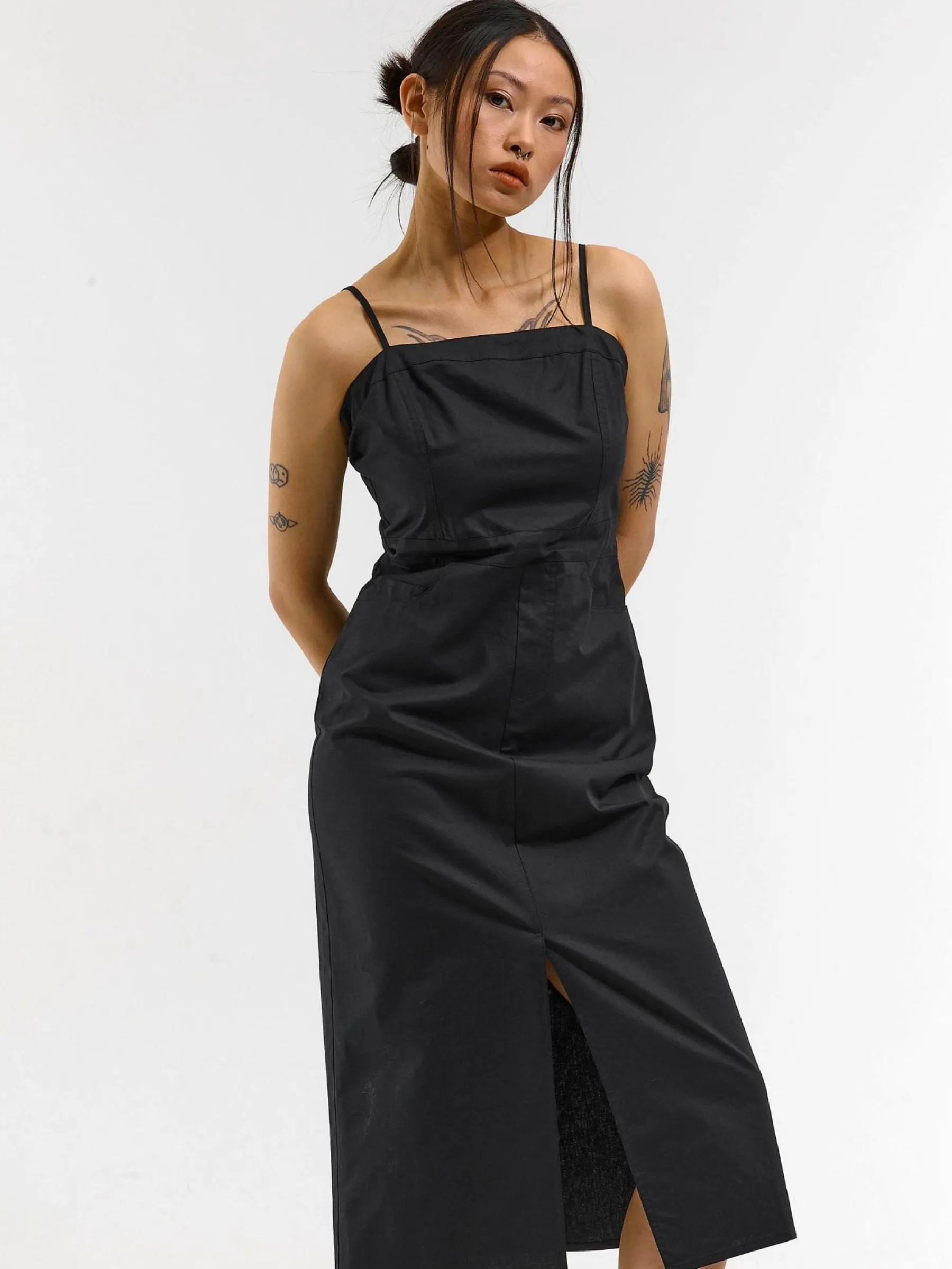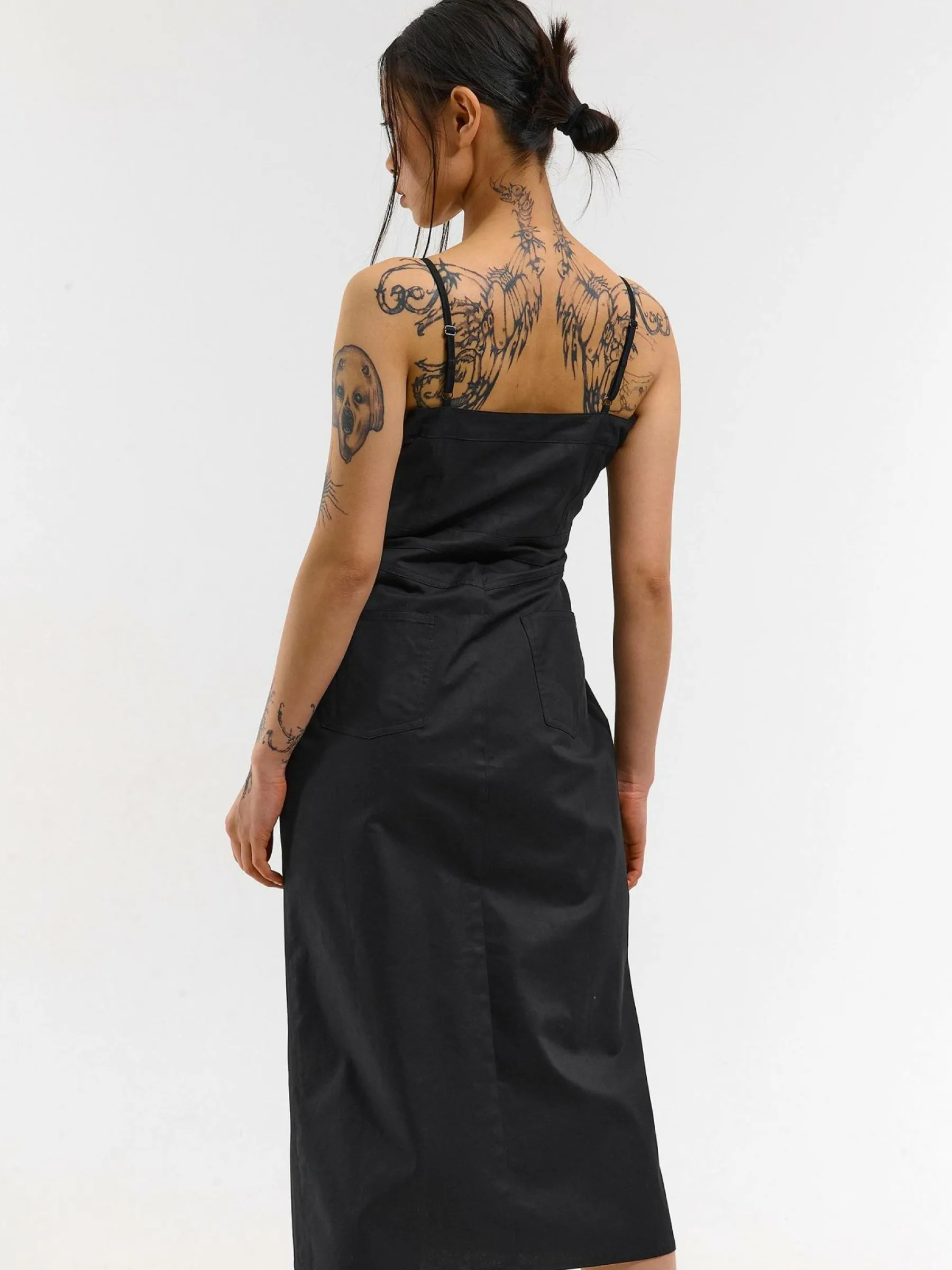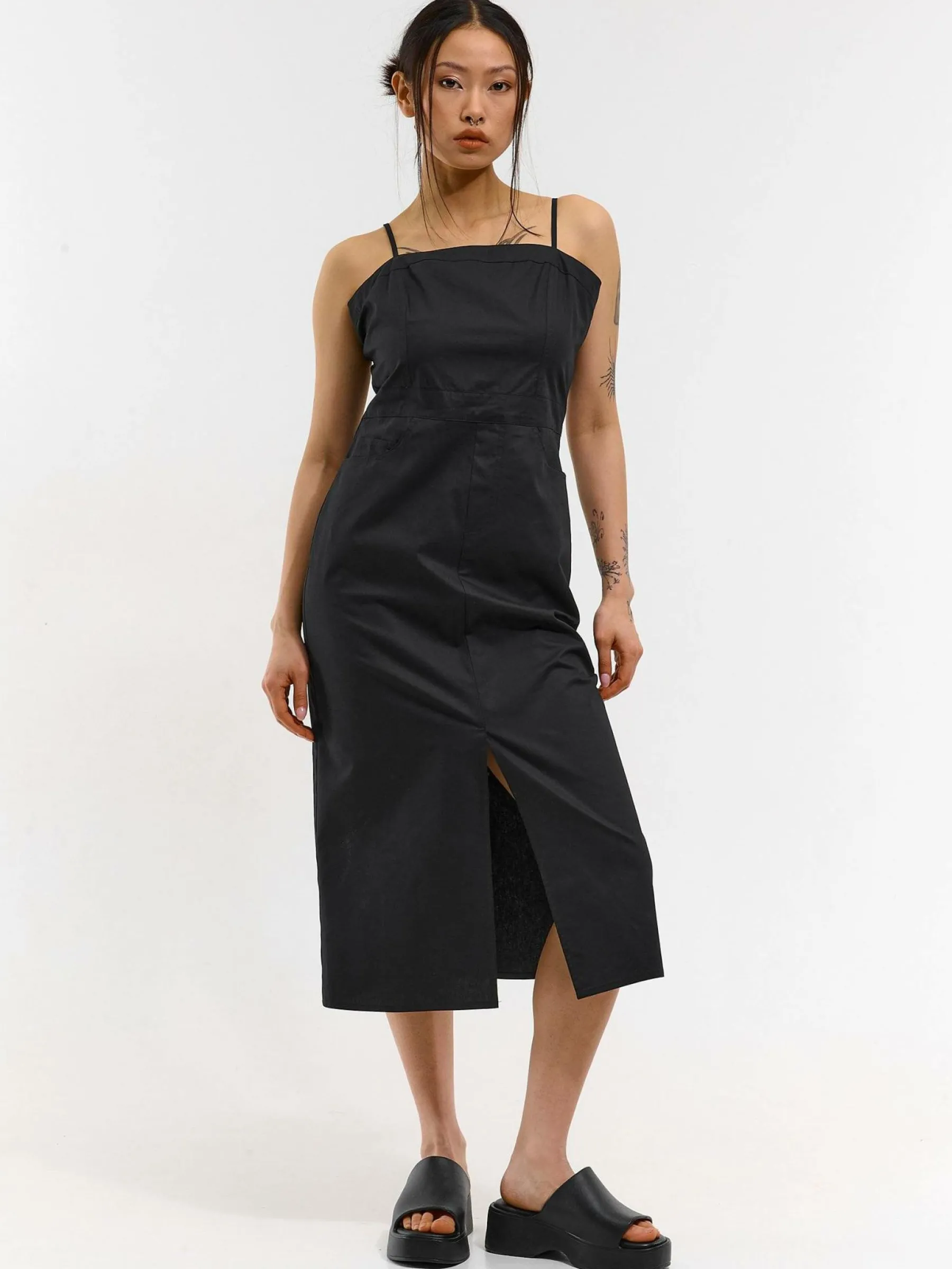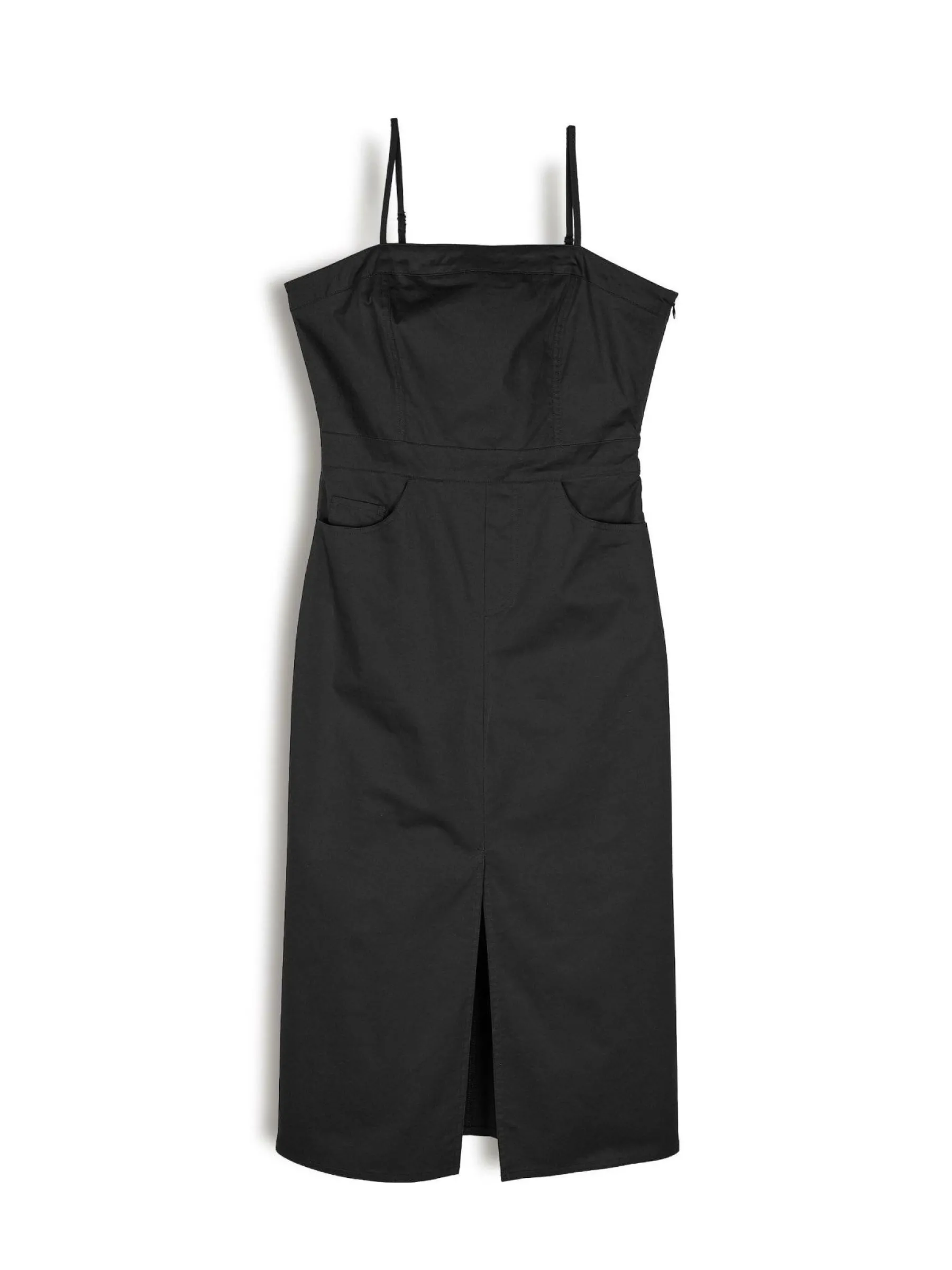 Kolor: czarnyKrój: ołówkoweTyp: sukienkaRekaw: bez rękawówDługość: midiPattern style: pojedynczy kolorDetal: z k…