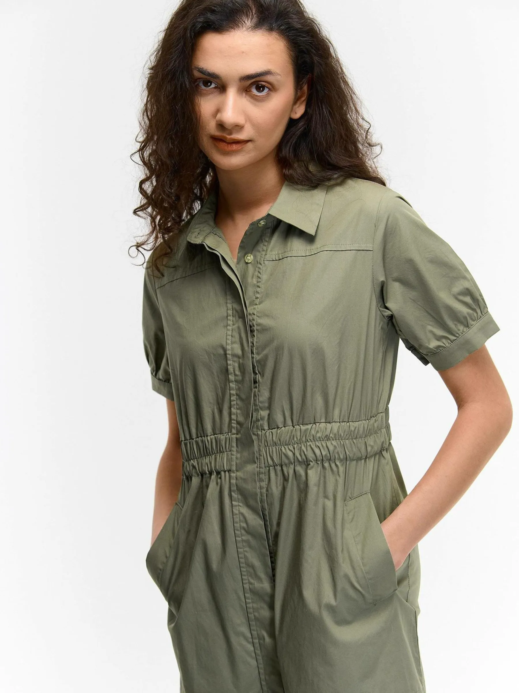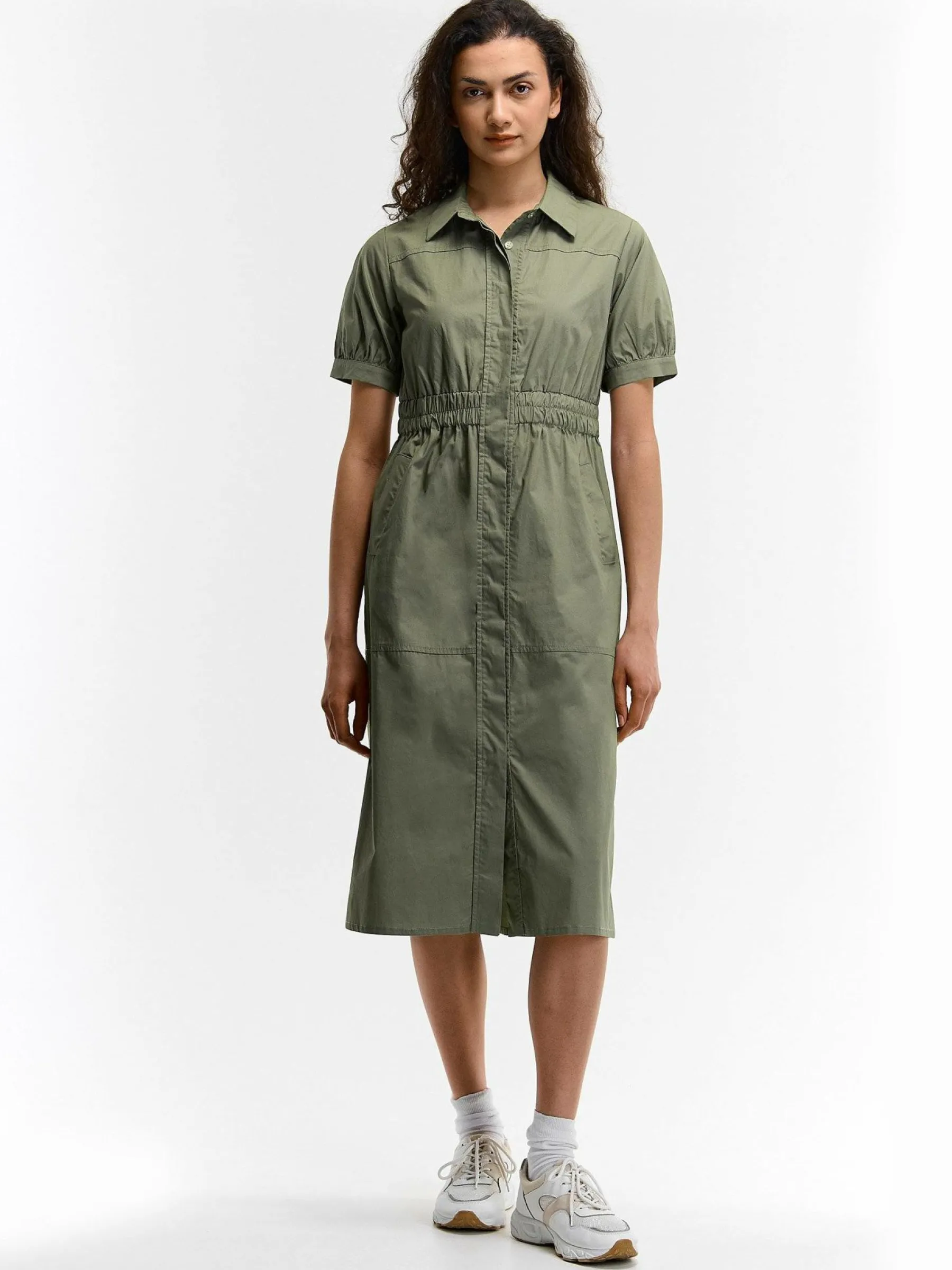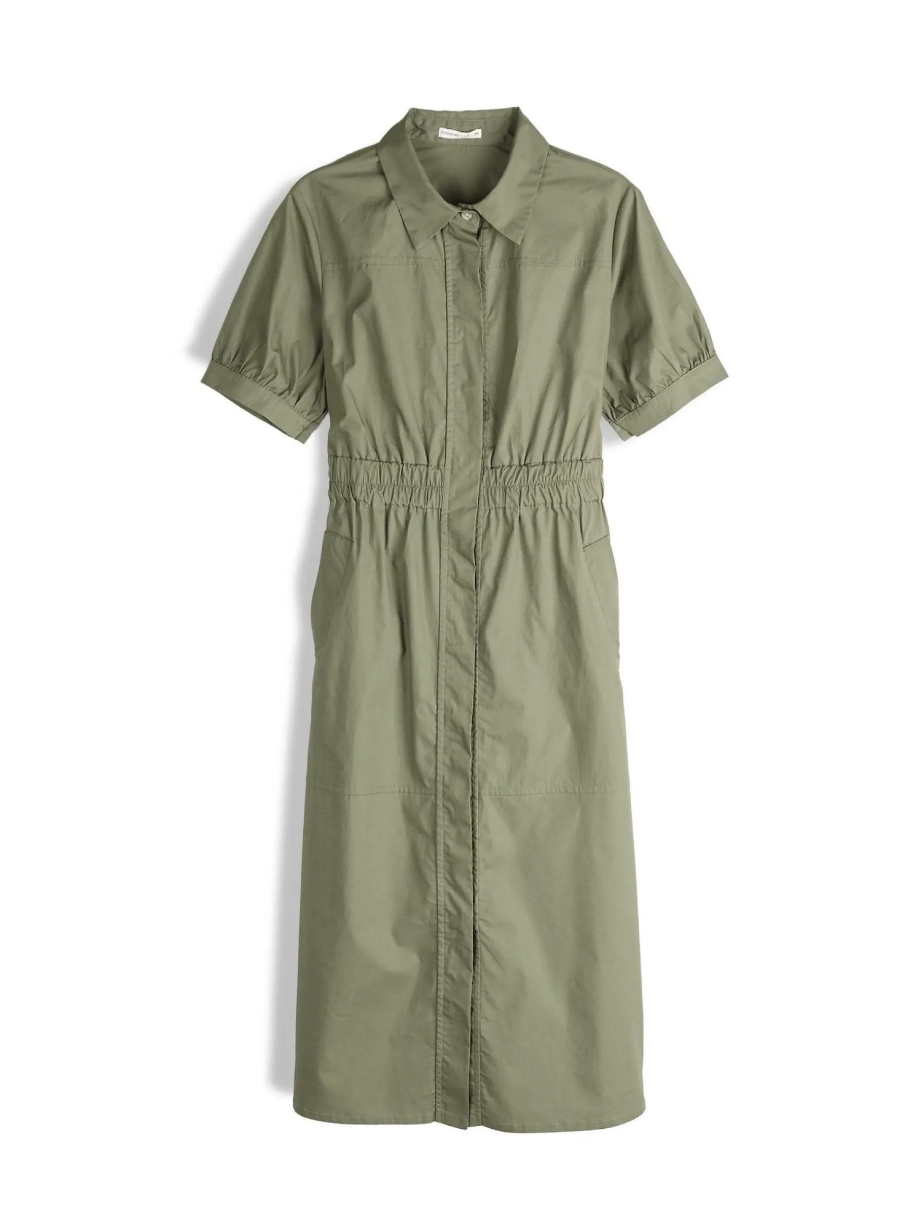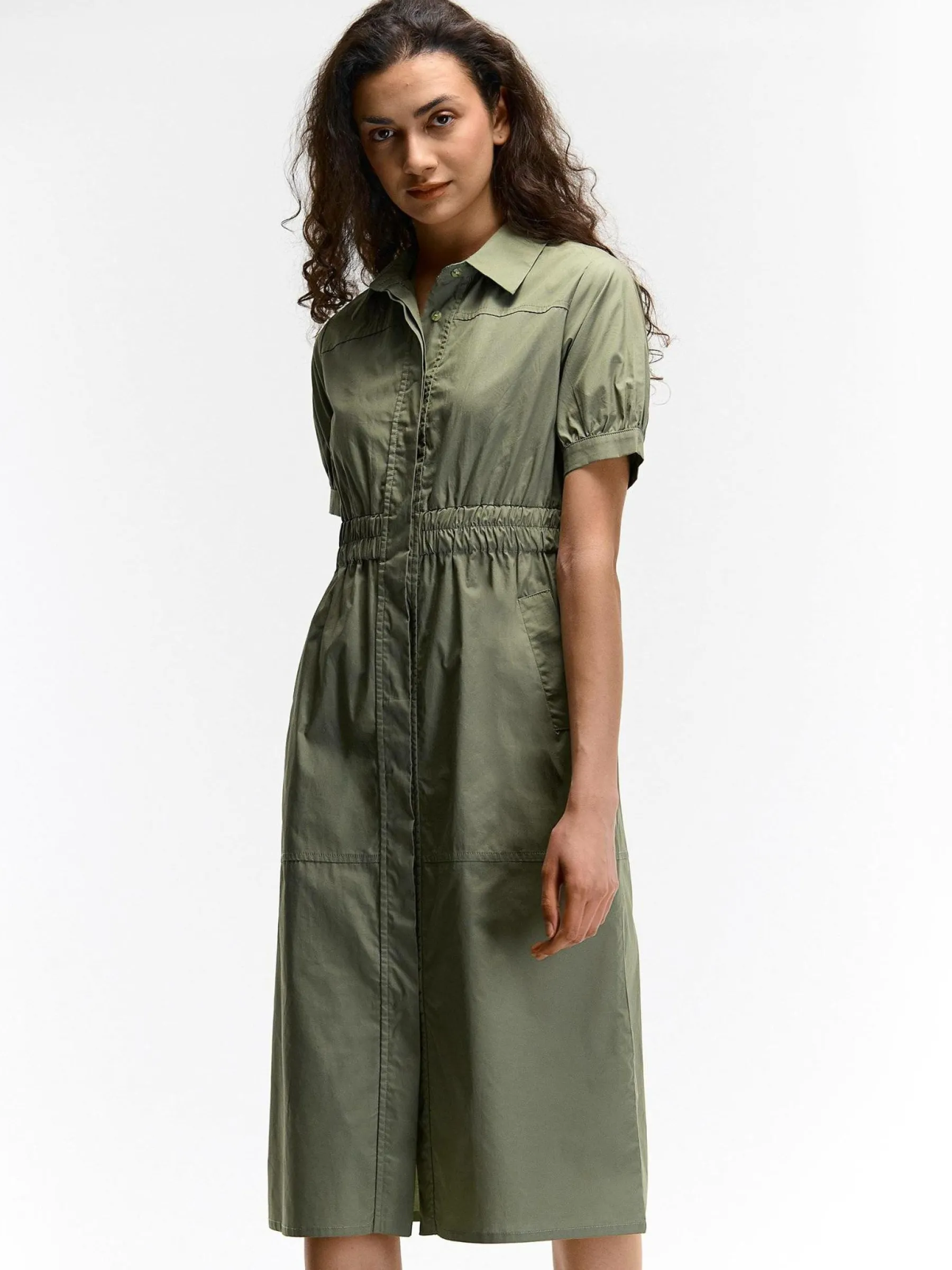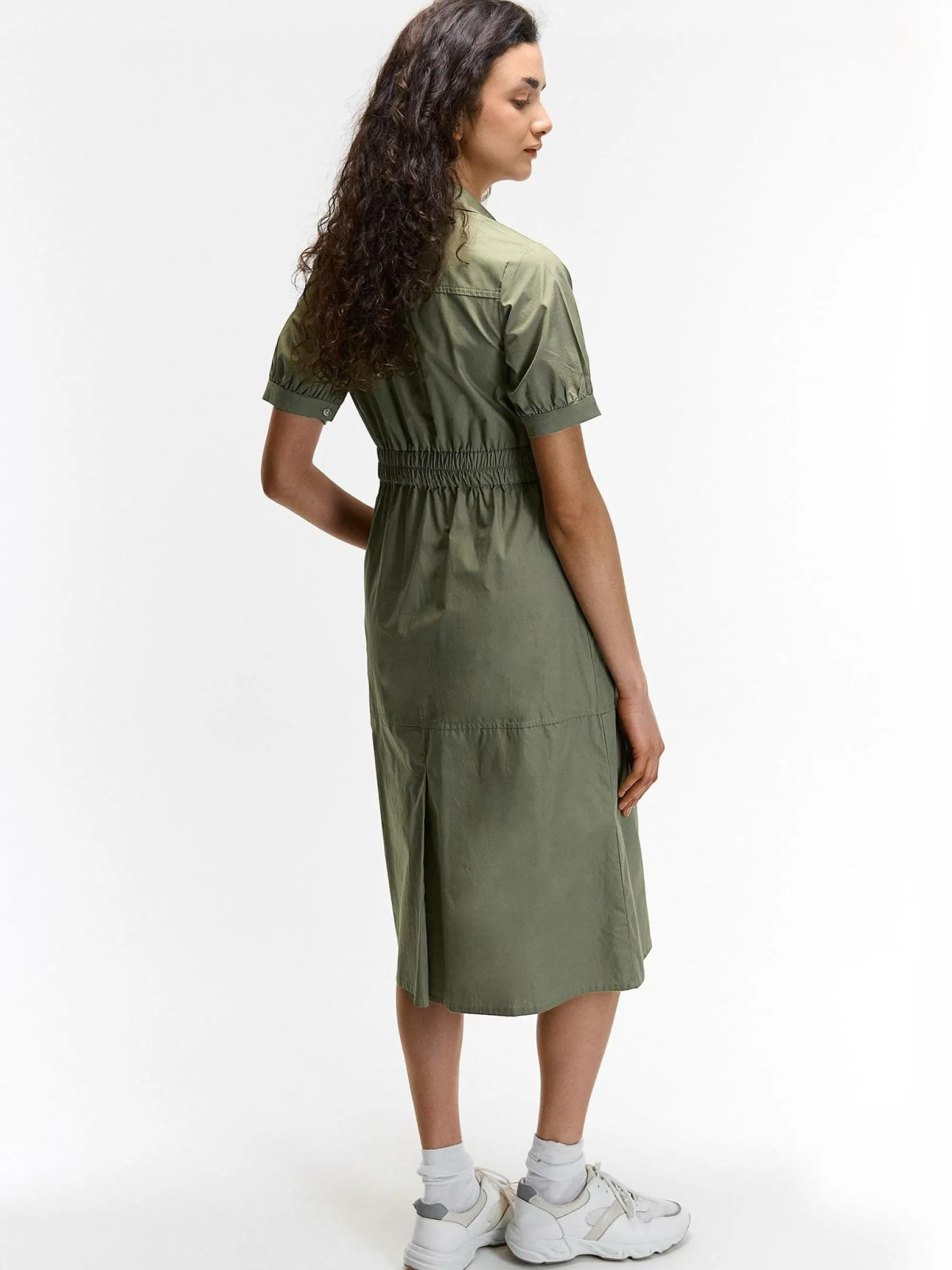 Kolor: khakiKrój: koszuloweTyp: sukienkaRekaw: krótki rękawDługość: midiPattern style: pojedynczy kolorDetal: z fa…