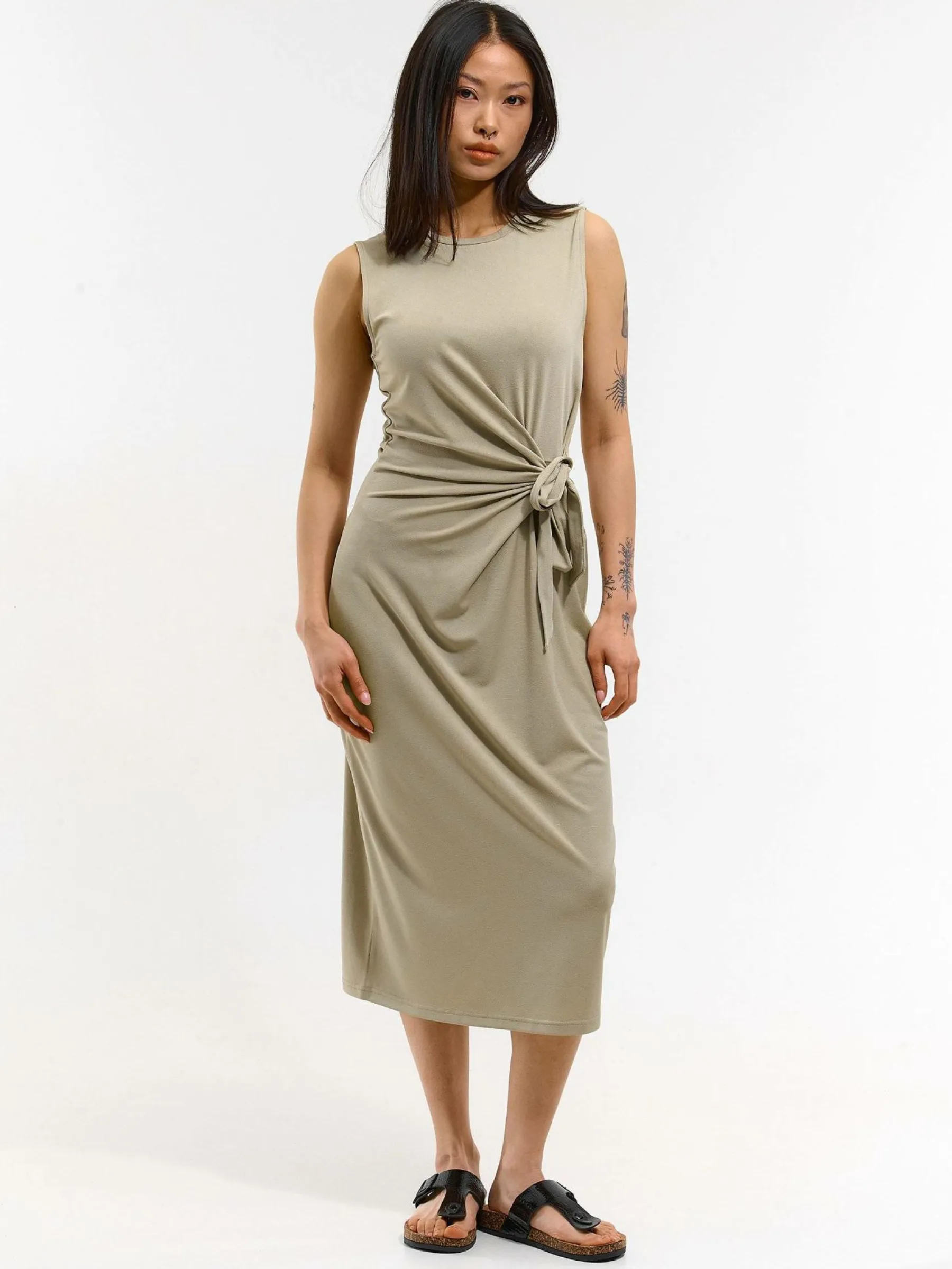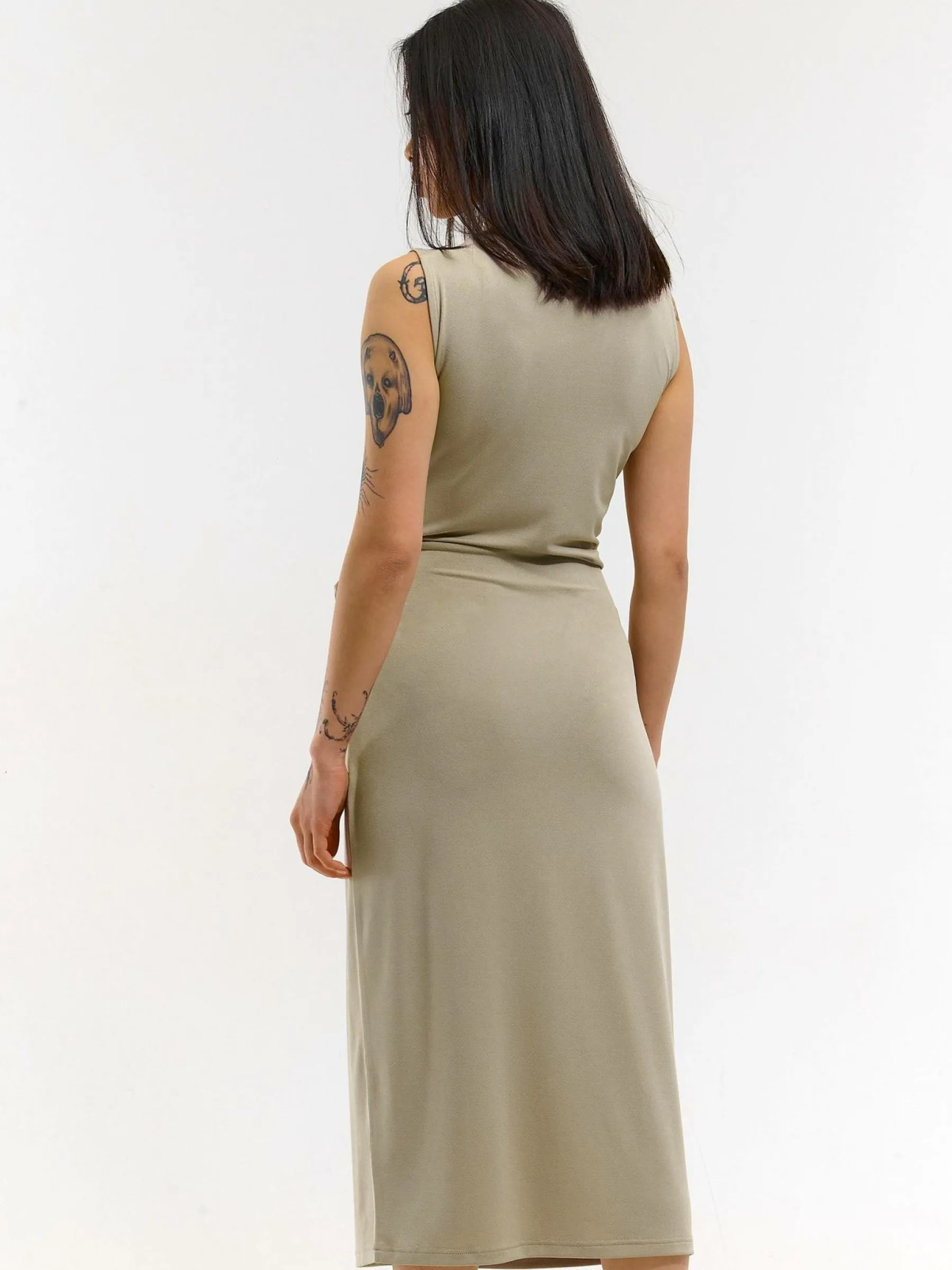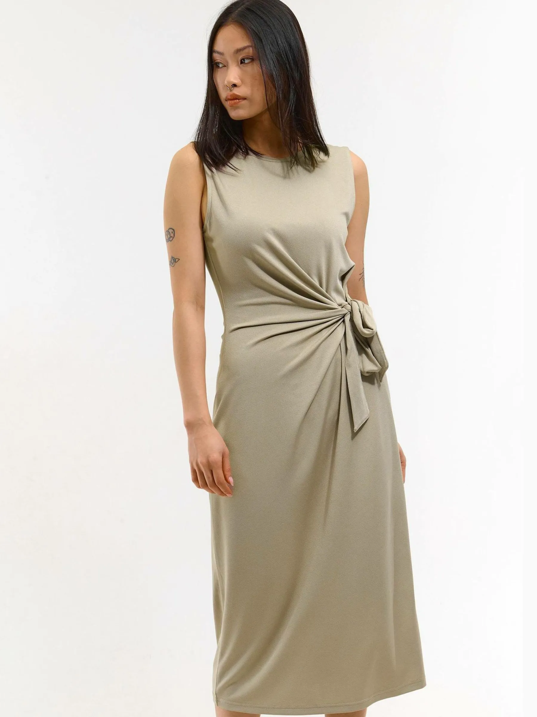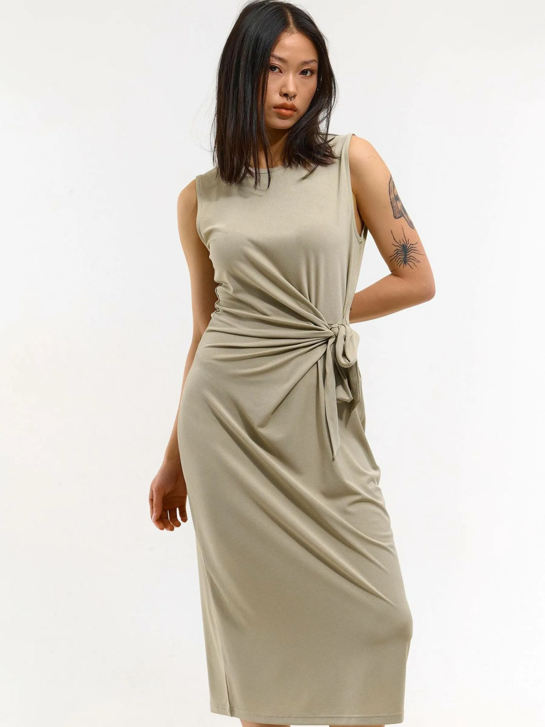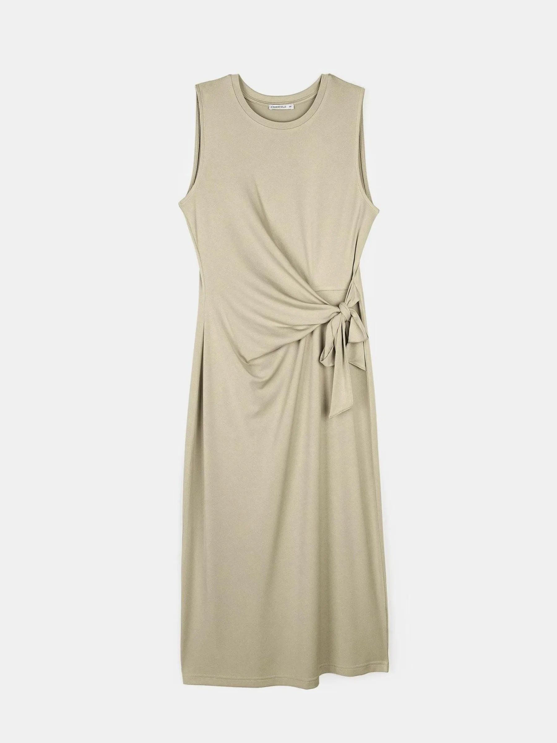Kolor: beżowyKrój: z marszczeniemTyp: sukienkaRekaw: bez rękawówDługość: midiPattern style: pojedynczy kolorDetal…