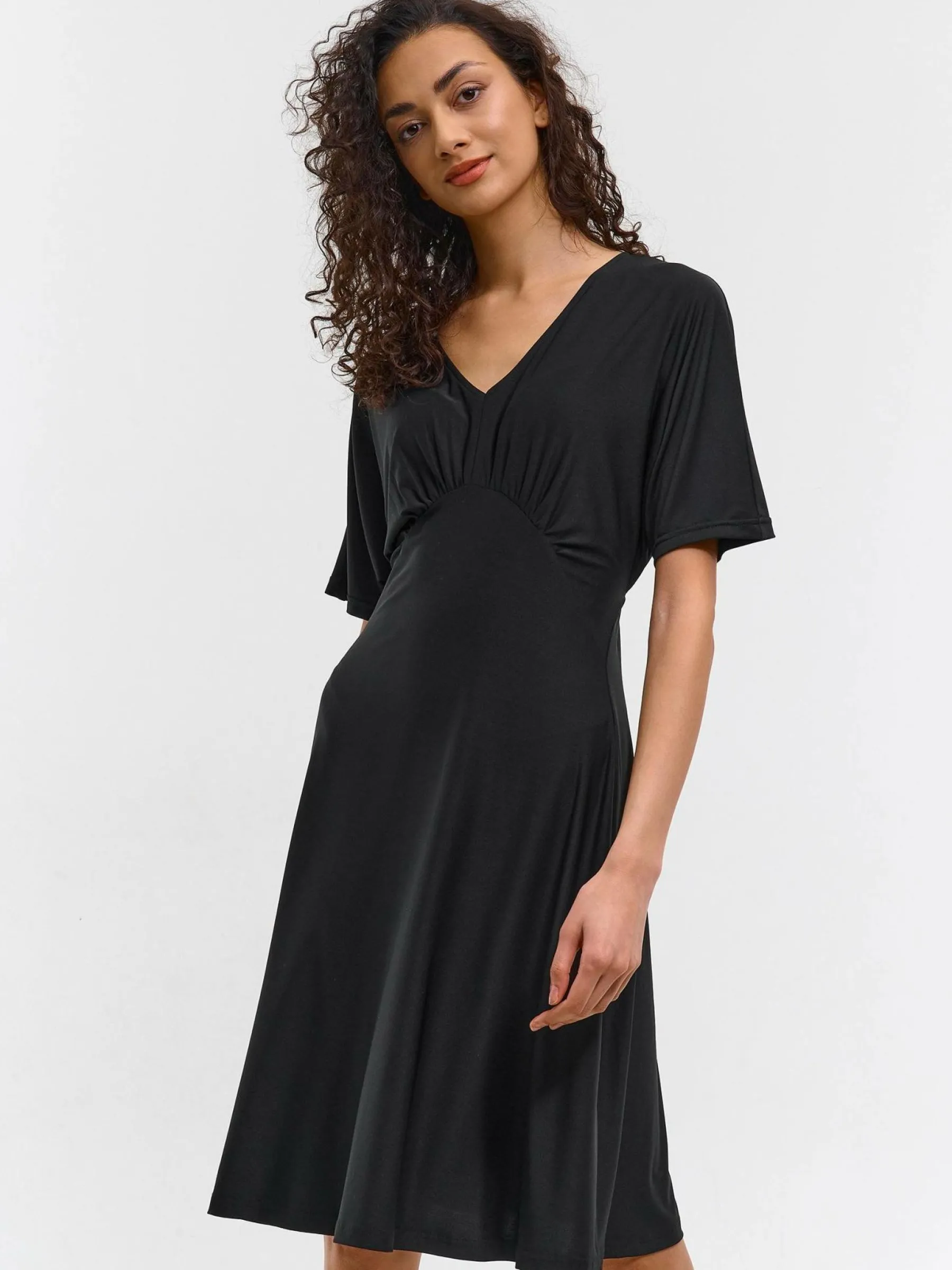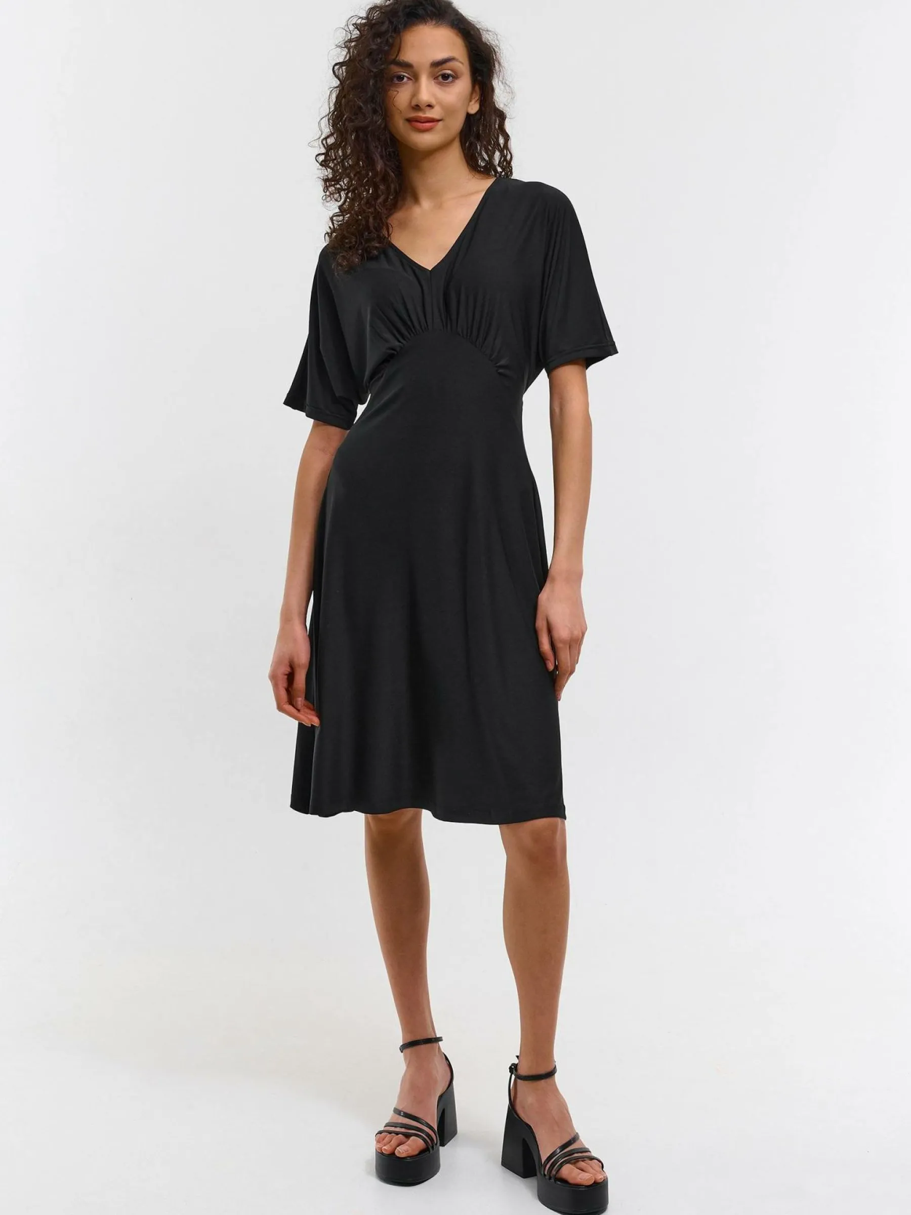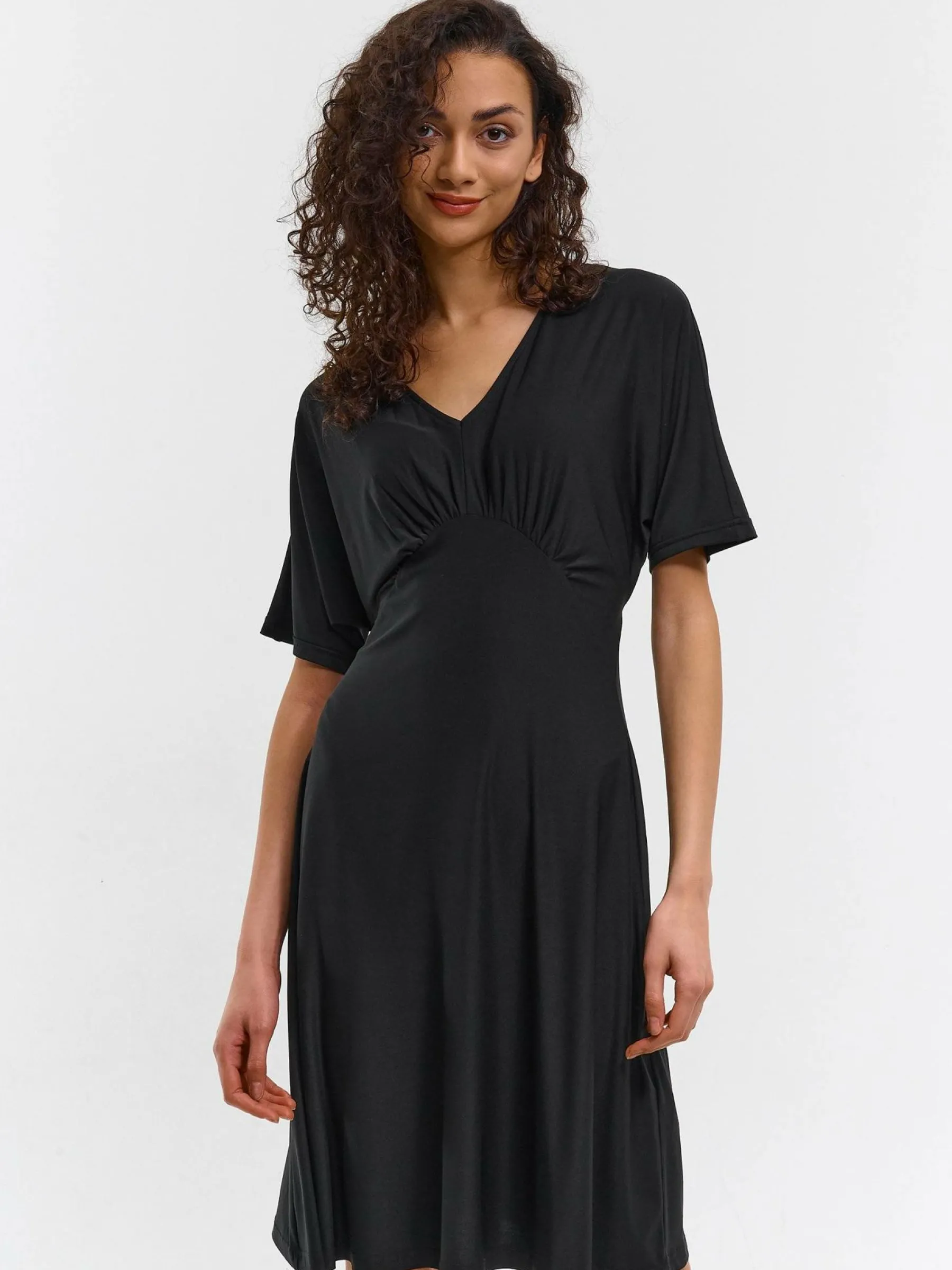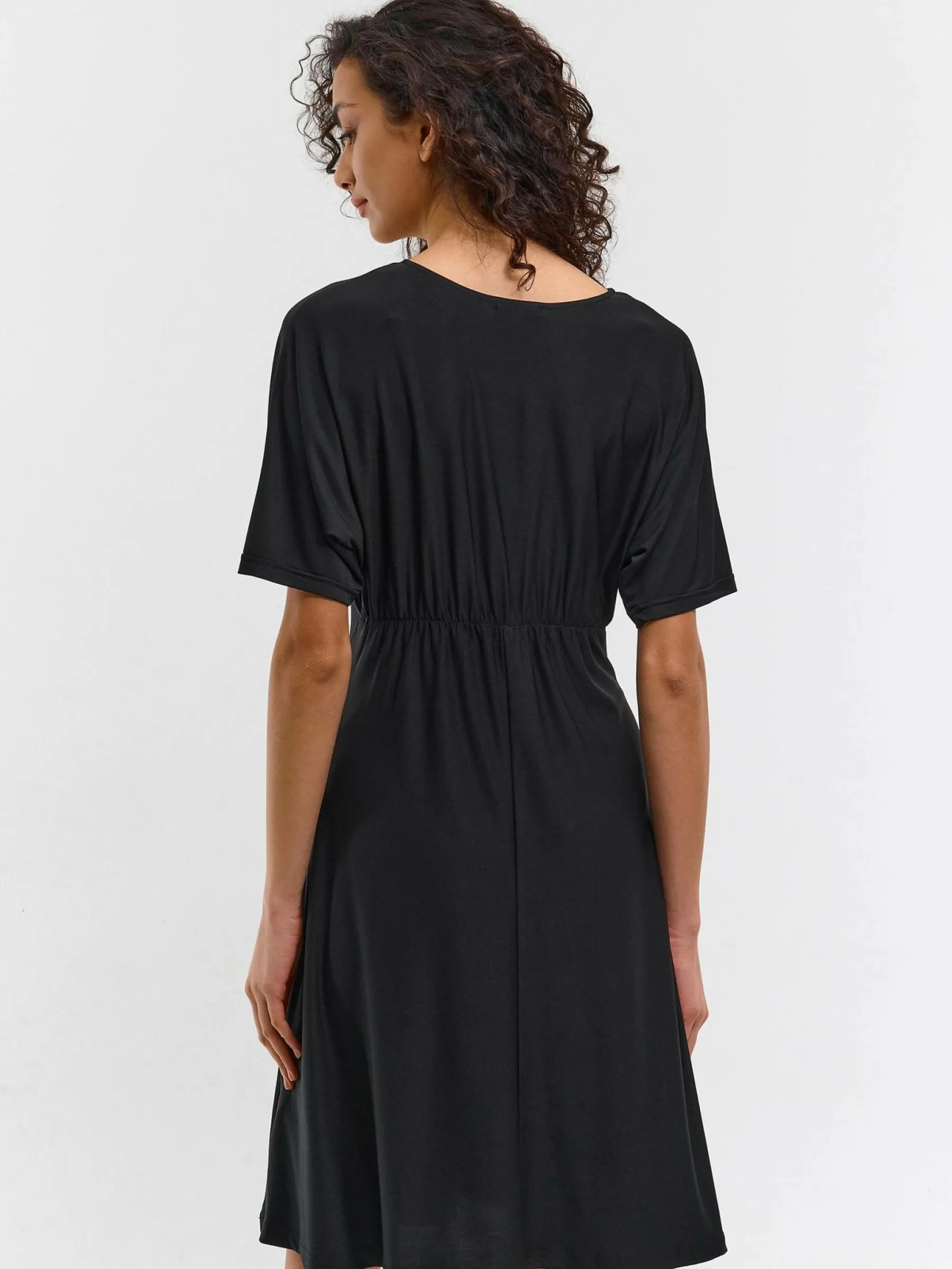 Kolor: czarnyKrój: asyTyp: sukienkaRekaw: krótki rękawDługość: miniPattern style: pojedynczy kolorMateriał: synte…