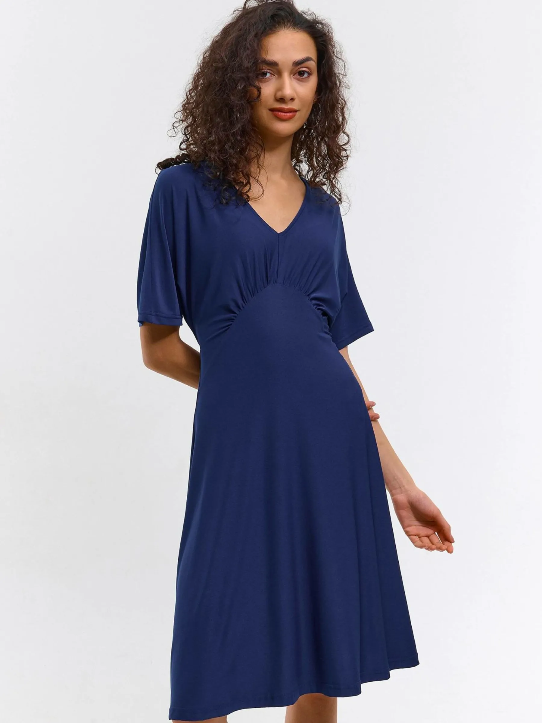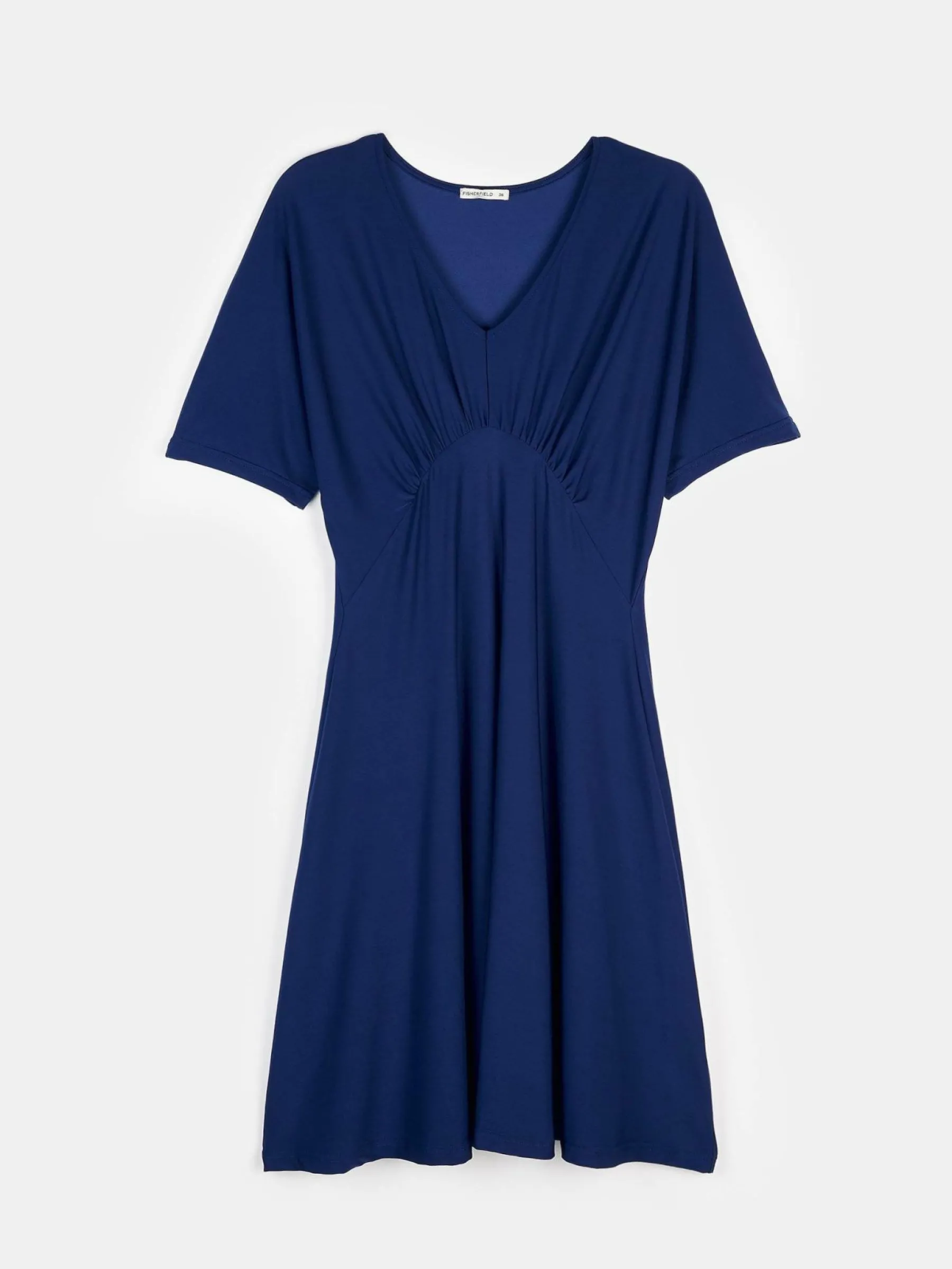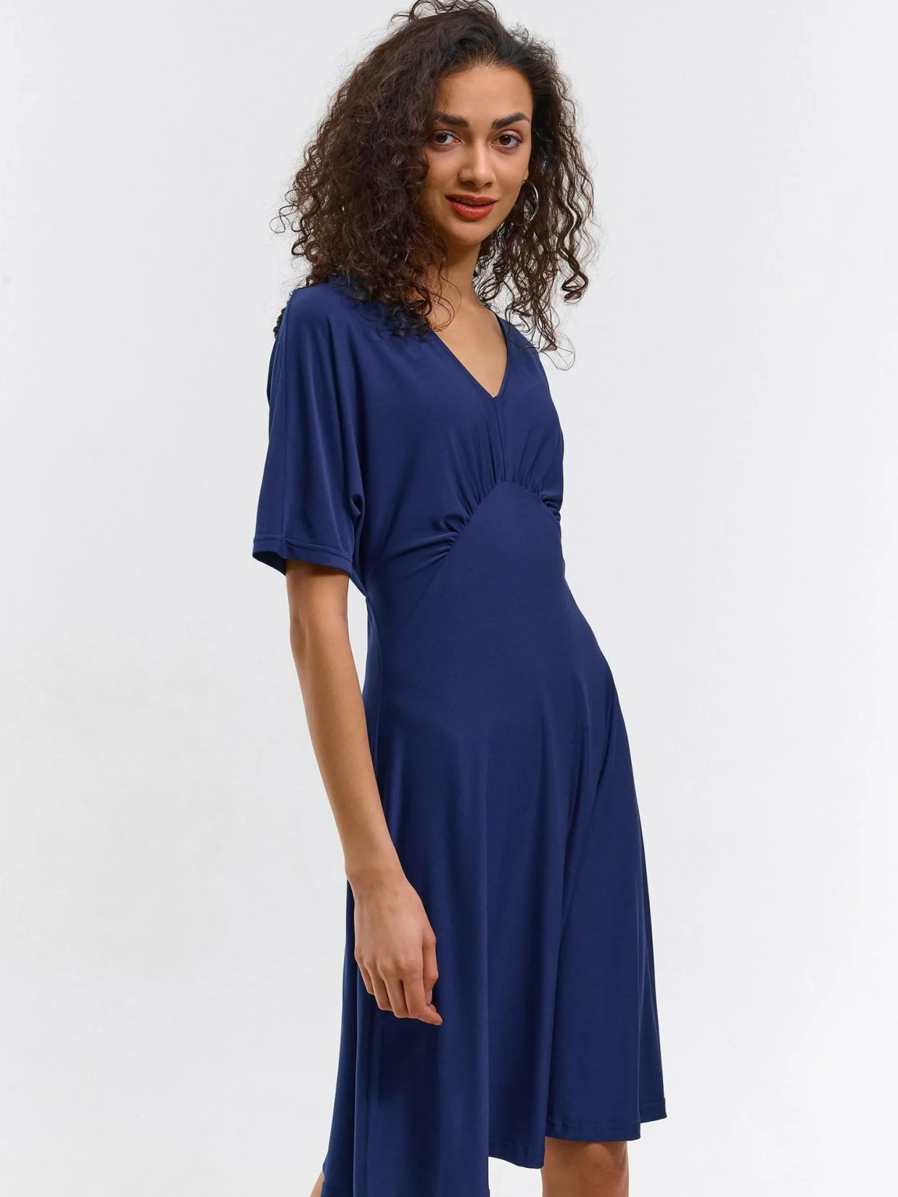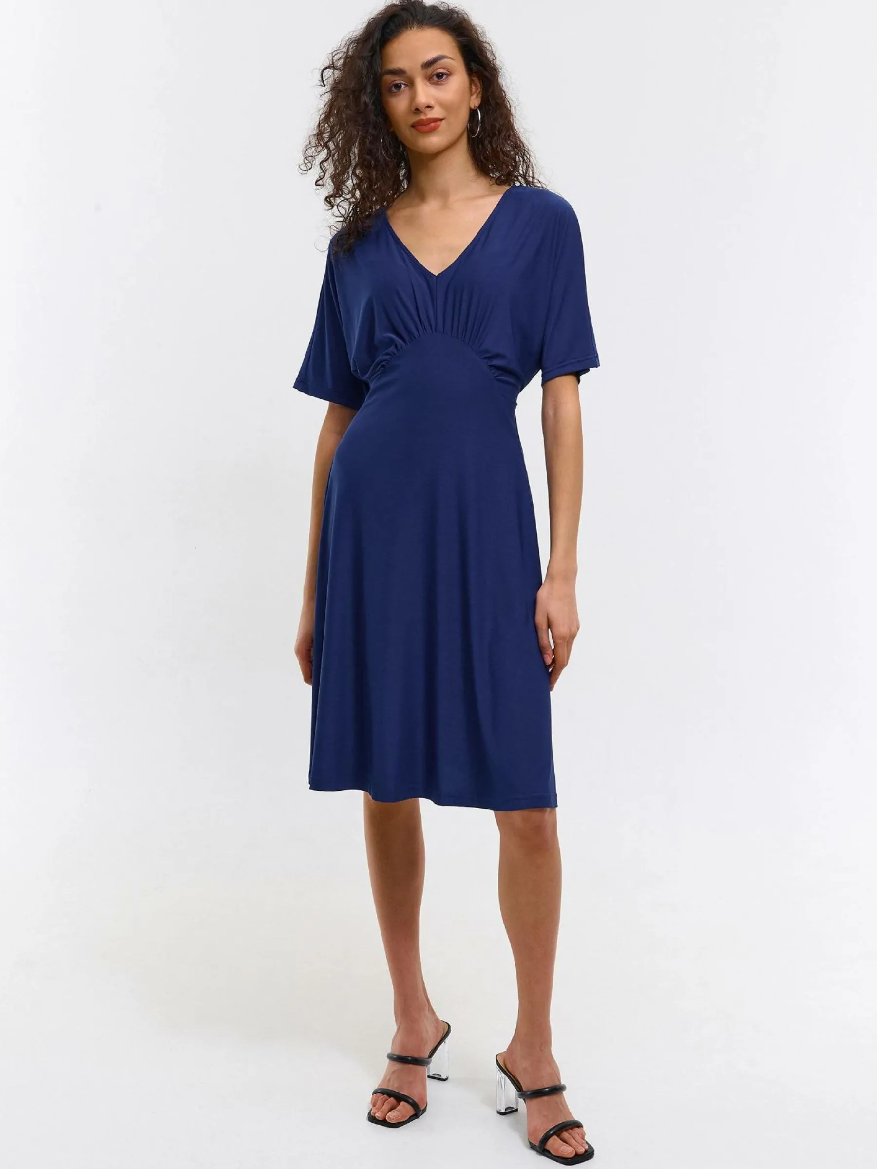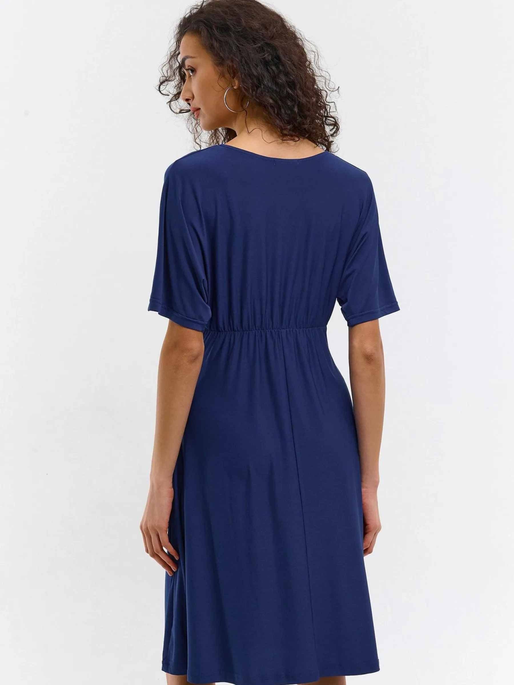 Kolor: granatowyKrój: z marszczeniemTyp: sukienkaRekaw: krótki rękawDługość: miniPattern style: pojedynczy kolorDe…