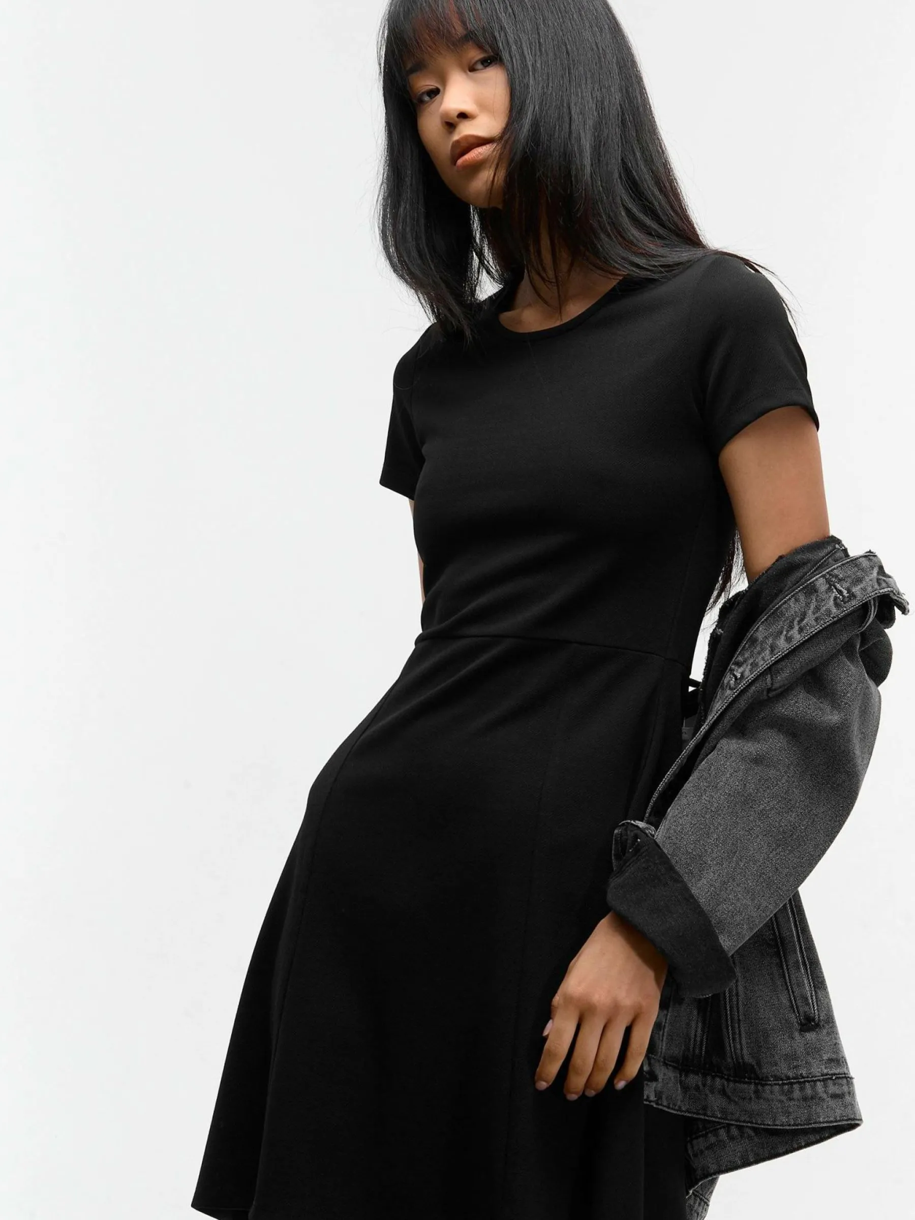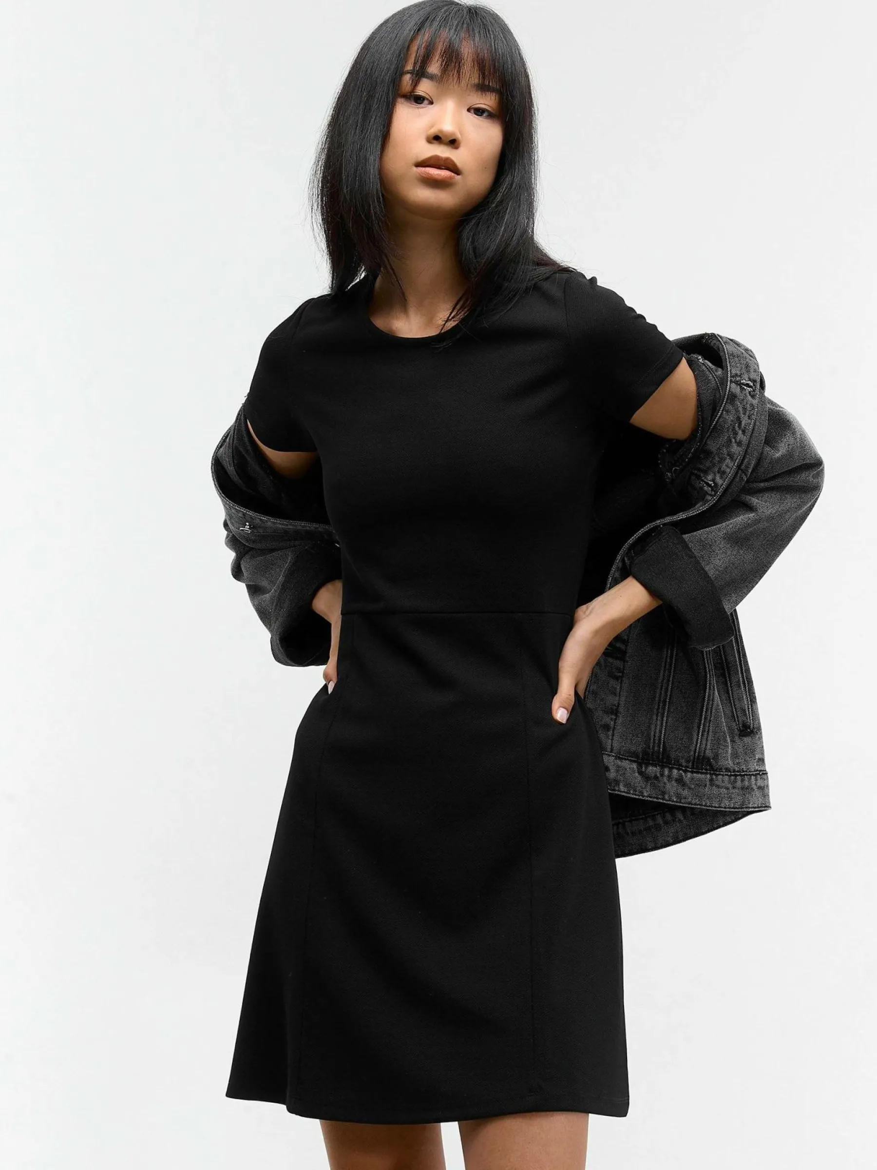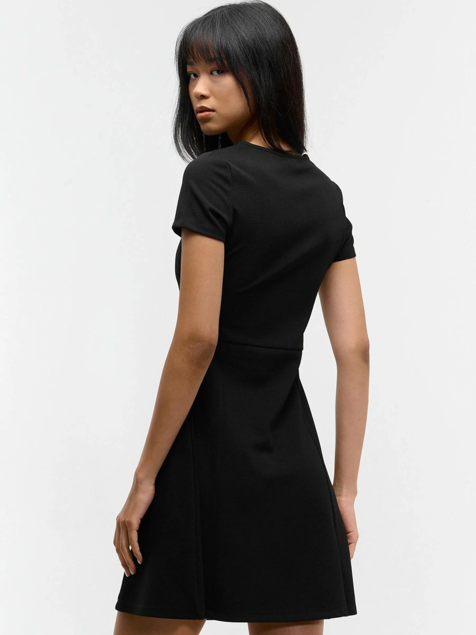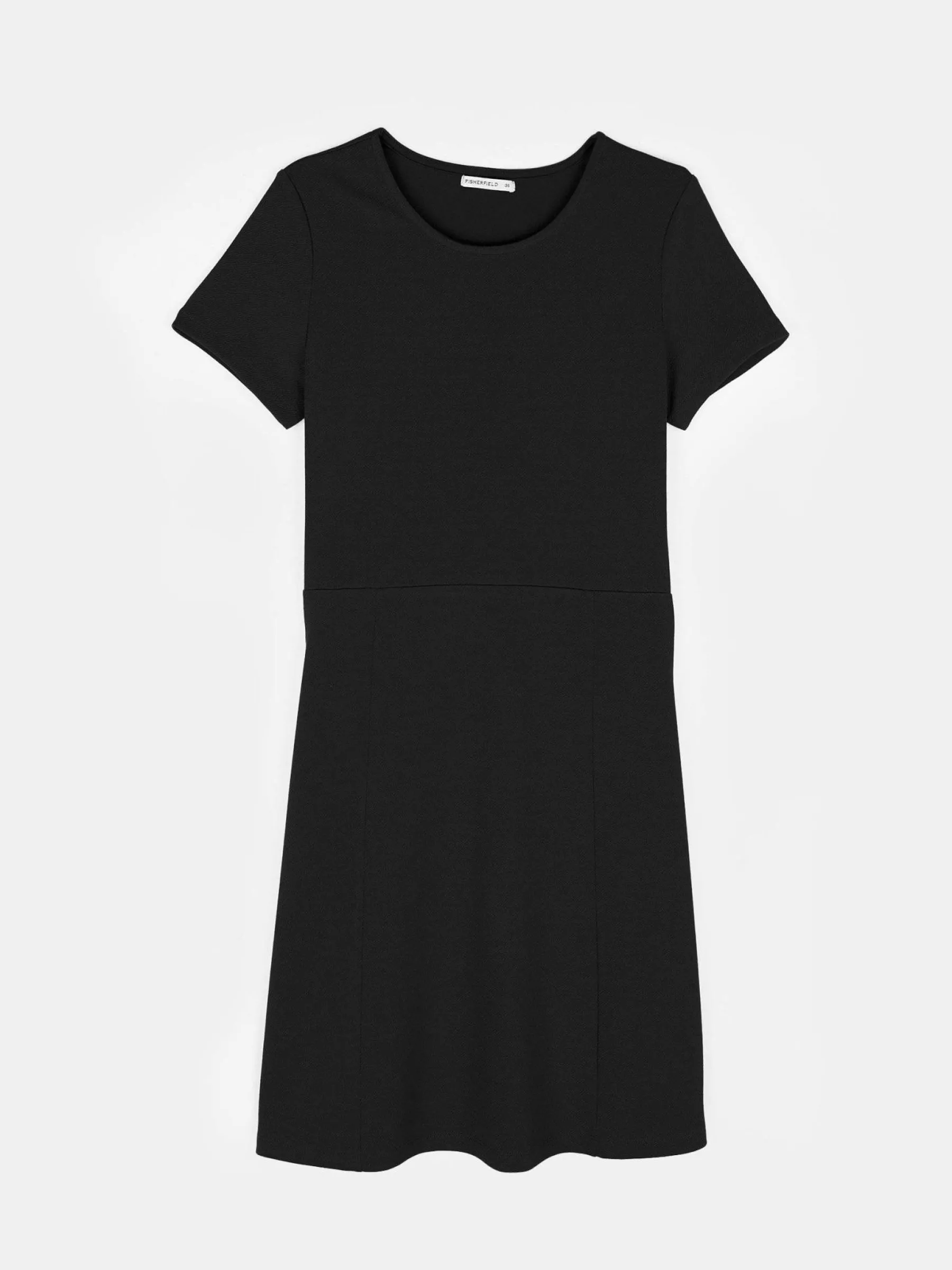 Kolor: czarnyKrój: regularTyp: sukienkaRekaw: krótki rękawDługość: miniPattern style: pojedynczy kolorDetal: nad g…