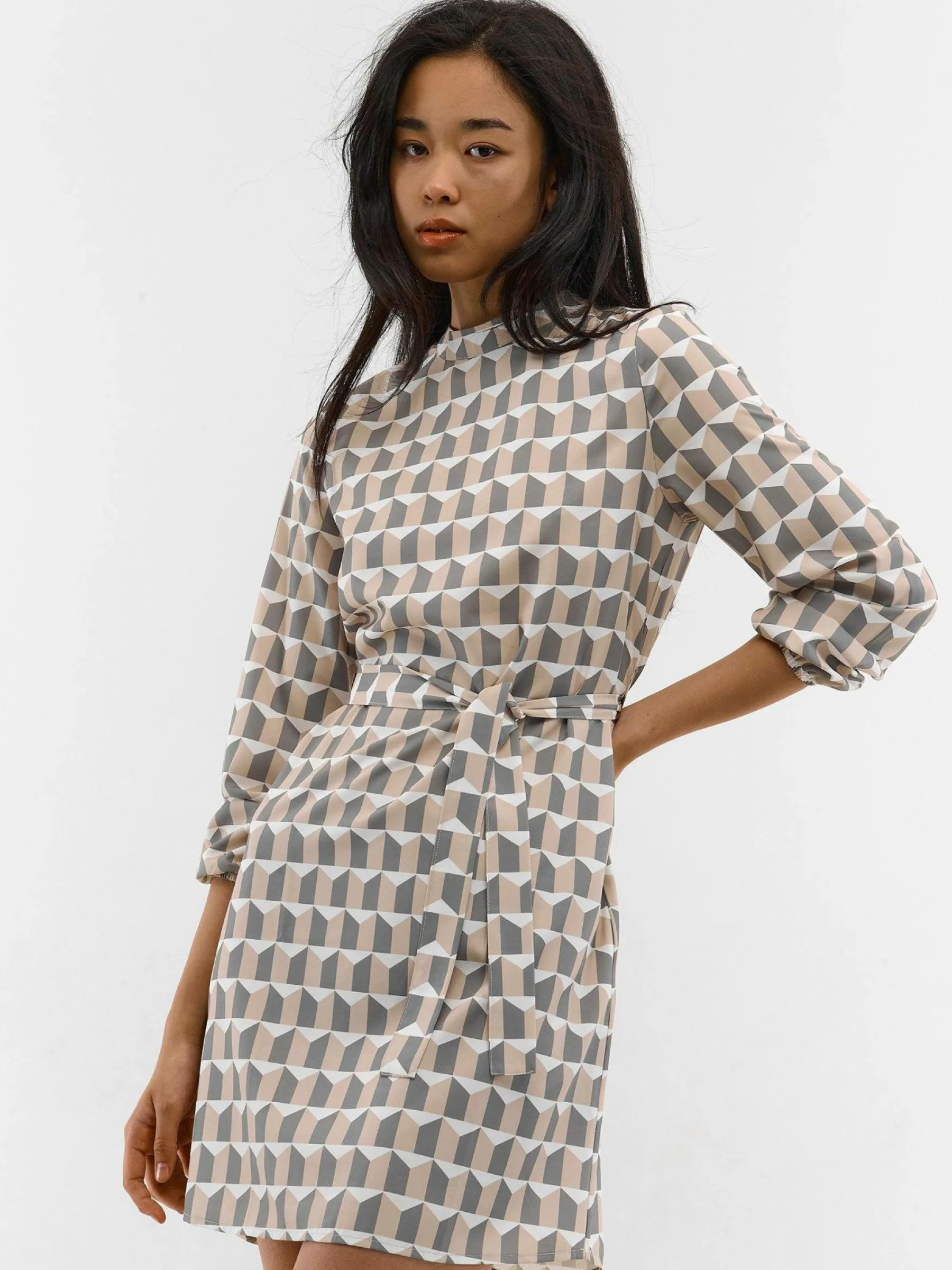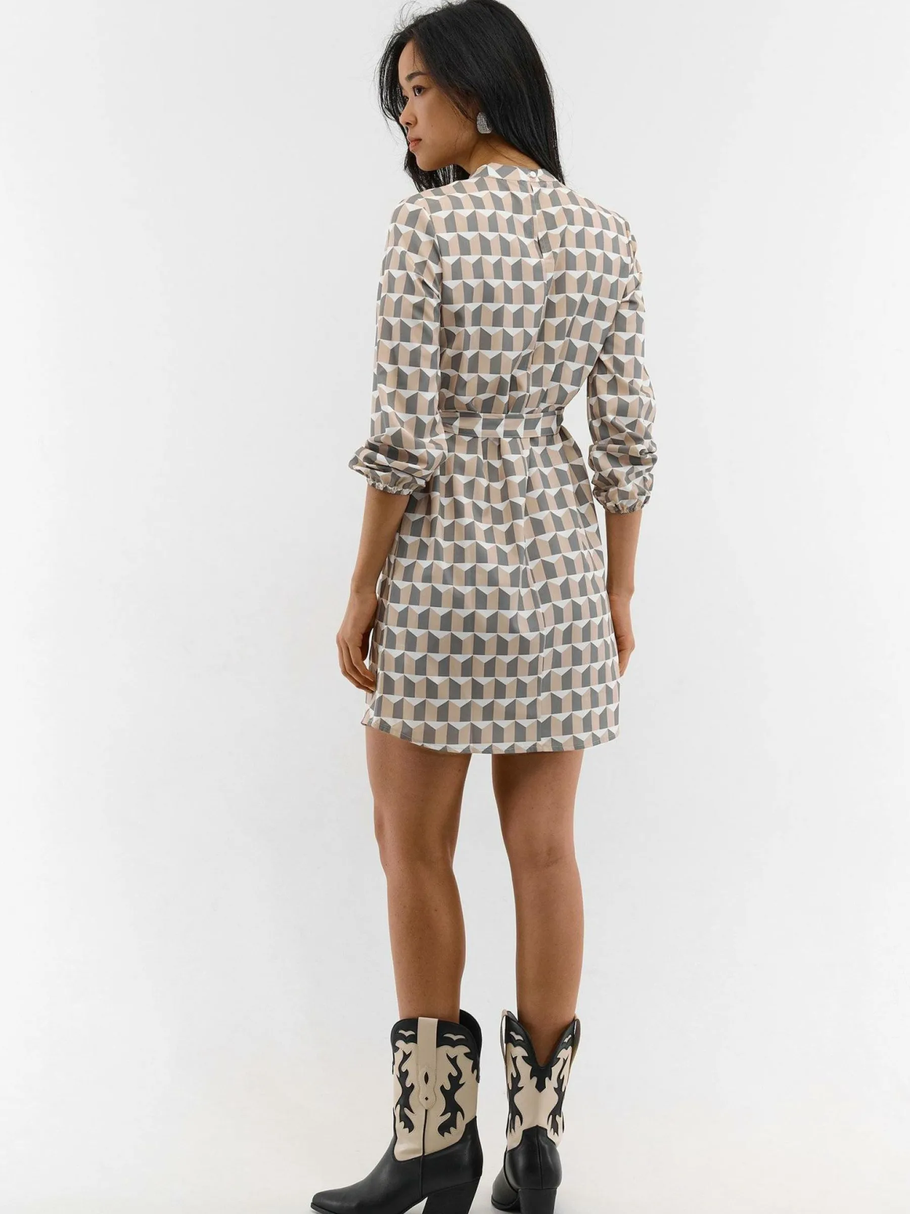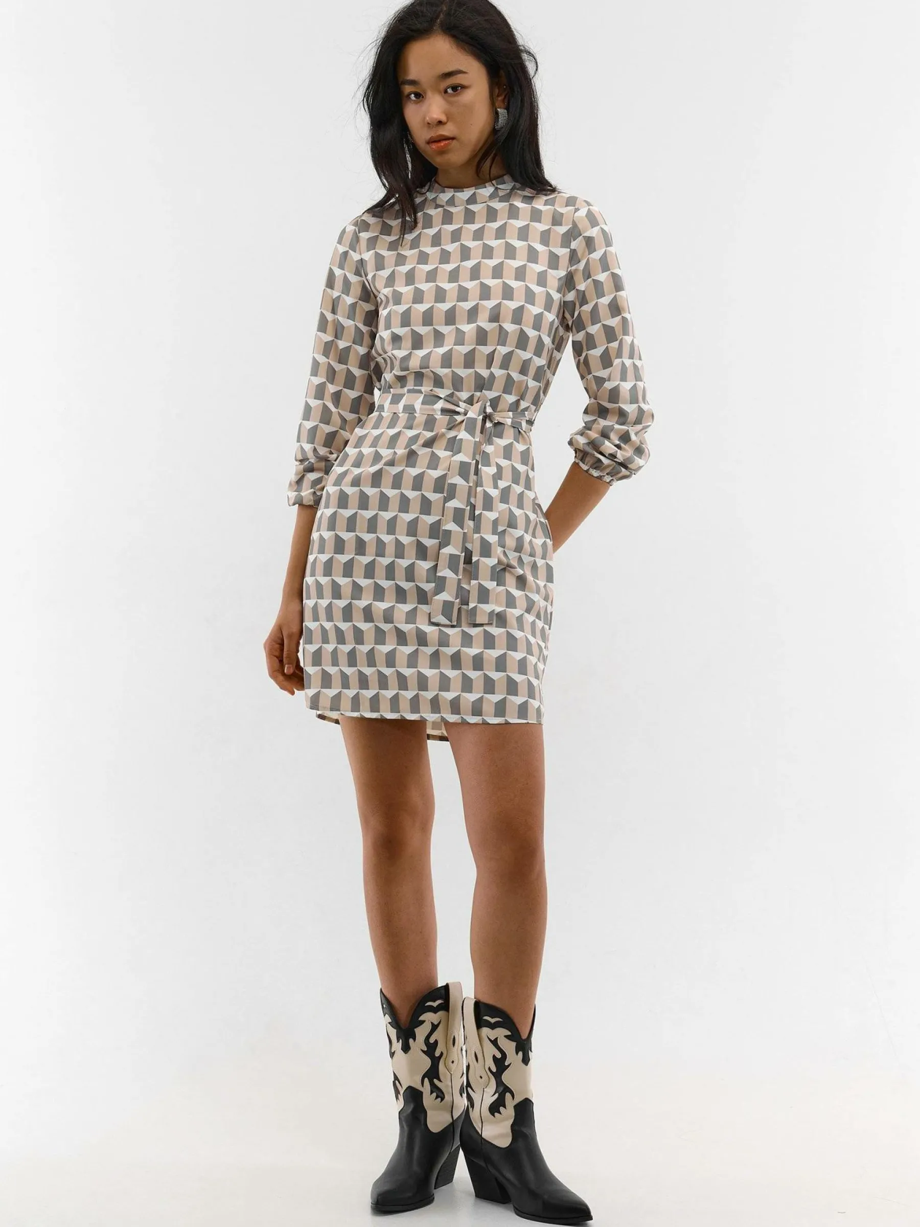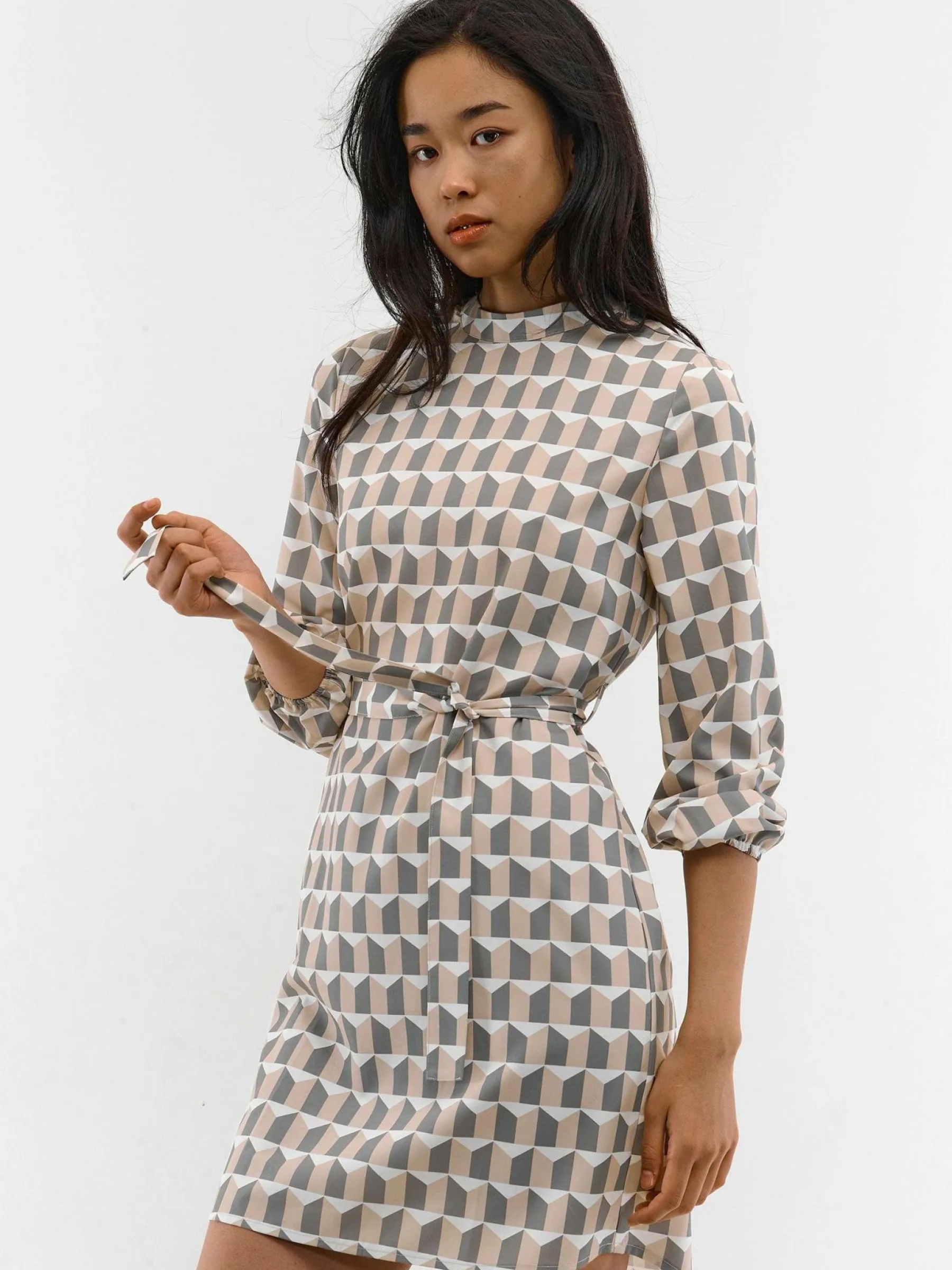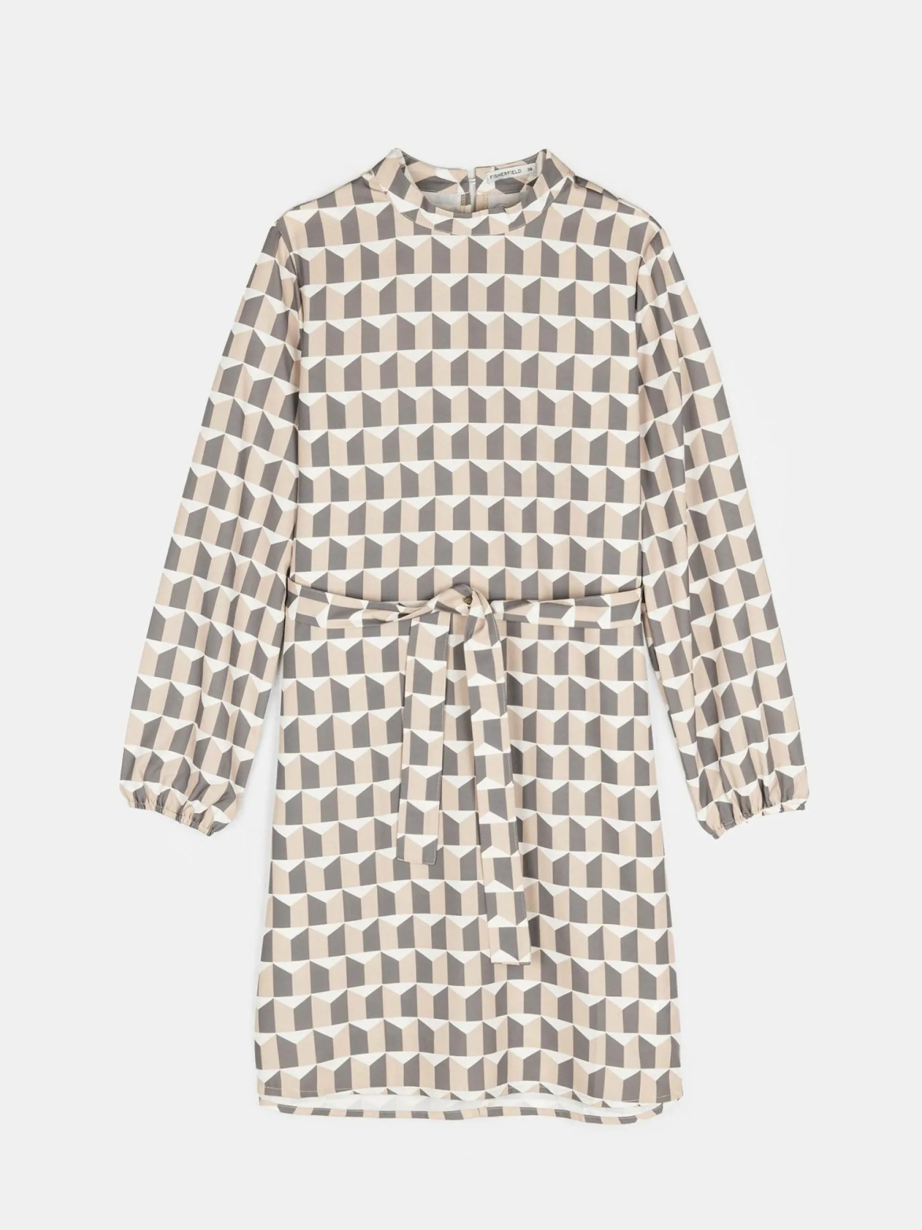 Kolor: beżowyKrój: regularTyp: sukienkaRekaw: rękaw 3/4Długość: miniPattern style: wzorzysteDetal: z paskiem, nad …