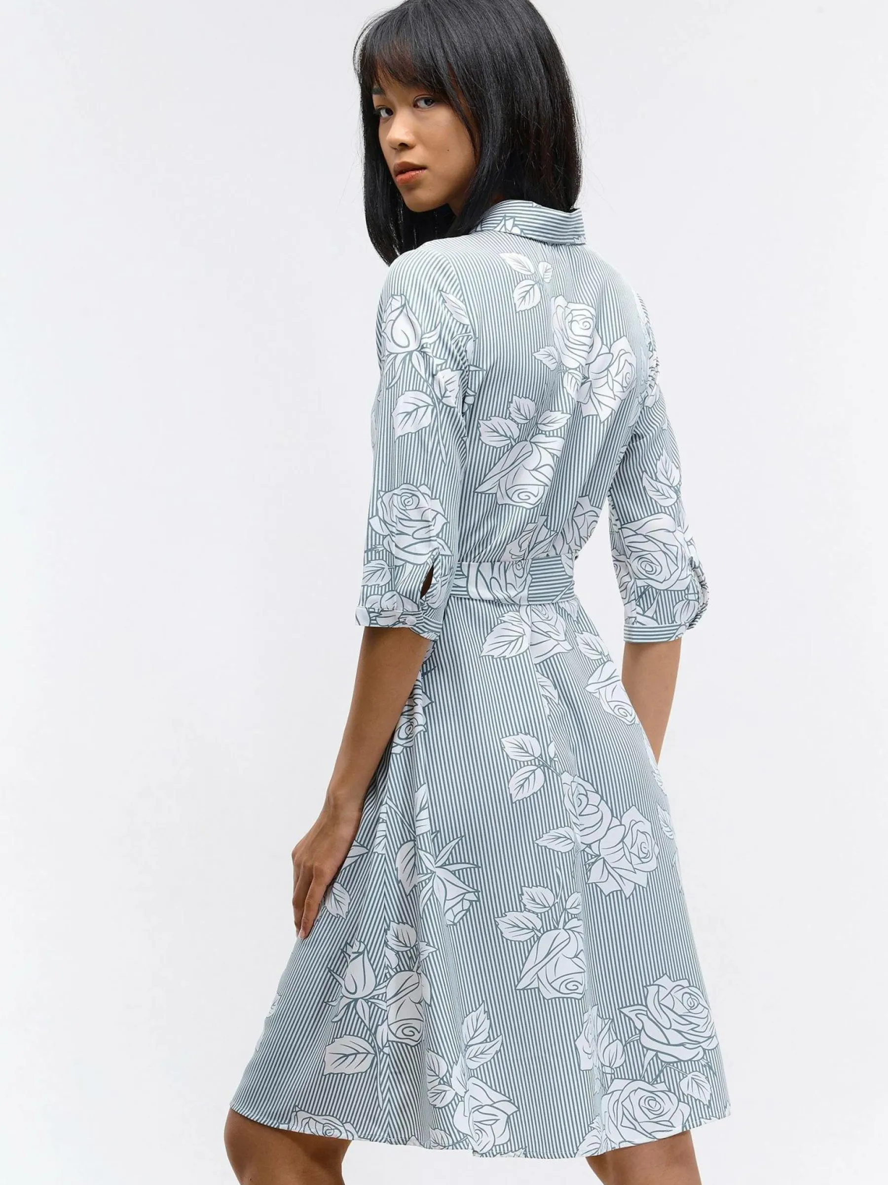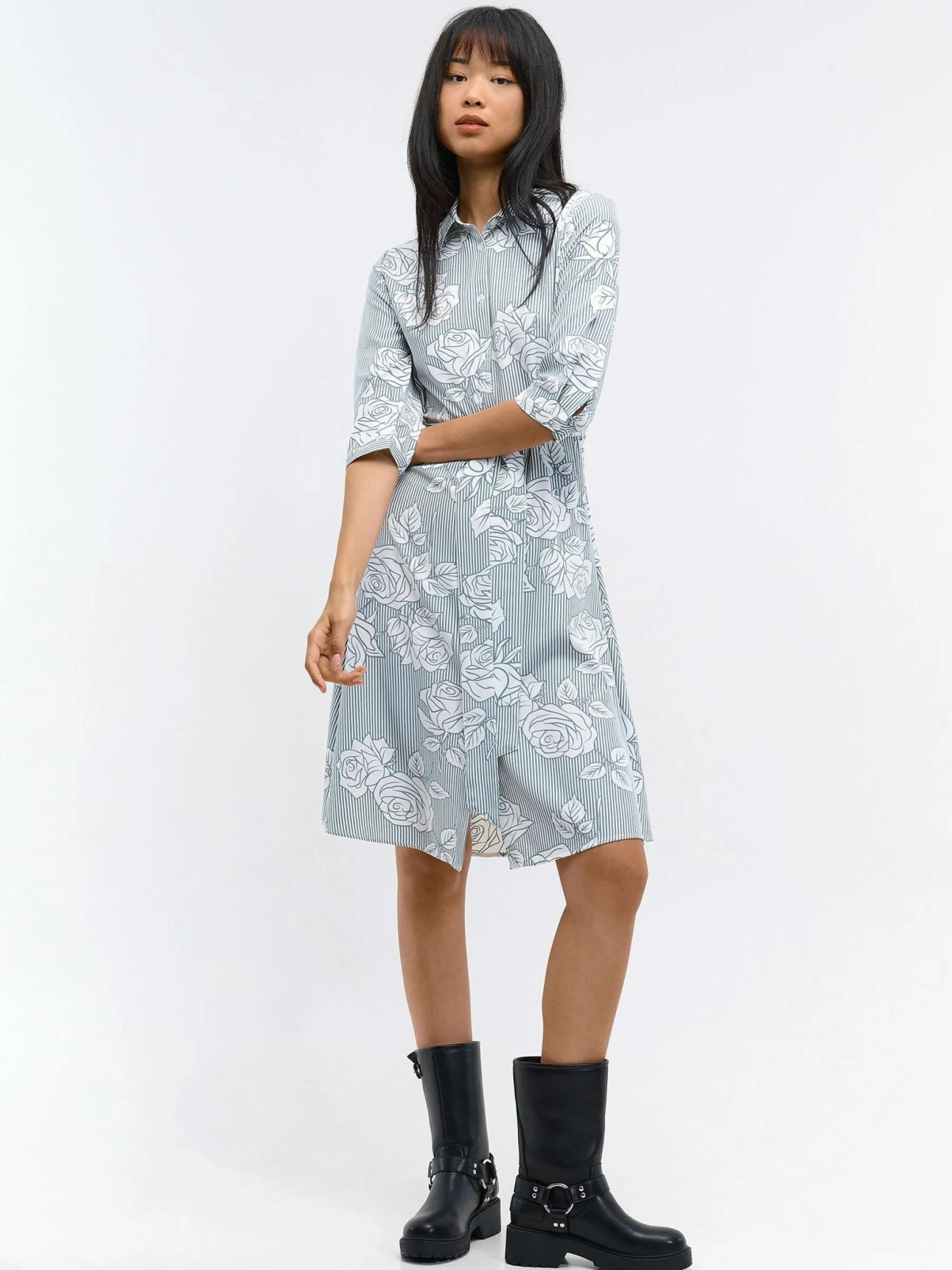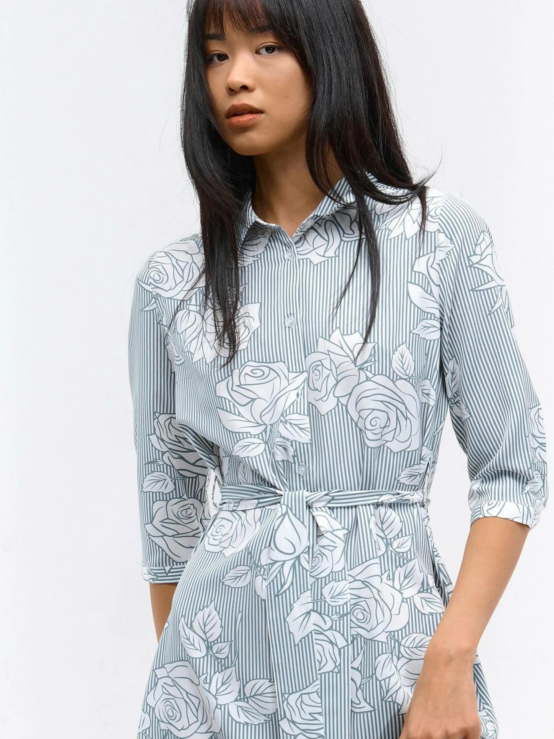 Kolor: szaryKrój: koszuloweTyp: sukienkaRekaw: rękaw 3/4Długość: miniPattern style: kwiatowe, w prążkiDetal: z pa…