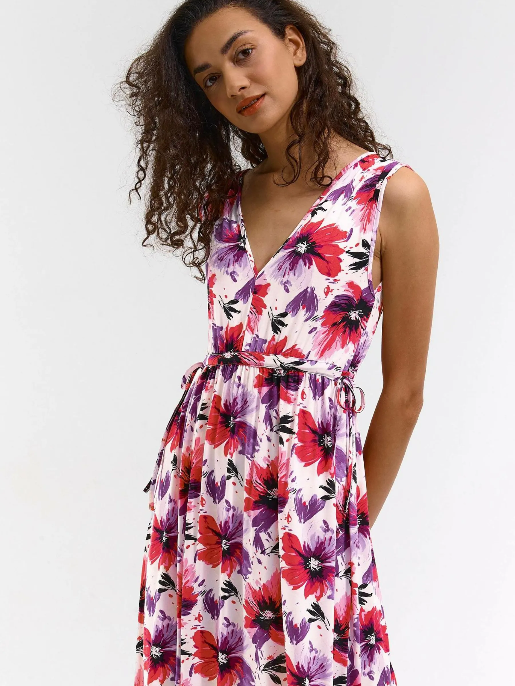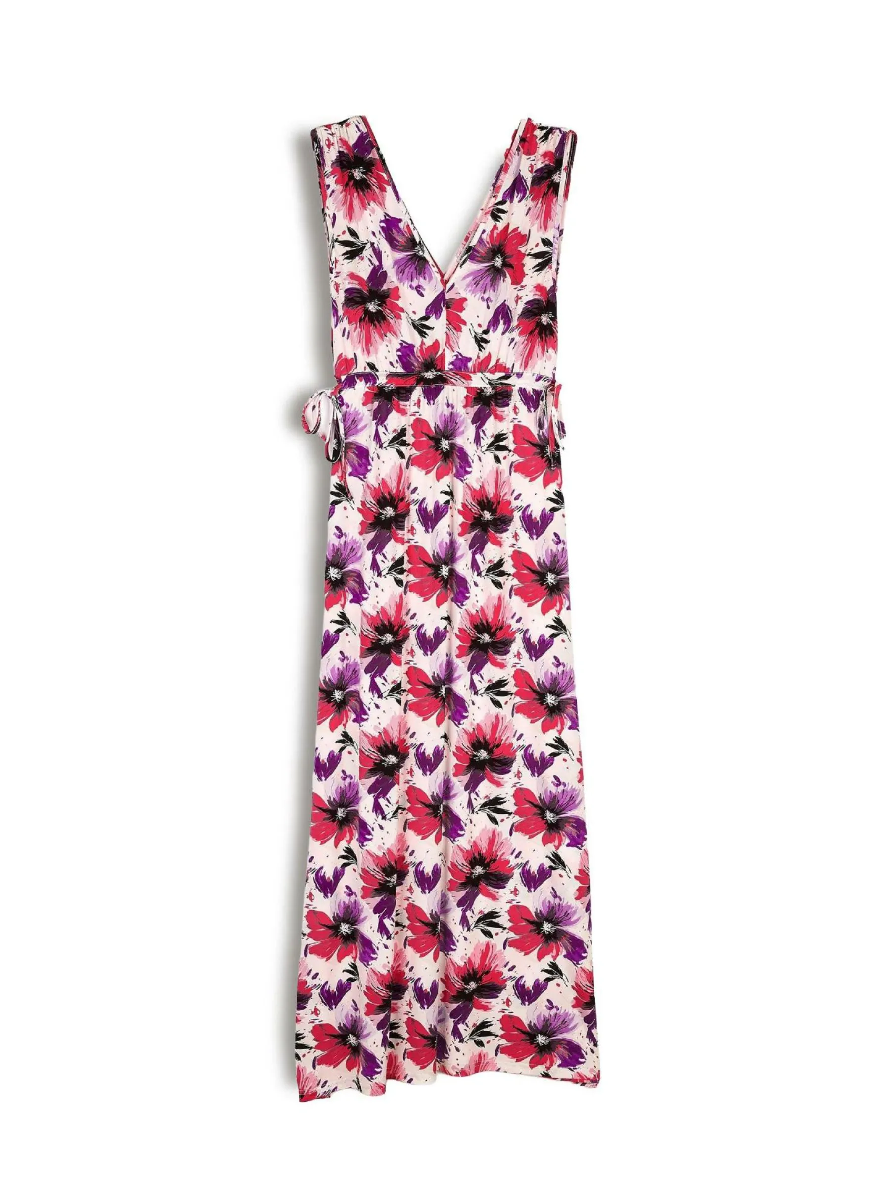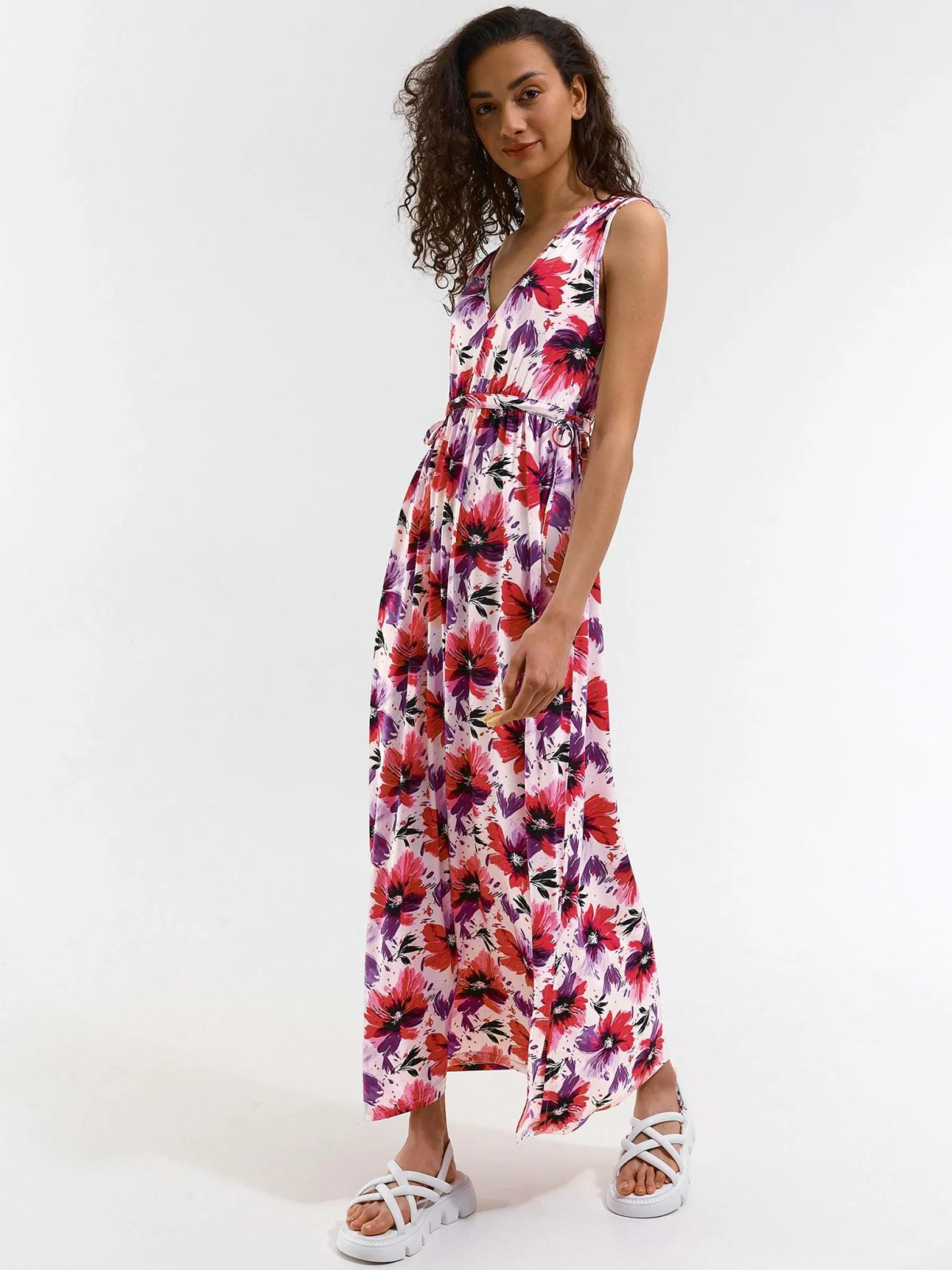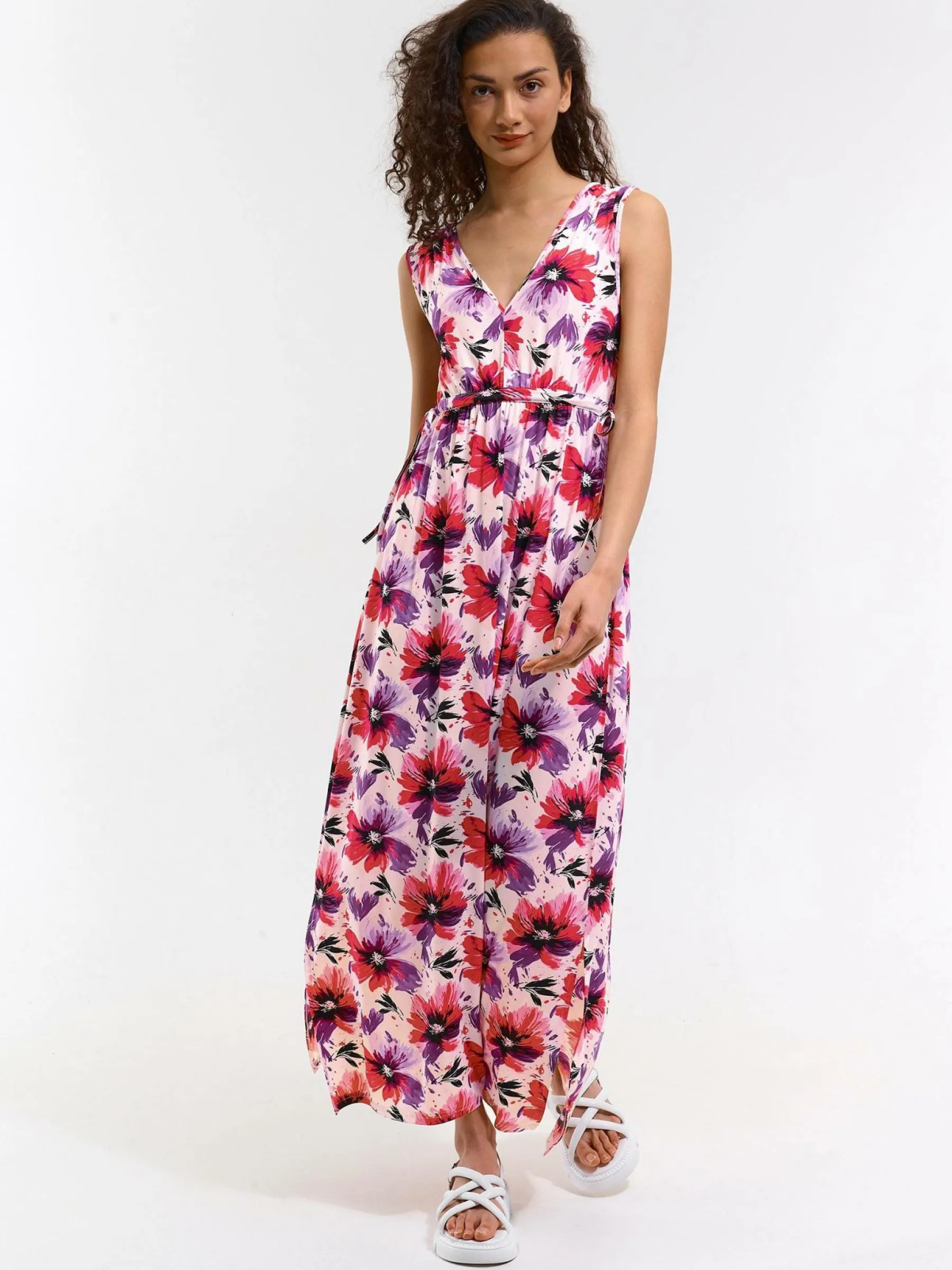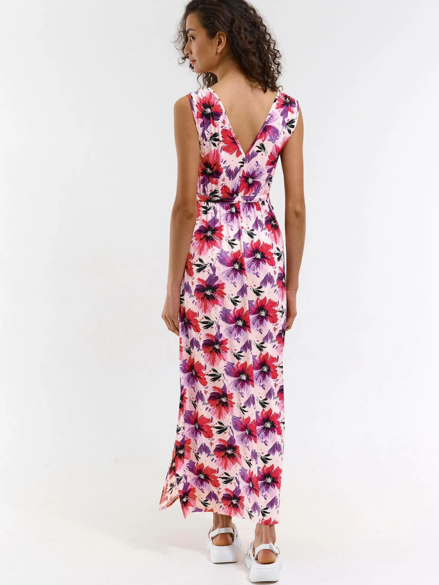 Kolor: różowyKrój: z marszczeniemTyp: sukienkaRekaw: bez rękawówDługość: maxiPattern style: kwiatoweDetal: v-nec…