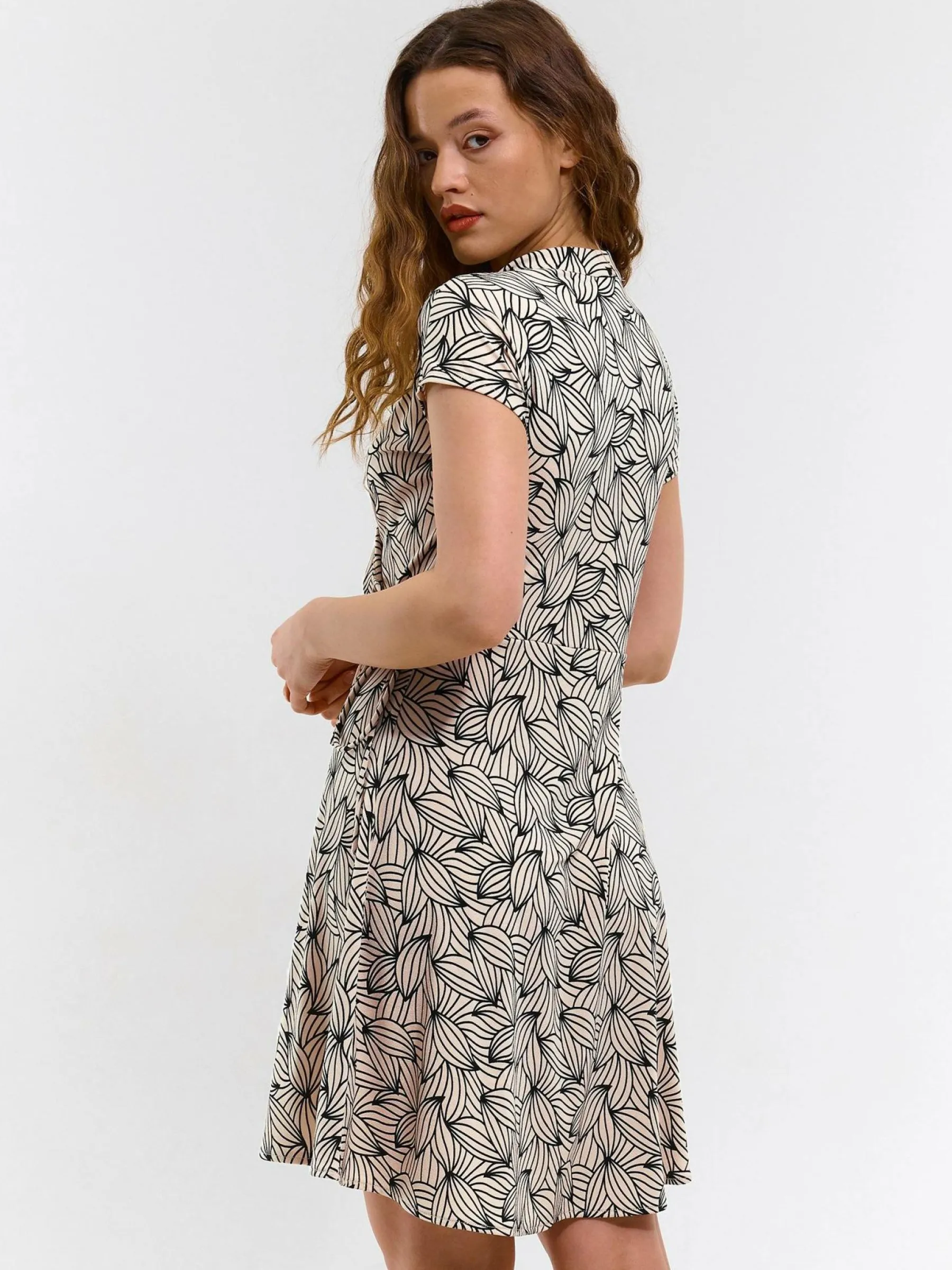 Kolor: beżowyKrój: kopertówkiTyp: sukienkaRekaw: krótki rękawDługość: miniPattern style: z nadrukiemMateriał: s…
