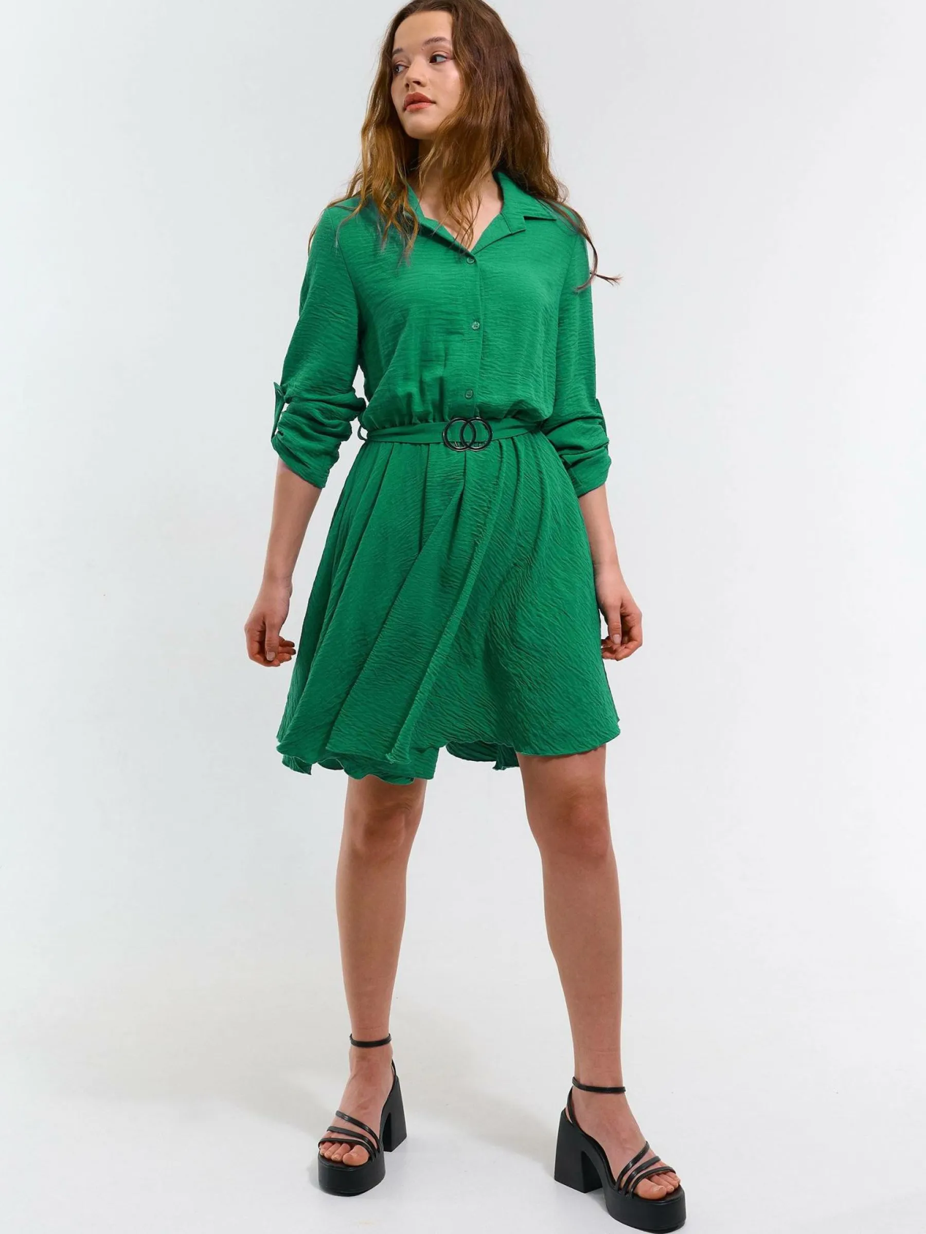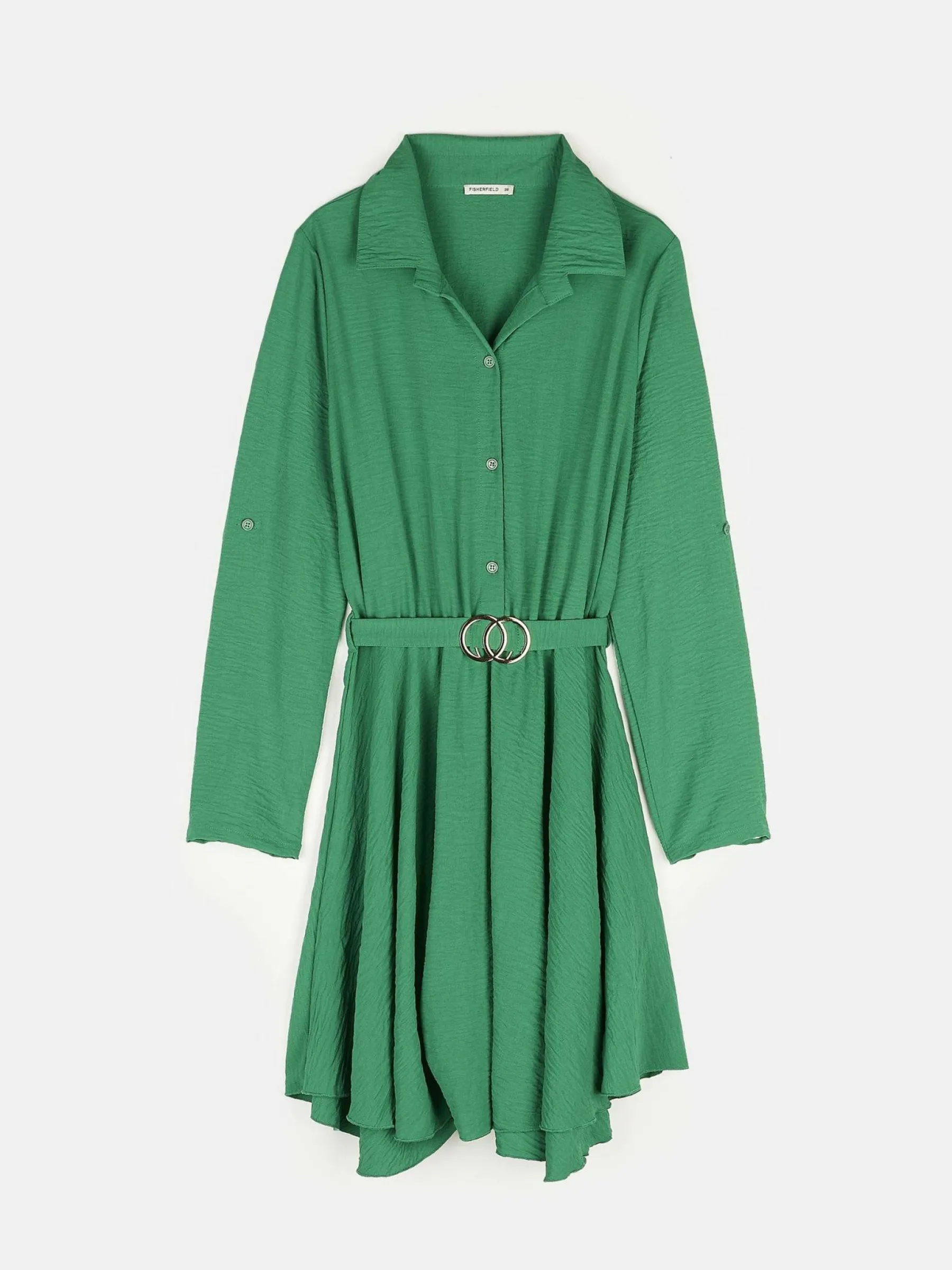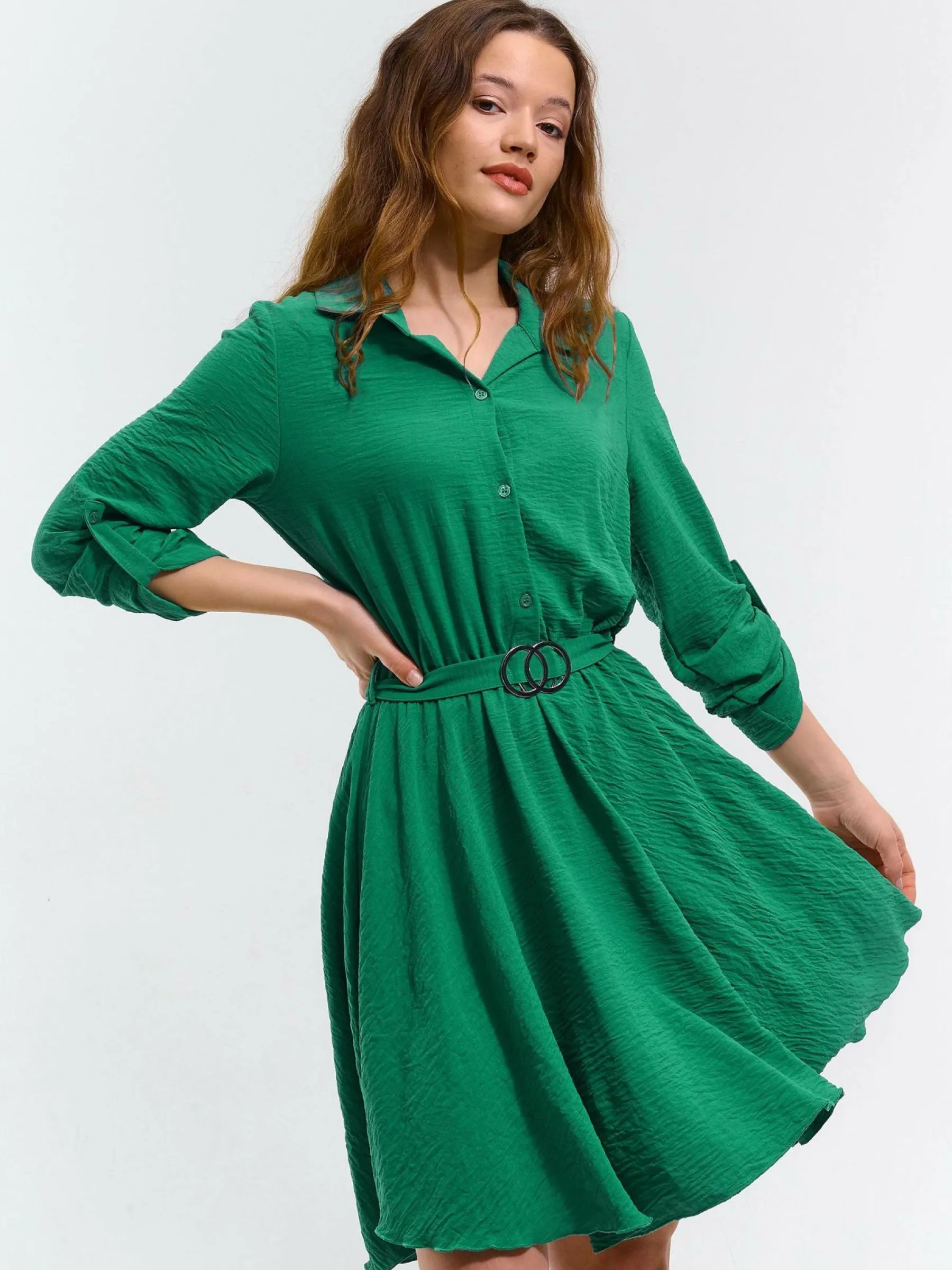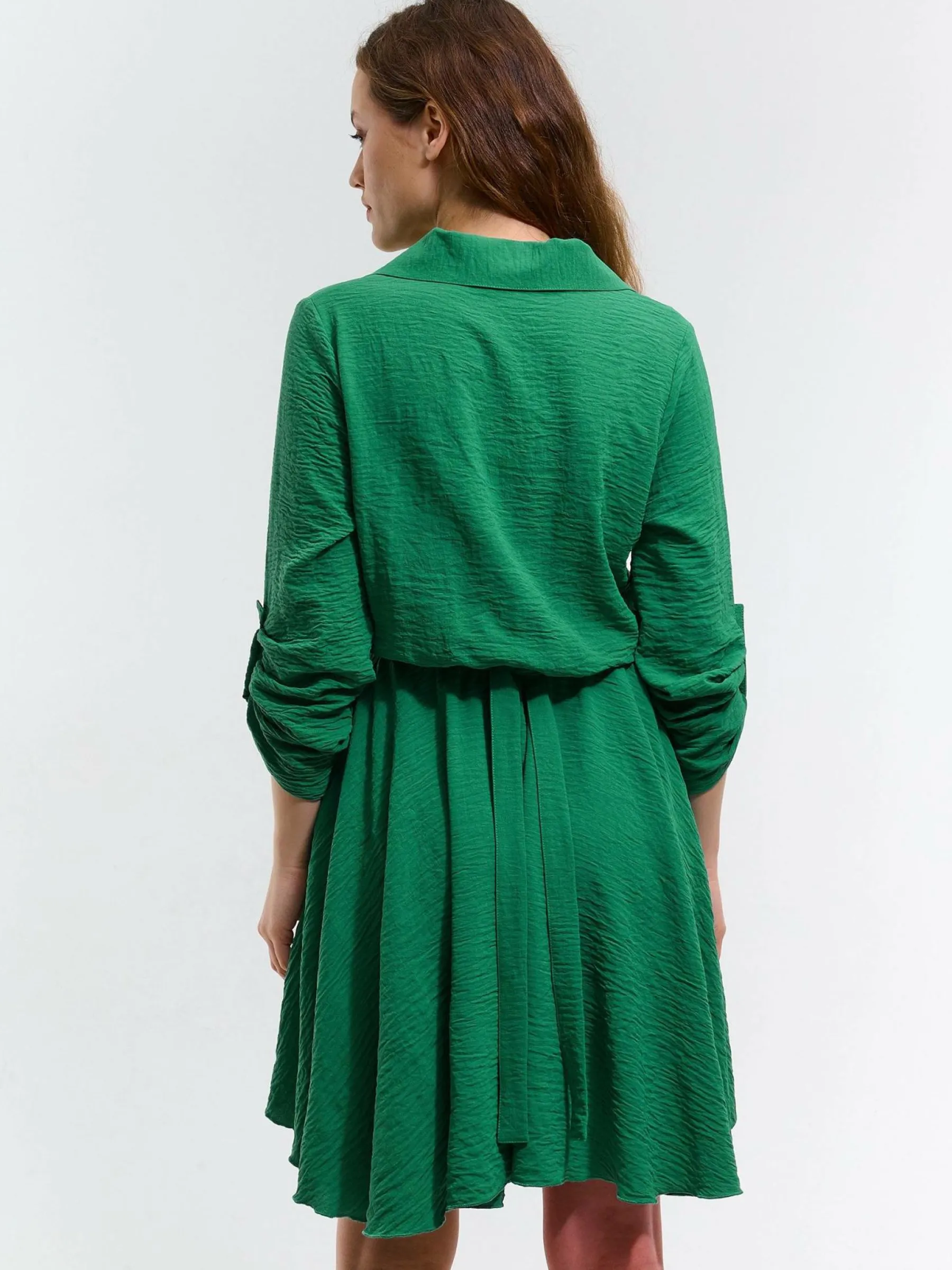 Kolor: zielonyKrój: koszuloweTyp: sukienkaRekaw: długi rękawDługość: miniPattern style: pojedynczy kolorDetal: na …