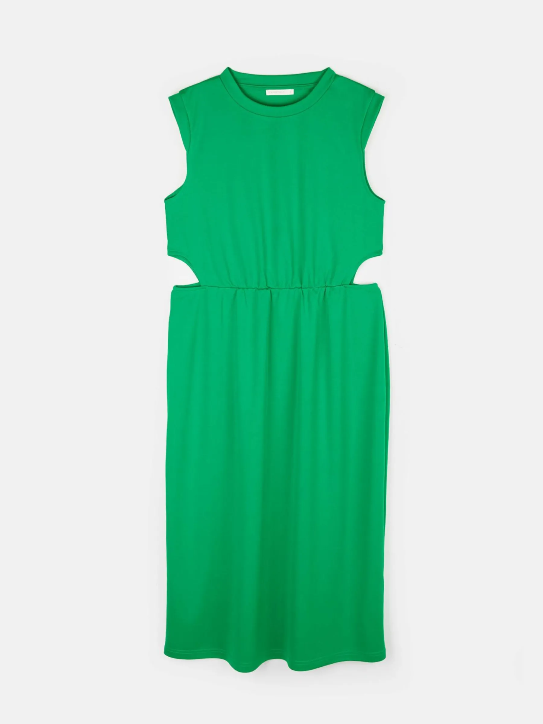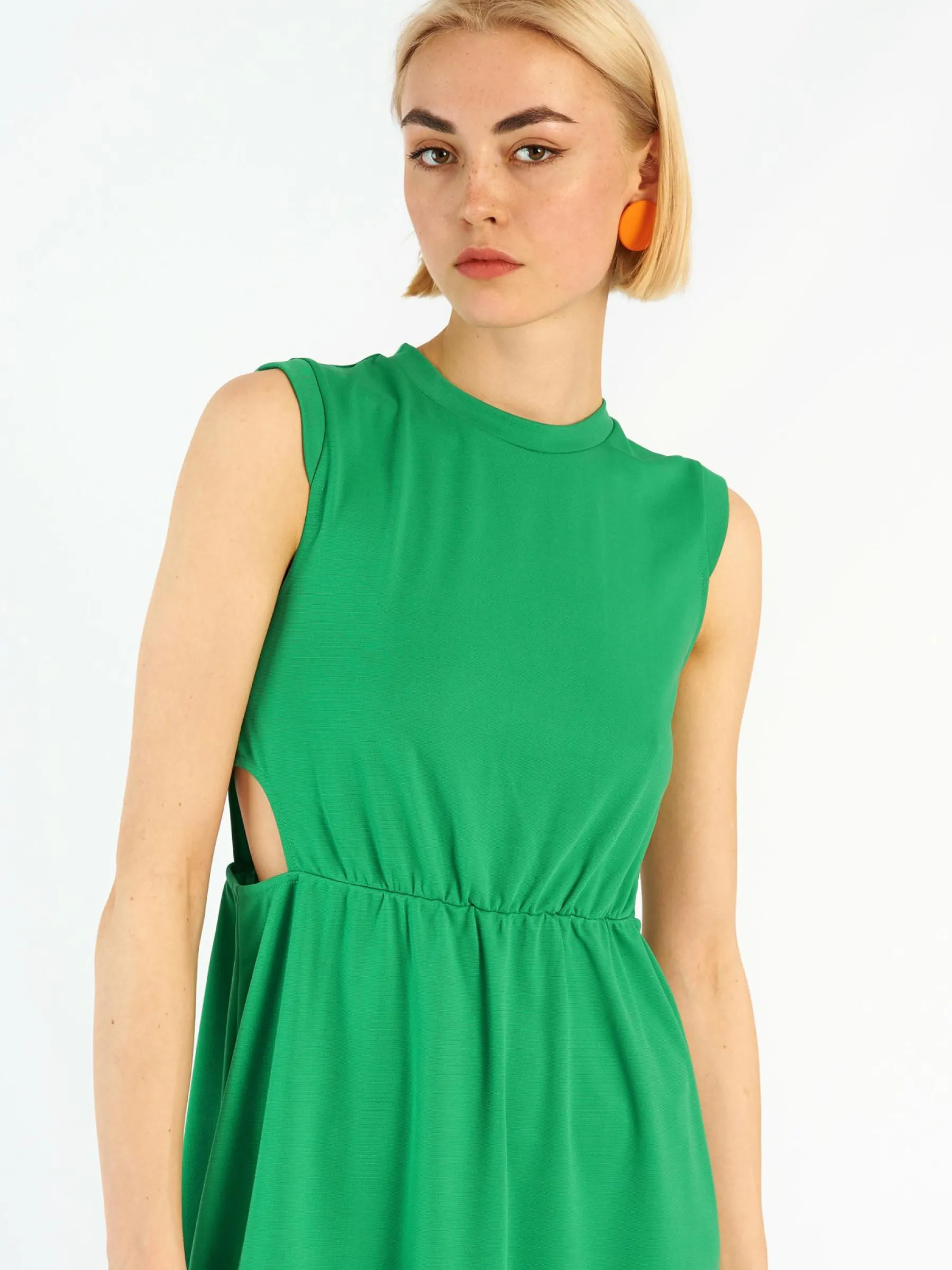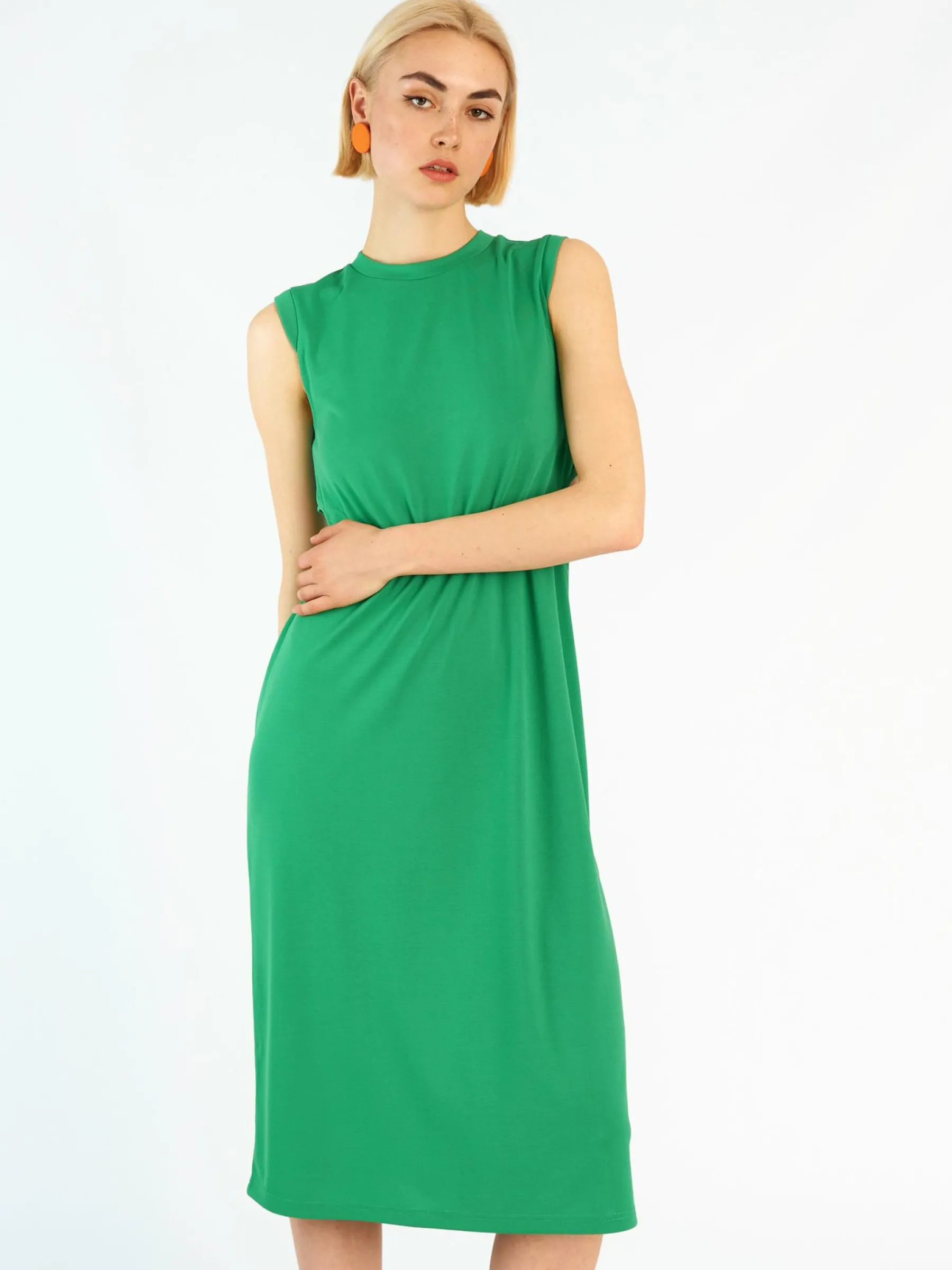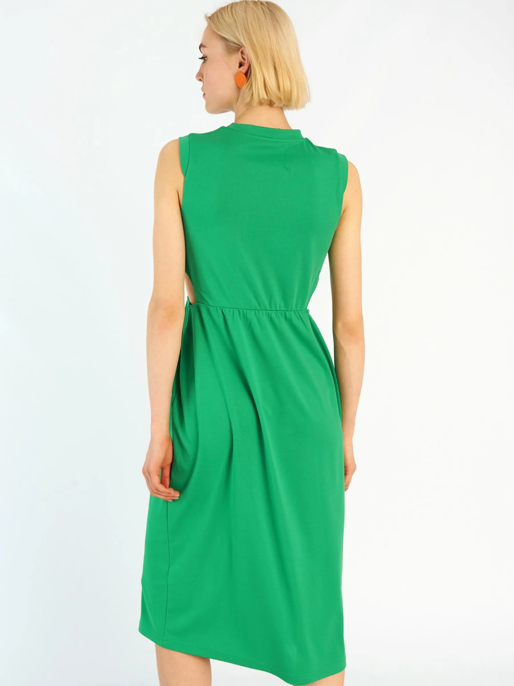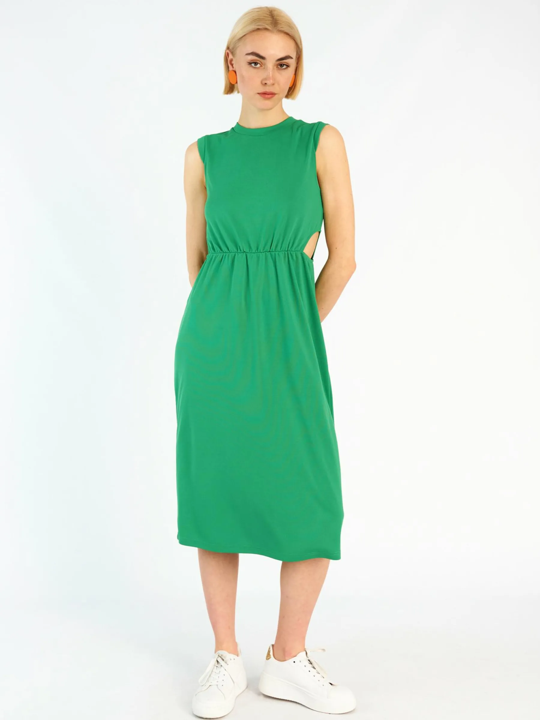 Kolor: zielonyKrój: podstawowyTyp: sukienkaRekaw: bez rękawówDługość: midiPattern style: pojedynczy kolorMateriał…