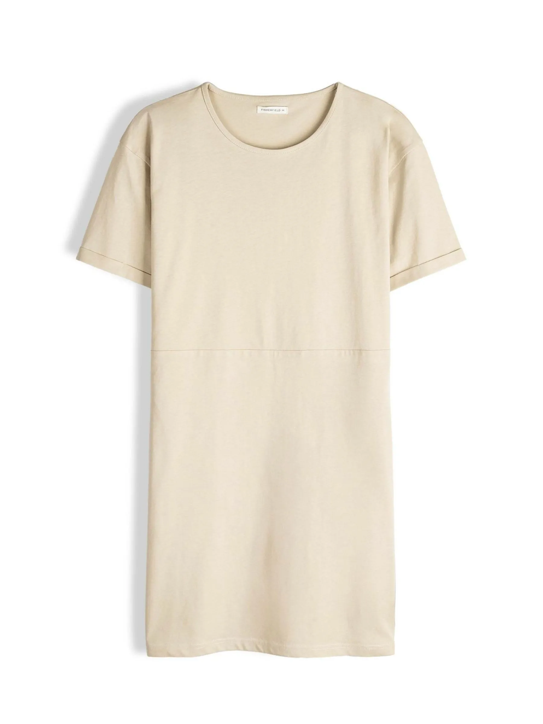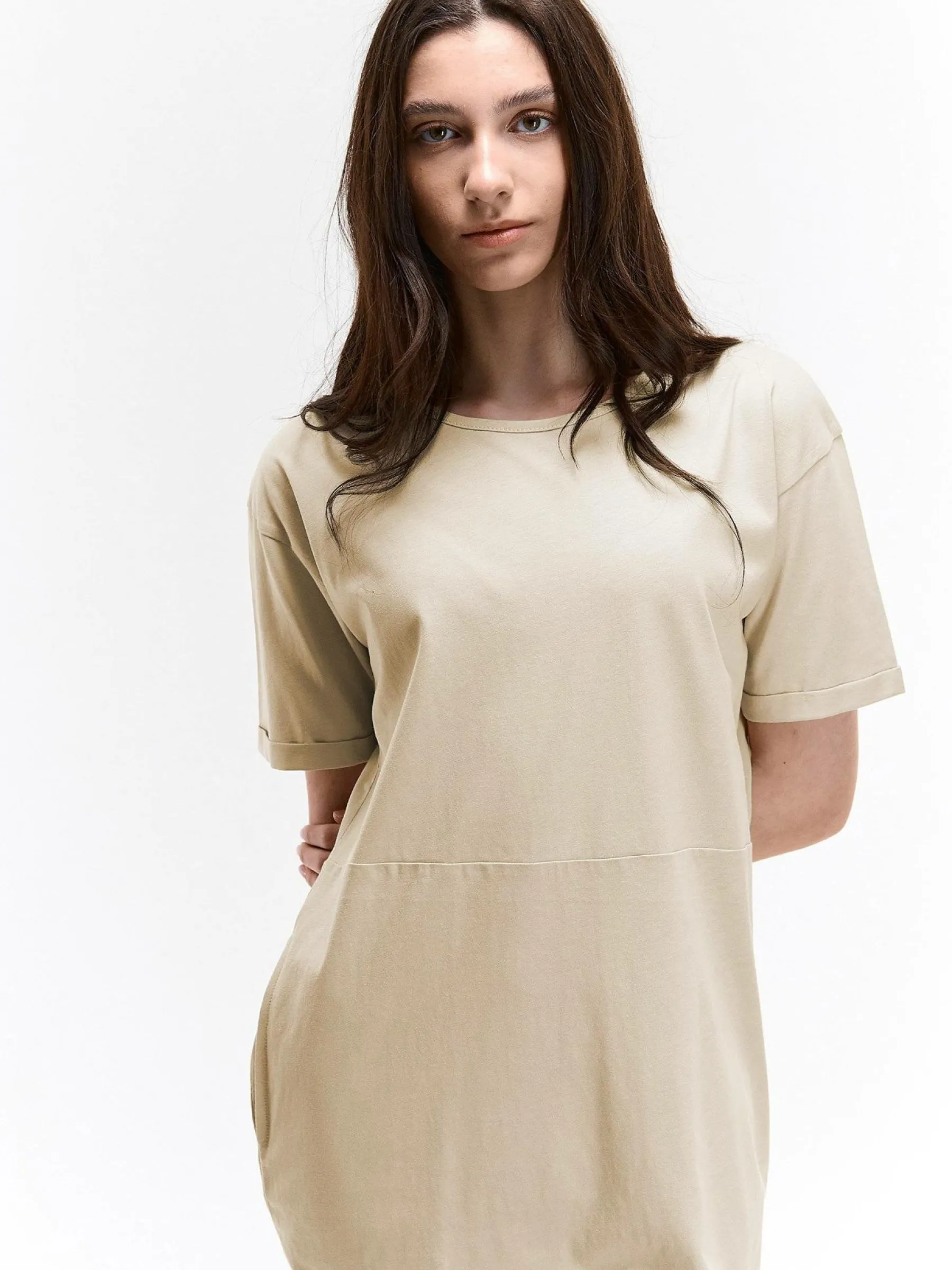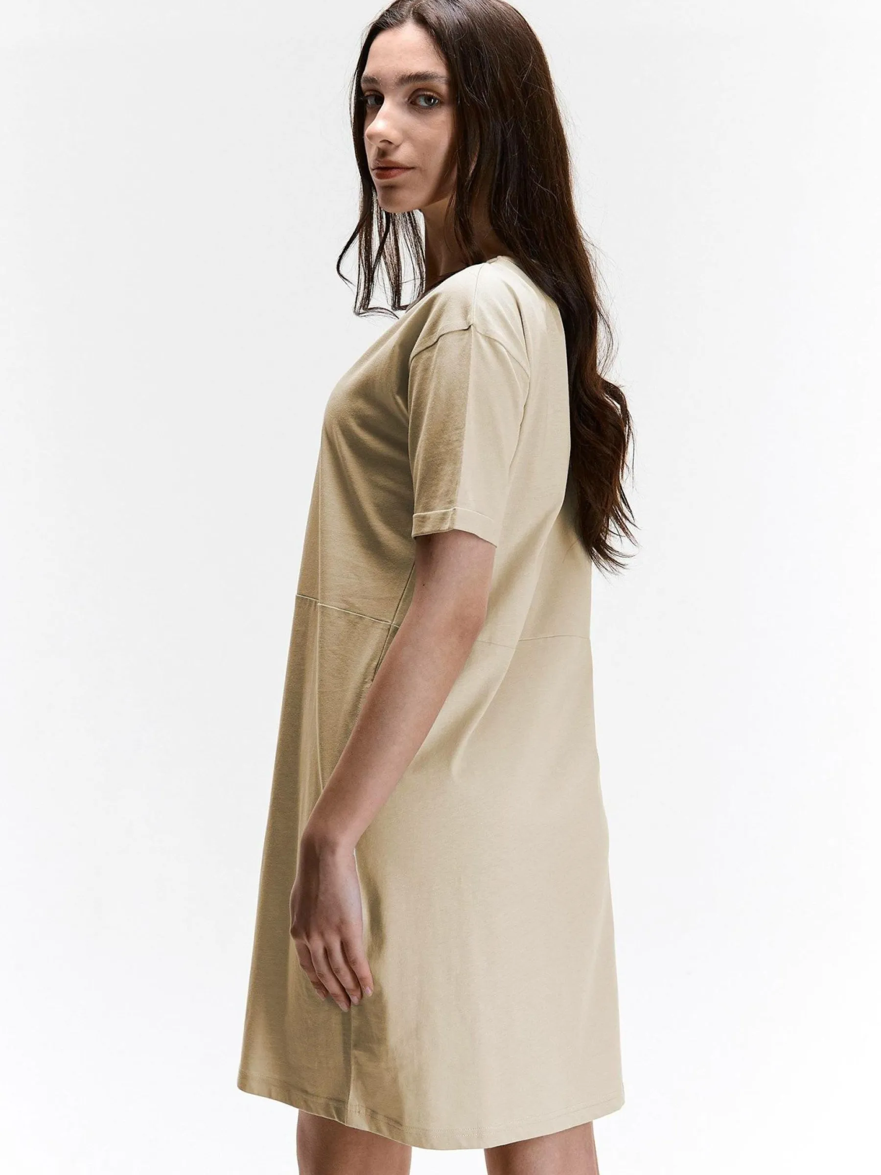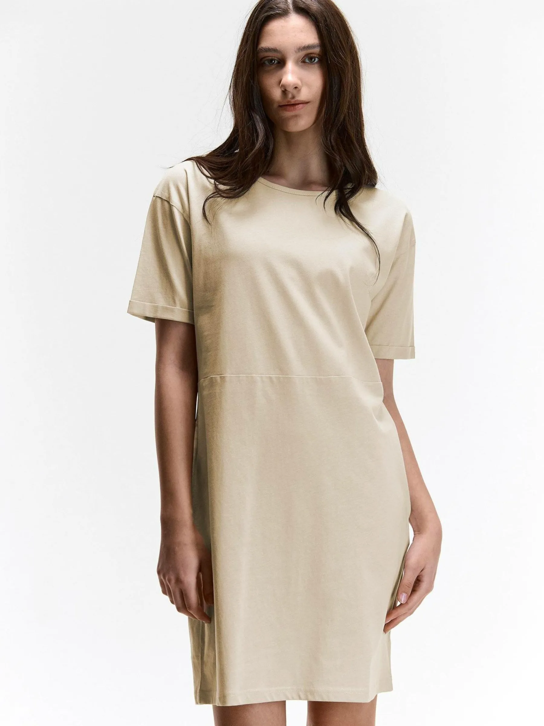 Kolor: beżowyKrój: regularTyp: sukienkaRekaw: krótki rękawDługość: miniPattern style: pojedynczy kolorDetal: nad …