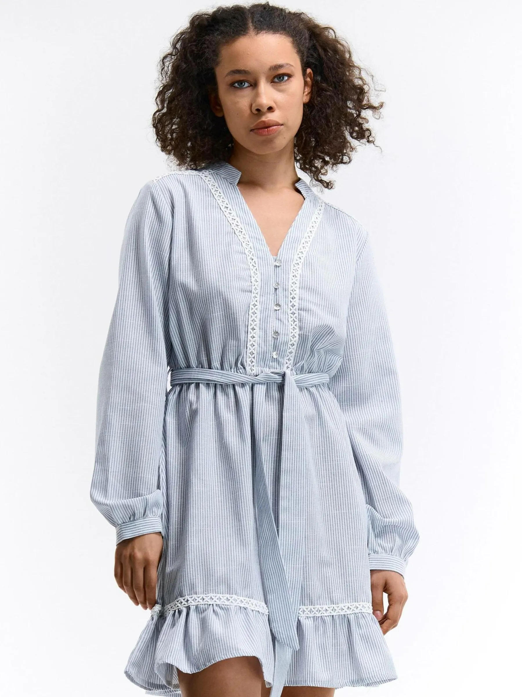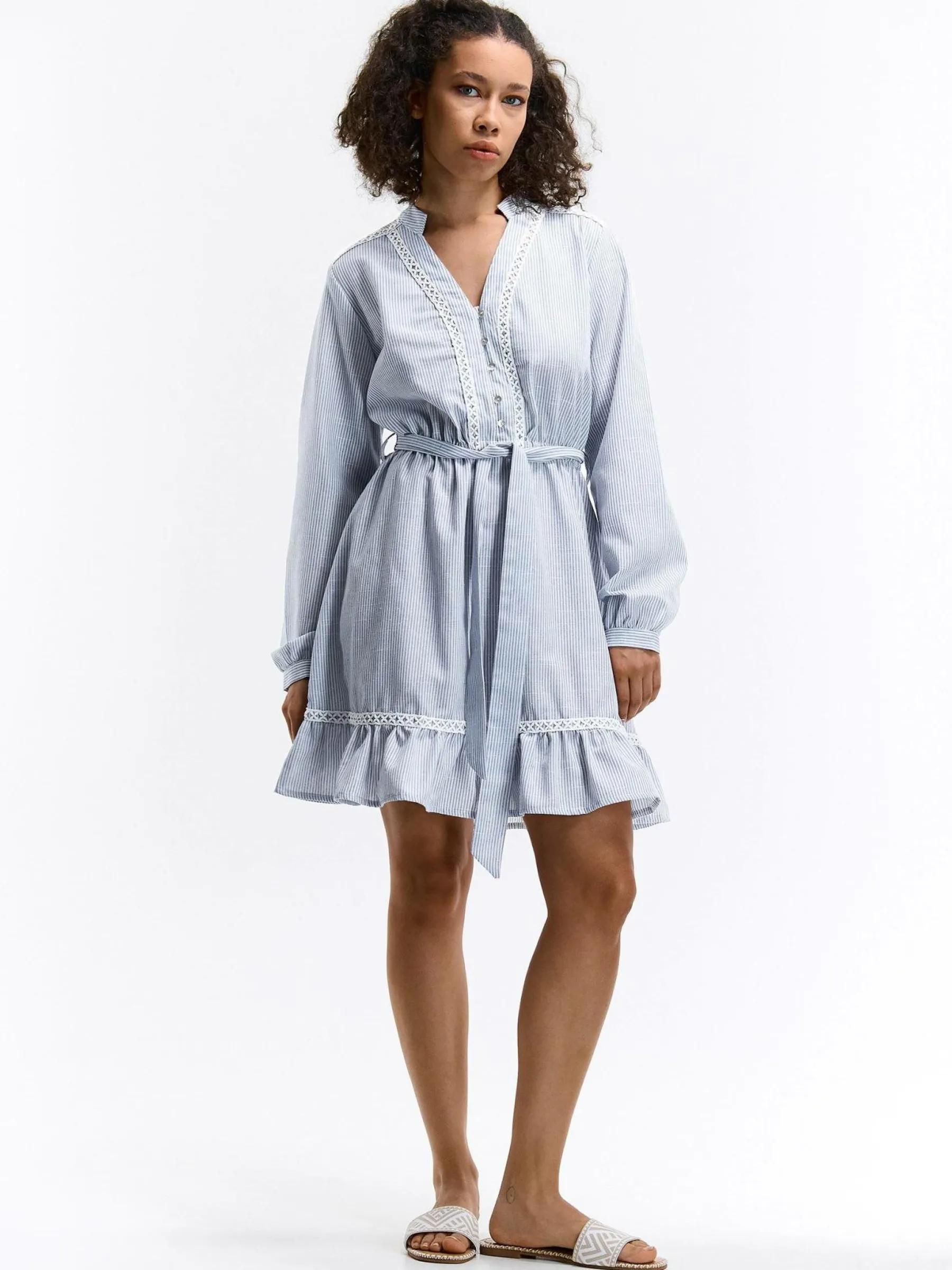 Kolor: niebieskiKrój: z falbanąTyp: sukienkaRekaw: długi rękawDługość: miniPattern style: w prążkiDetal: z haft…