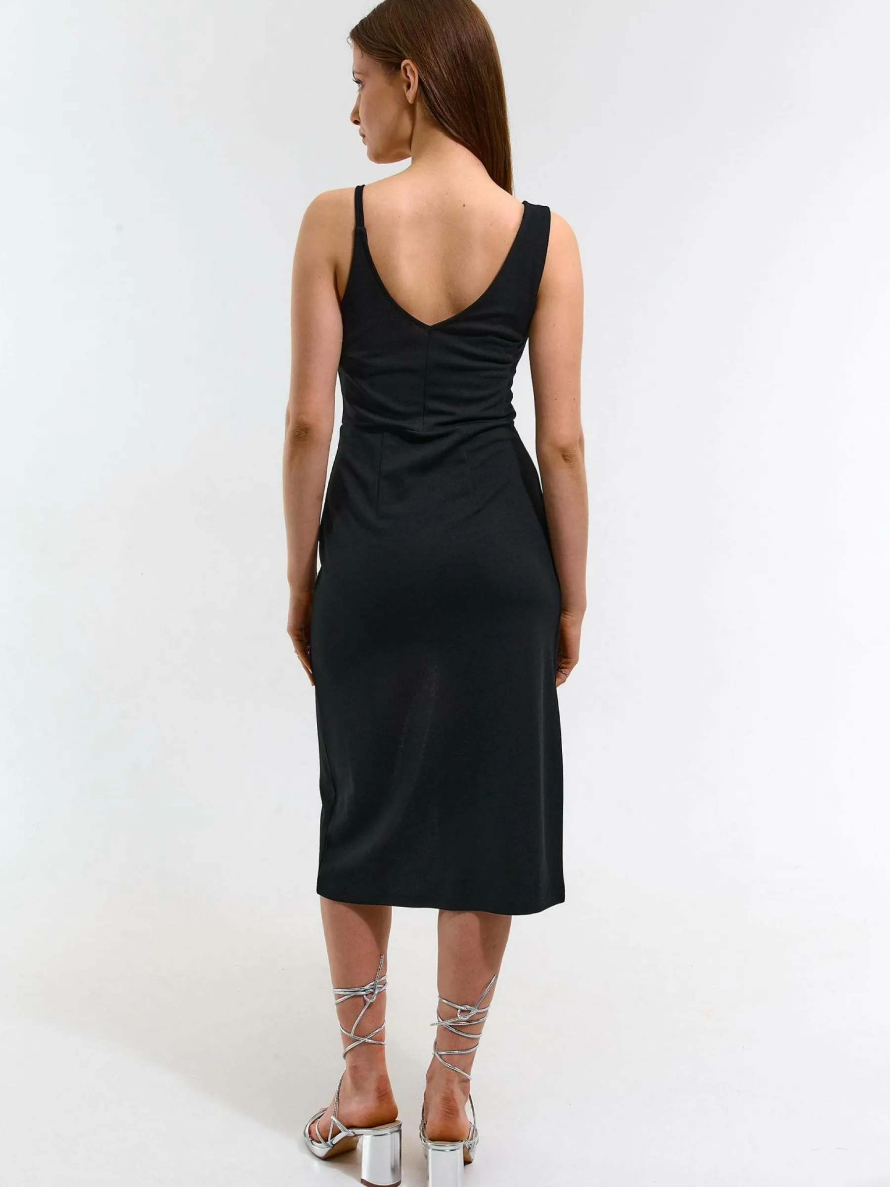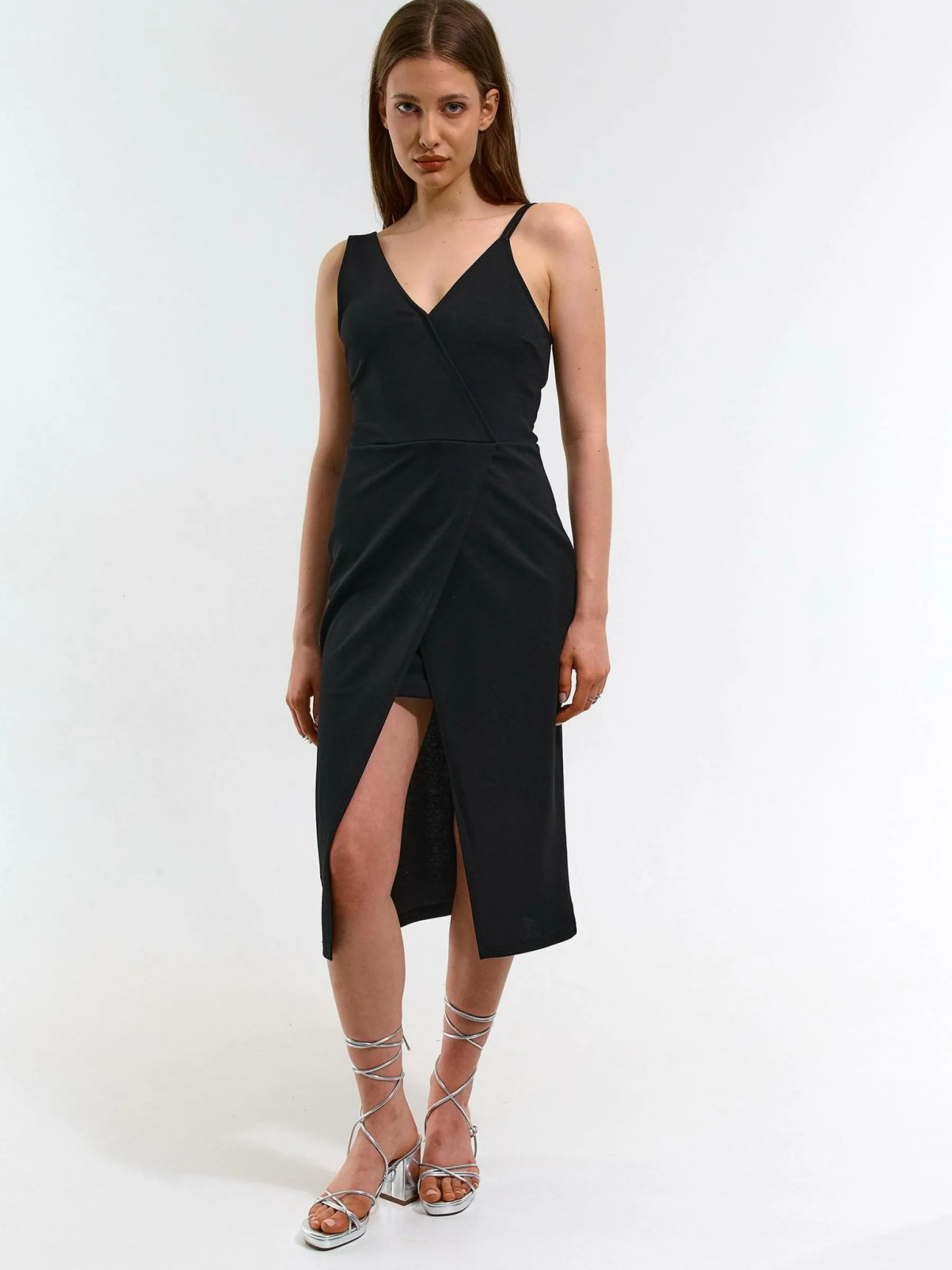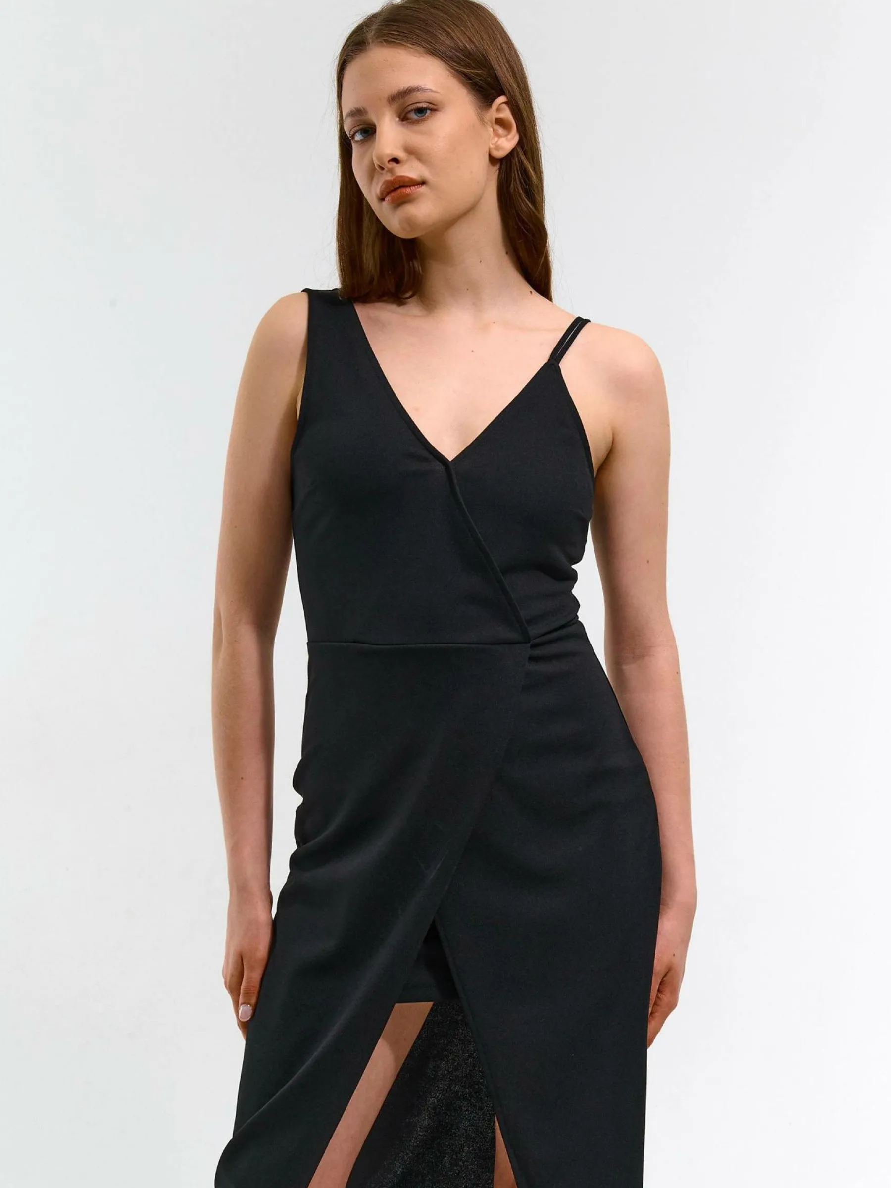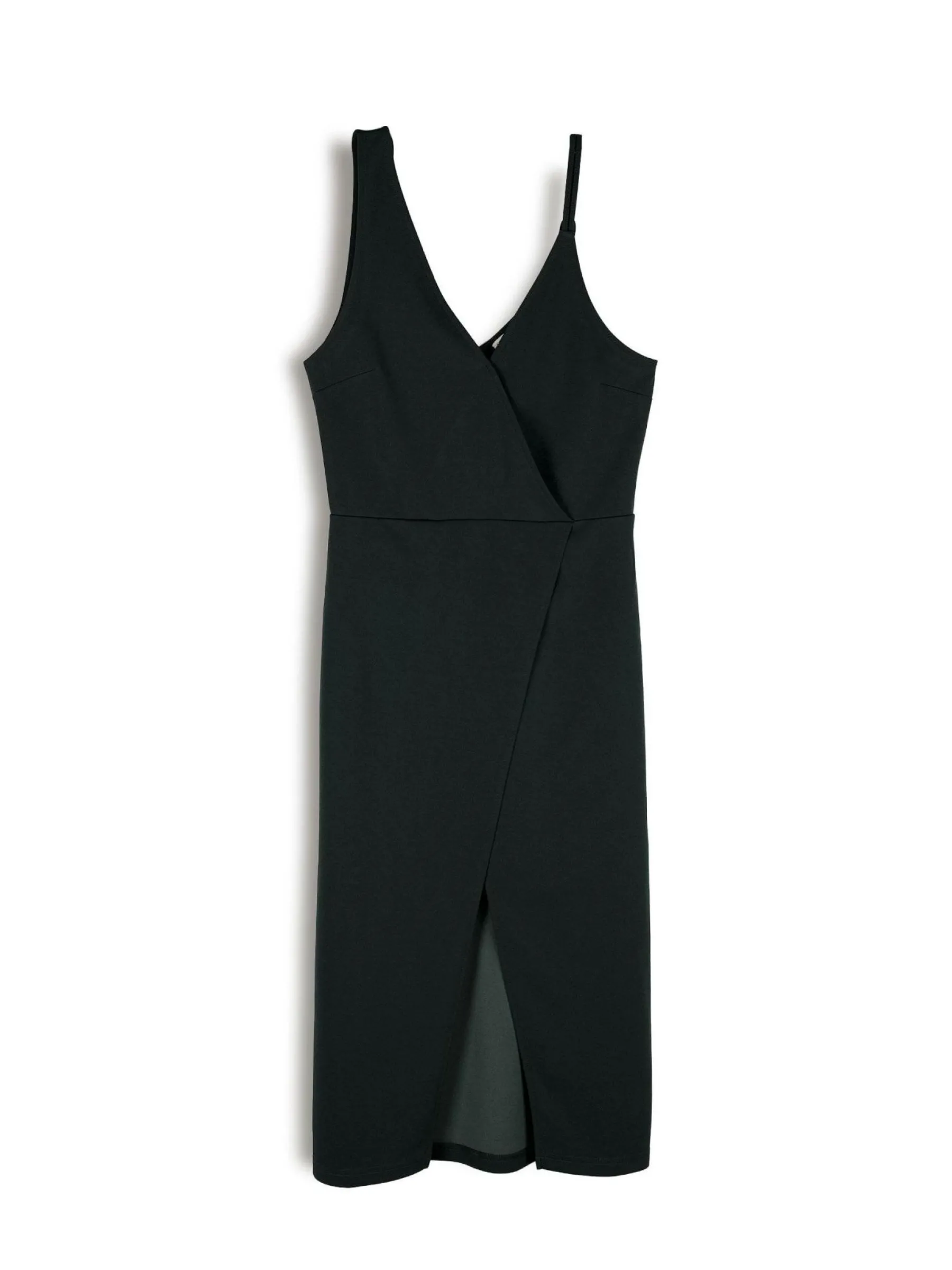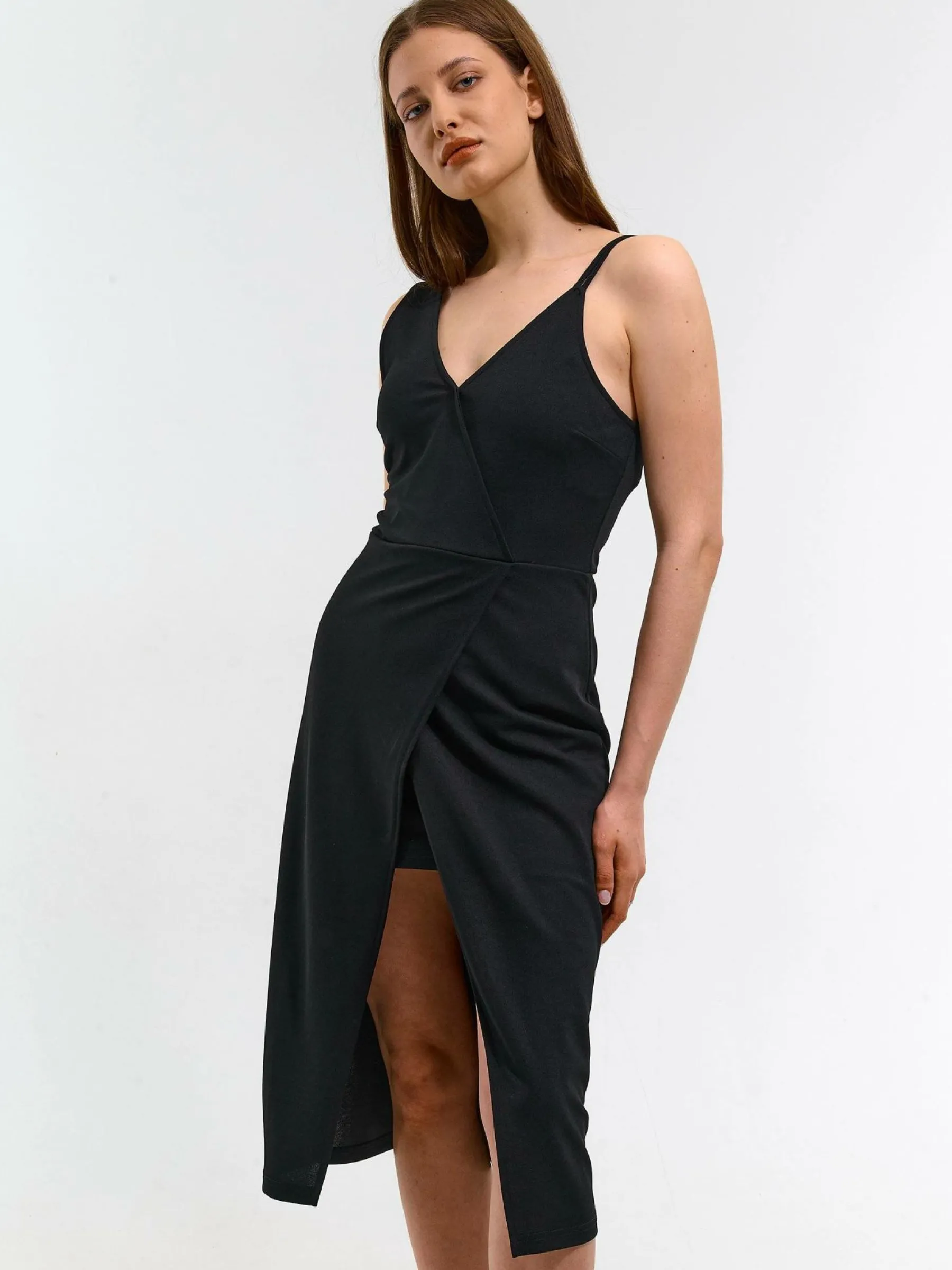 Kolor: czarnyKrój: kopertówki, asymetryczneTyp: sukienkaRekaw: bez rękawówDługość: midiPattern style: pojedynczy …