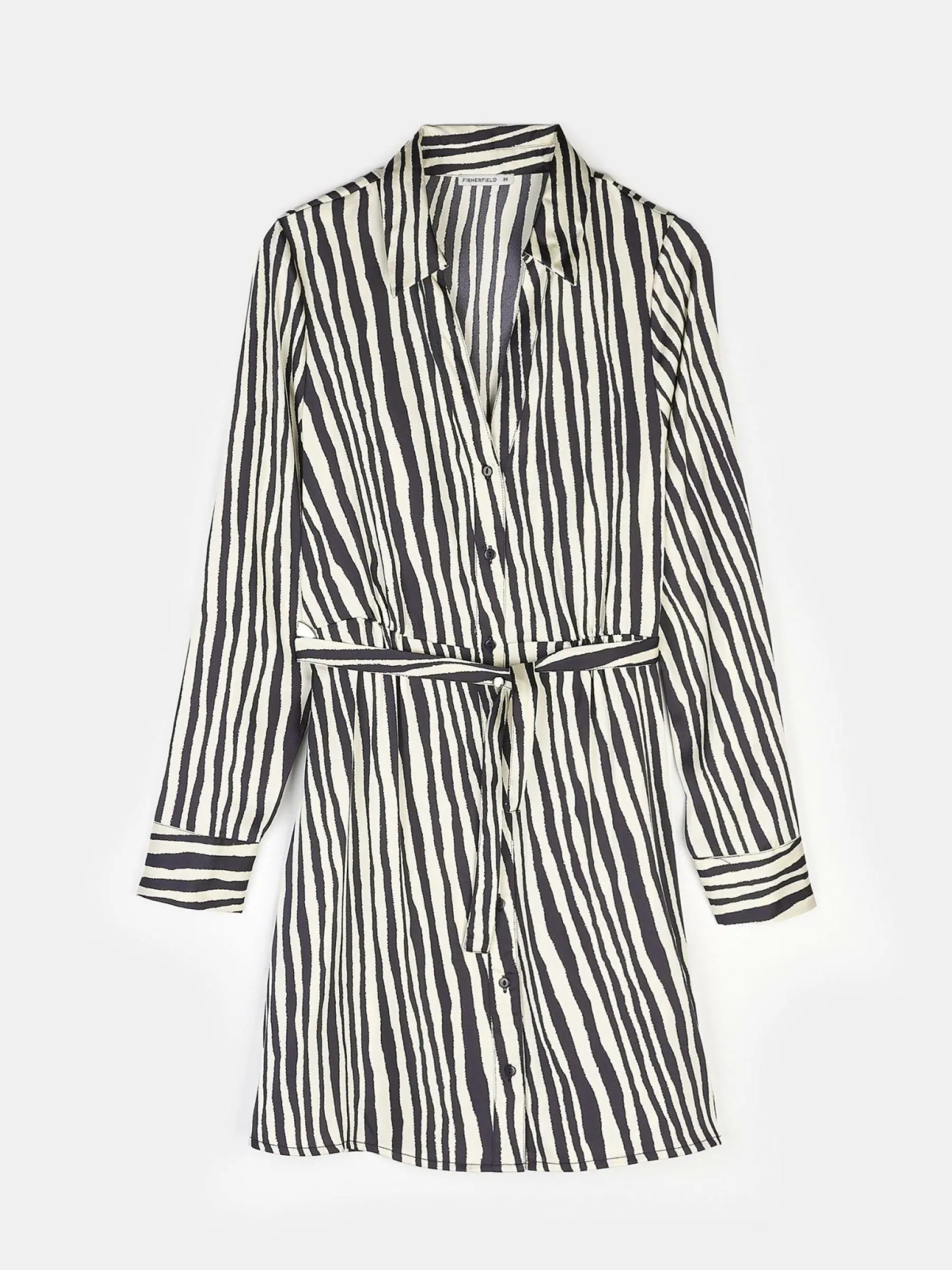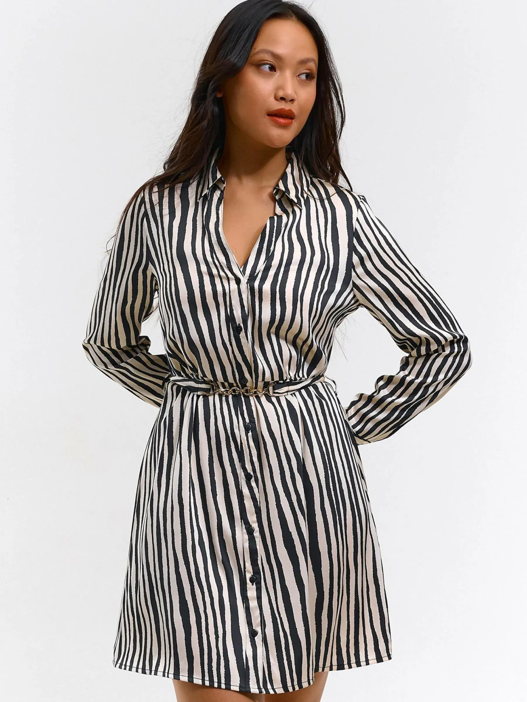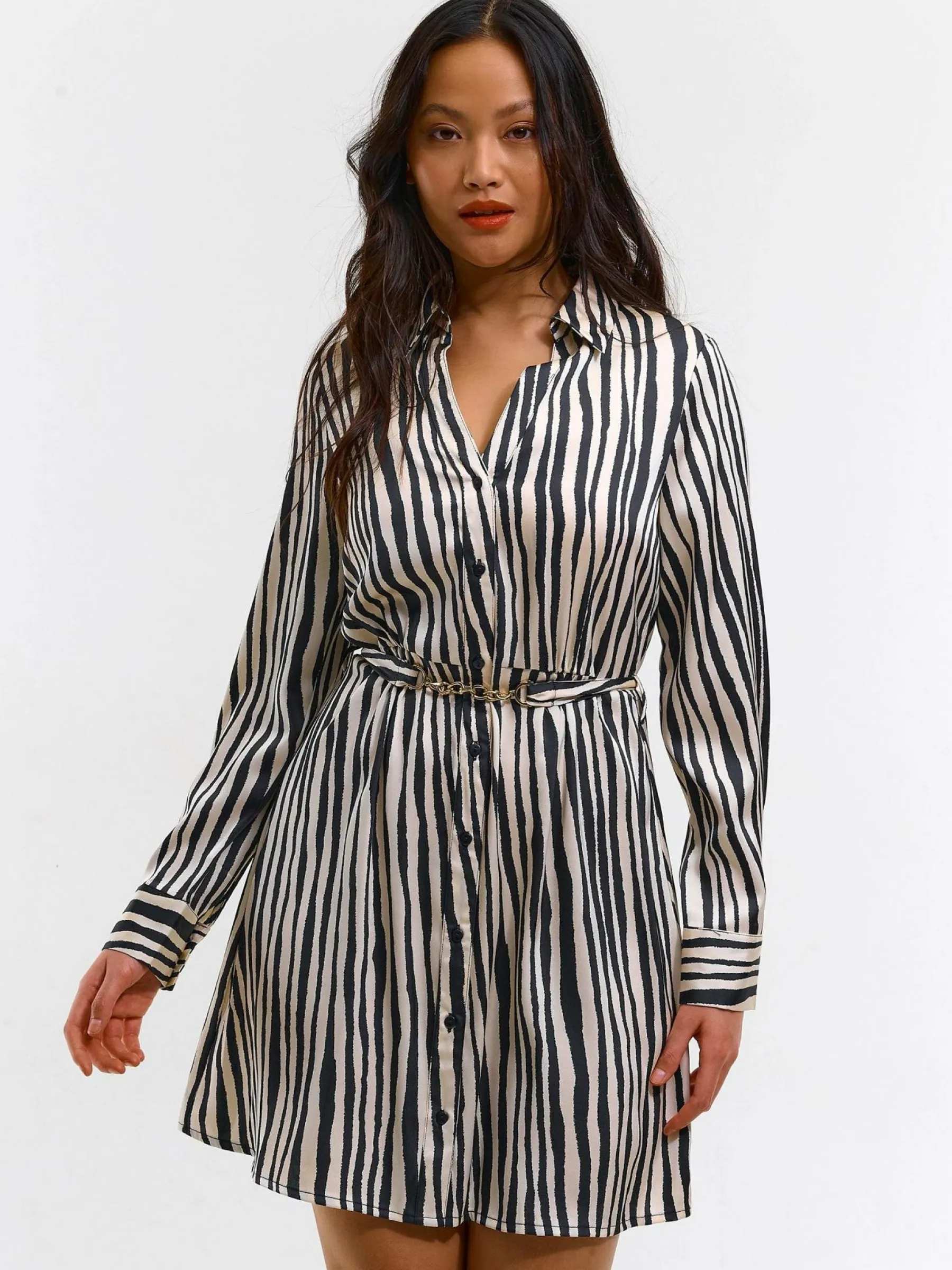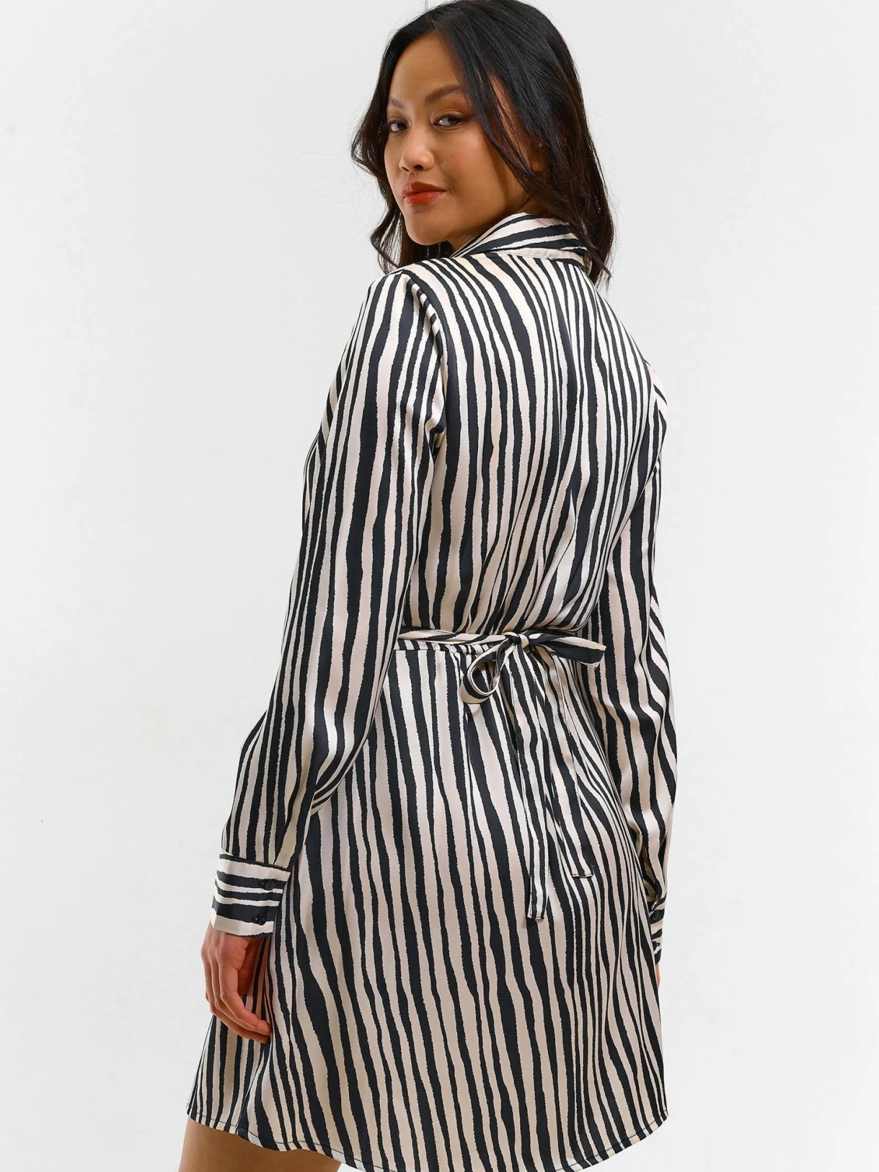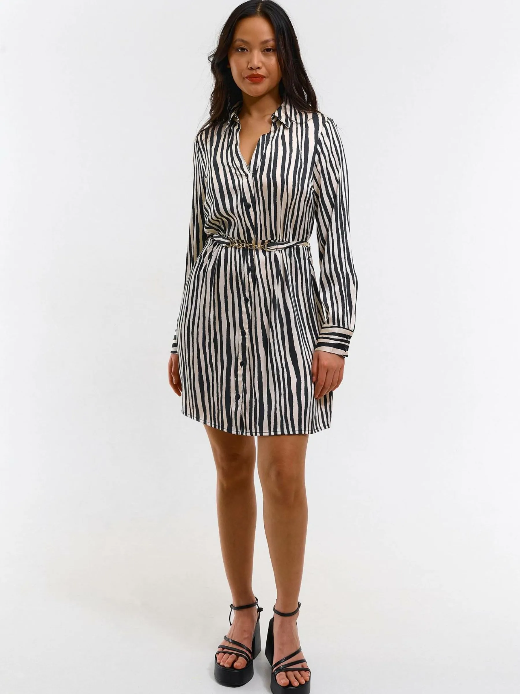 Kolor: czarny, białyKrój: koszuloweTyp: sukienkaRekaw: długi rękawDługość: miniPattern style: w prążkiDetal: z …