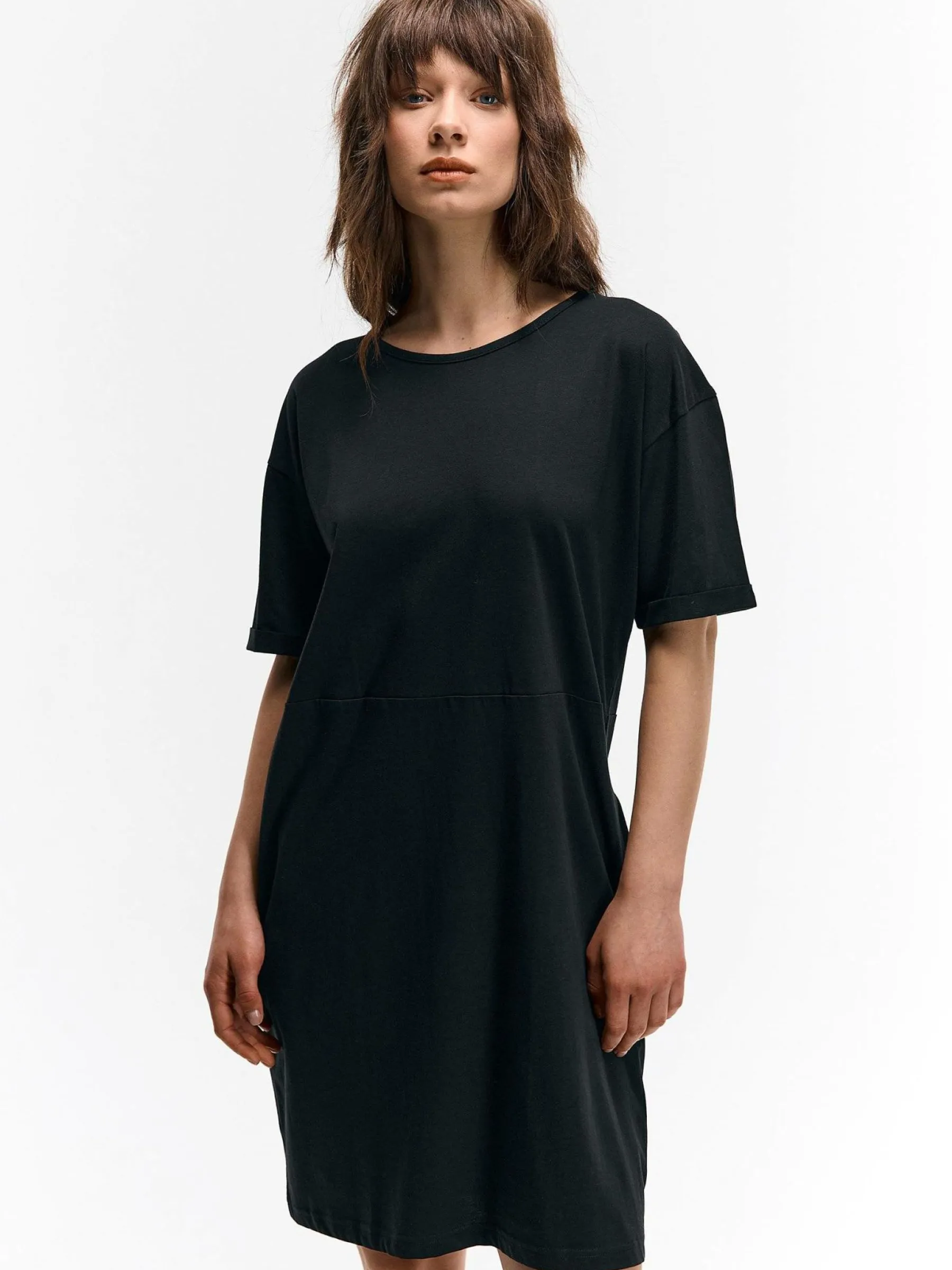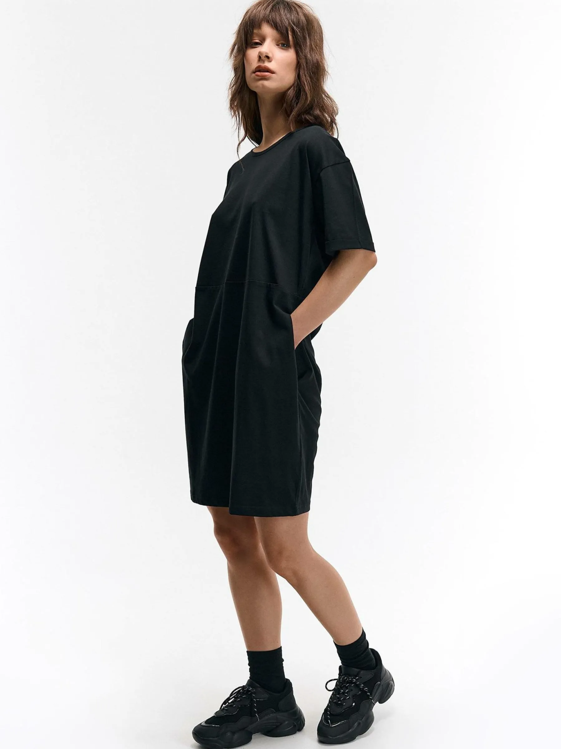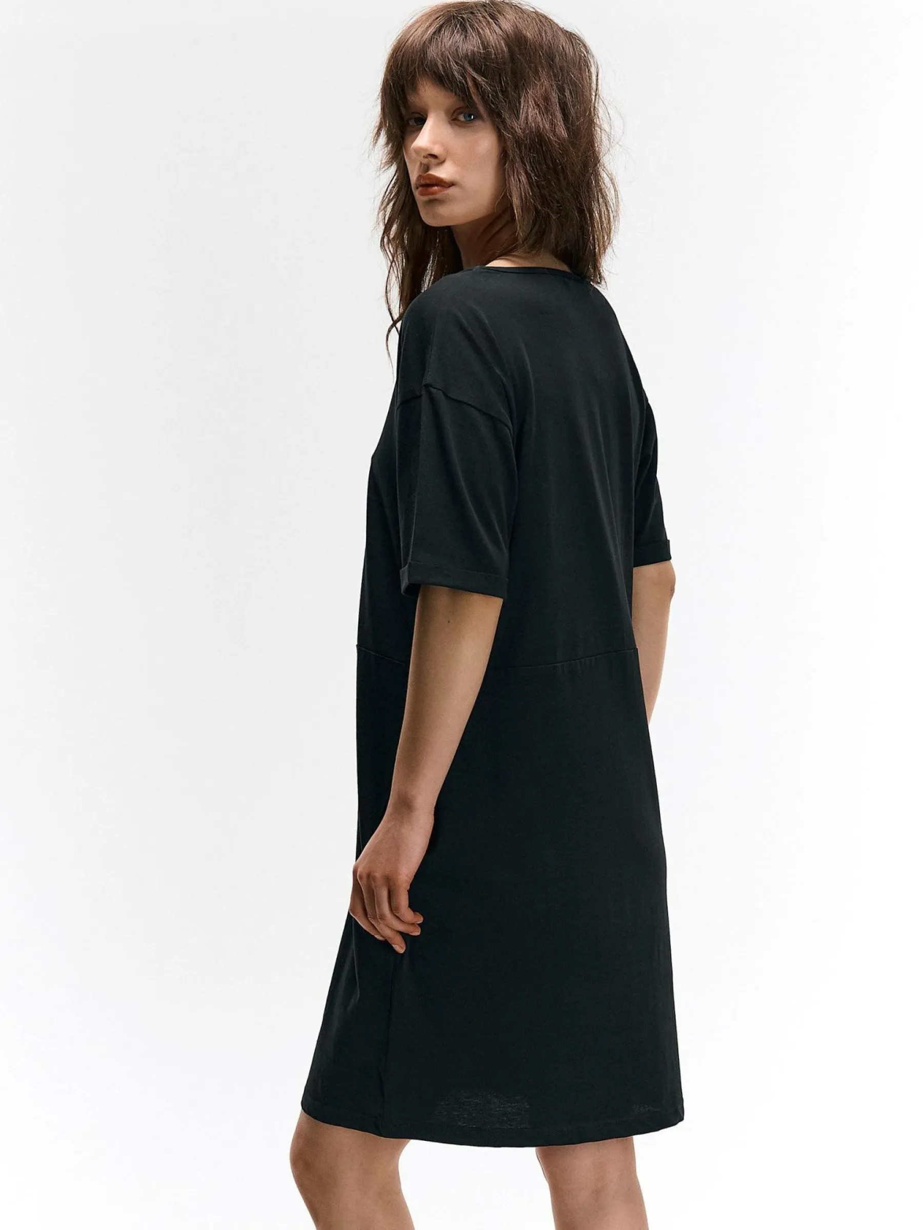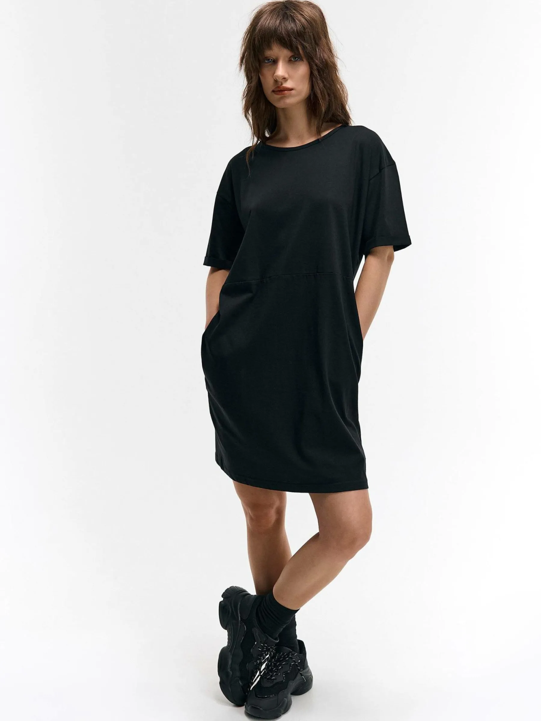 Kolor: czarnyKrój: regularTyp: sukienkaRekaw: krótki rękawDługość: miniPattern style: pojedynczy kolorDetal: nad g…