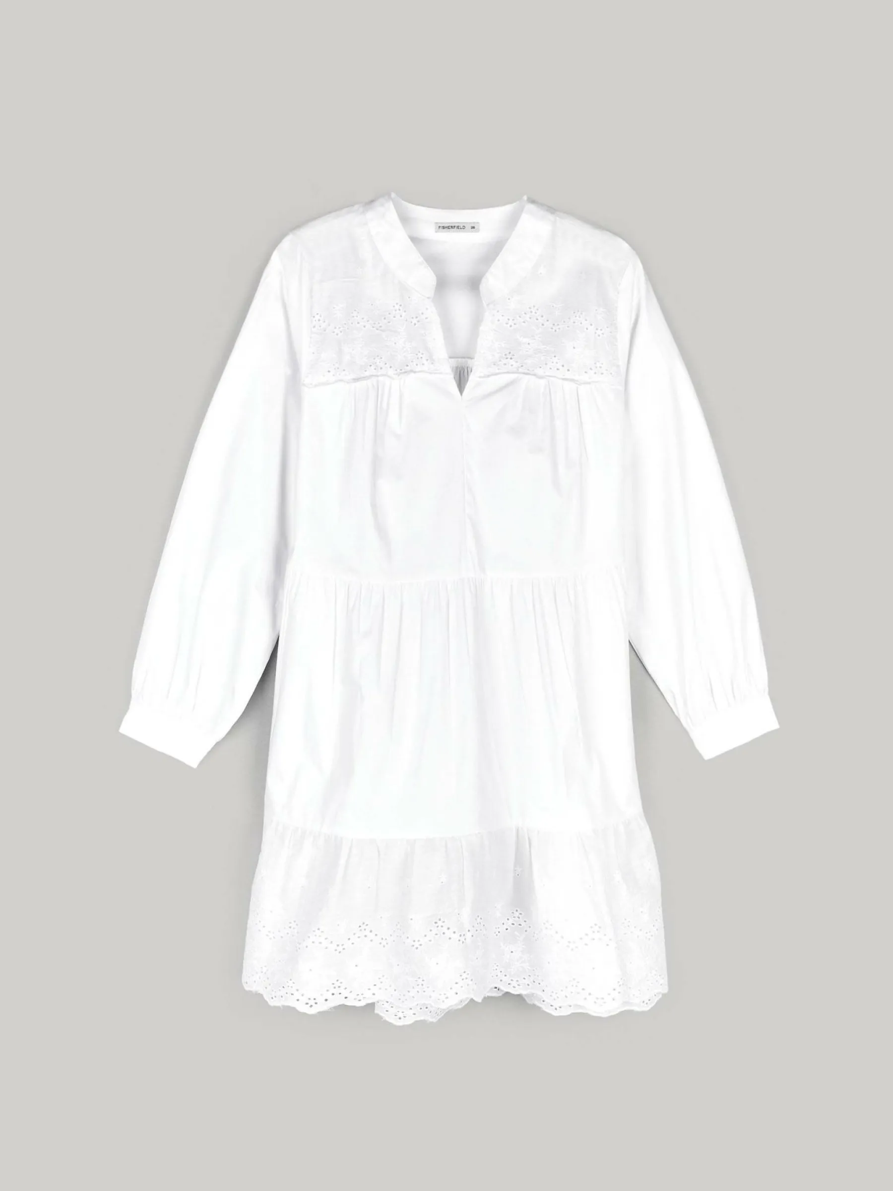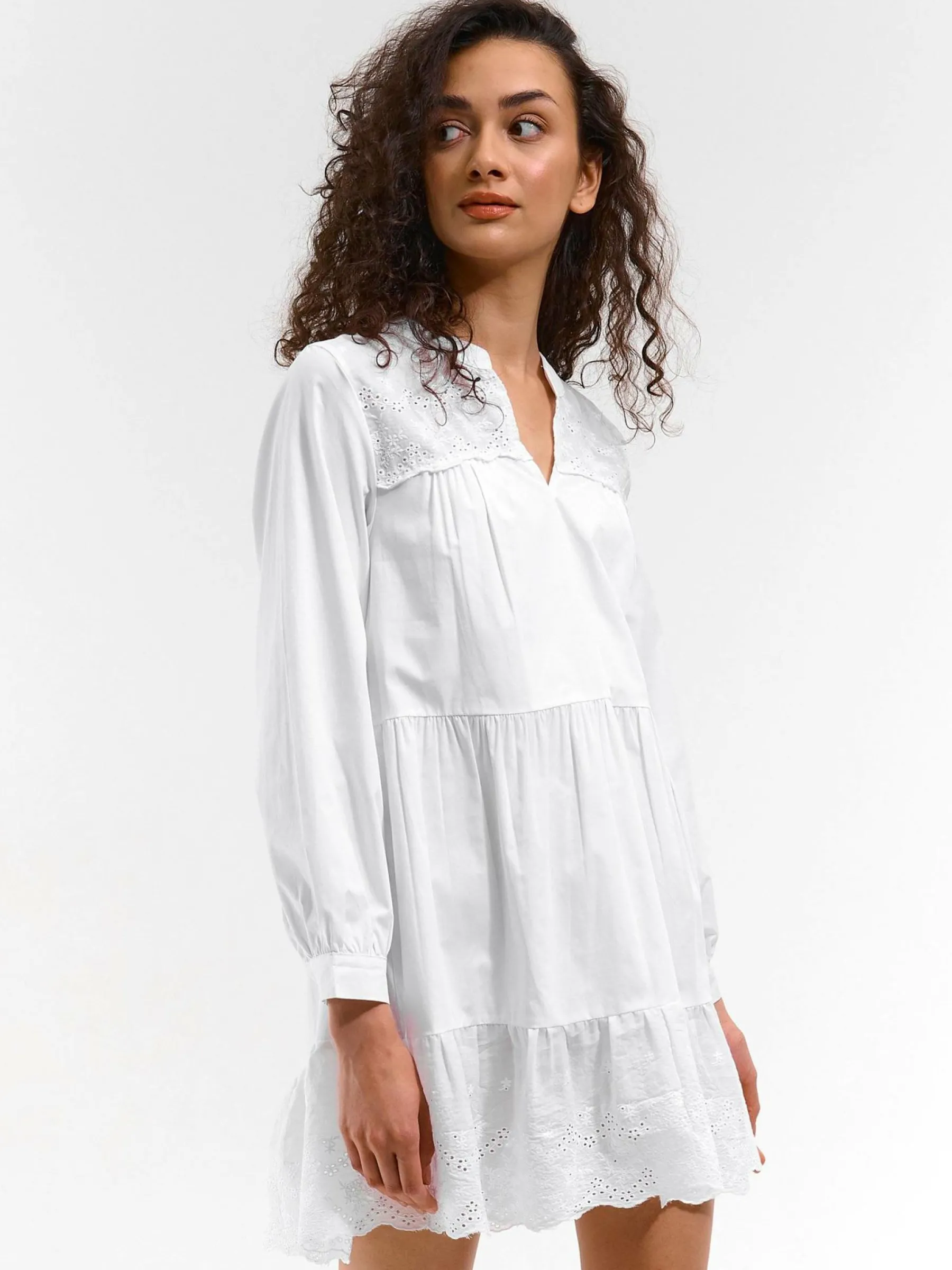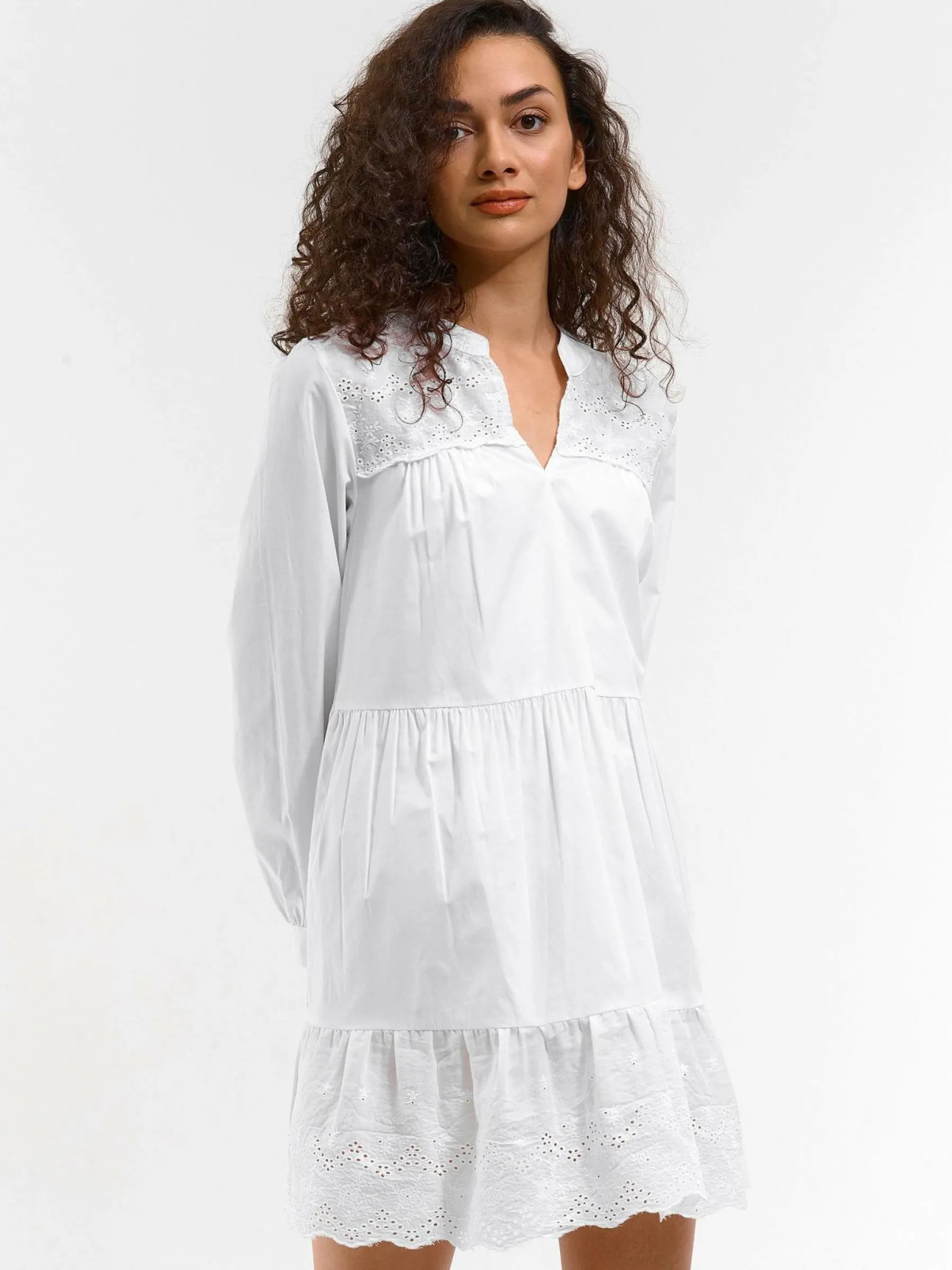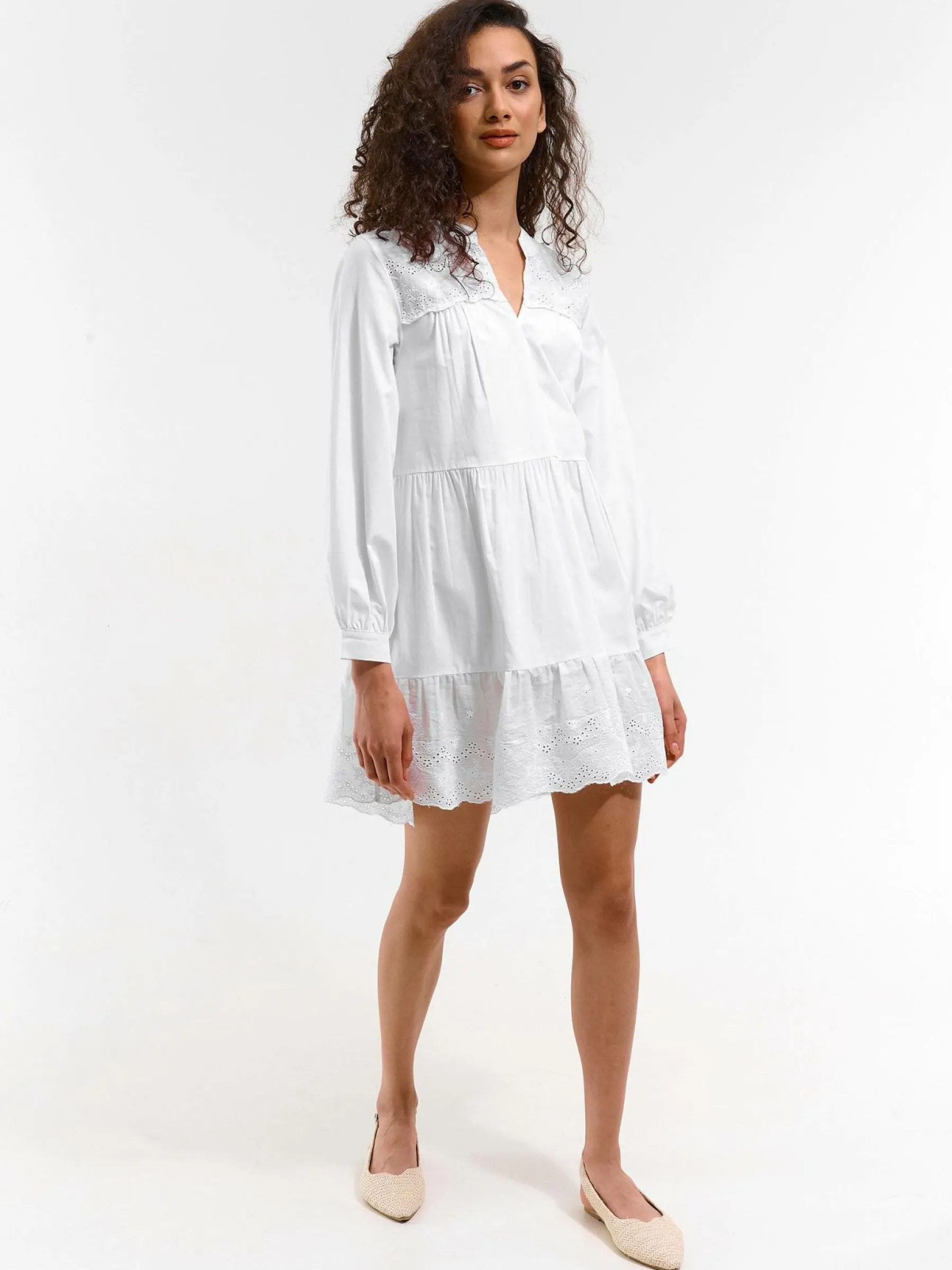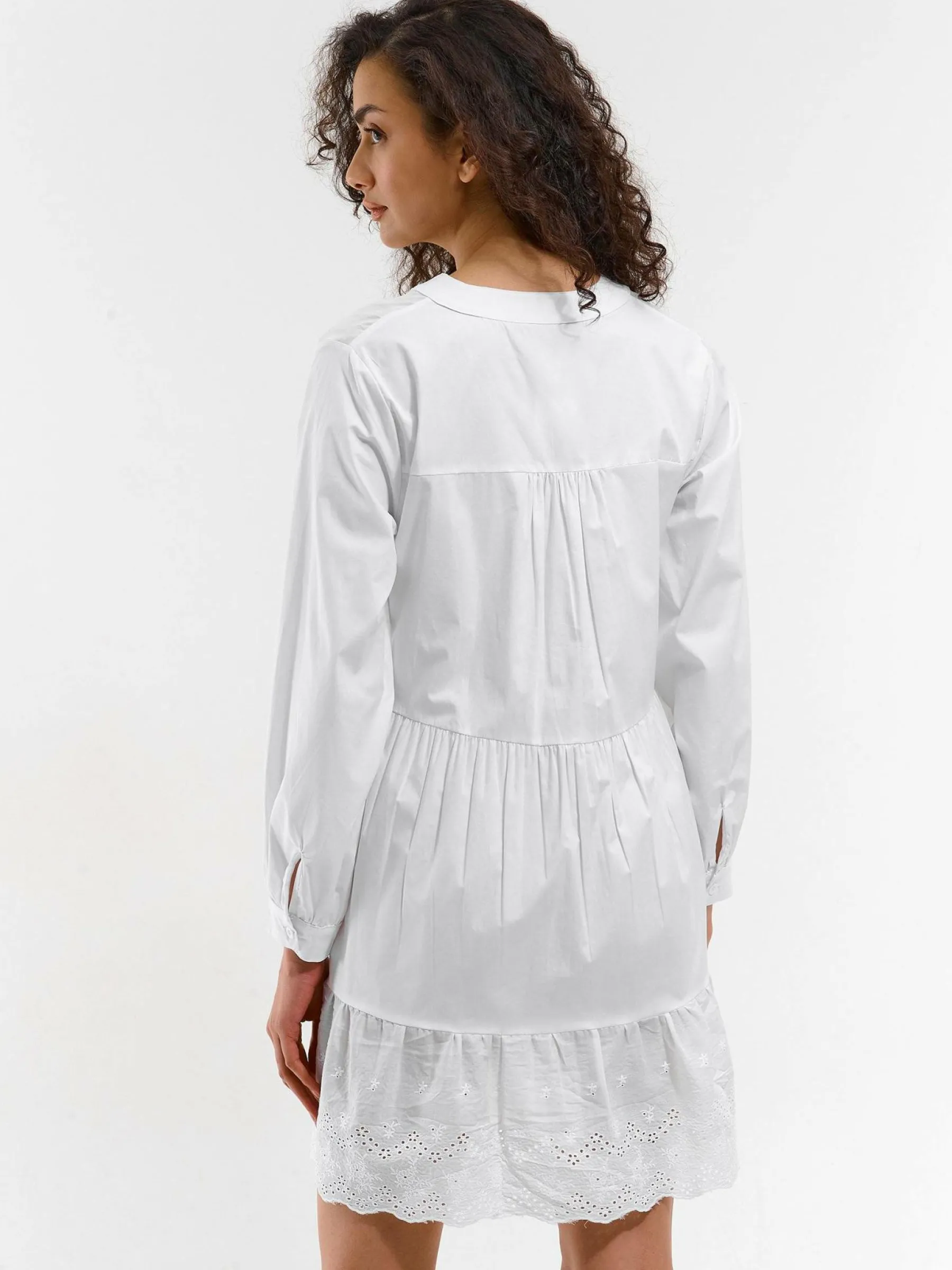 Kolor: białyKrój: z falbanąTyp: sukienkaRekaw: długi rękawDługość: miniPattern style: pojedynczy kolorDetal: nad…