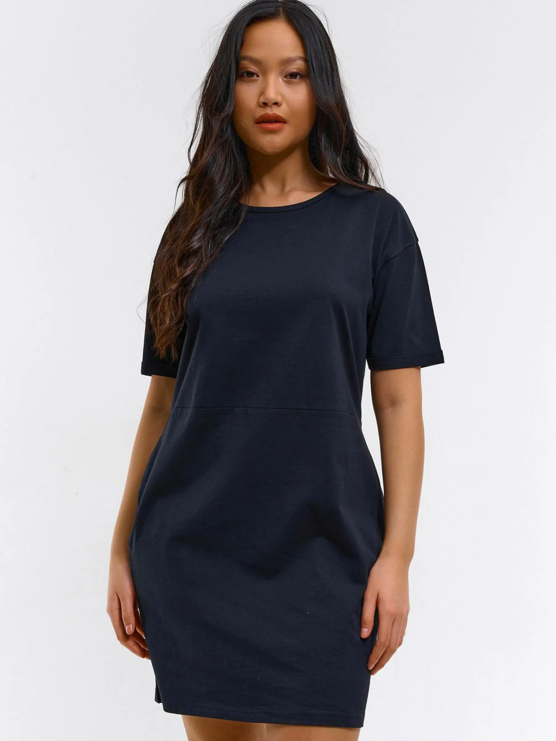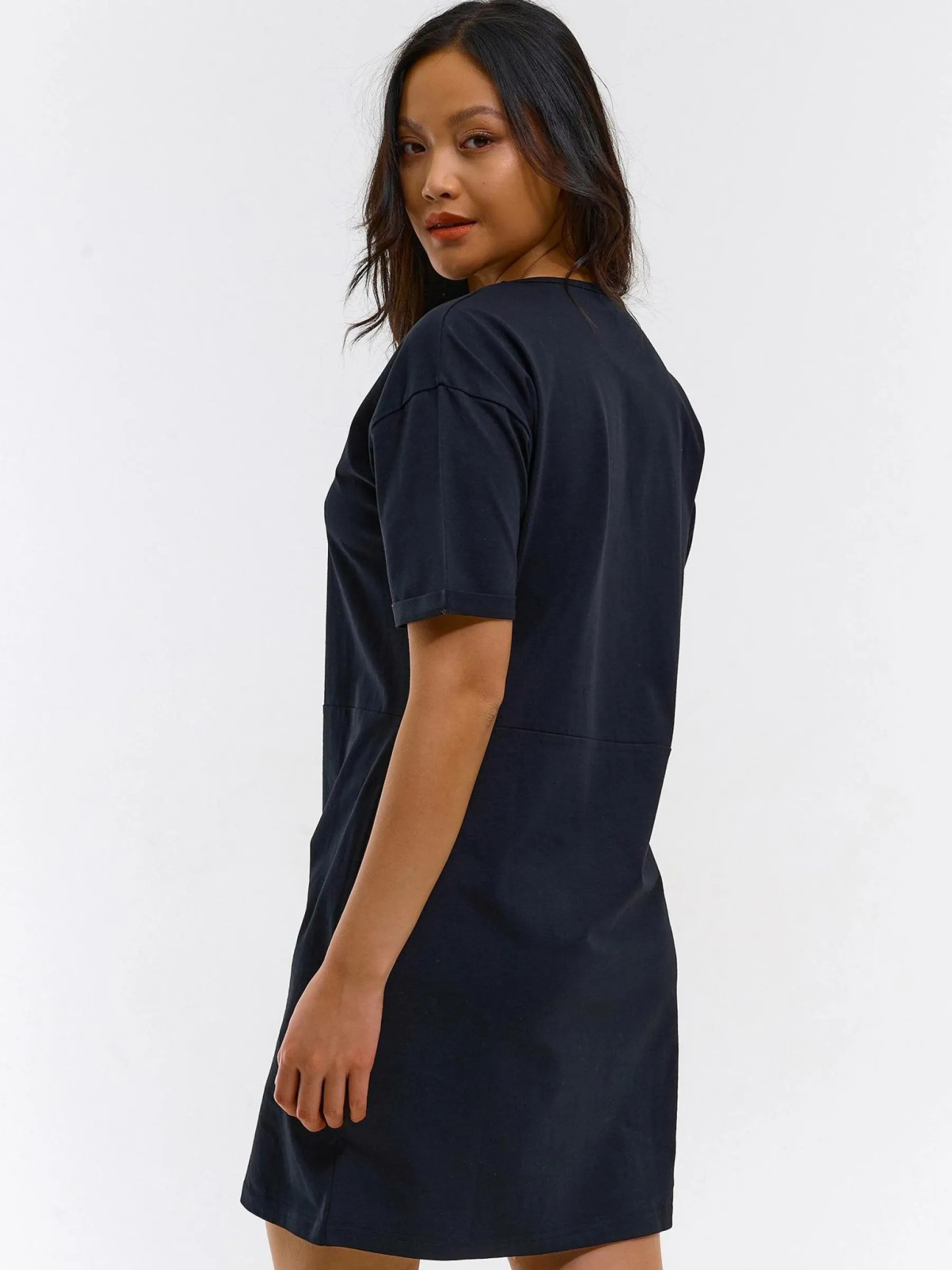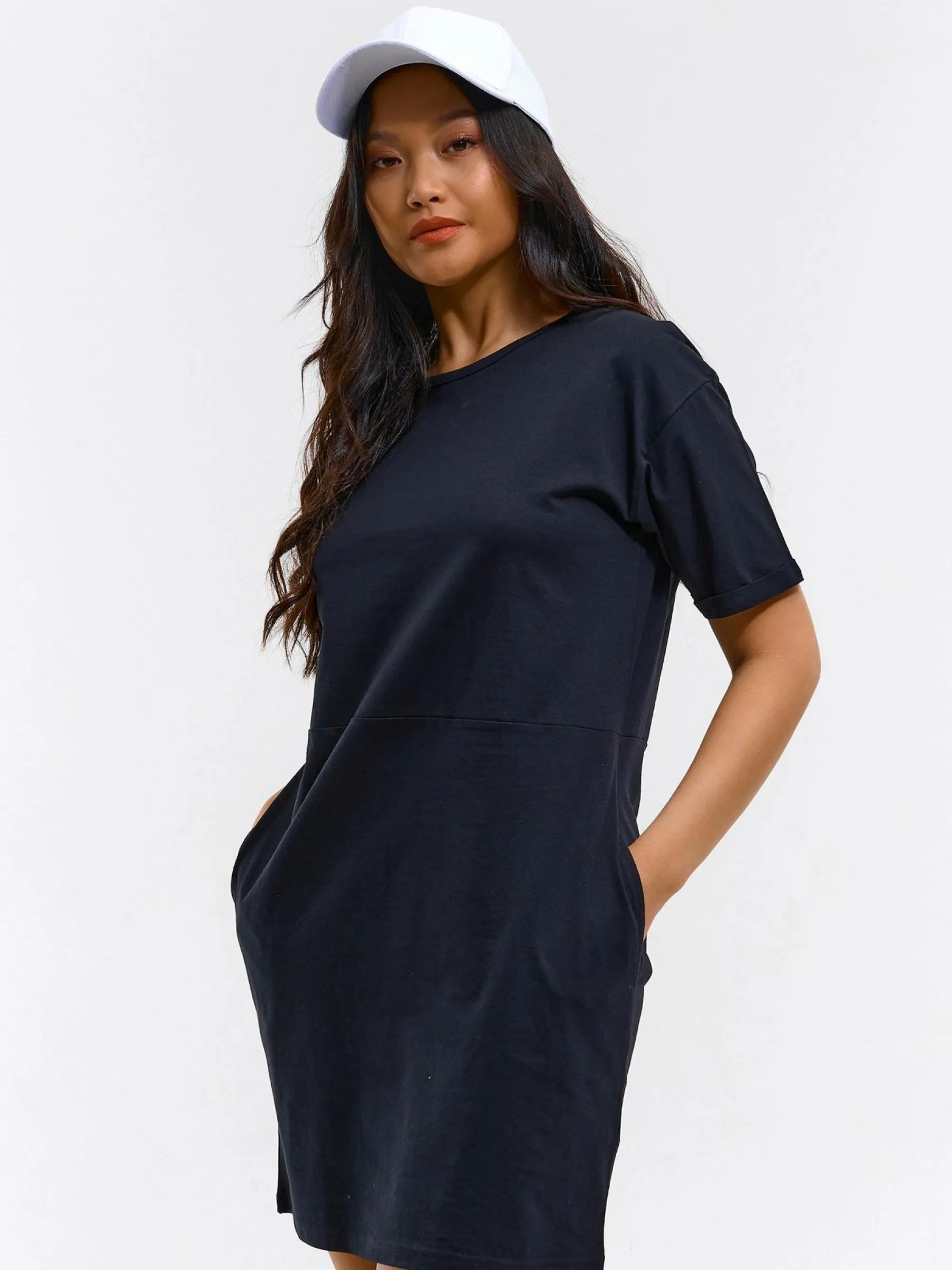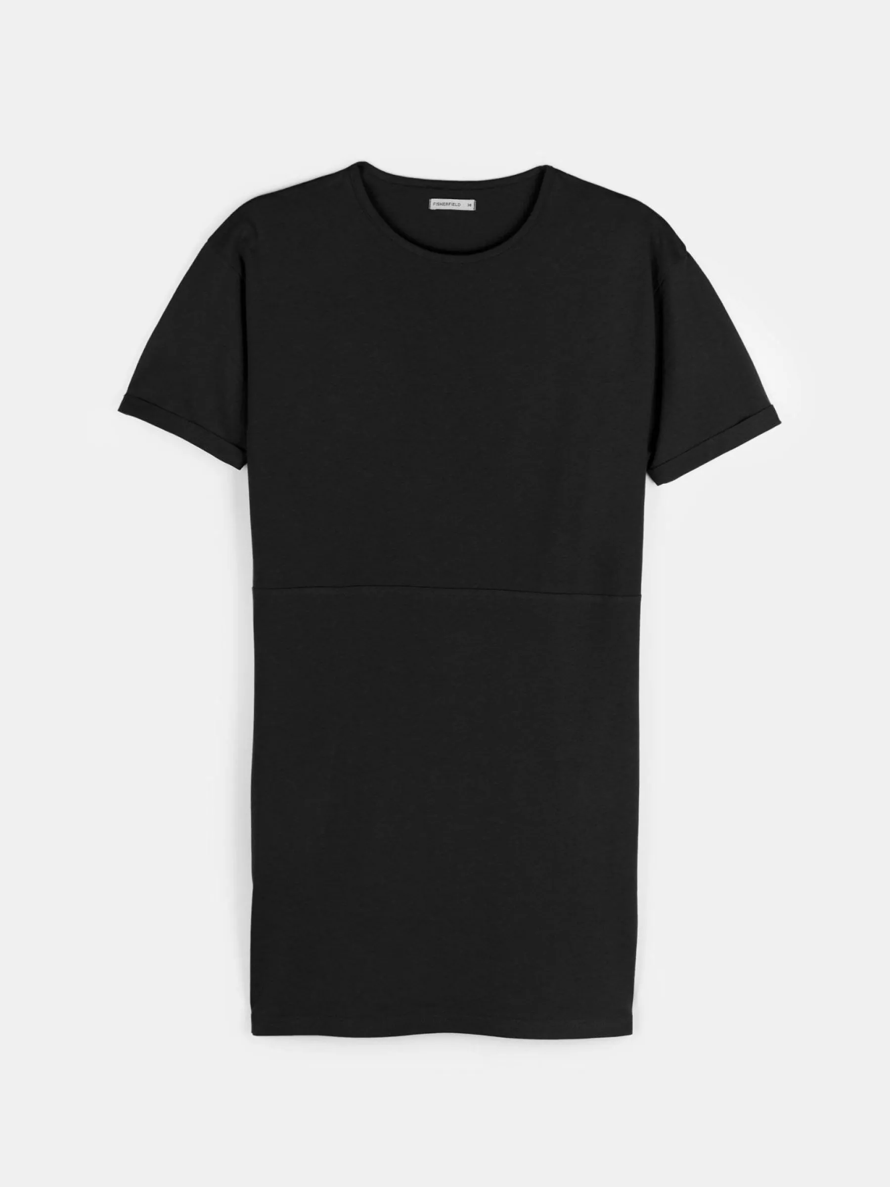 Kolor: czarnyKrój: podstawowyTyp: sukienkaRekaw: krótki rękawDługość: miniPattern style: pojedynczy kolorDetal: na…