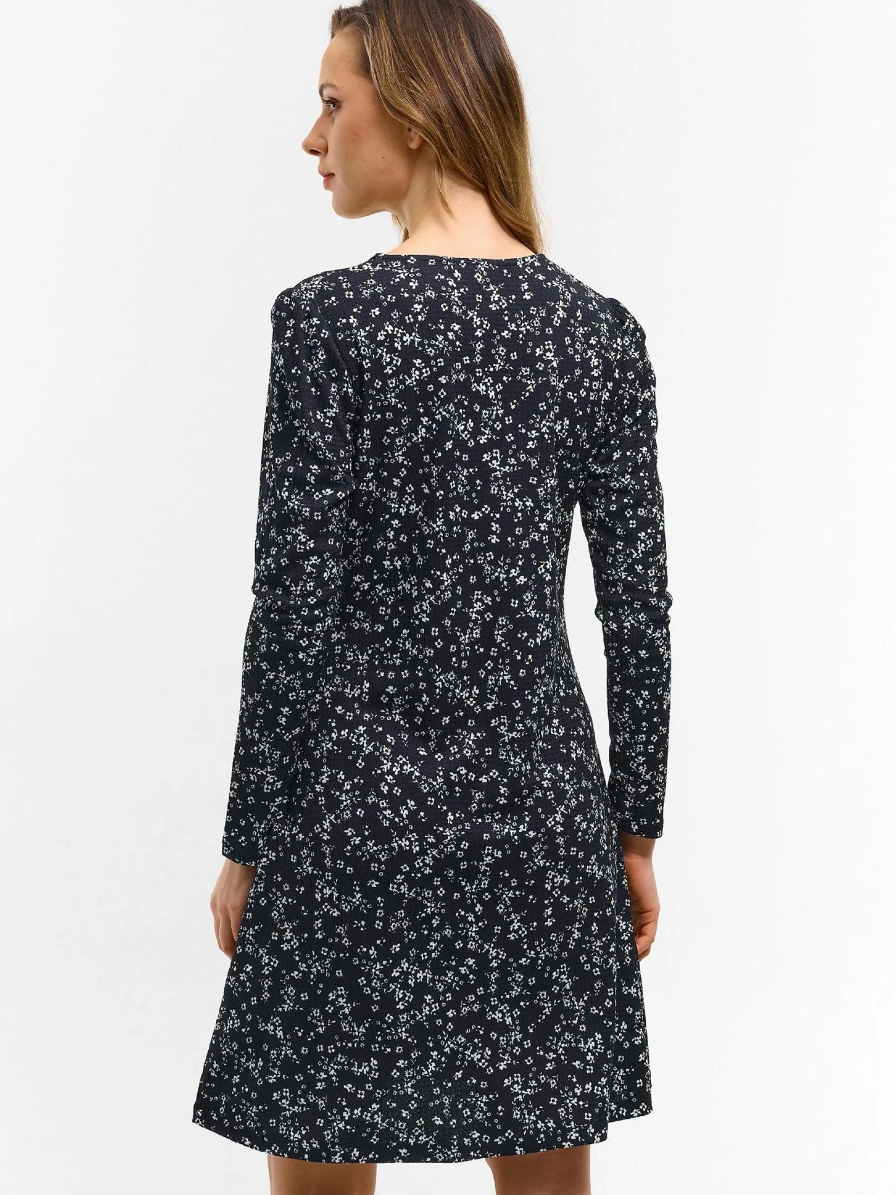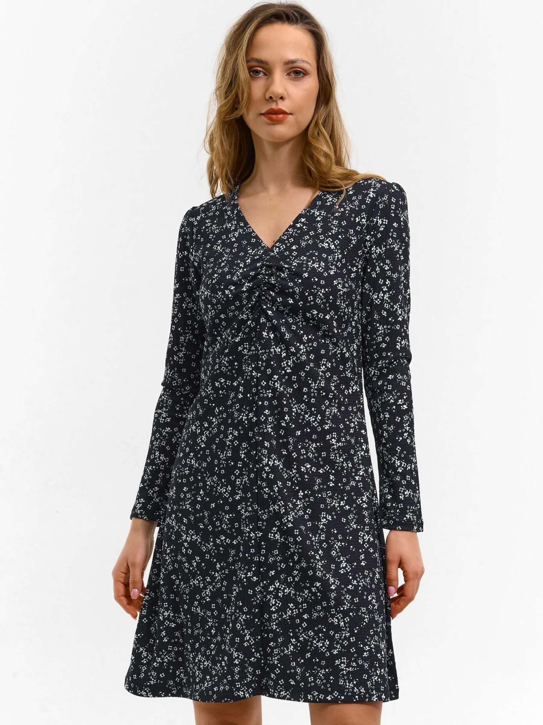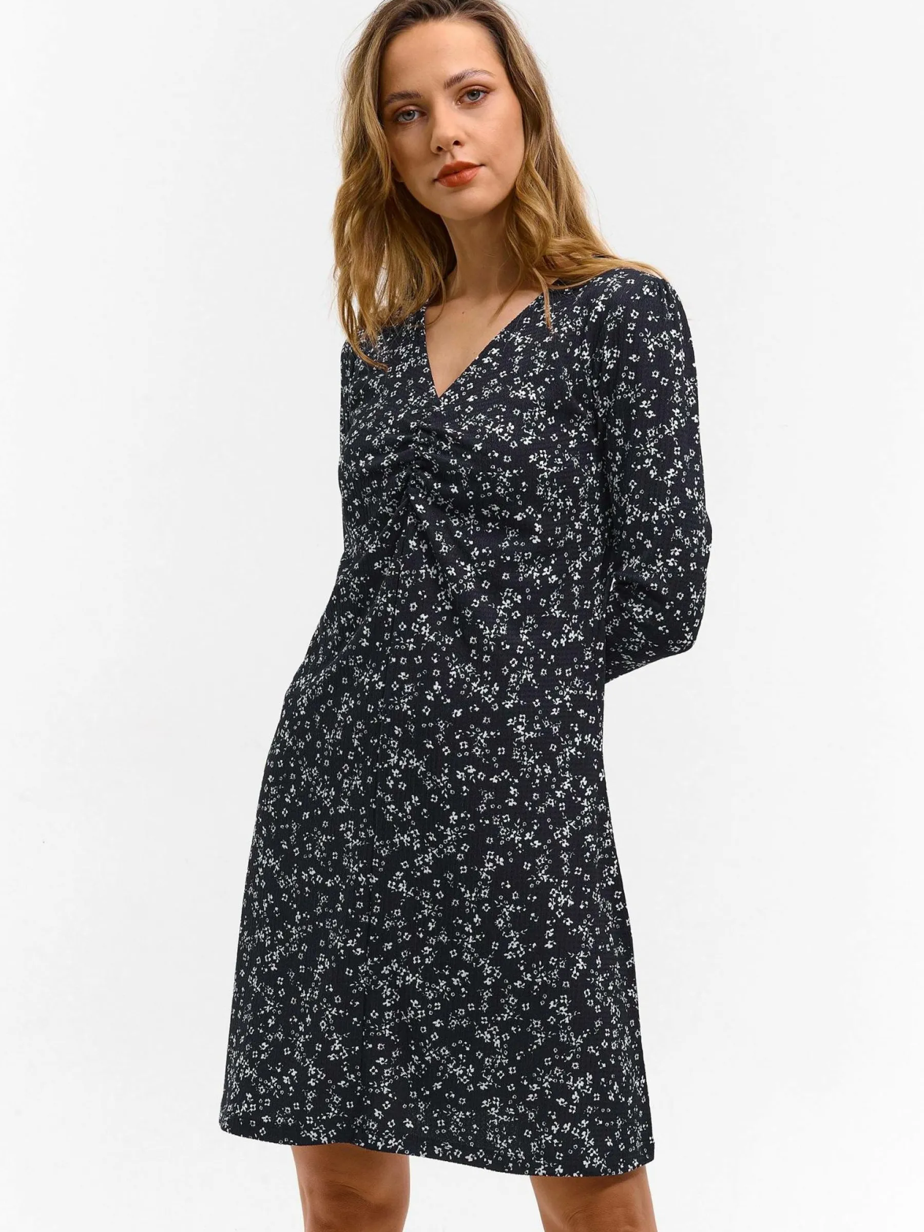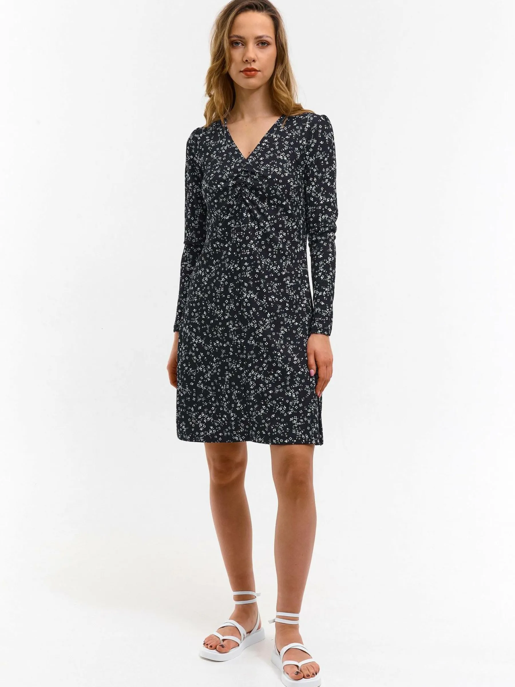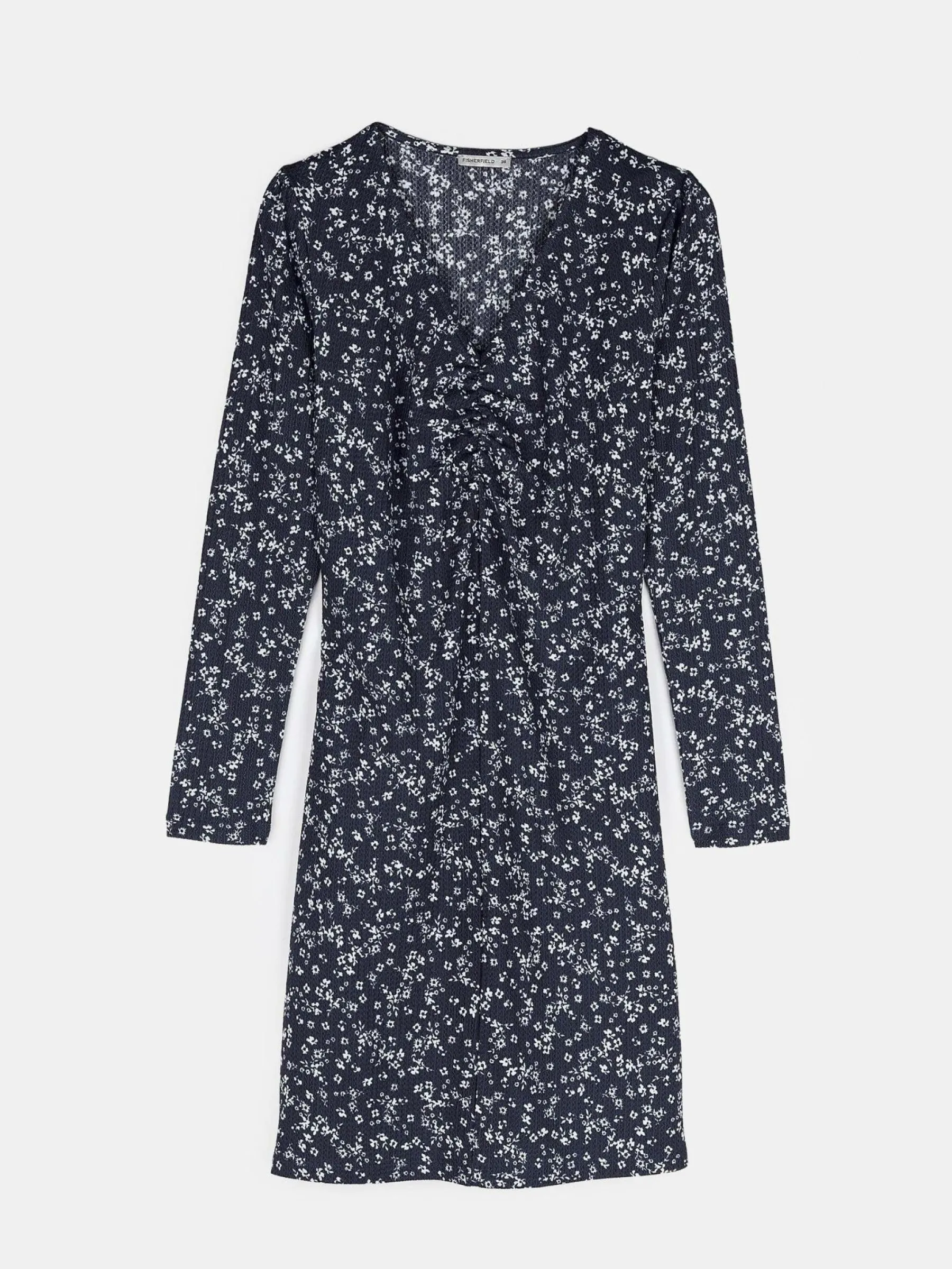 Kolor: granatowyKrój: podstawowyTyp: sukienkaRekaw: długi rękawDługość: miniPattern style: kwiatoweDetal: v-neck, …